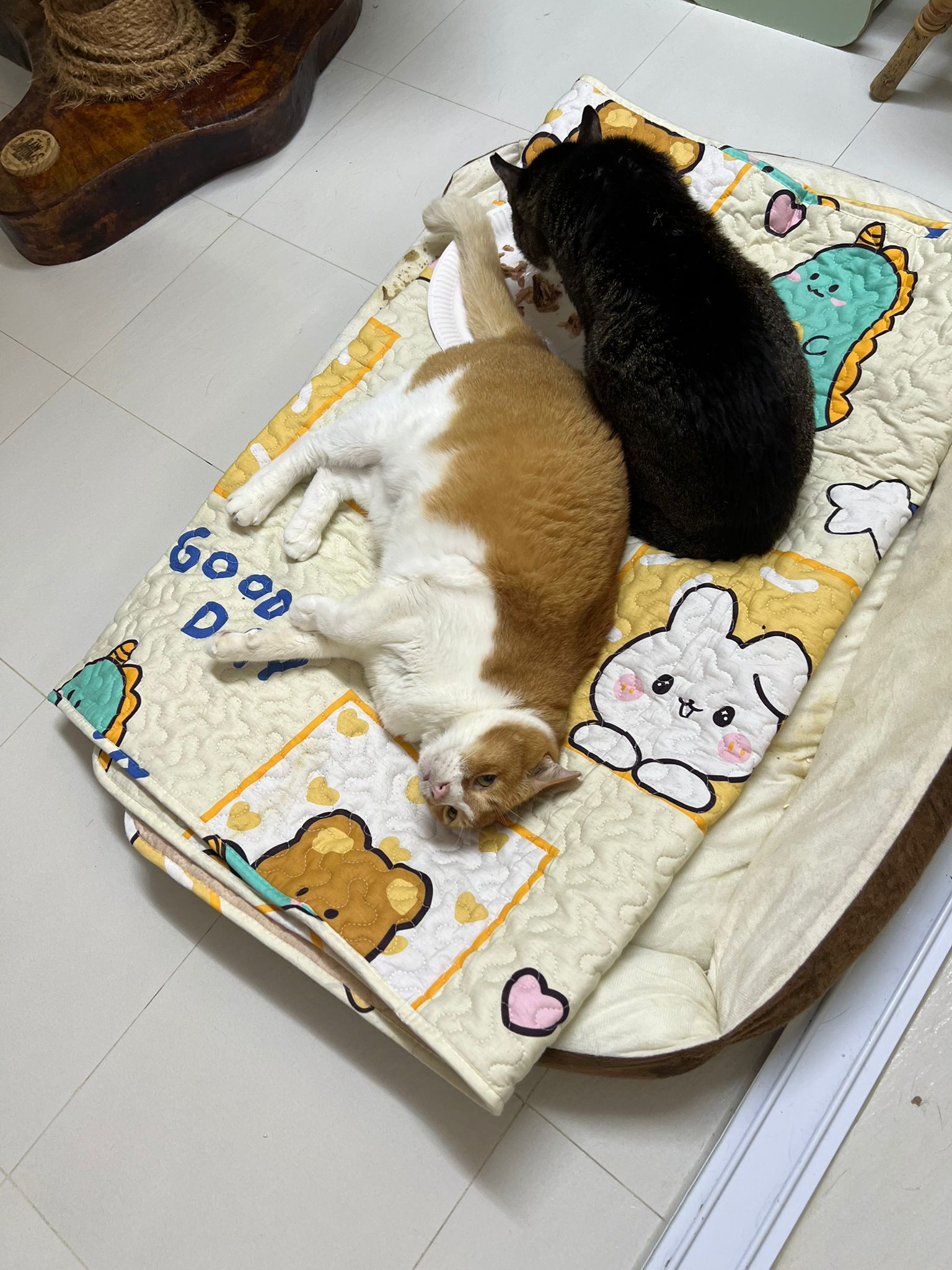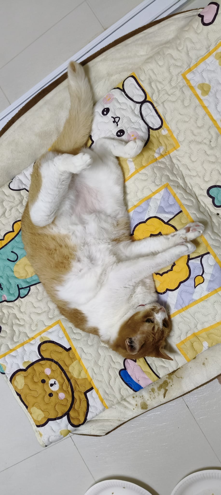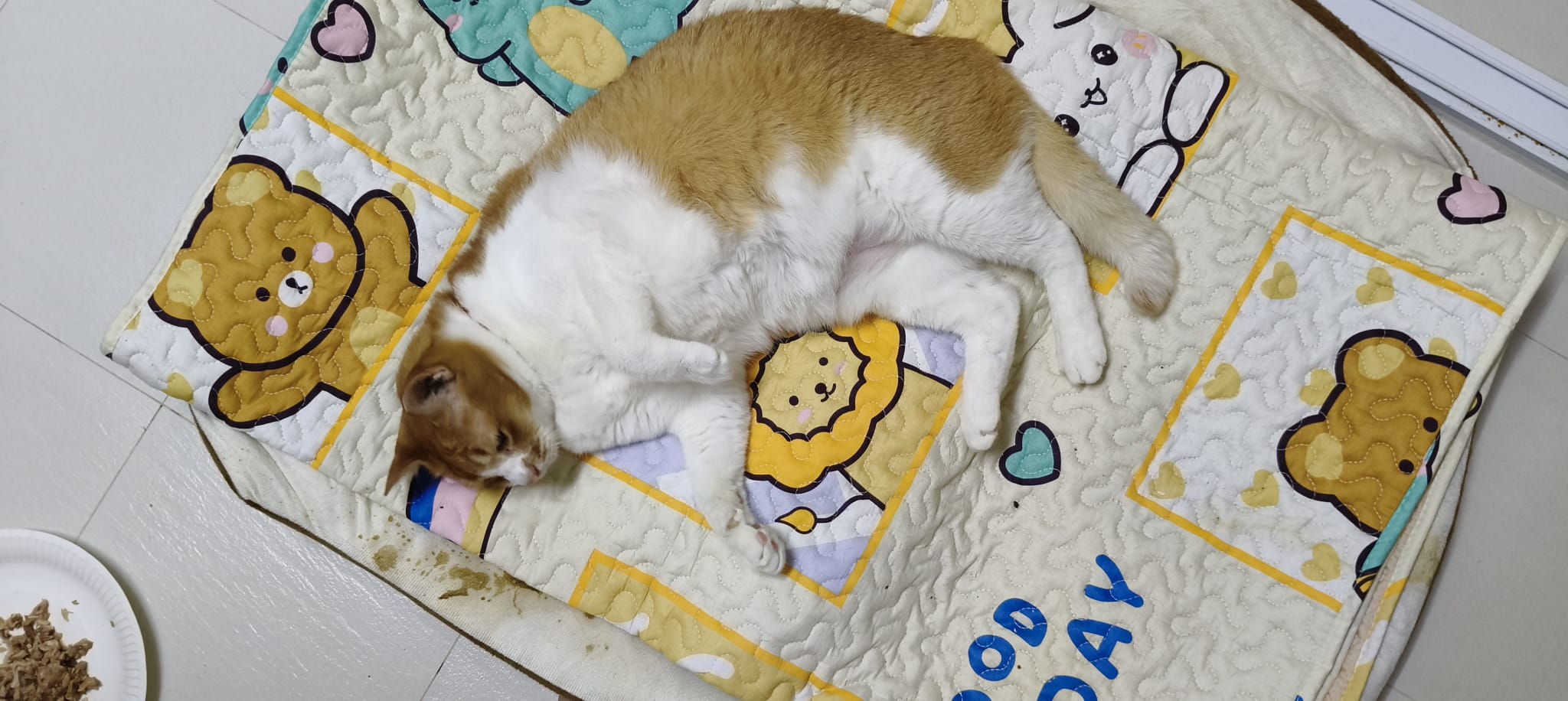 Morning: lay a towel mat on the big bed for him, he happy flop on it and I sayang him