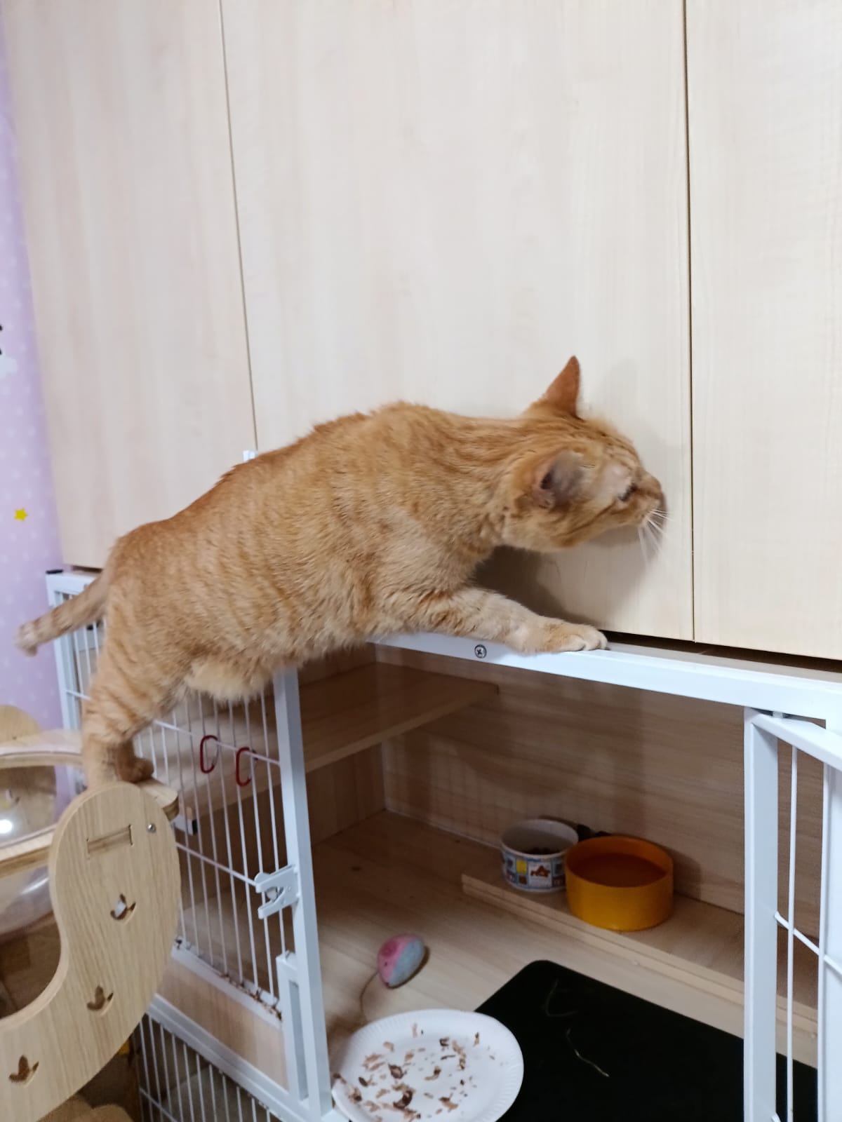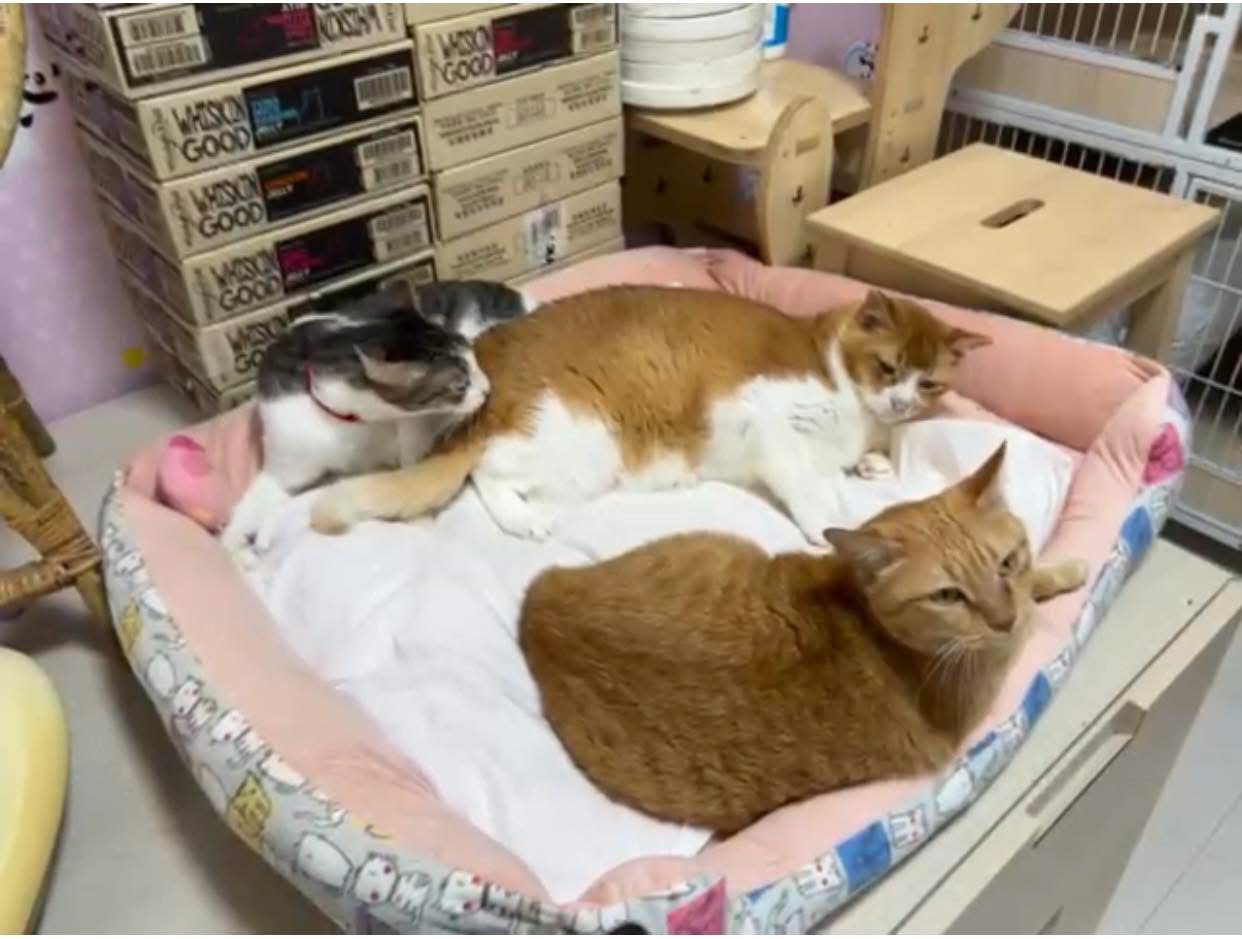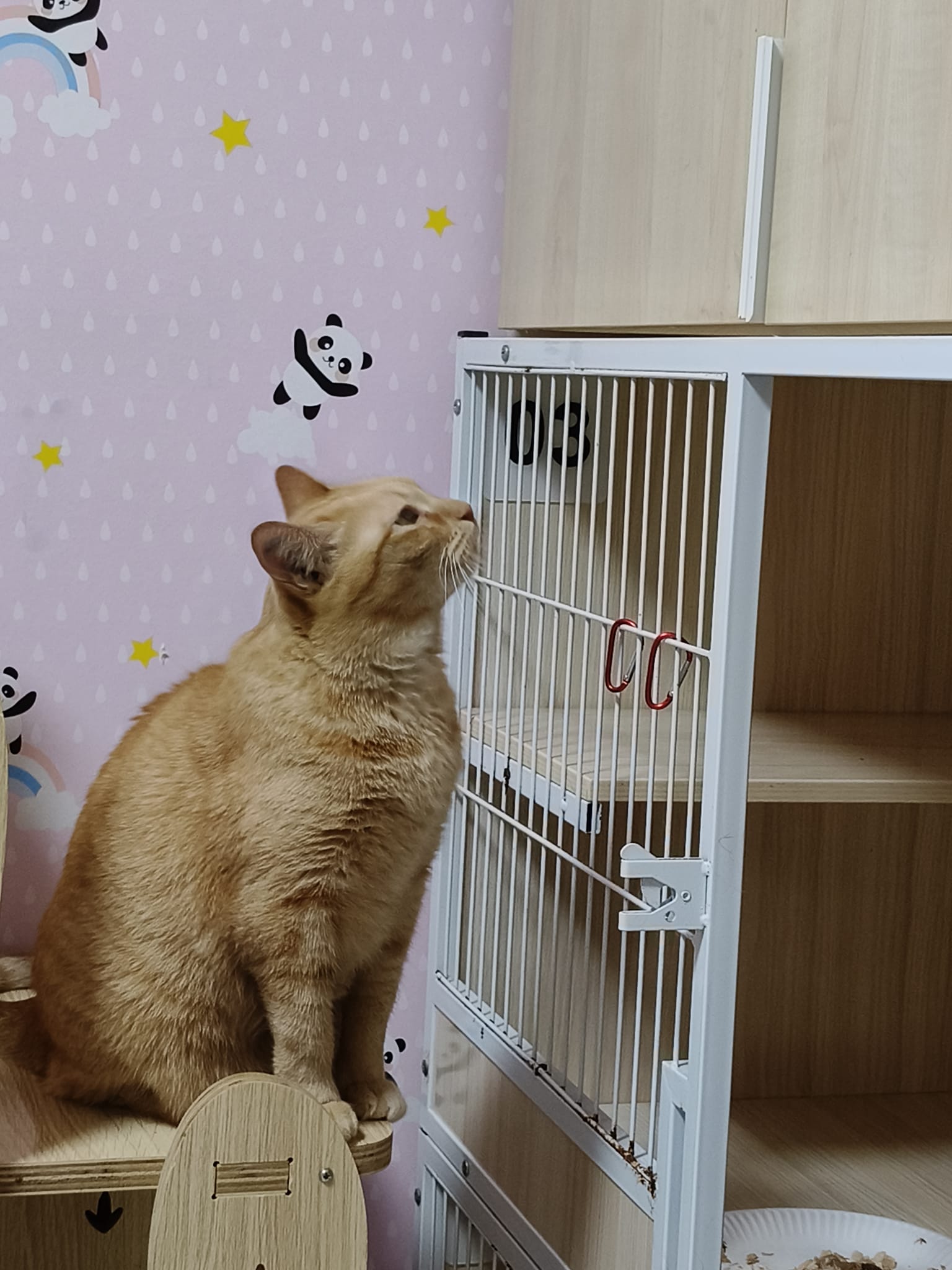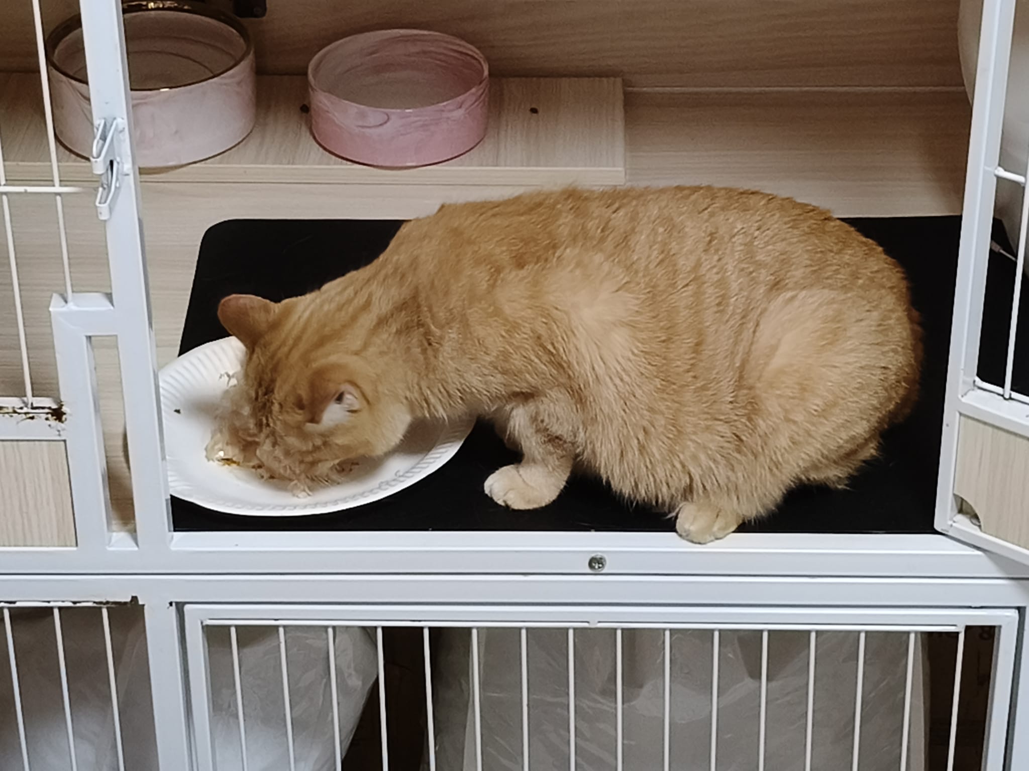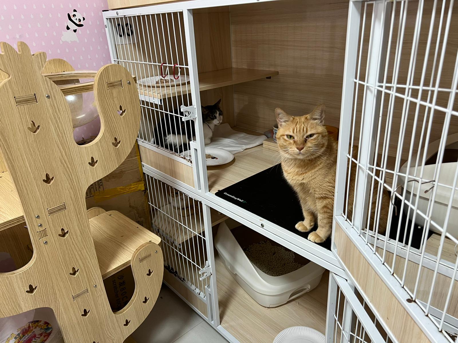 8am+-2.35pm: I’m a happy mao today. I stay in 猫房 for so long. Today all the cats staying in the food room for safety air reason. Cos new room need through and proper clean up first. I carried char to the cage and she had been there n quite ok w Teddy ard. boy didn’t disturb her as much cos so many of them in the room. She still active when it’s food time