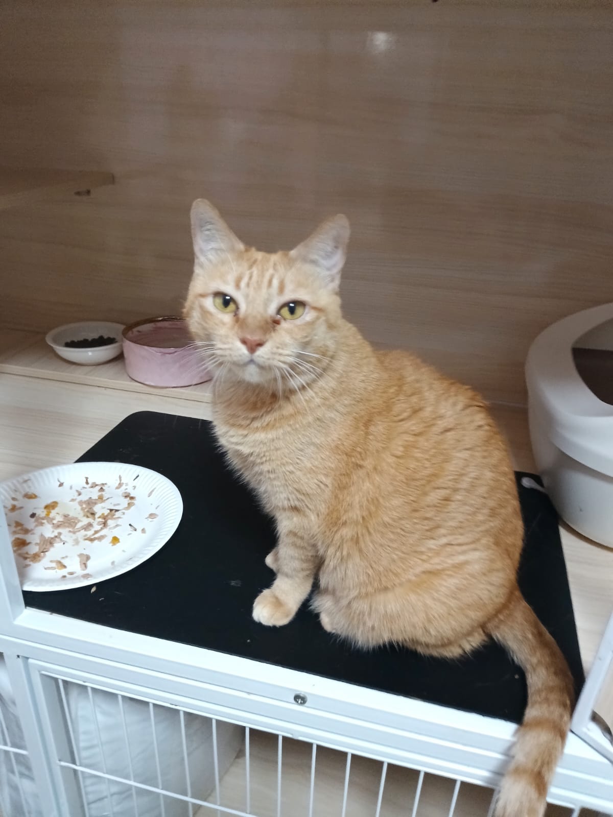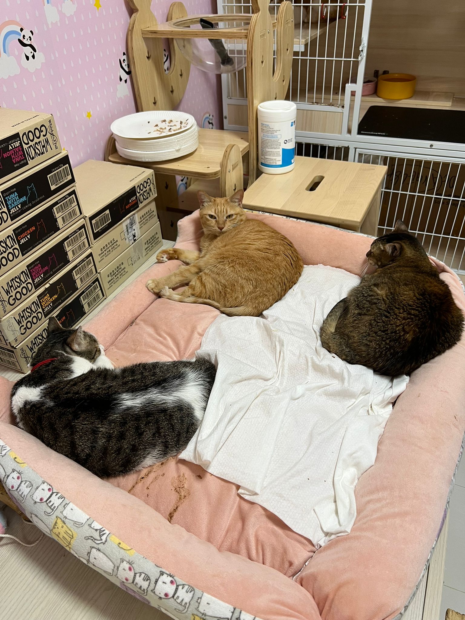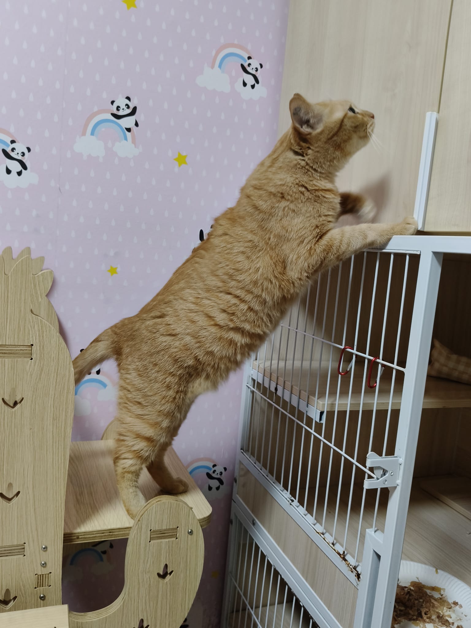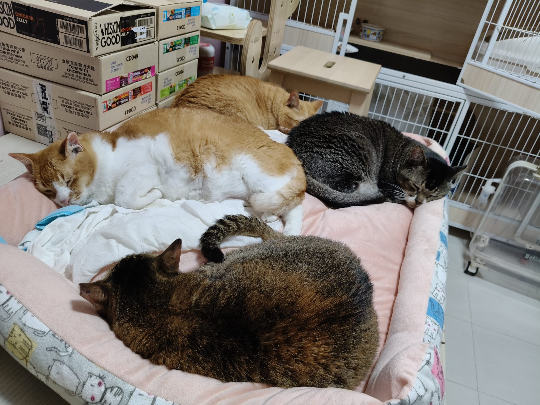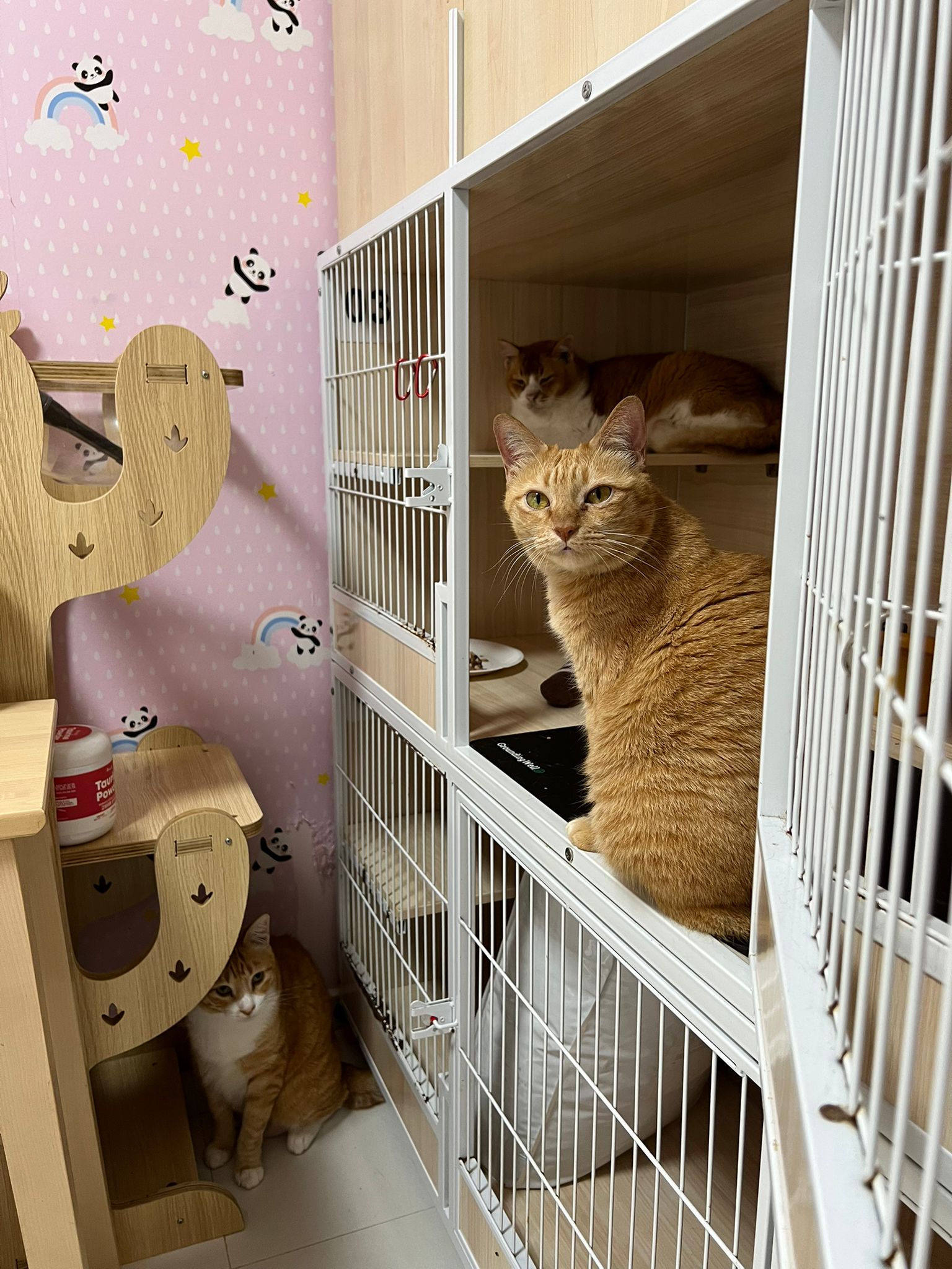 8am+-2.35pm: I’m a happy mao today. I stay in 猫房 for so long. Today all the cats staying in the food room for safety air reason. Cos new room need through and proper clean up first. I carried char to the cage and she had been there n quite ok w Teddy ard. boy didn’t disturb her as much cos so many of them in the room. She still active when it’s food time