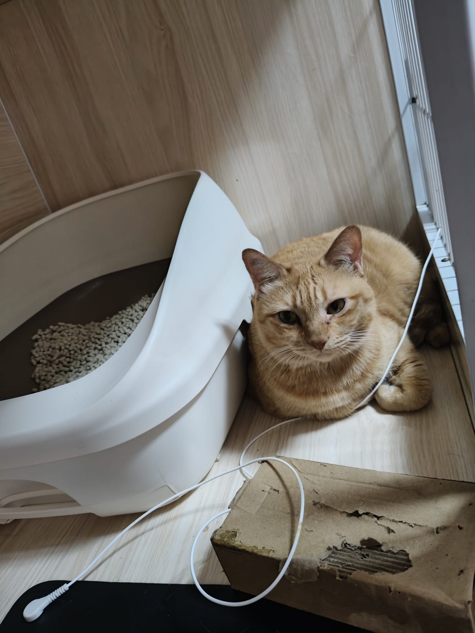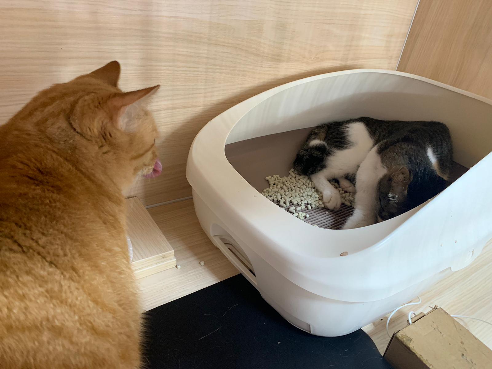 Morning: don’t know why the cat box is in food room, but char is on that box. She is on the big bed too. If she is ok to roam, then I may wash n keep her small bin at the top le