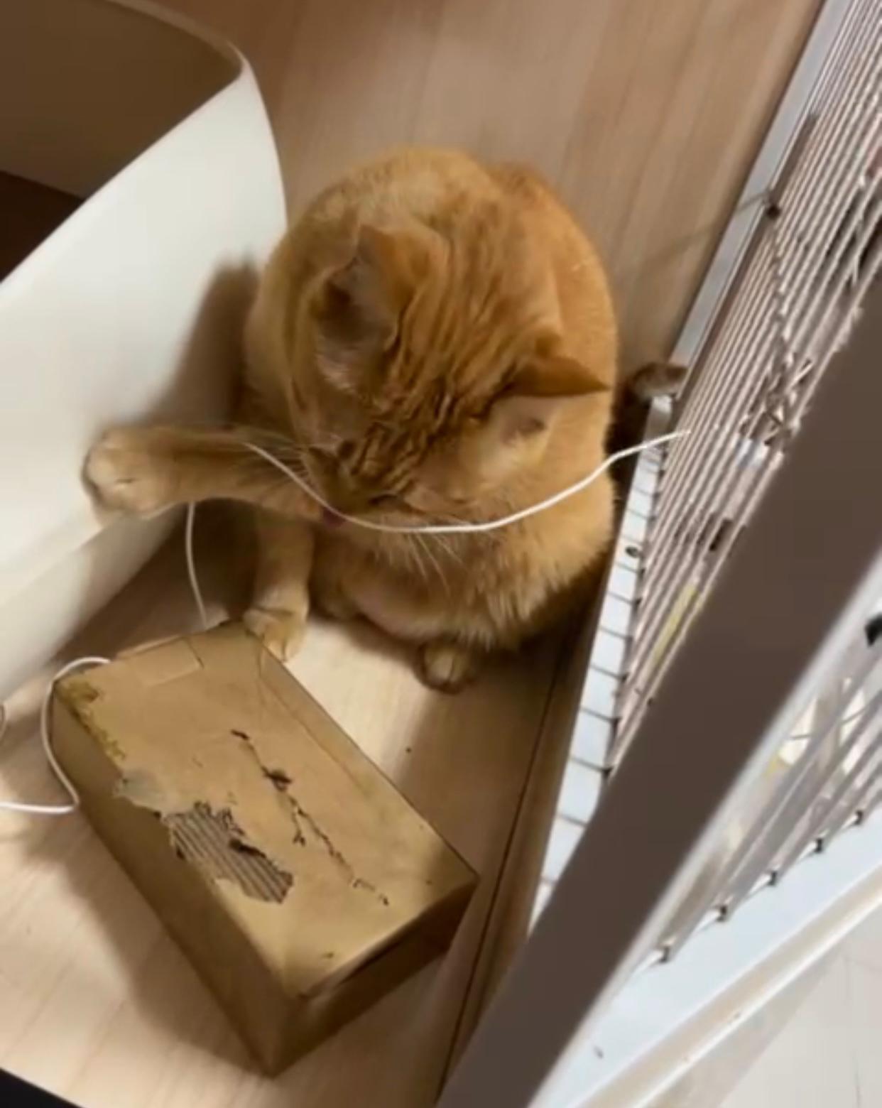 Morning: she sit on the cat cactus and I clean her eyes and she come out to play and stretch on the ctn boxes and big bed. Wanna play w the dripline I stop her n she go on to eat