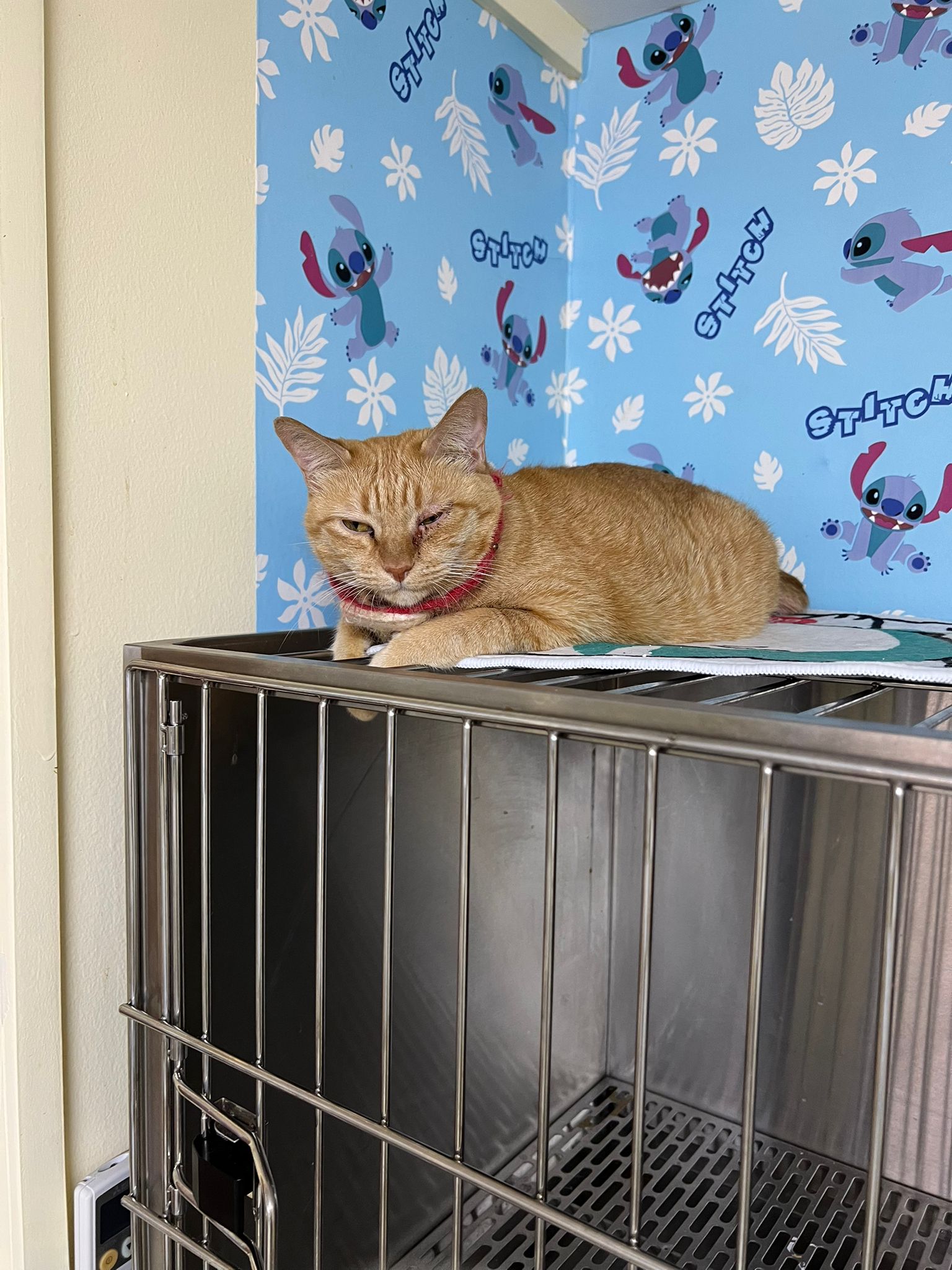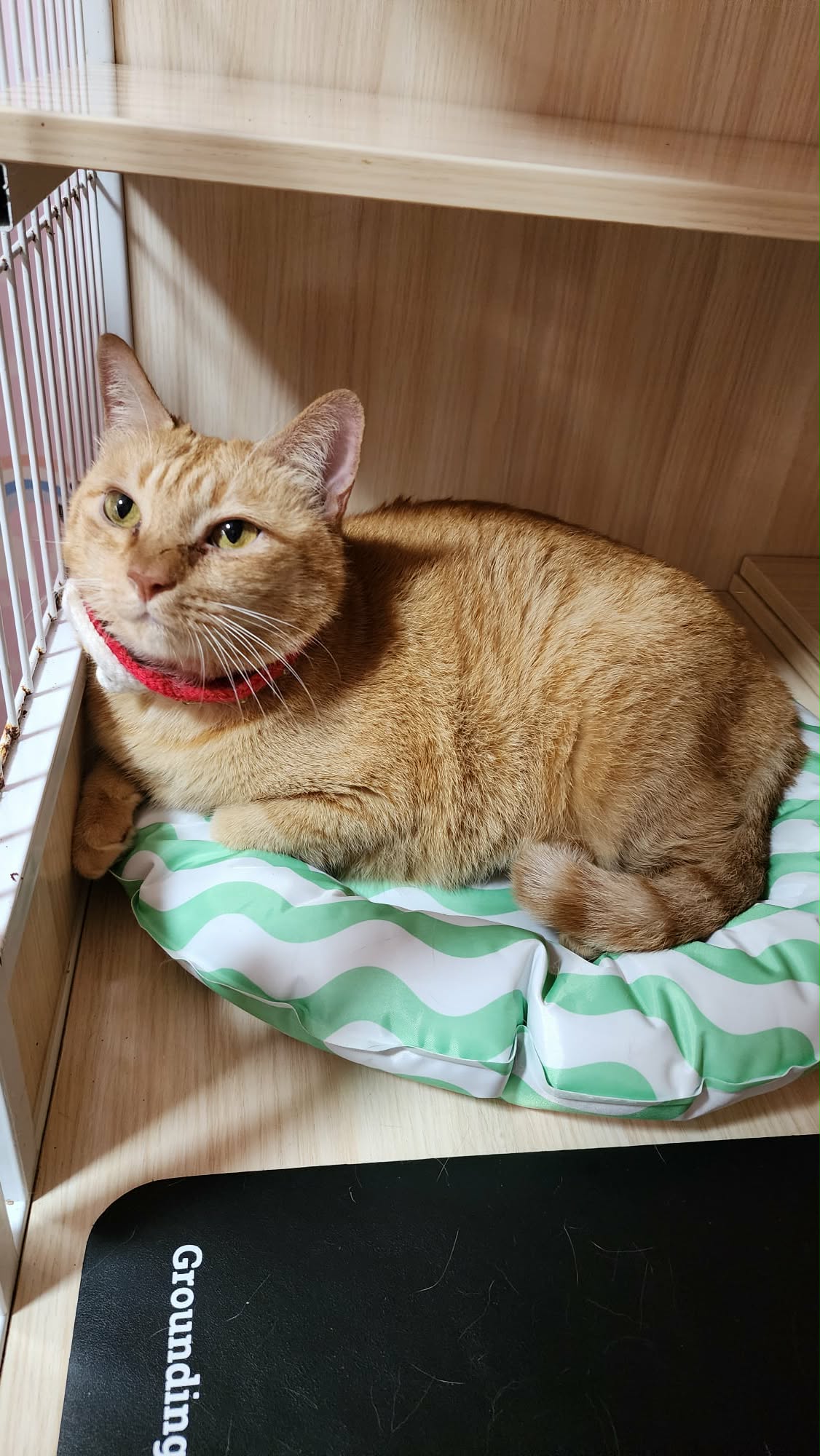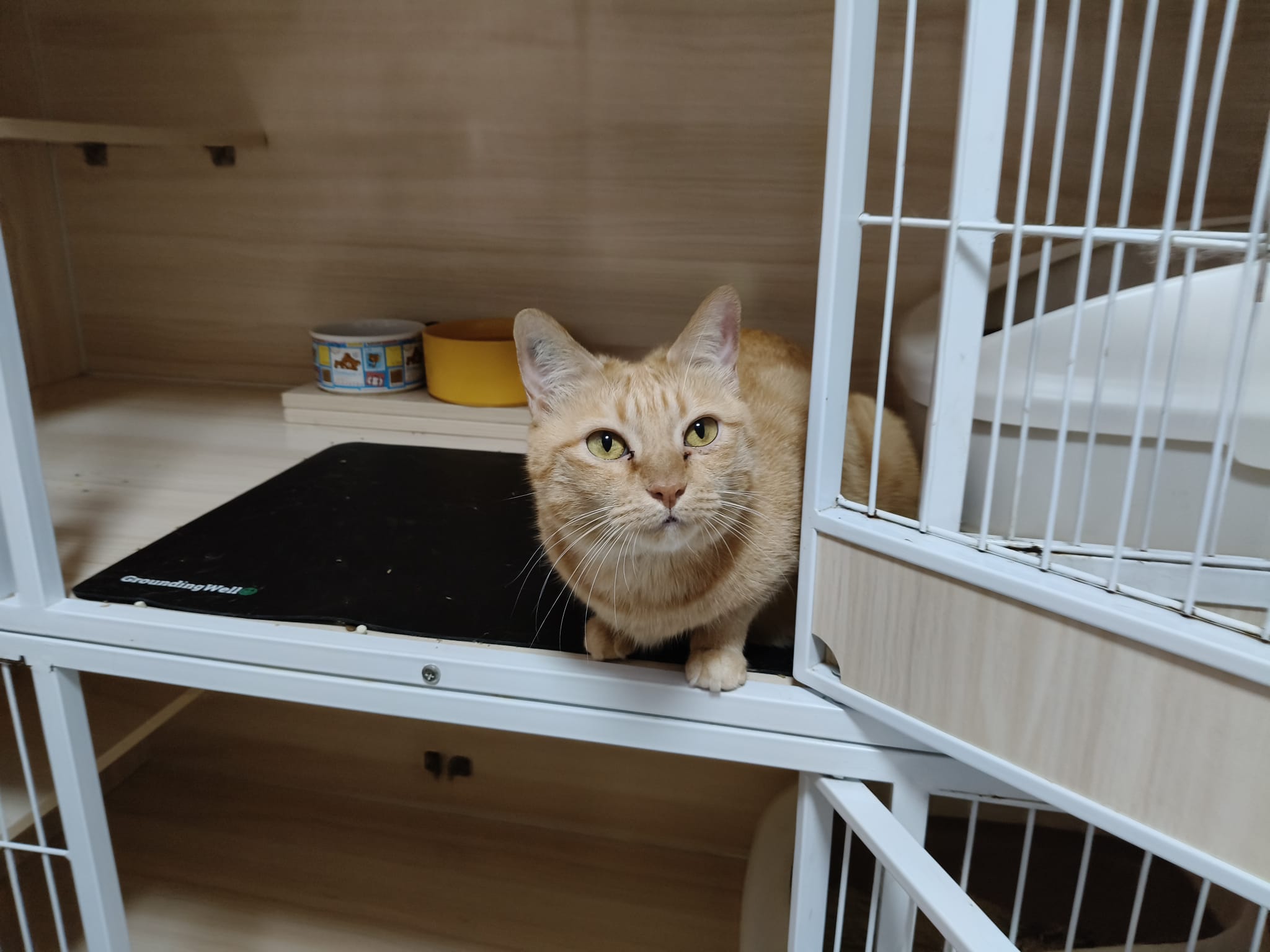 2pm: more active in the cage room, I put a grounding mat in the cage so she can get grounding while eating too. She is active, will come out to stretch and scratch the ctns boxes.