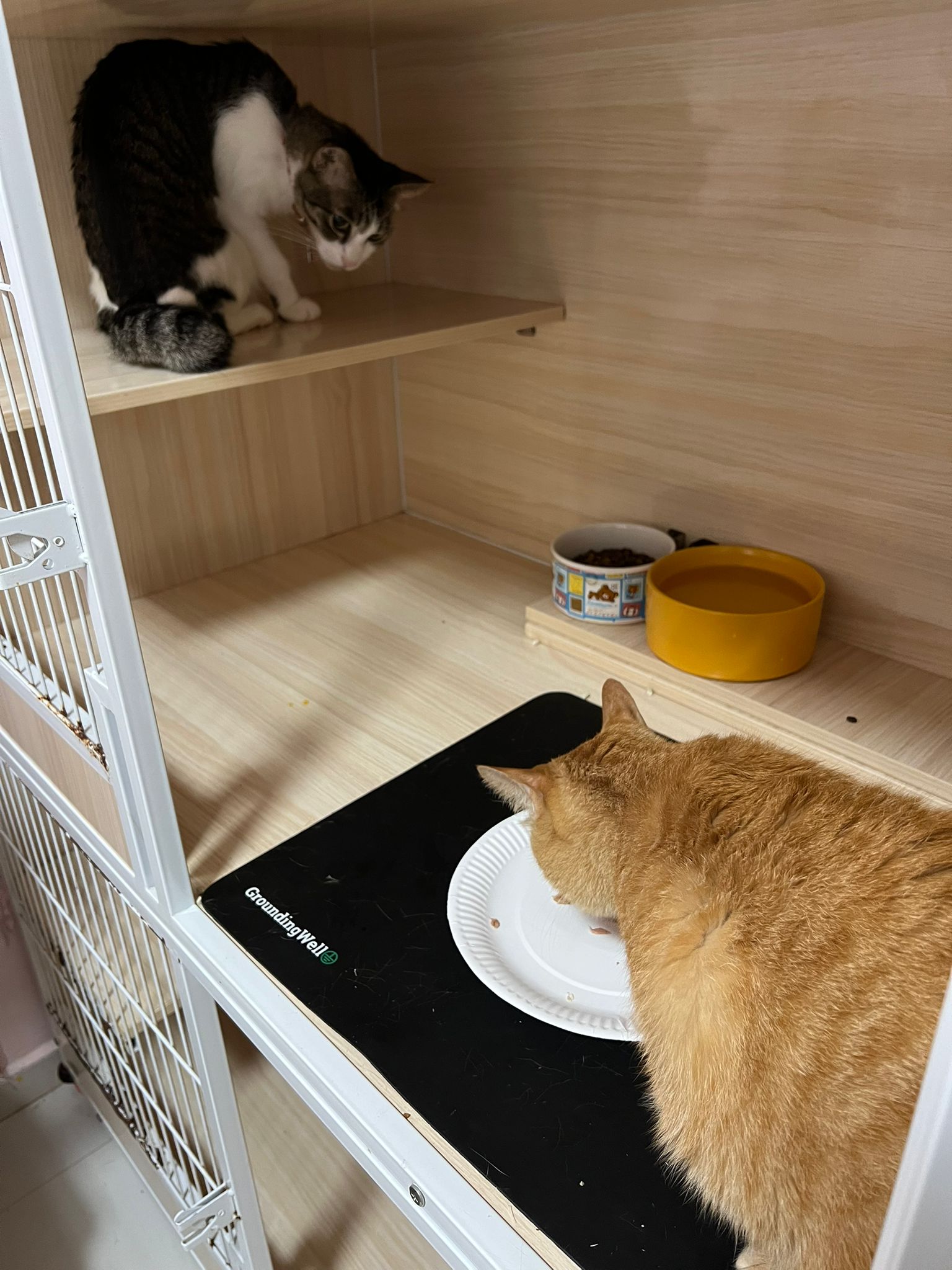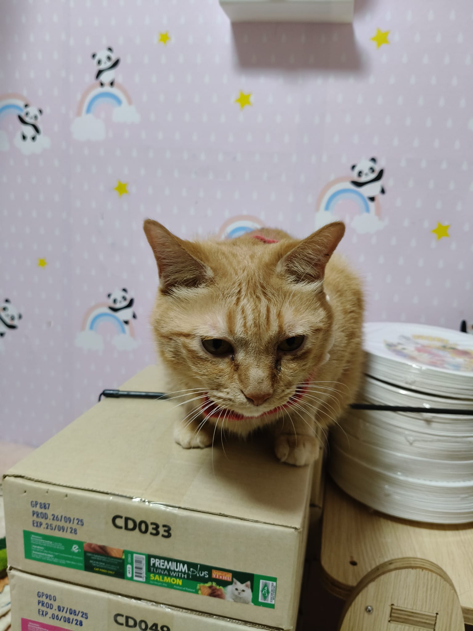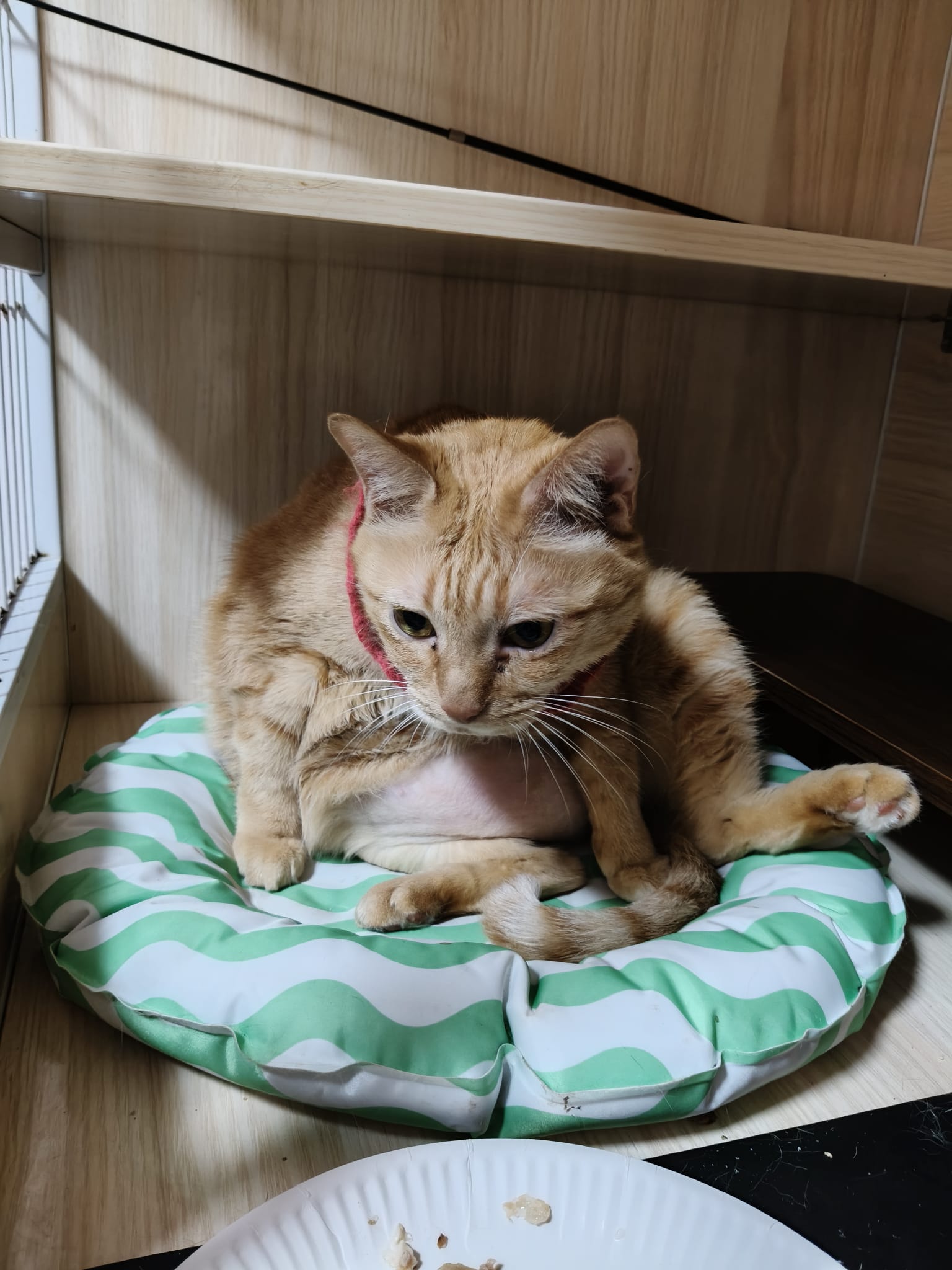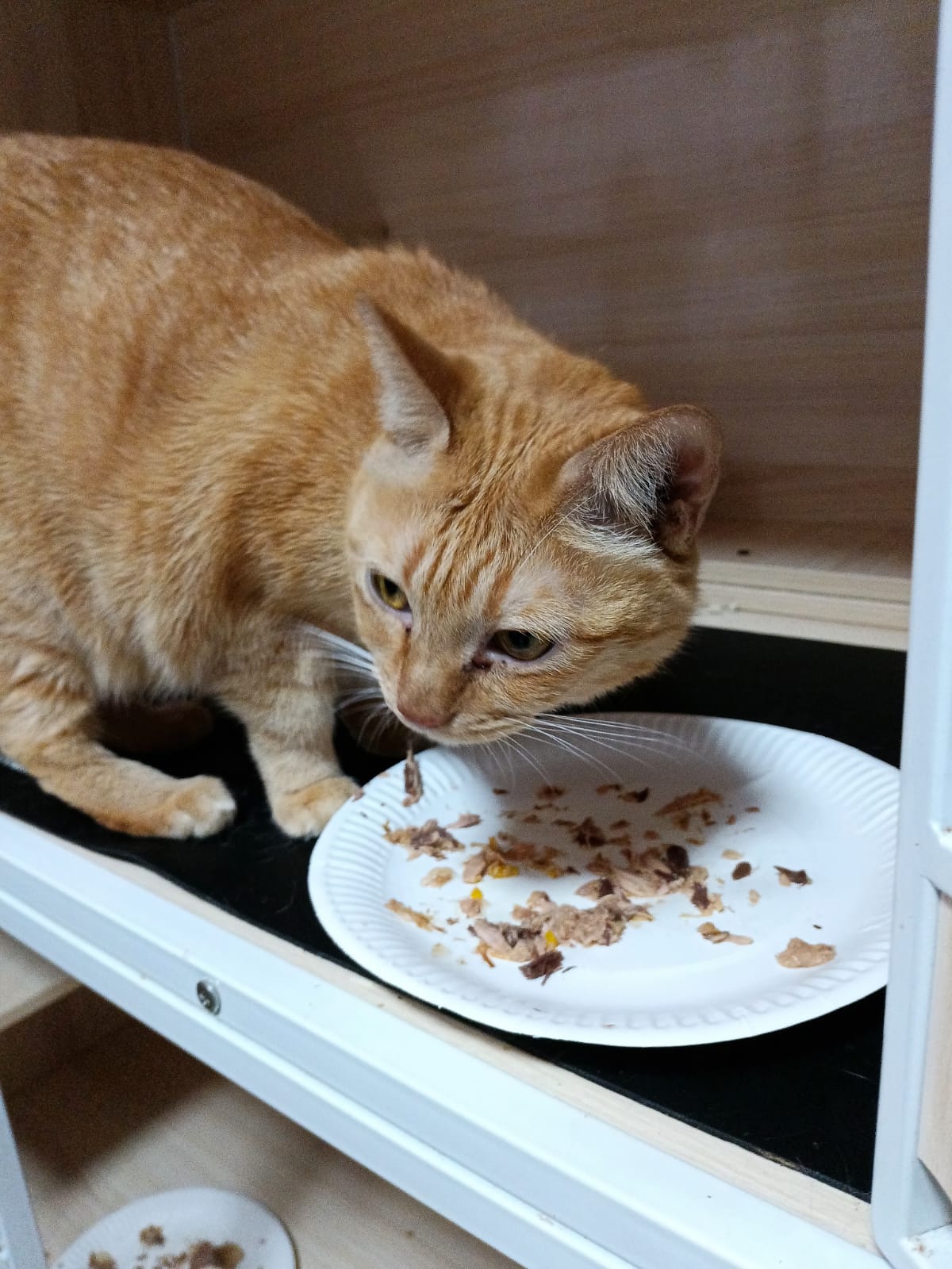 1pm+: I’m back from buying stuff for them, I buy a cute orange cat bowl for her. She is happier nowadays. Will run to both rooms. She is very ok w all the Orange cats. Just now wanna buy tear stain removal for her but no expiry so better not buy.