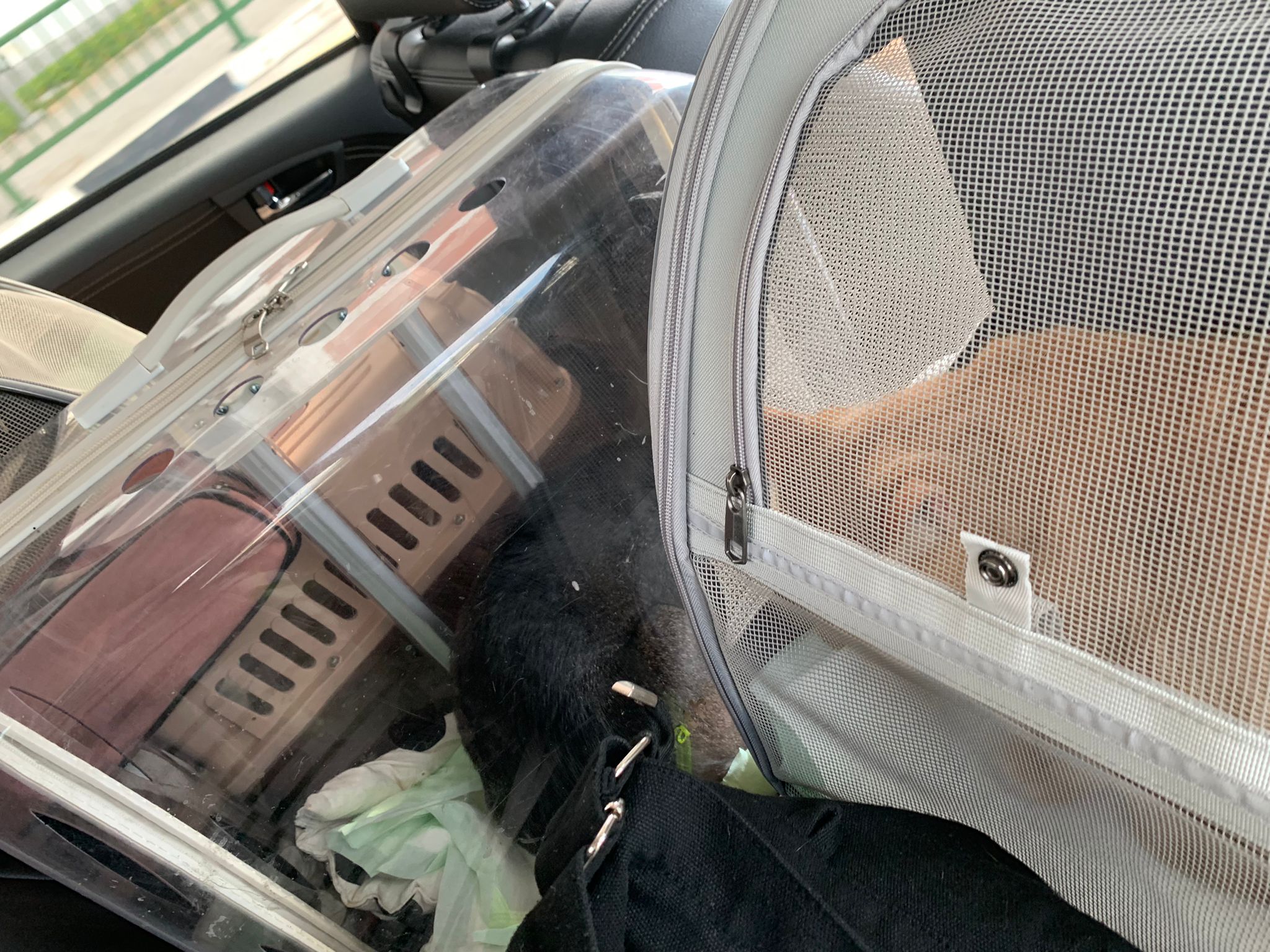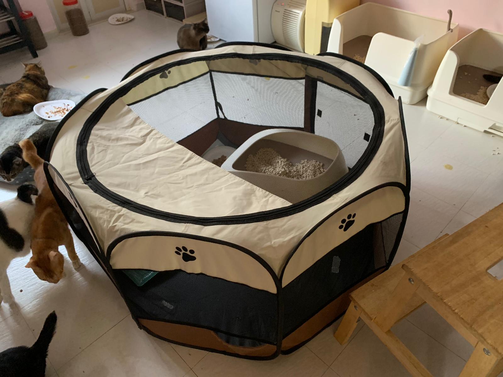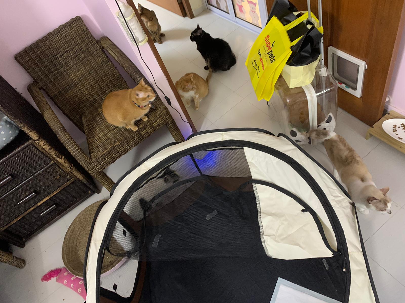 455pm: reach 猫房, I leave her be in the trolley while I collect the plates and tell the rest got extra snack char bring along – ciao cup chicken fillet. Jack and Bessie ok w char, no negative vibes. Junior and sheba curious about char. I set up picnic tent and I let char free roam while i get ready the other stuff. she look Zai and no issue, but I told her I need at least 1 set of poo and 2 sets of pee to know her status b4 she can free roam. She seem ok.