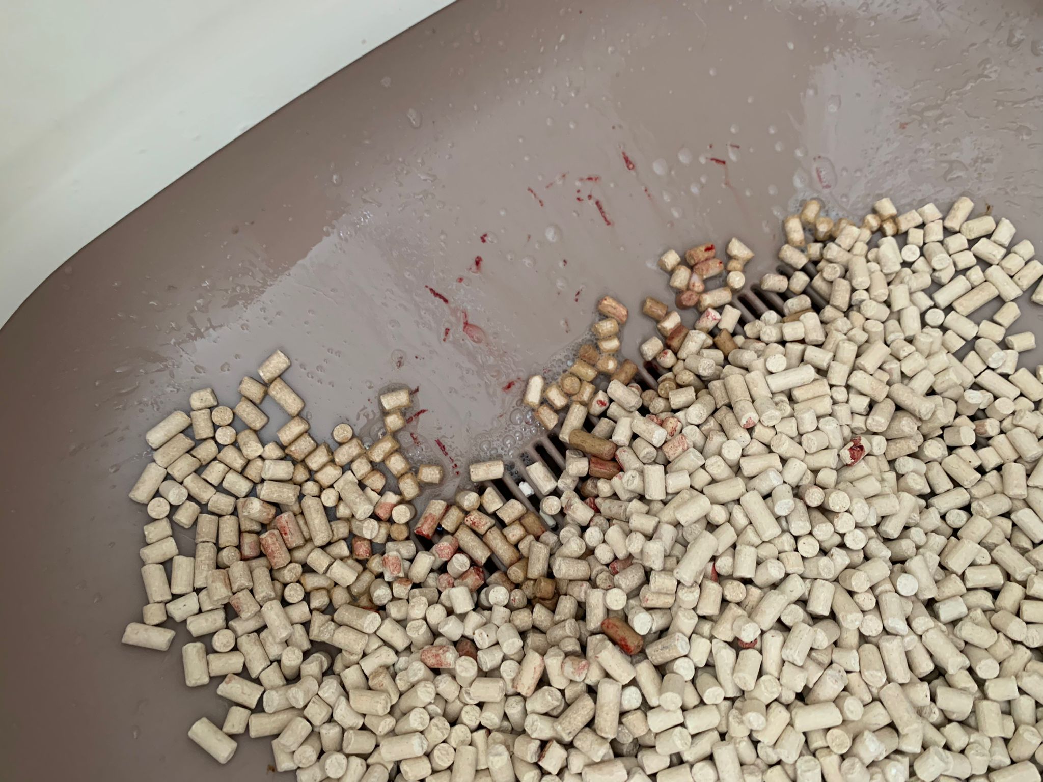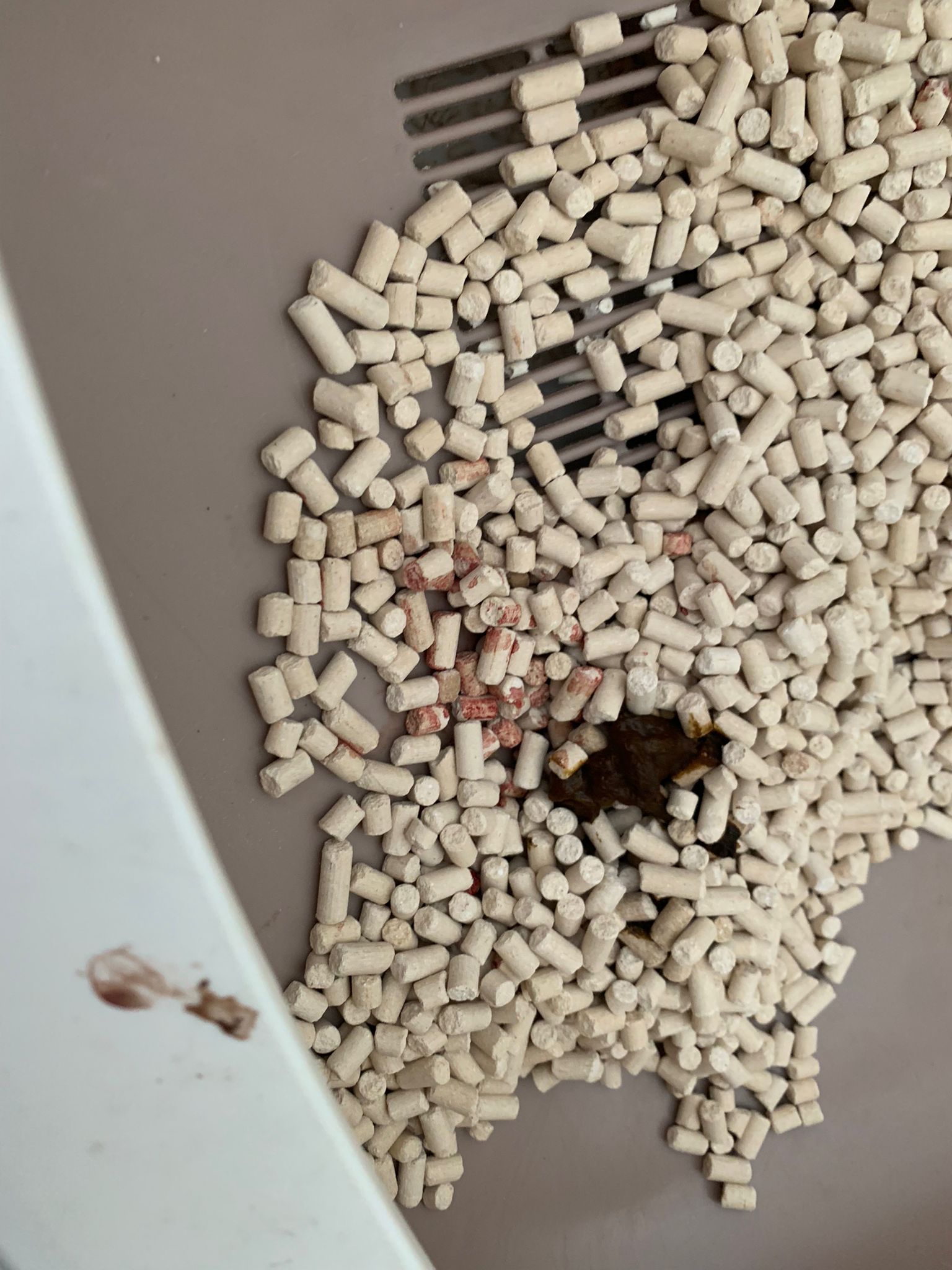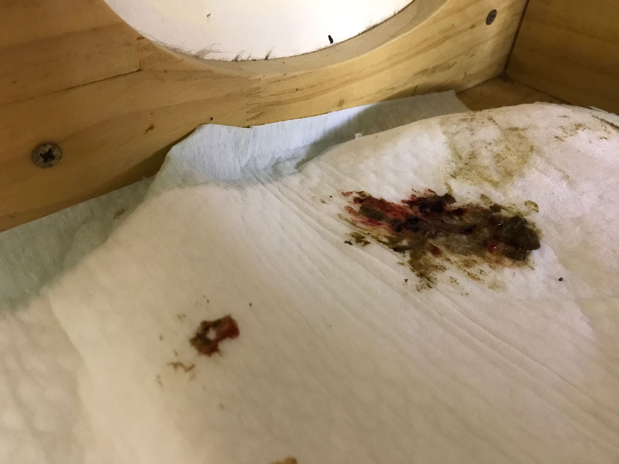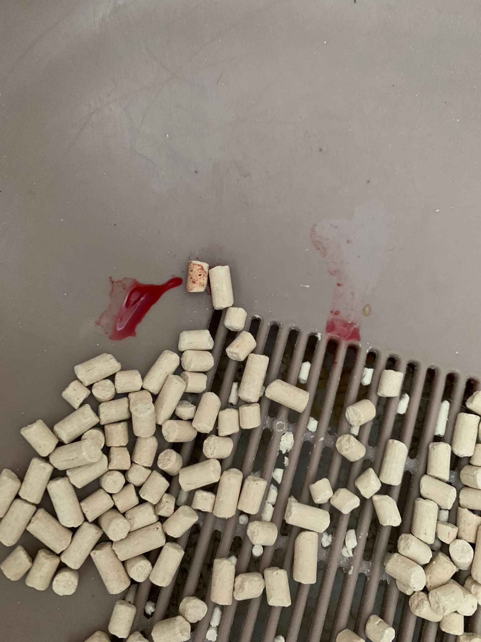 I check bin, got some pee – w blood. clean up so later can monitor.