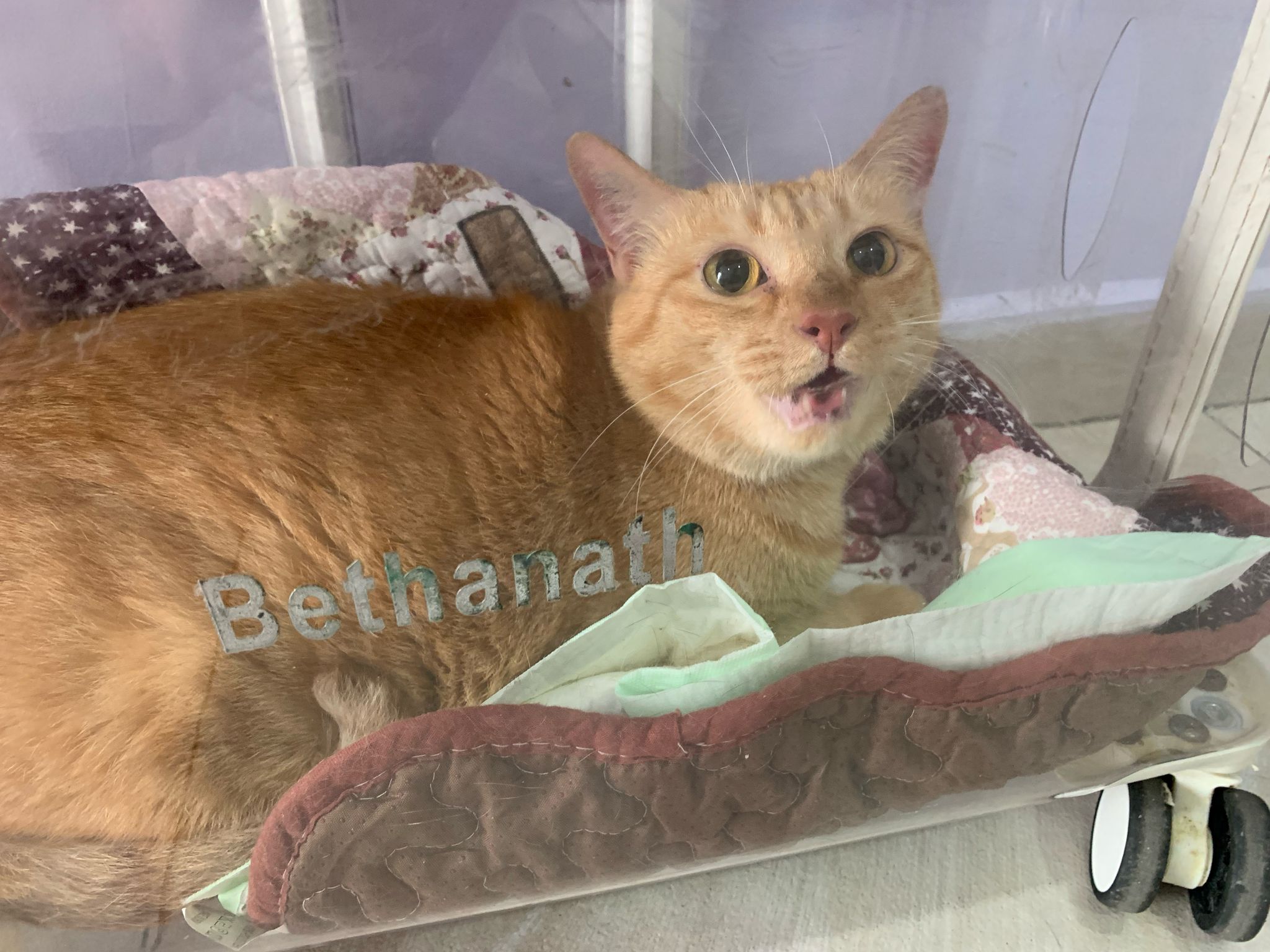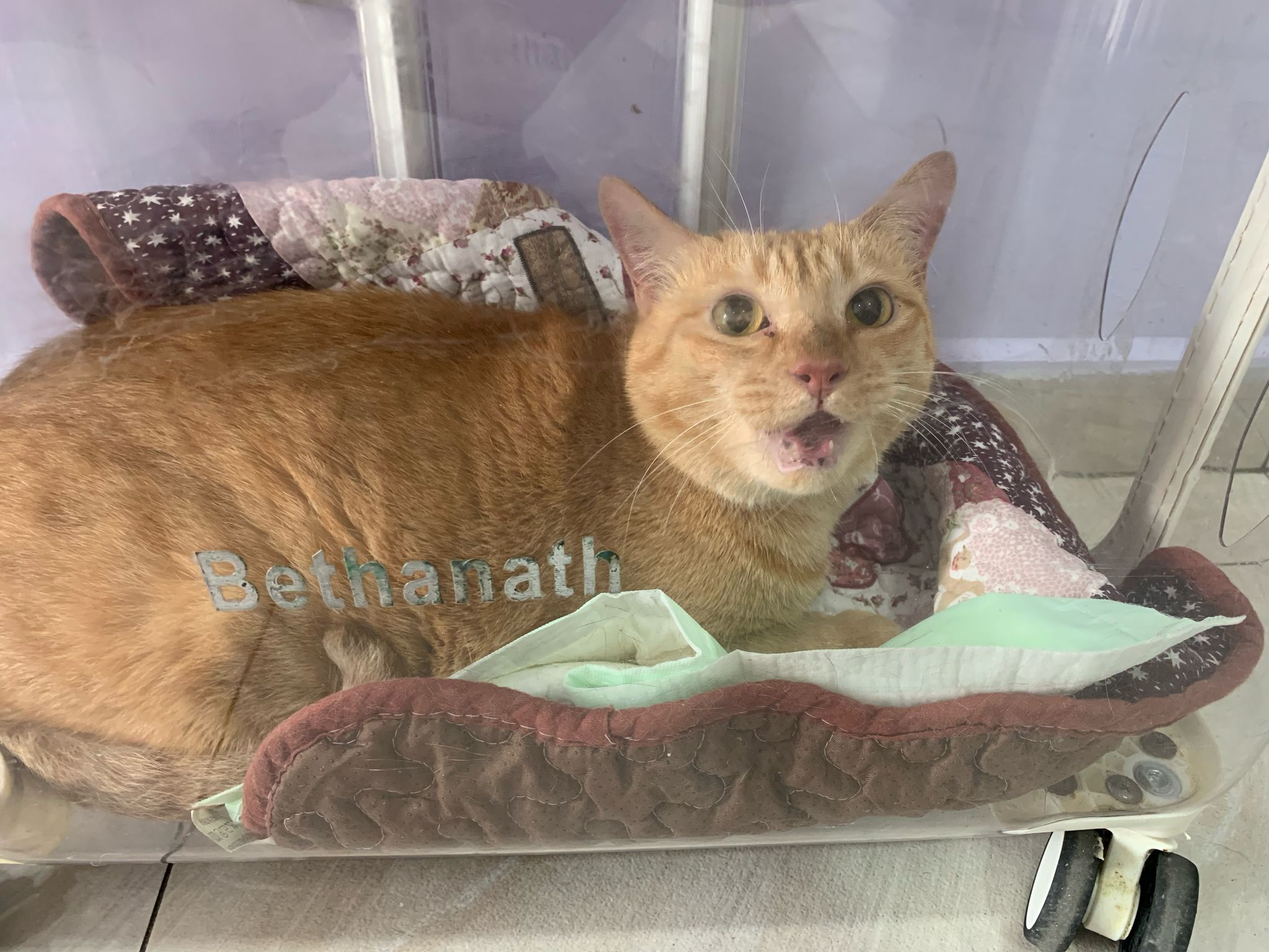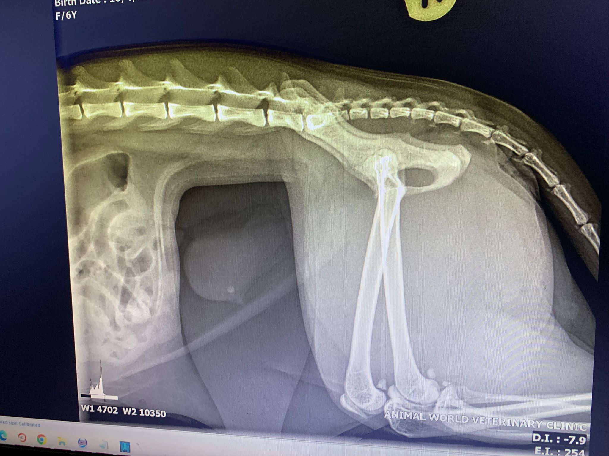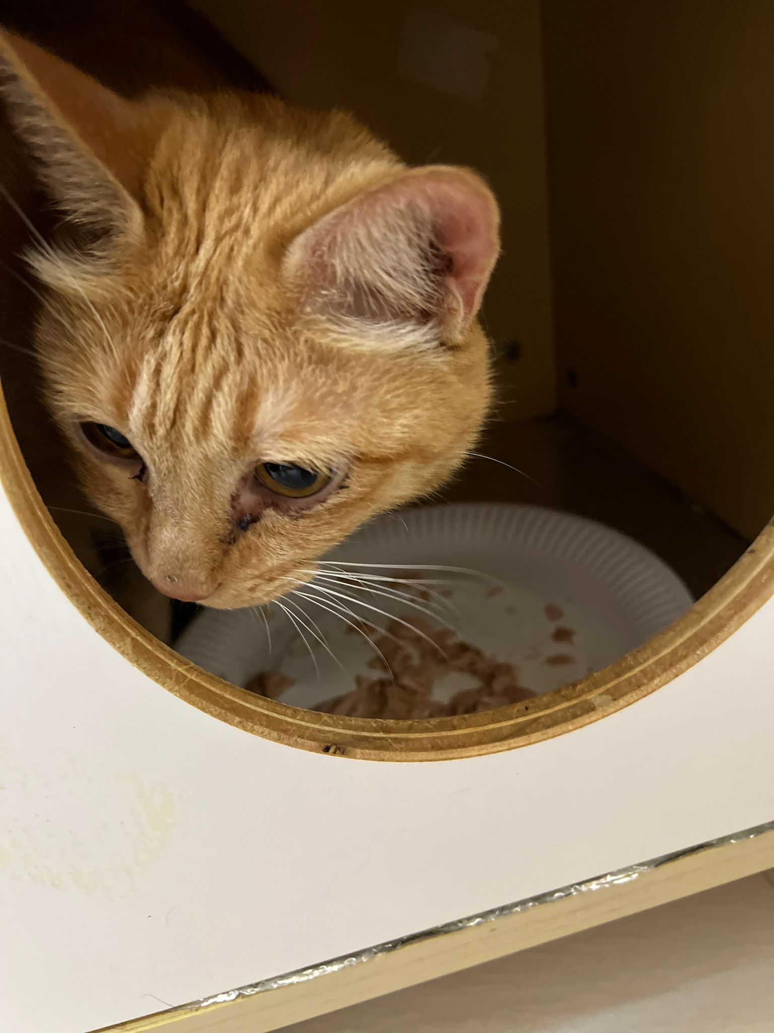 Morning: char stablise in food room aka cage area, more space to rest. Put water bowl in cage for her too. Wed will add on feline natural freeze dried kibble bowl set for her too.