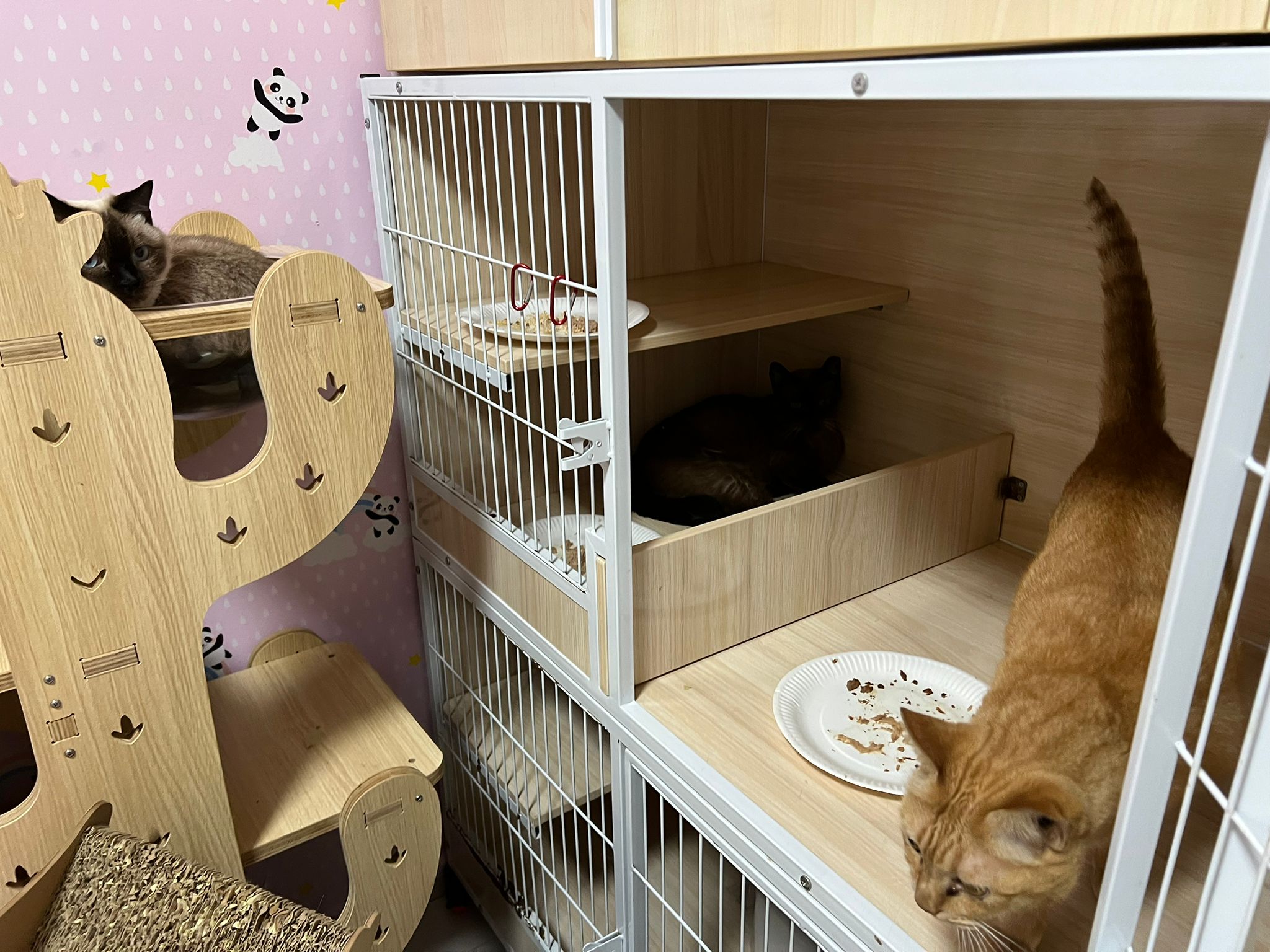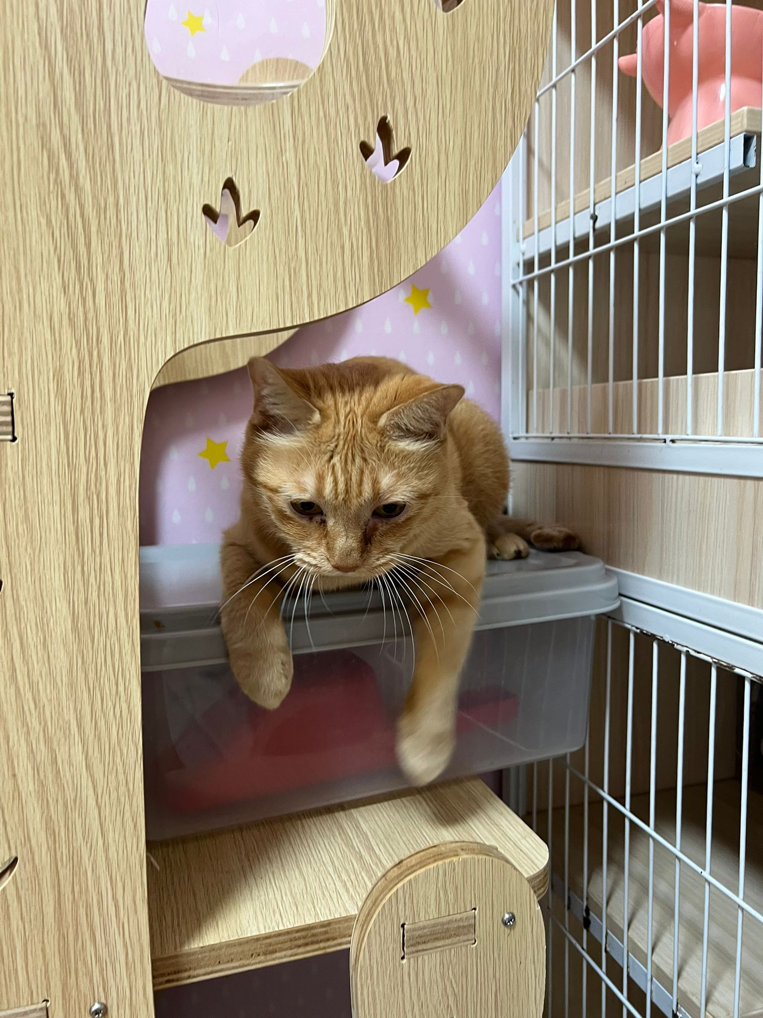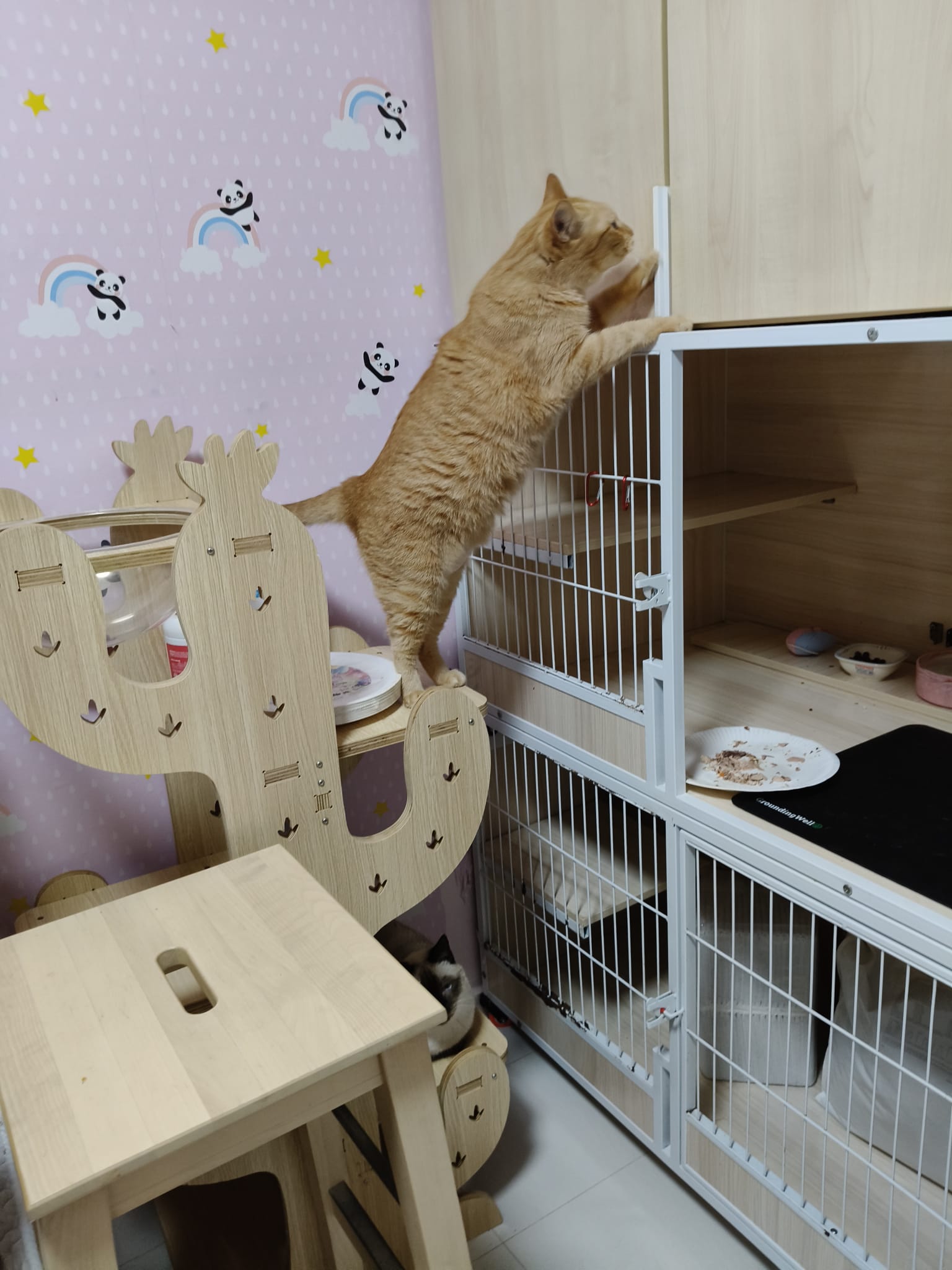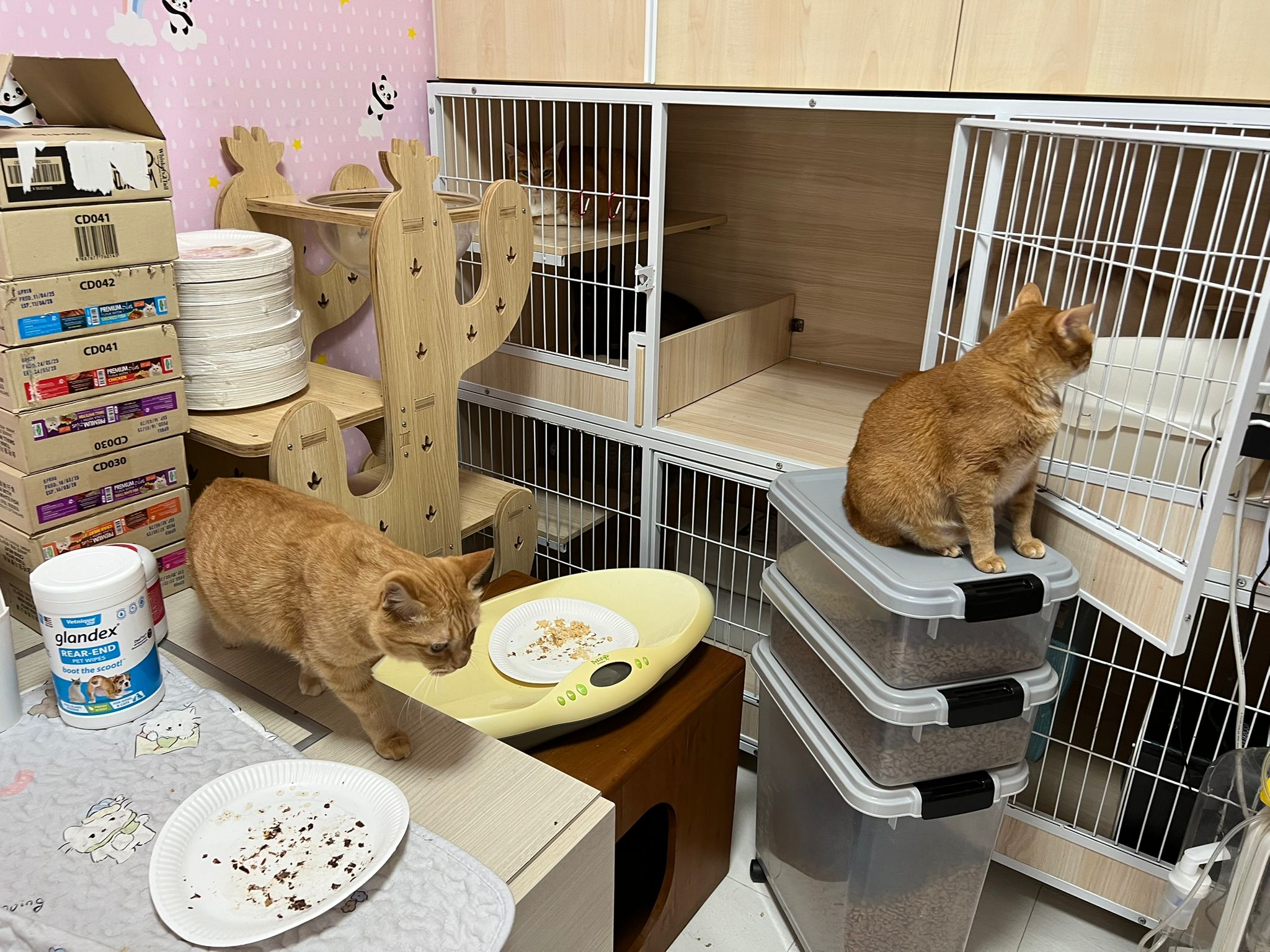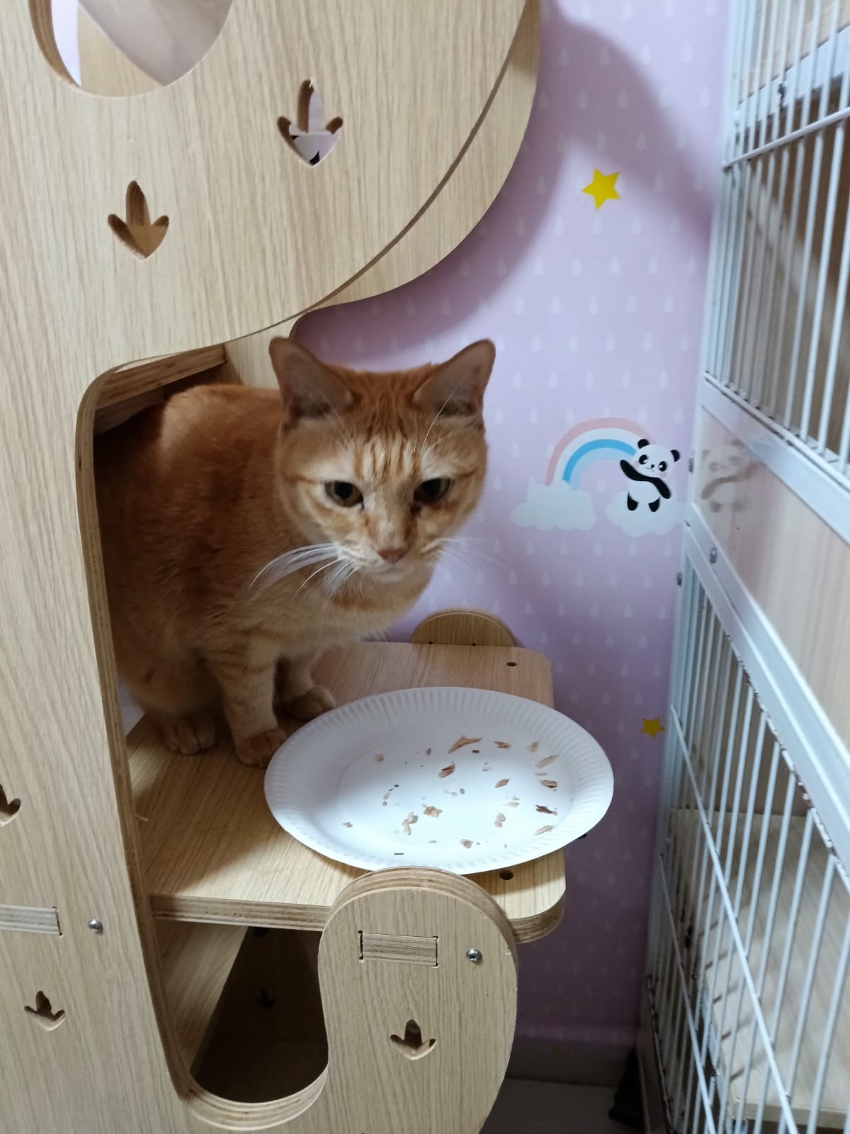 8am+-2.35pm: I’m a happy mao today. I stay in 猫房 for so long. Today all the cats staying in the food room for safety air reason. Cos new room need through and proper clean up first. I carried char to the cage and she had been there n quite ok w Teddy ard. boy didn’t disturb her as much cos so many of them in the room. She still active when it’s food time