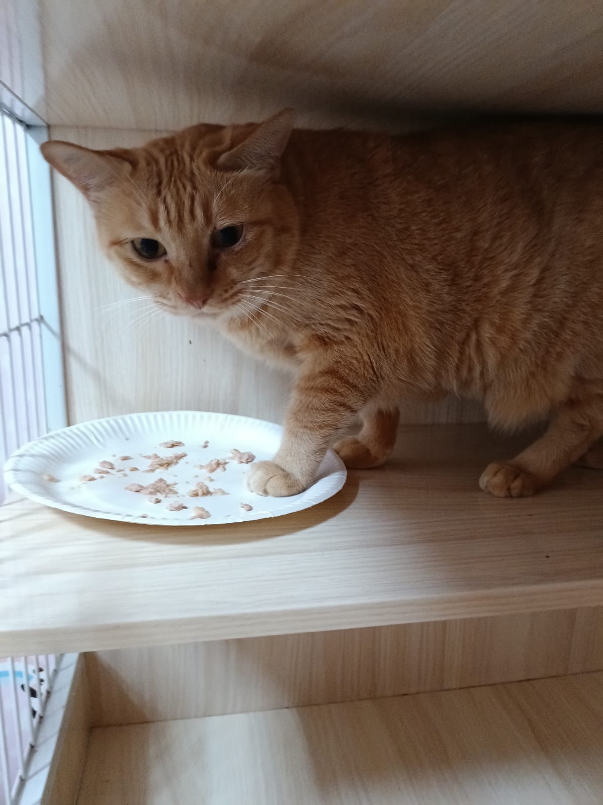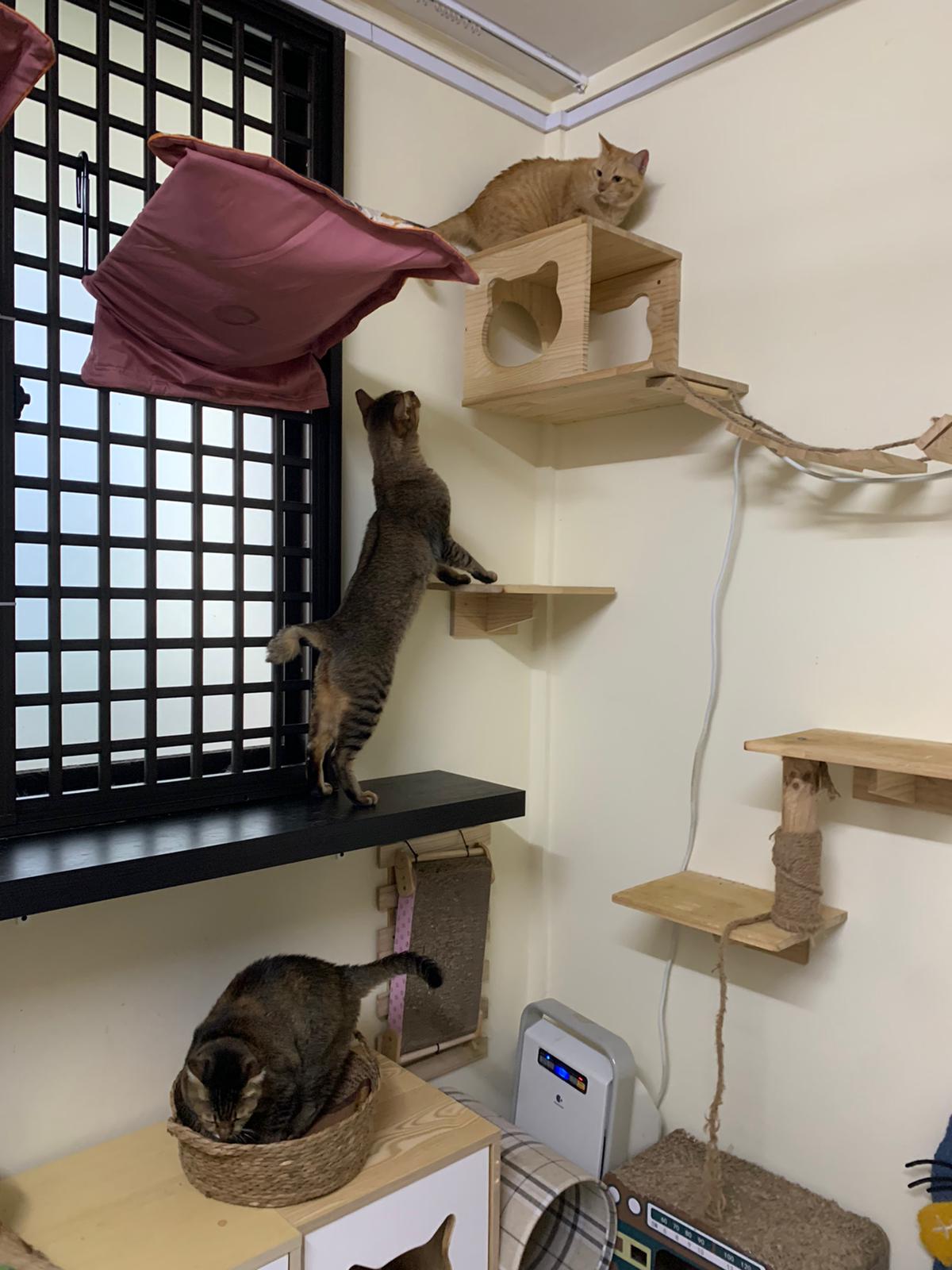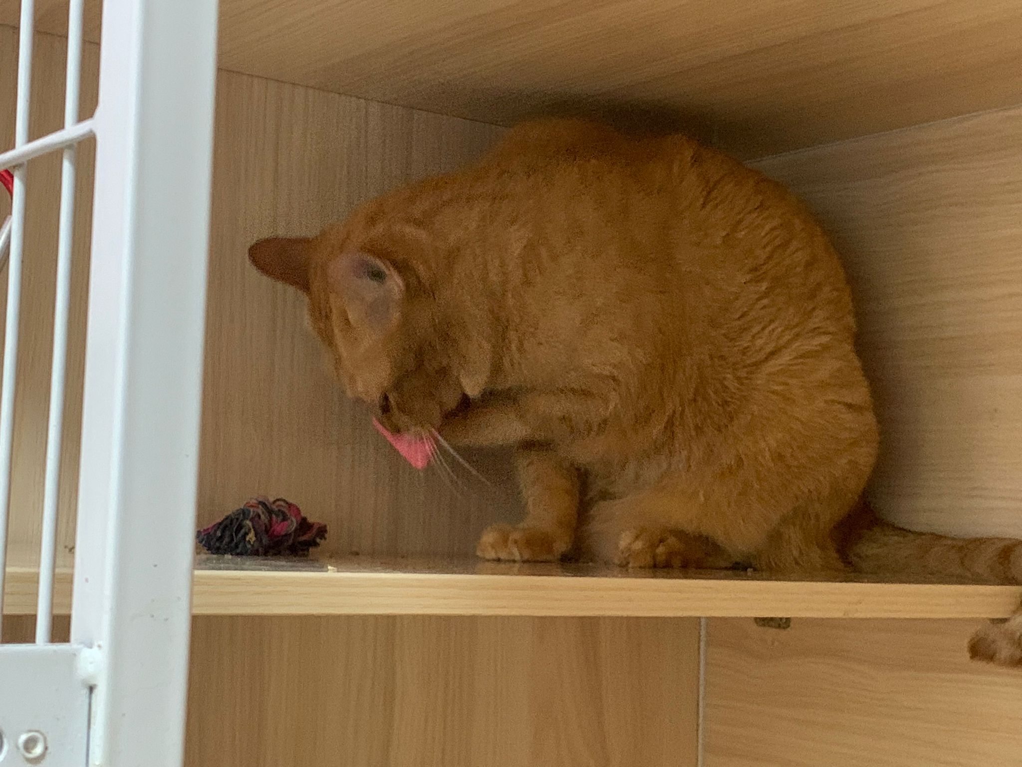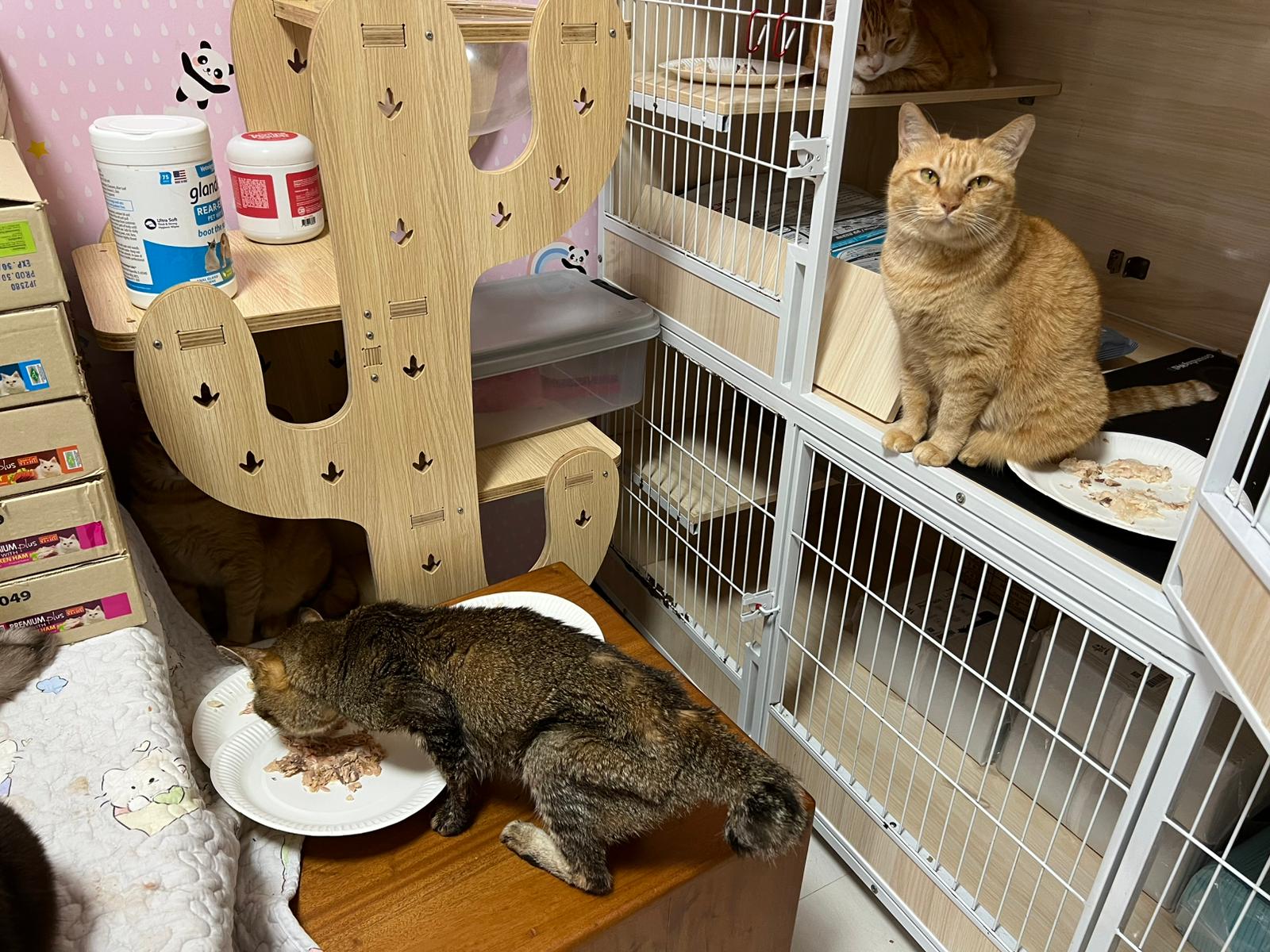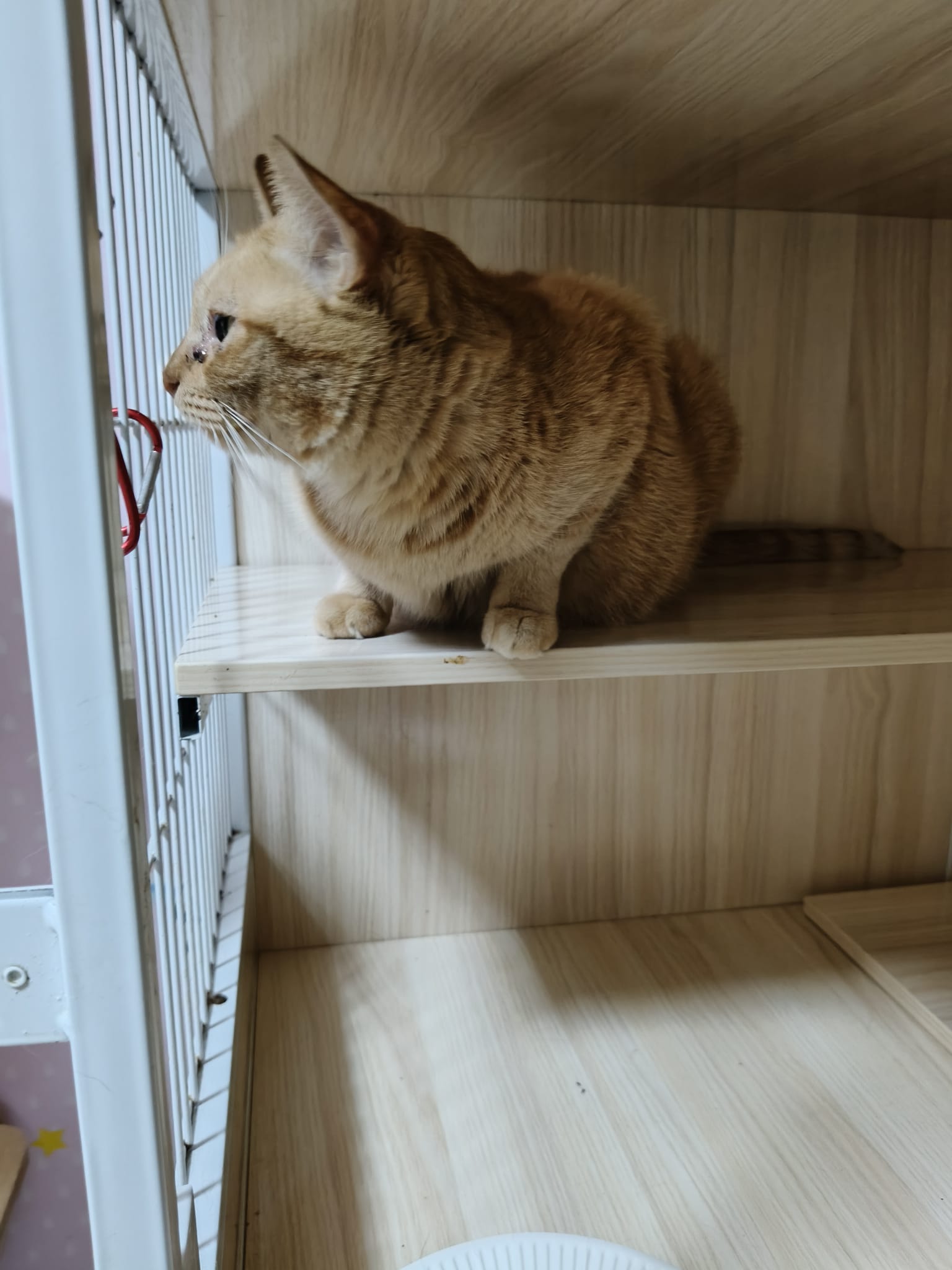 8am+-2.35pm: I’m a happy mao today. I stay in 猫房 for so long. Today all the cats staying in the food room for safety air reason. Cos new room need through and proper clean up first. I carried char to the cage and she had been there n quite ok w Teddy ard. boy didn’t disturb her as much cos so many of them in the room. She still active when it’s food time