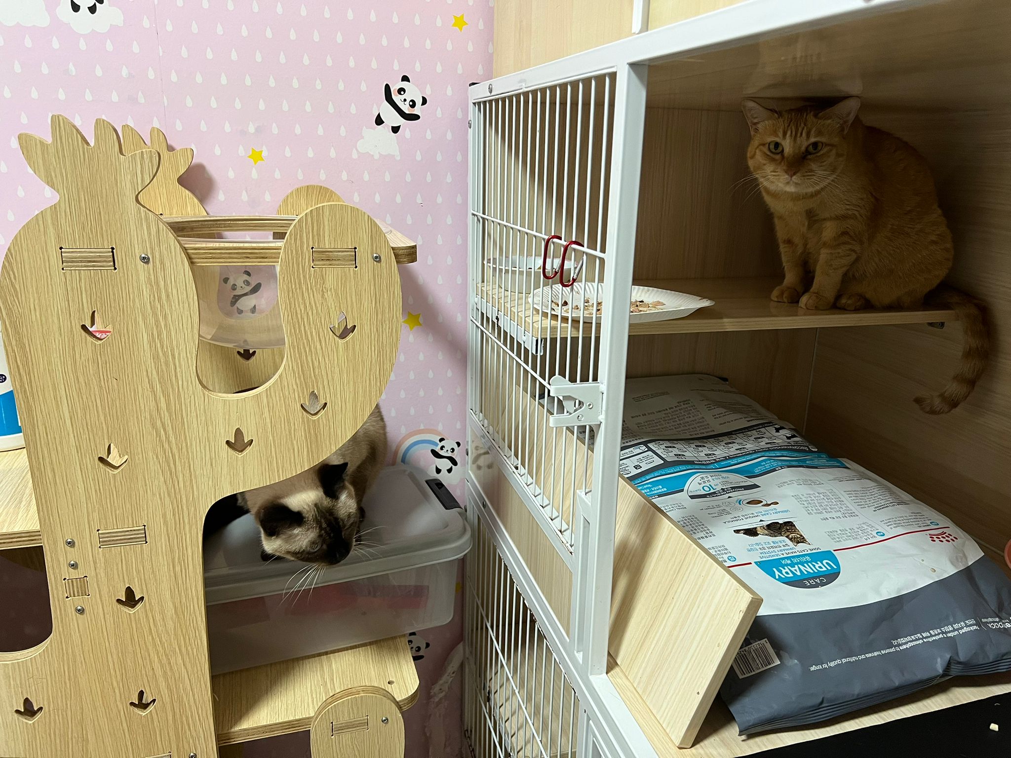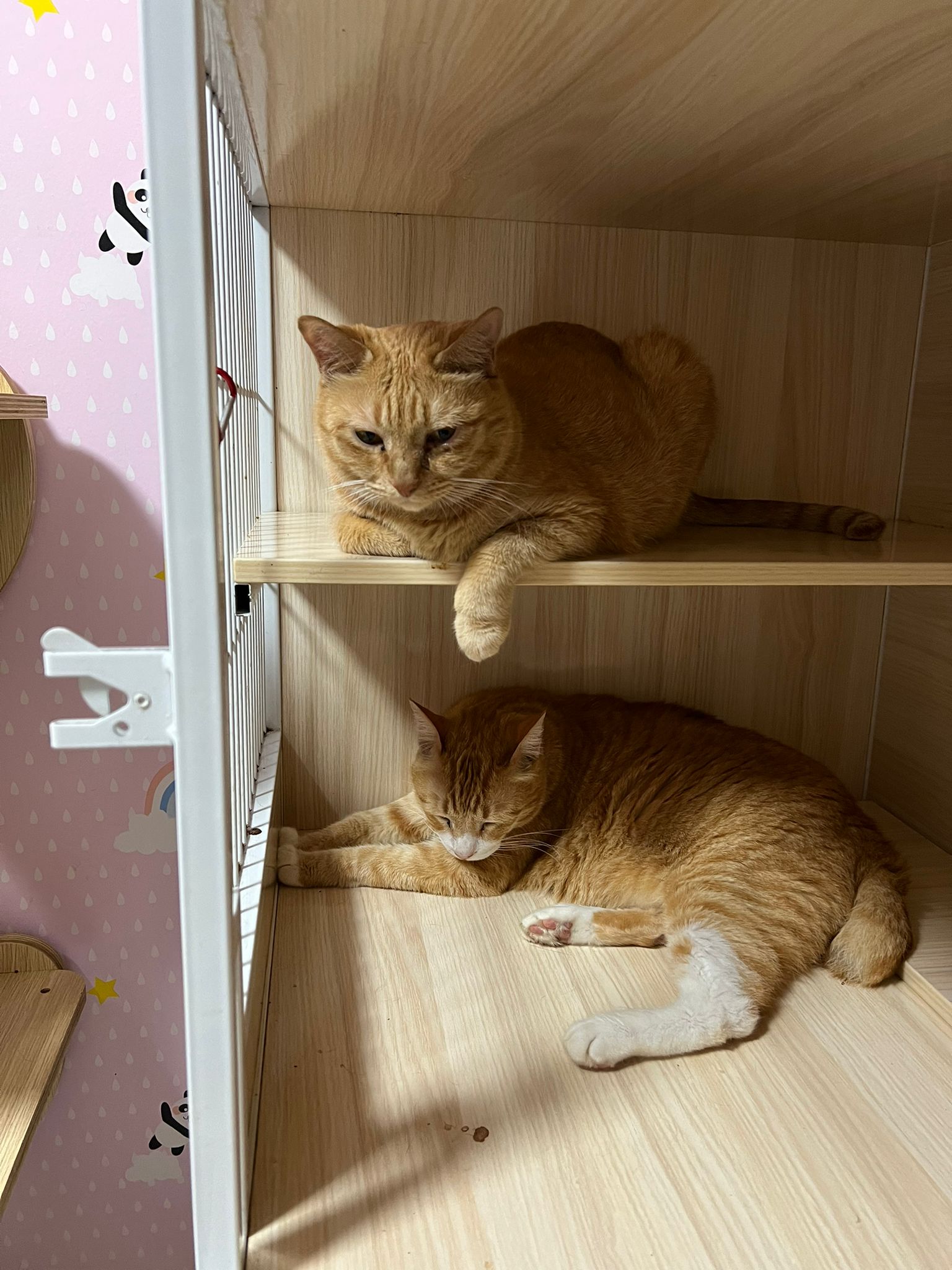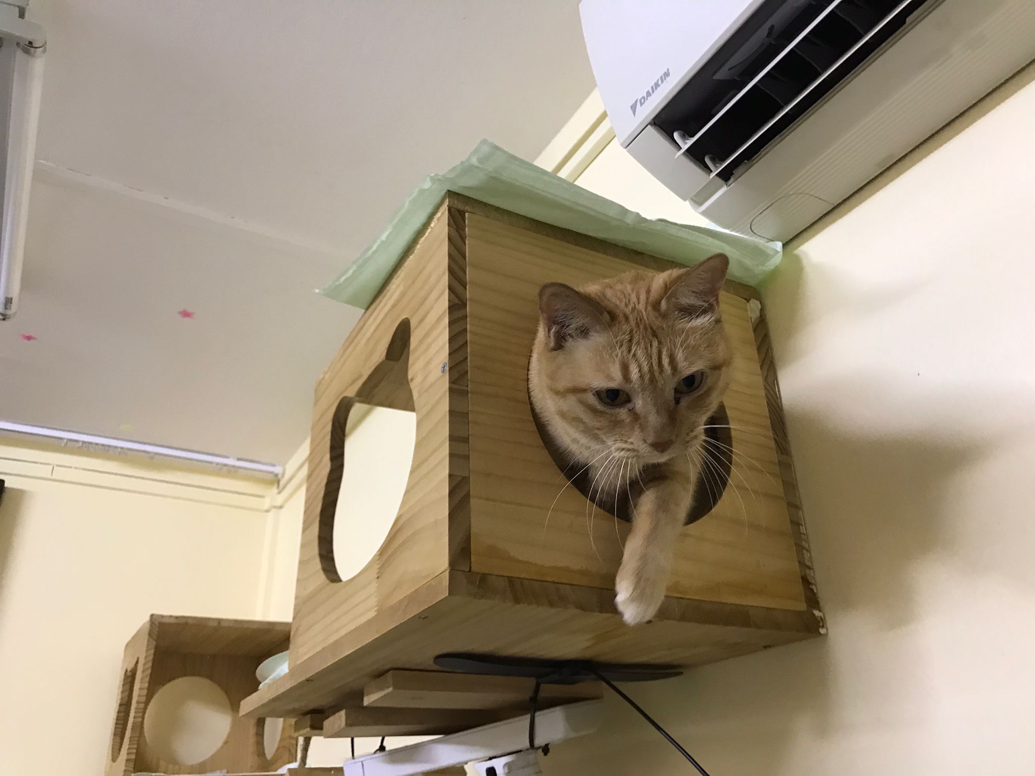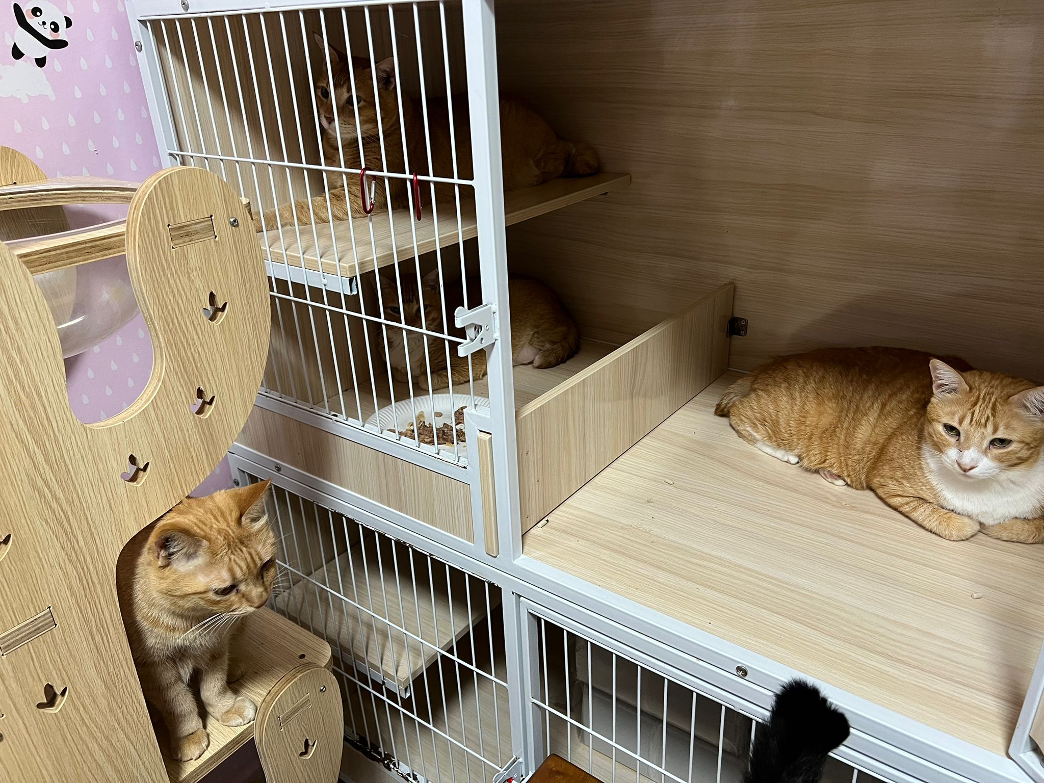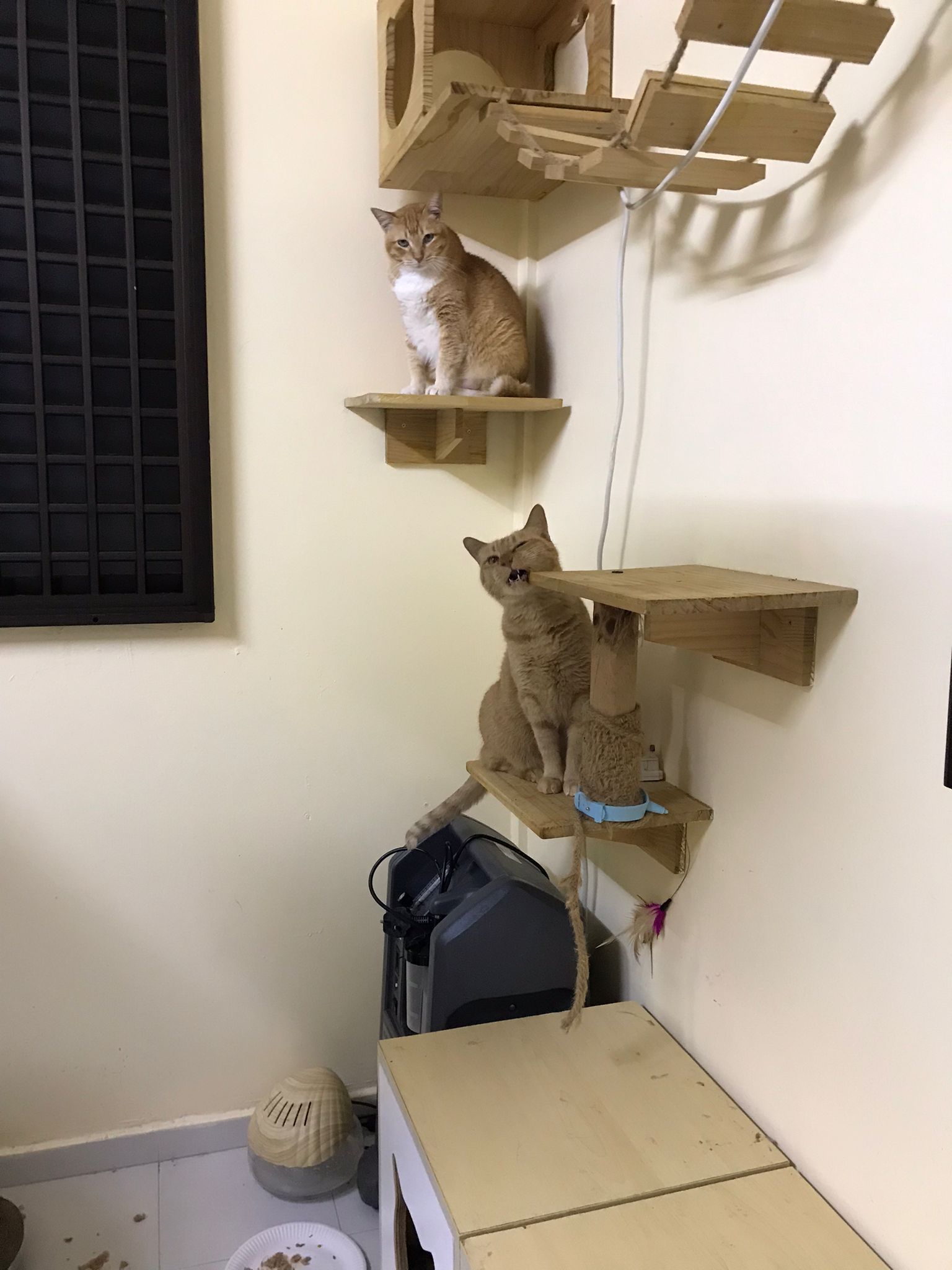 8am+-2.35pm: I’m a happy mao today. I stay in 猫房 for so long. Today all the cats staying in the food room for safety air reason. Cos new room need through and proper clean up first. I carried char to the cage and she had been there n quite ok w Teddy ard. boy didn’t disturb her as much cos so many of them in the room. She still active when it’s food time