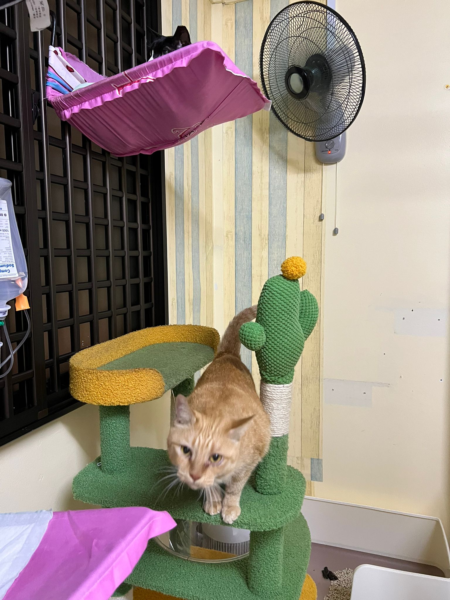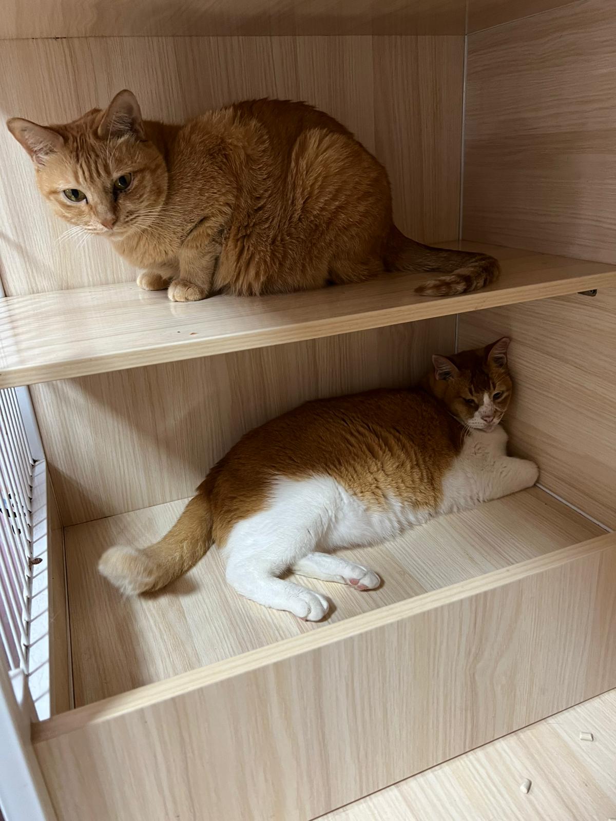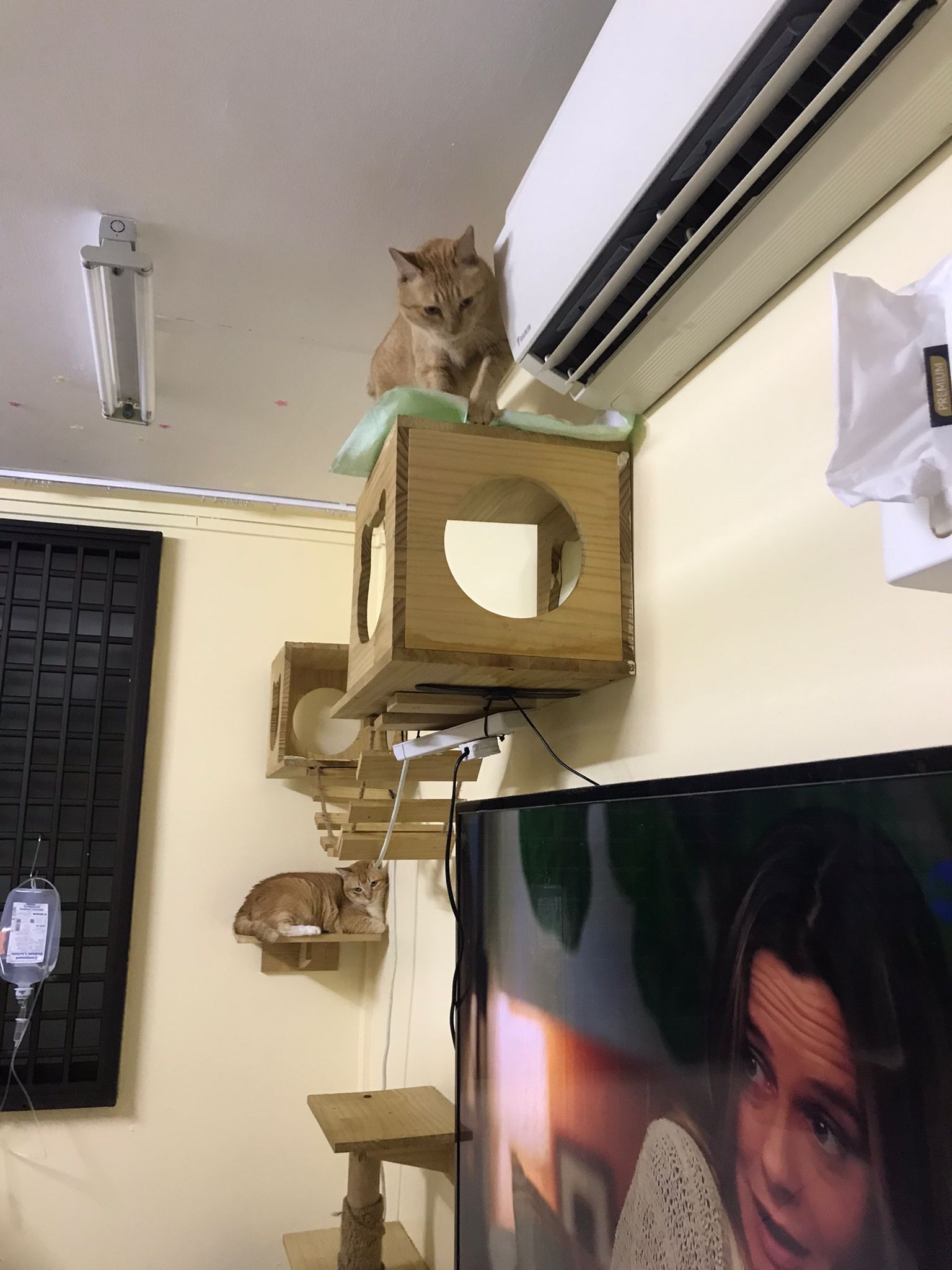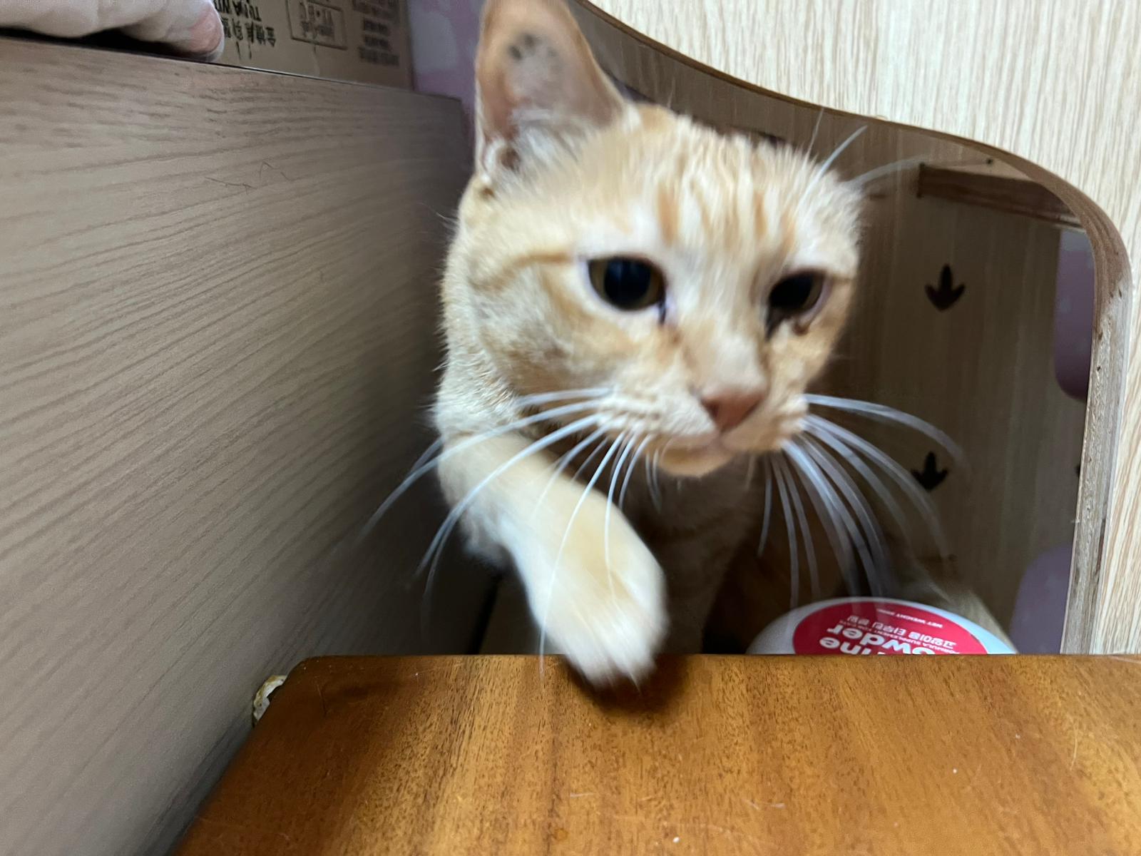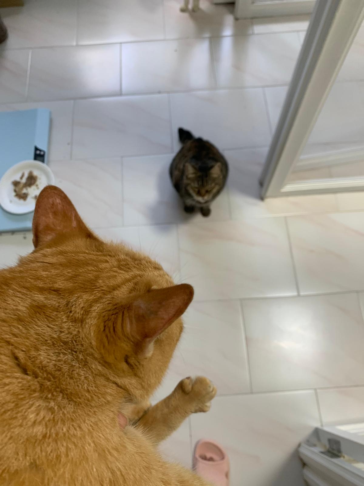 8am+-2.35pm: I’m a happy mao today. I stay in 猫房 for so long. Today all the cats staying in the food room for safety air reason. Cos new room need through and proper clean up first. I carried char to the cage and she had been there n quite ok w Teddy ard. boy didn’t disturb her as much cos so many of them in the room. She still active when it’s food time