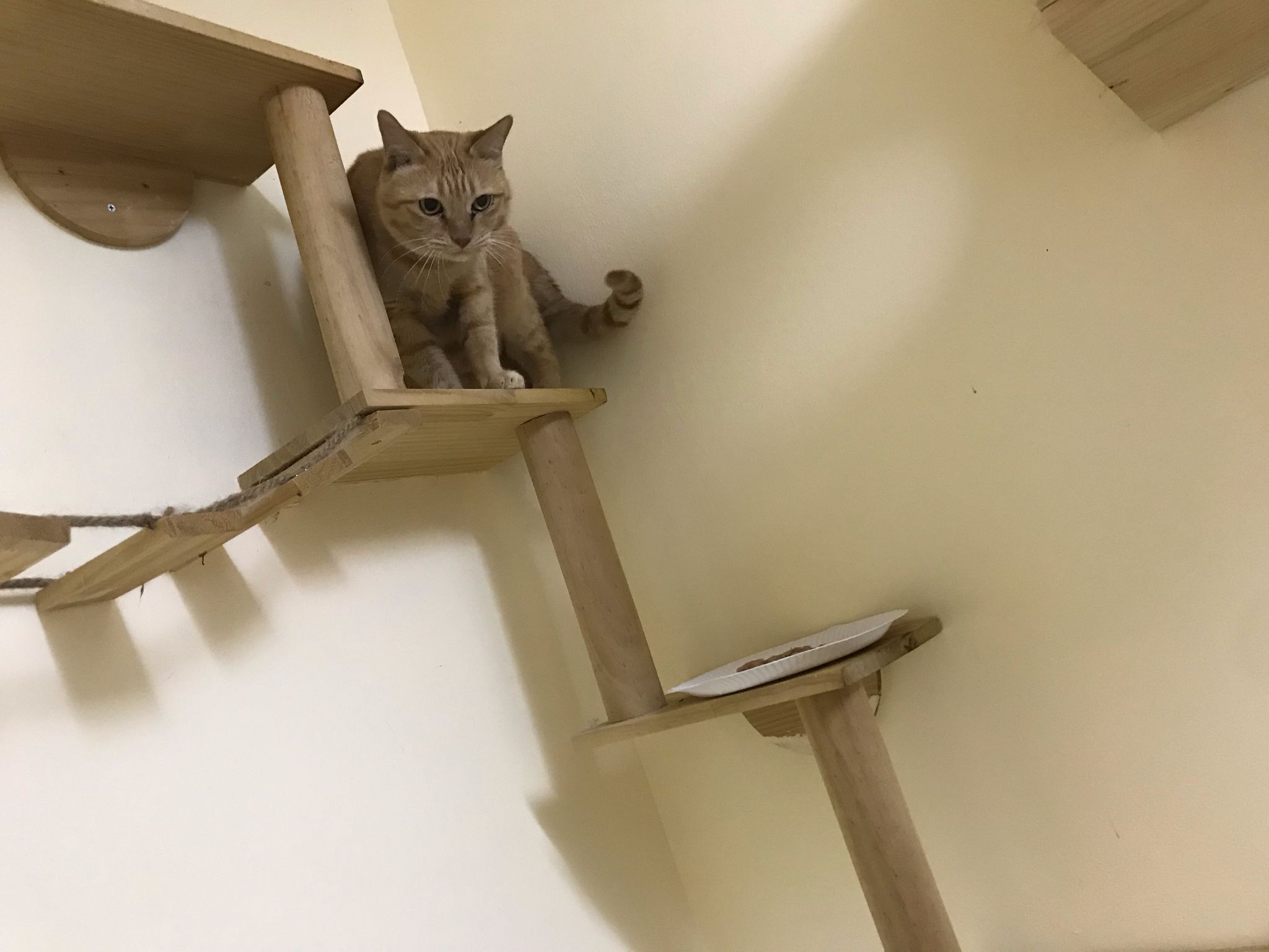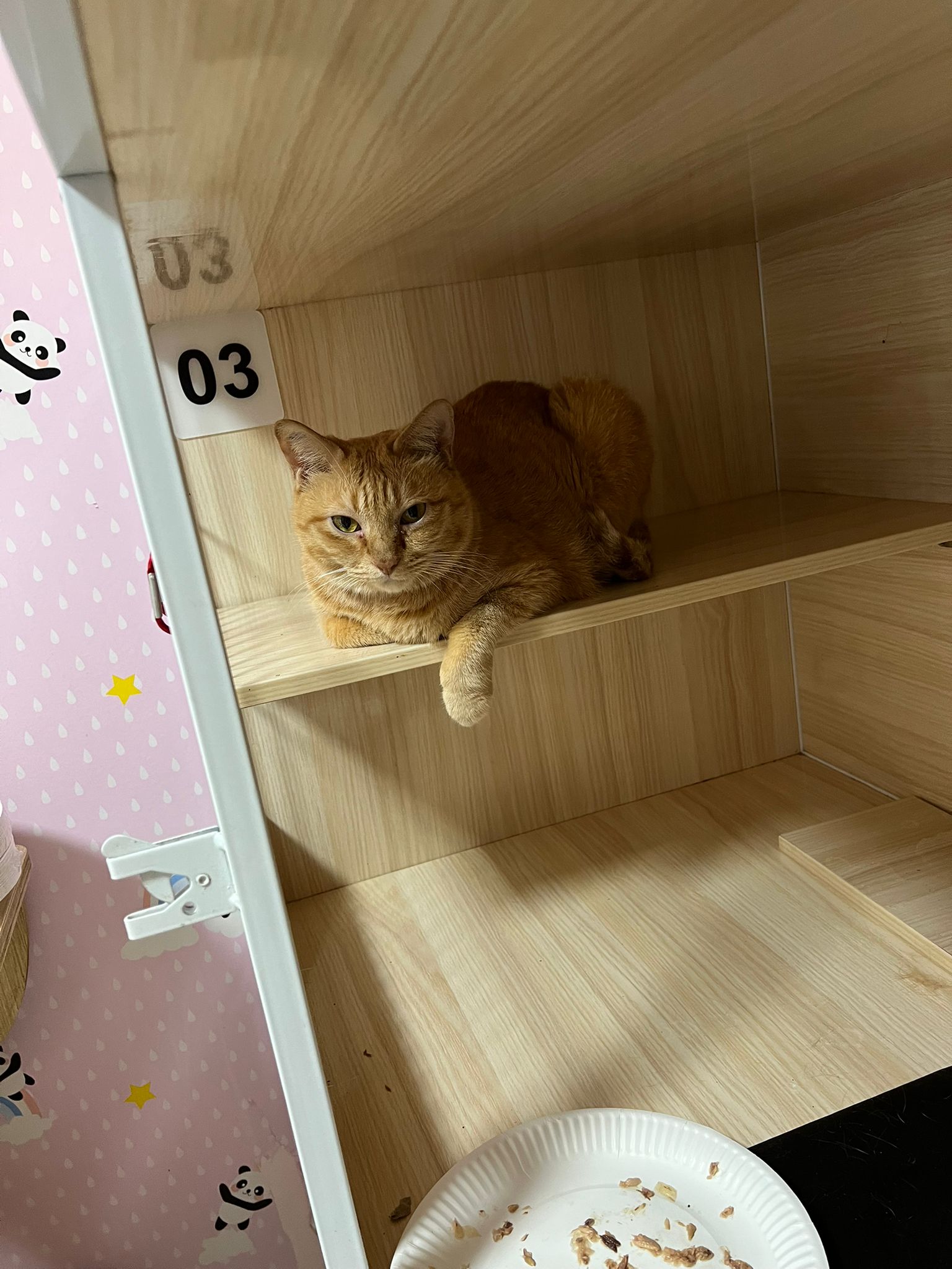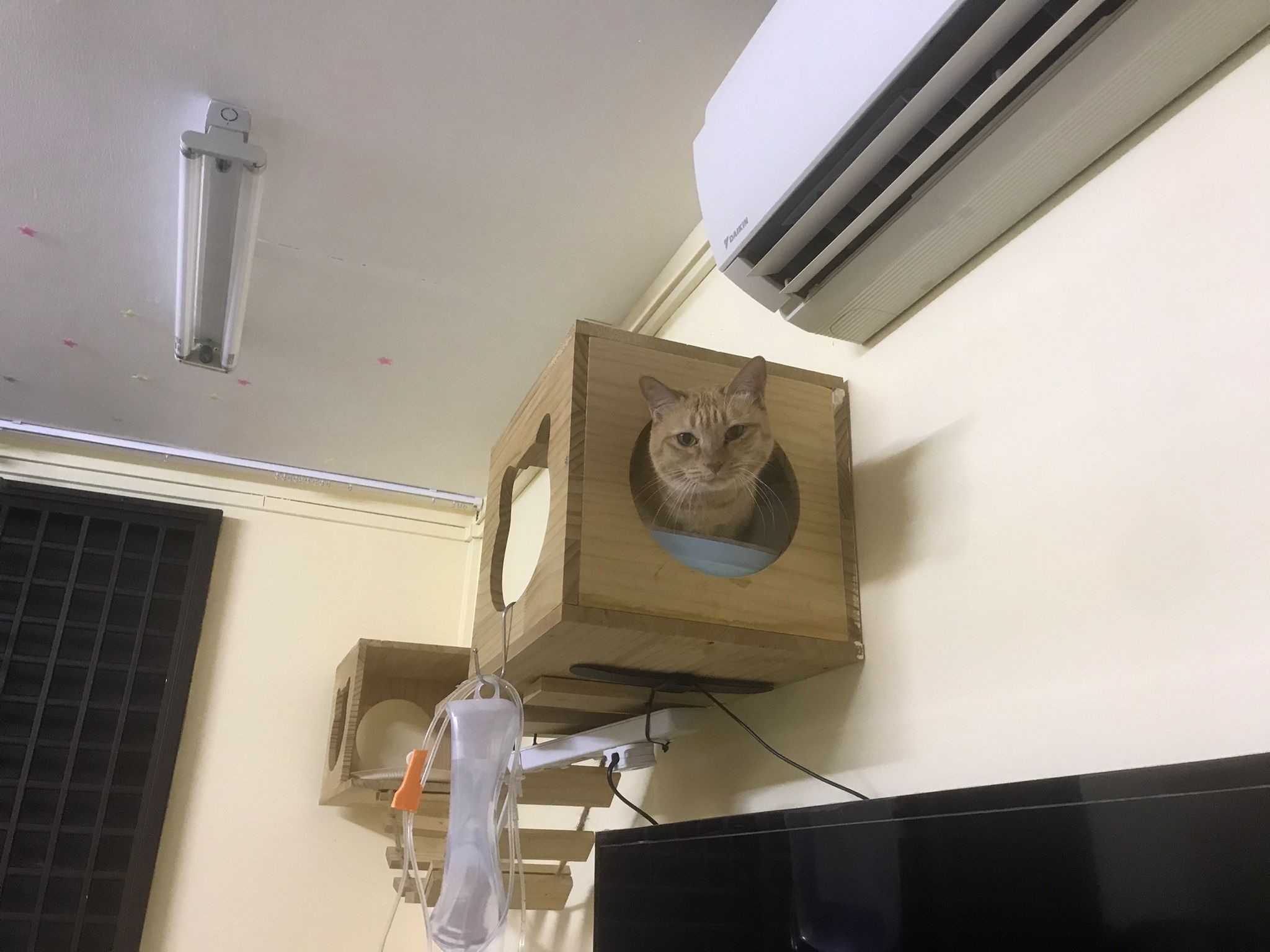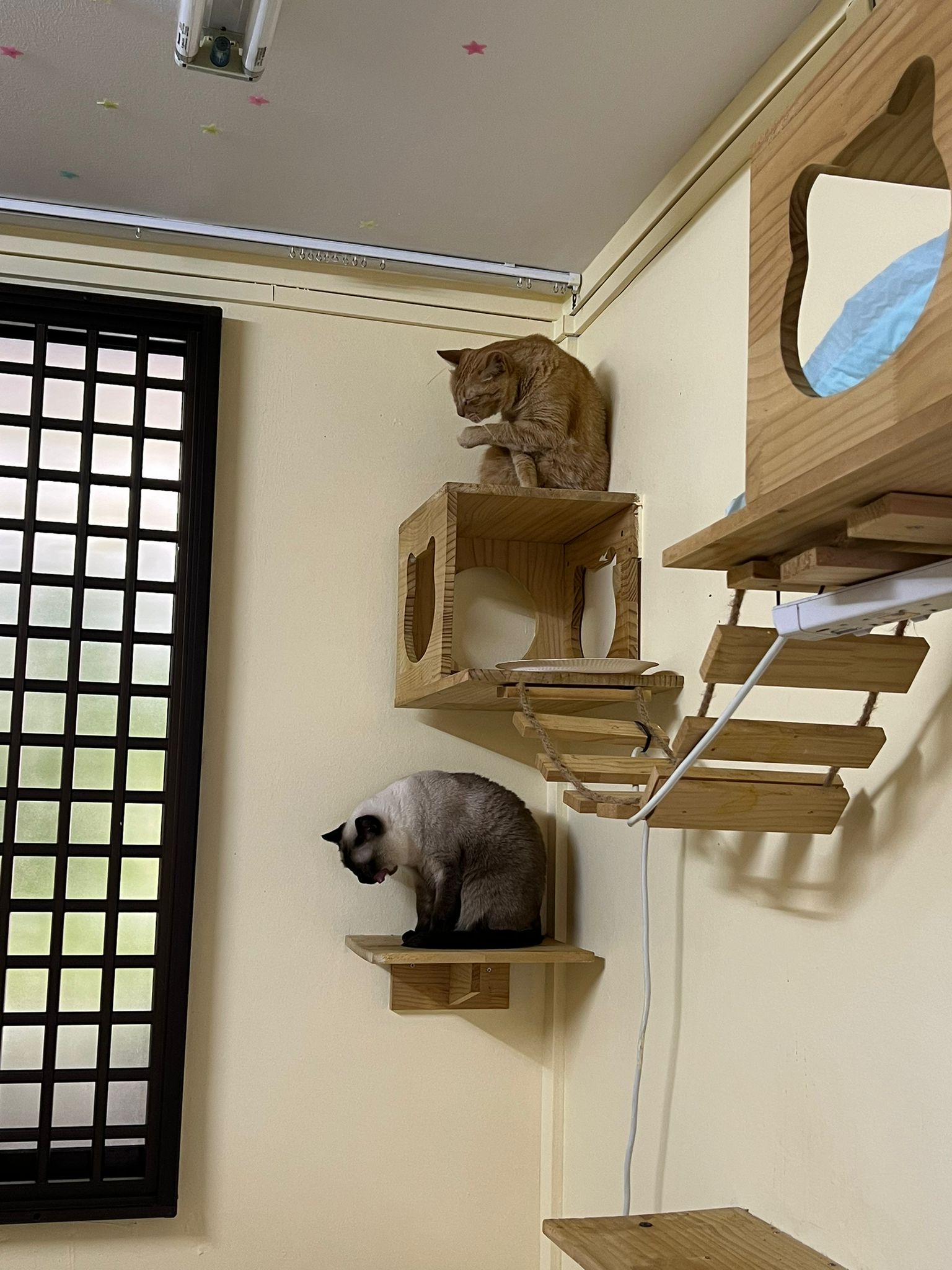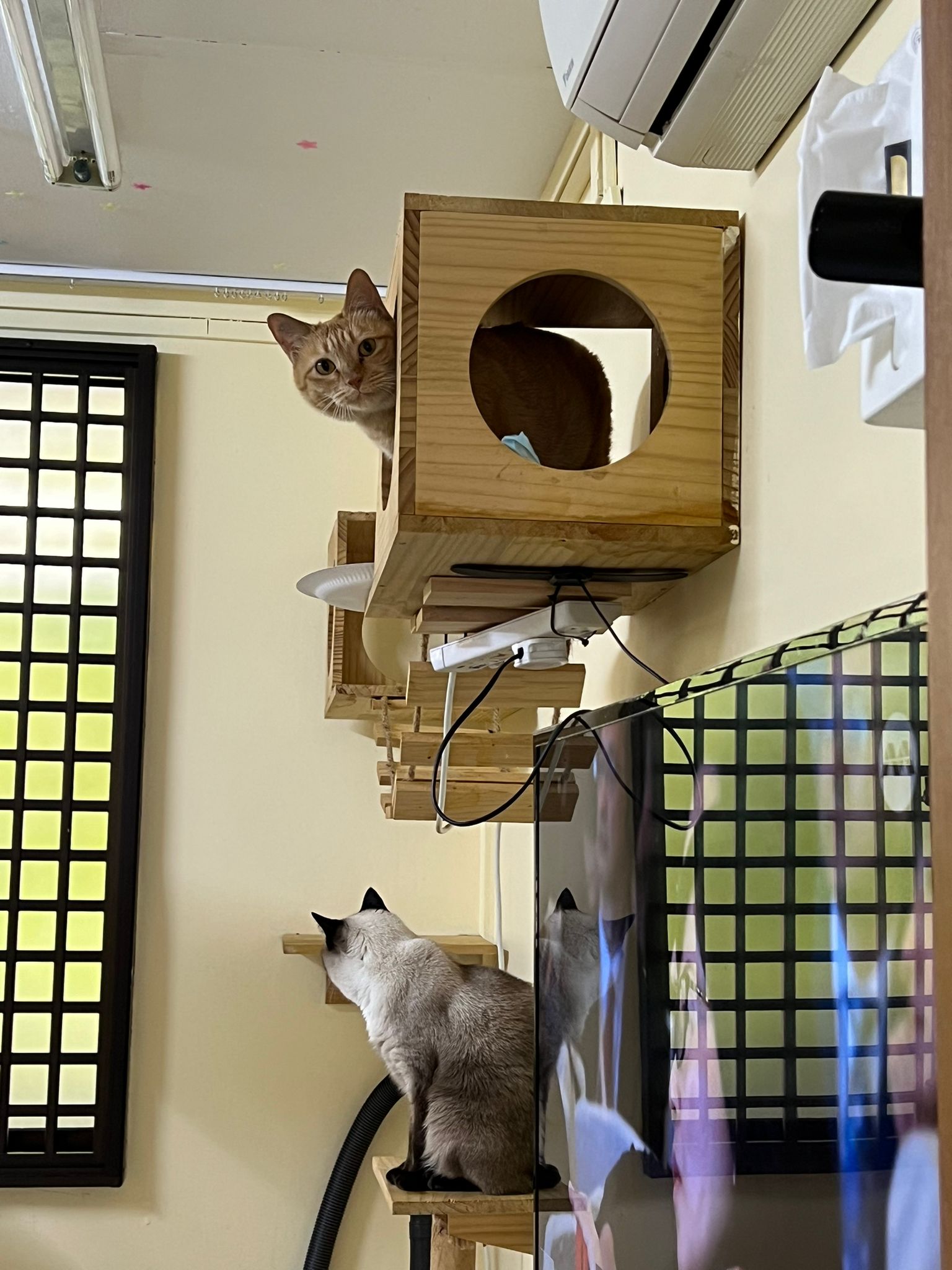8am+-2.35pm: I’m a happy mao today. I stay in 猫房 for so long. Today all the cats staying in the food room for safety air reason. Cos new room need through and proper clean up first. I carried char to the cage and she had been there n quite ok w Teddy ard. boy didn’t disturb her as much cos so many of them in the room. She still active when it’s food time