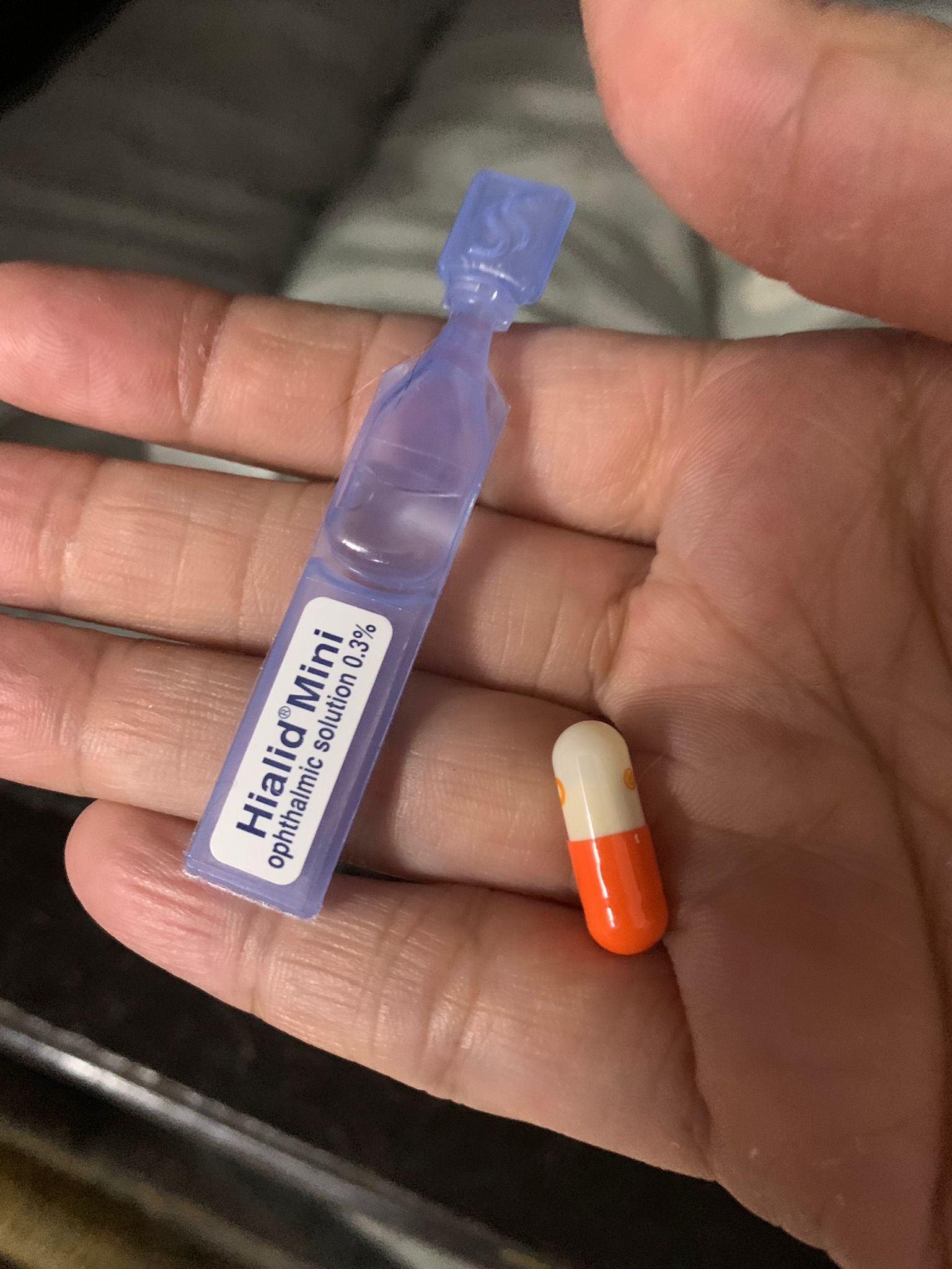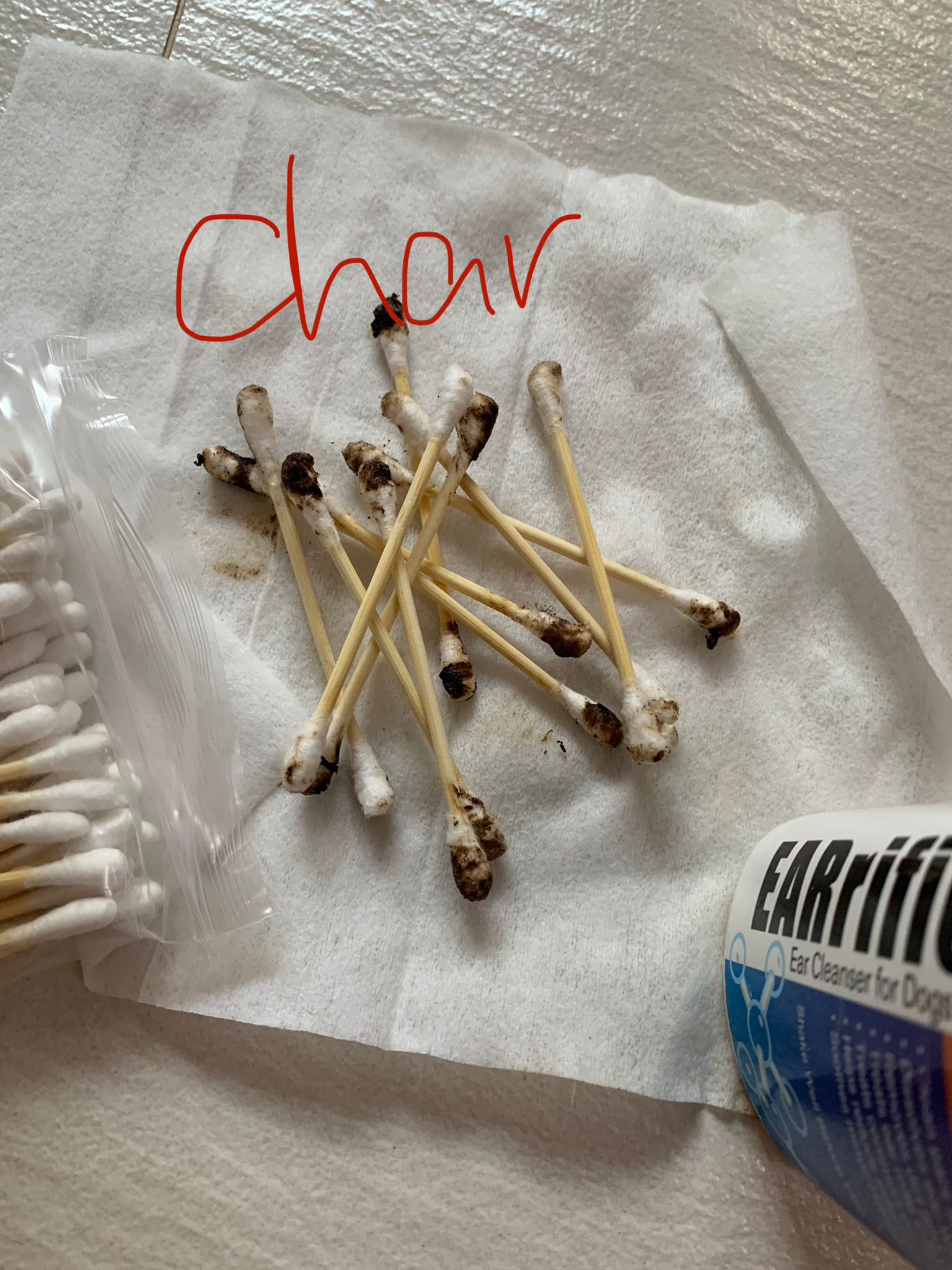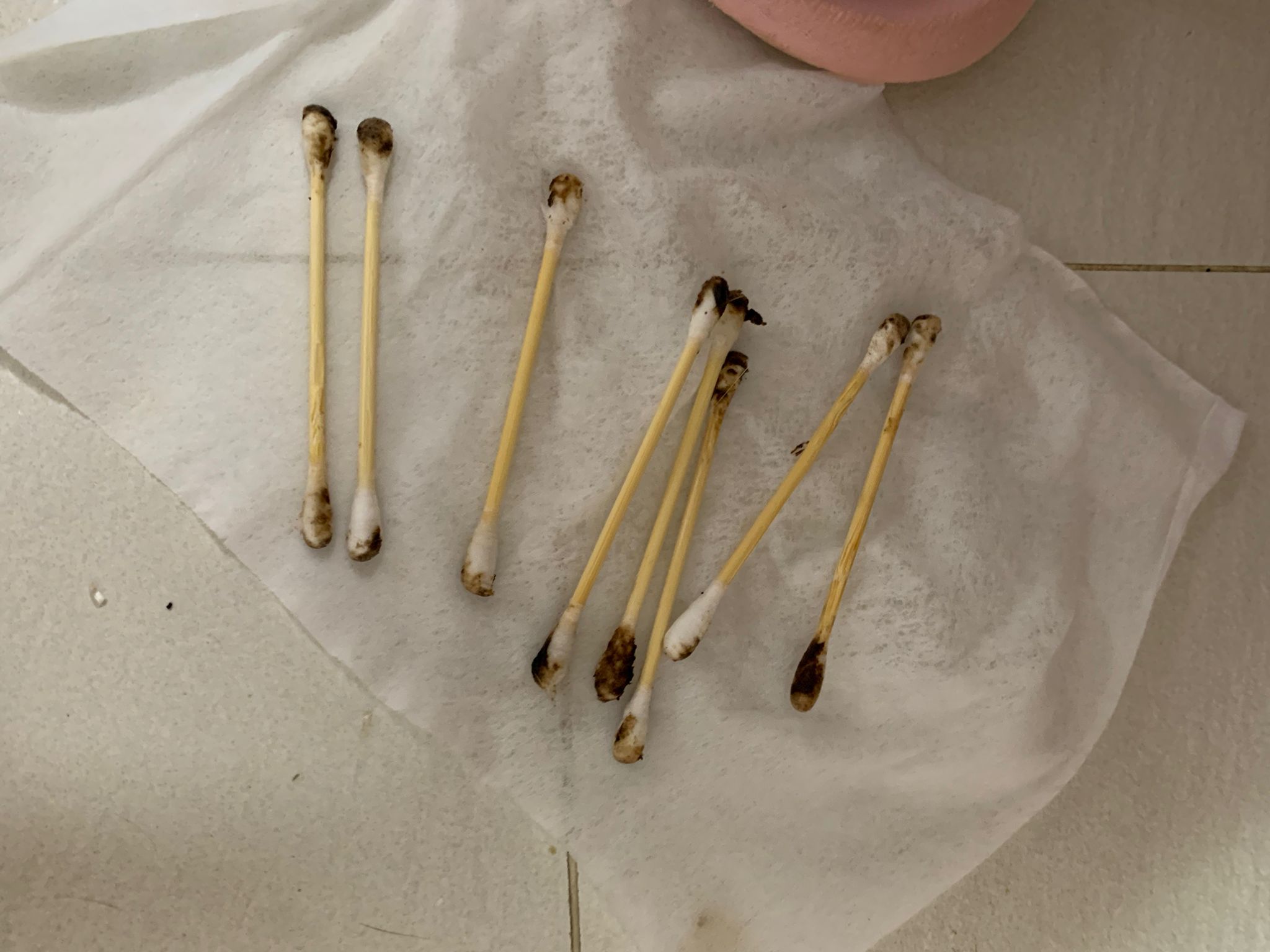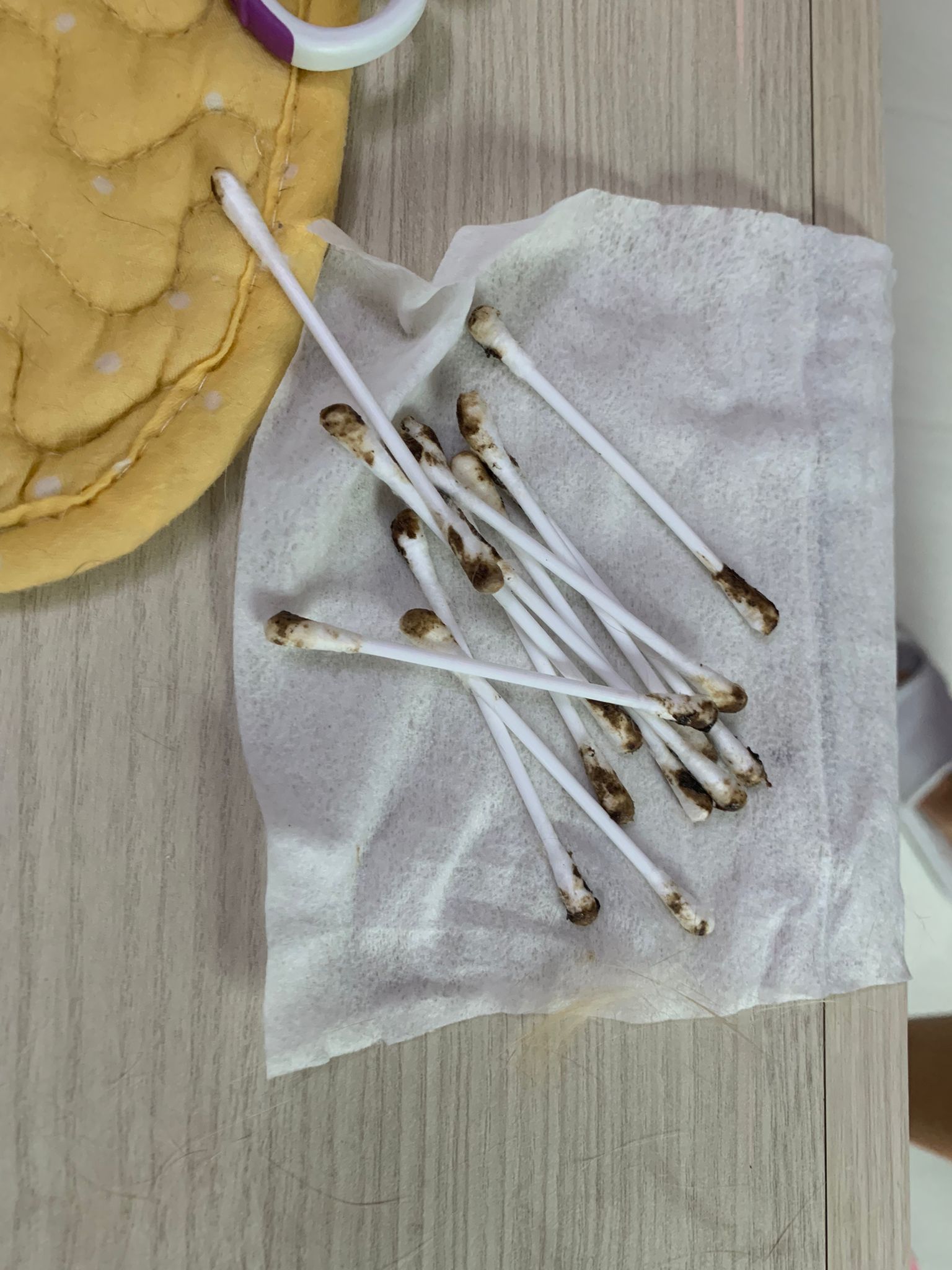 Morning: clean her eyes and both ears – super dirty. Will struggle and want attack but not really la. a bit over shocked n cough, i calm her down.