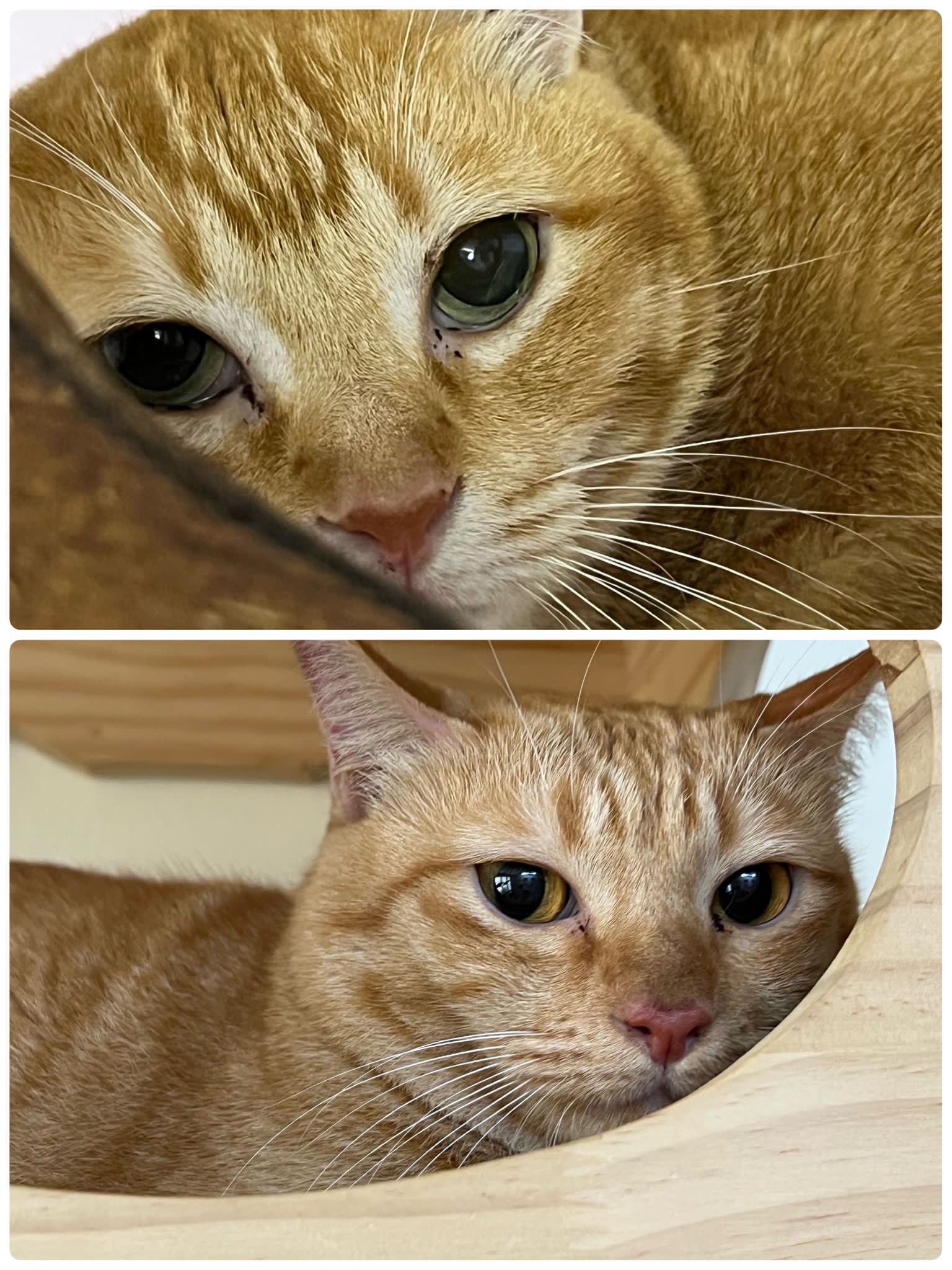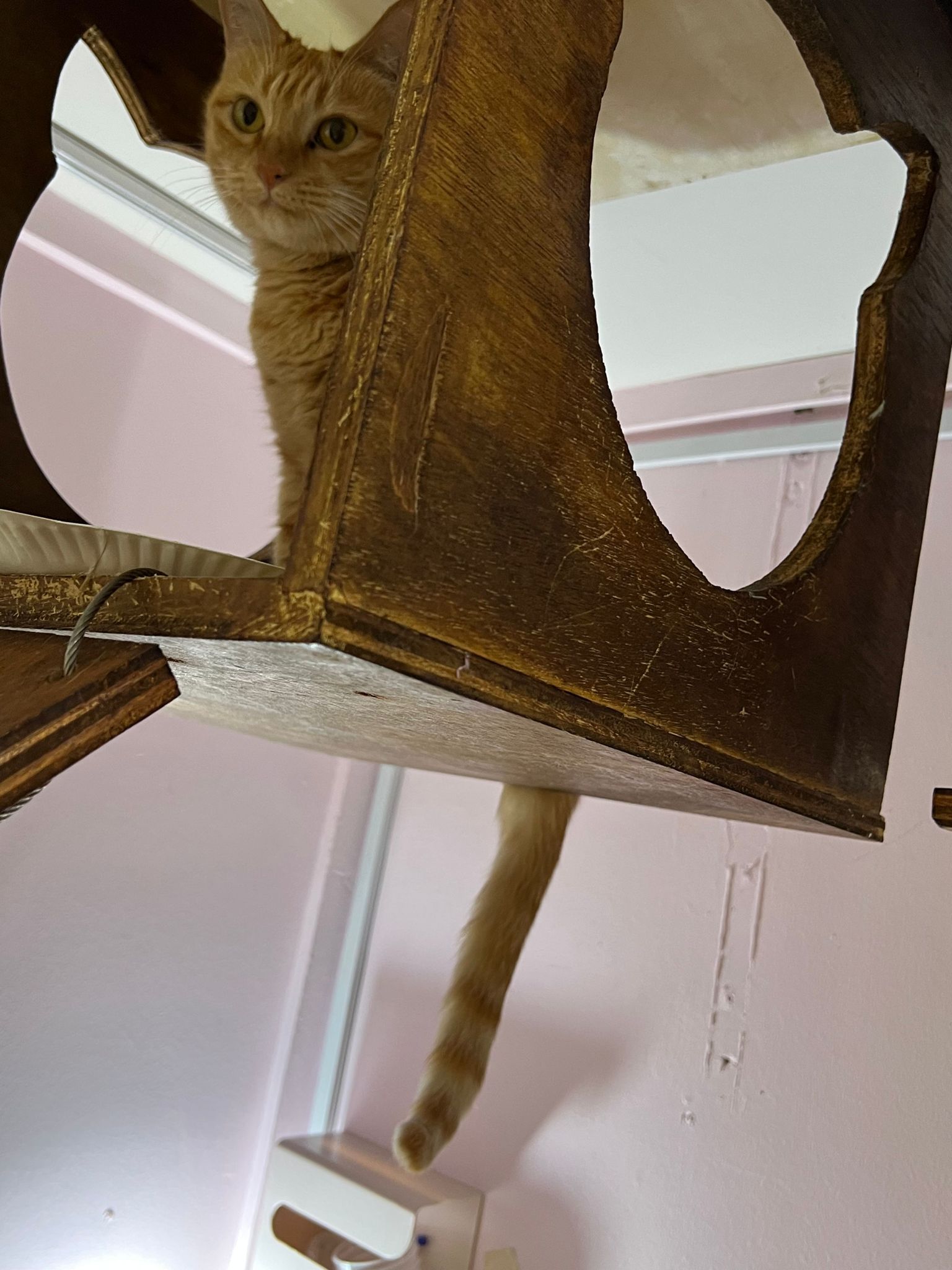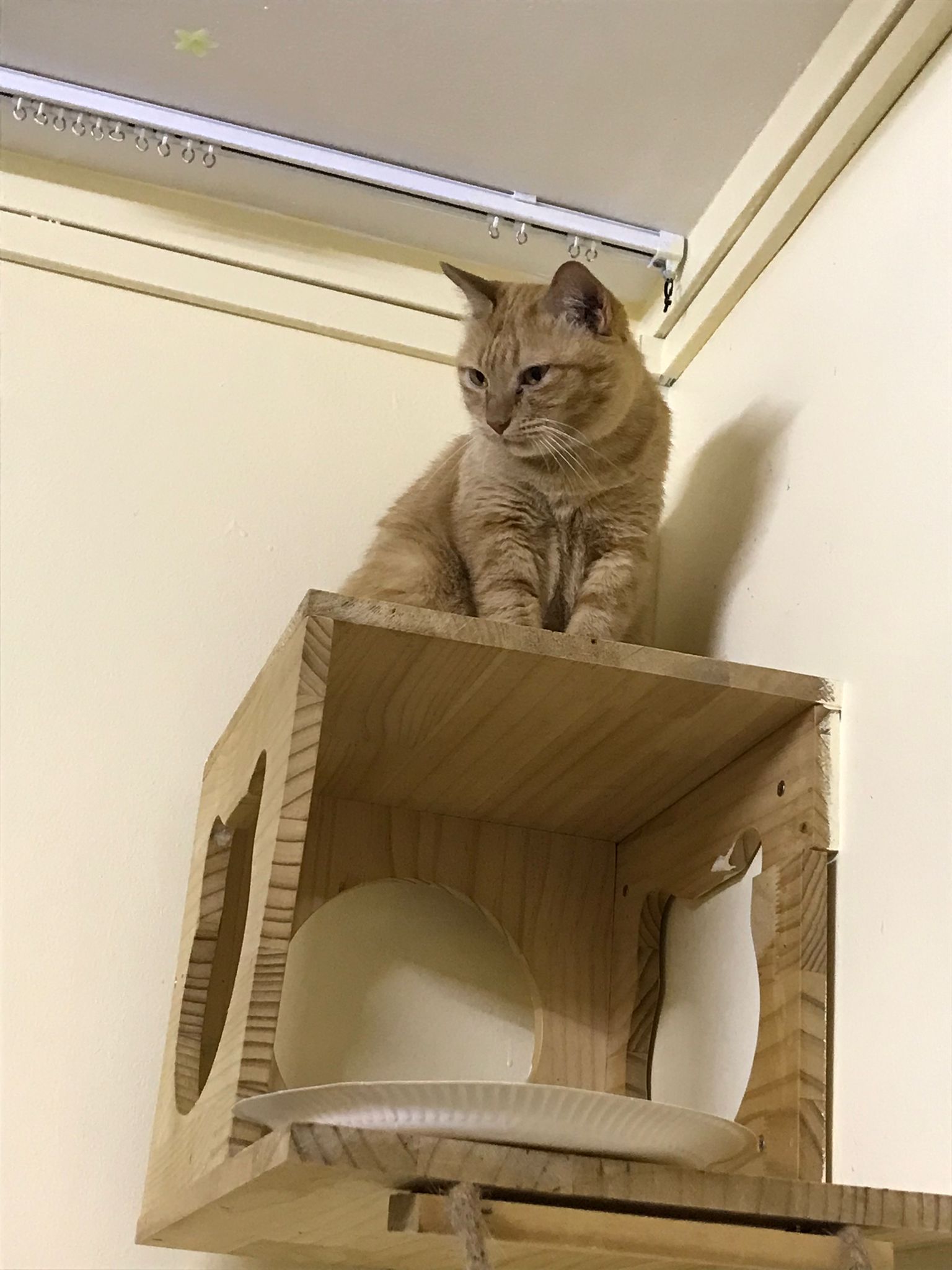 Morning: she sit on the cat cactus and I clean her eyes and she come out to play and stretch on the ctn boxes and big bed. Wanna play w the dripline I stop her n she go on to eat