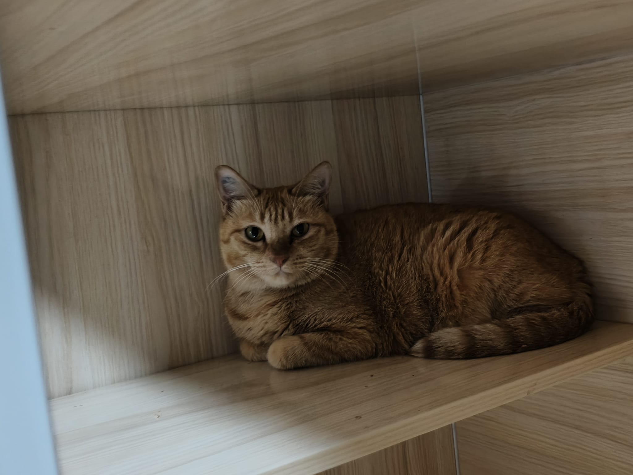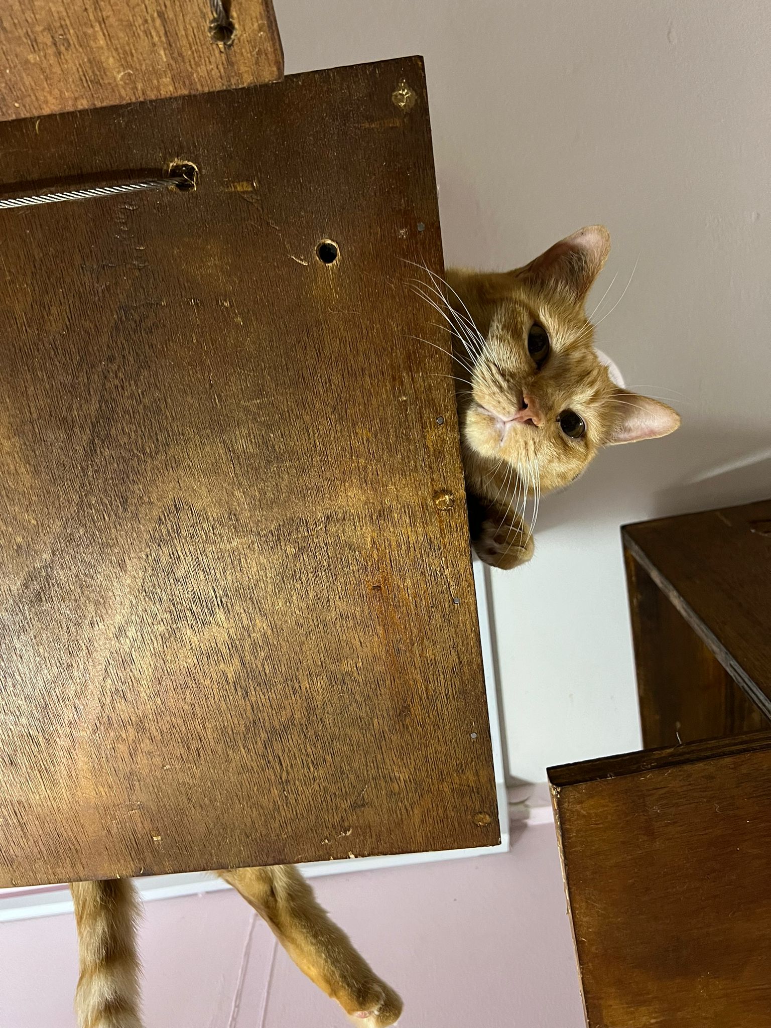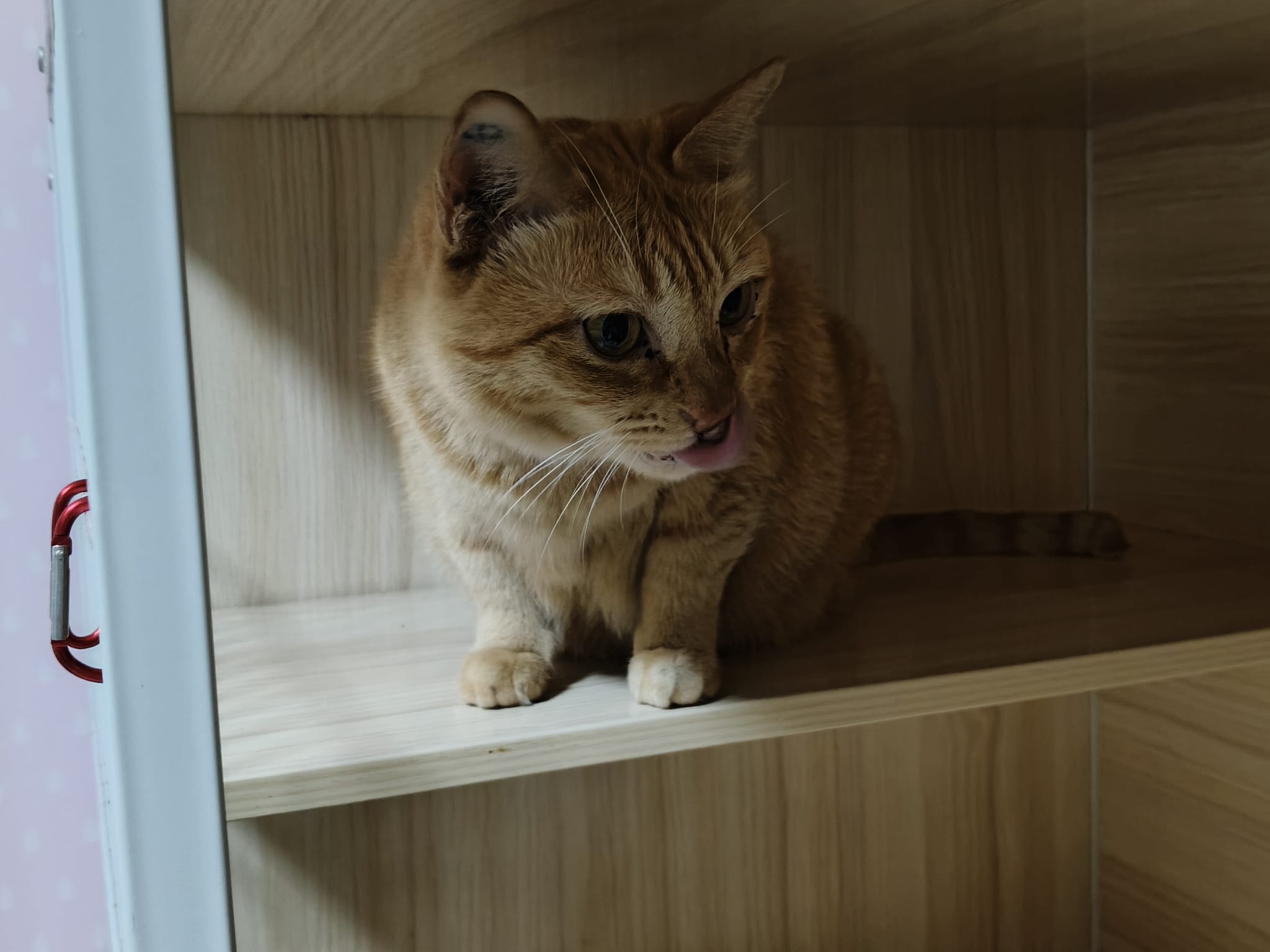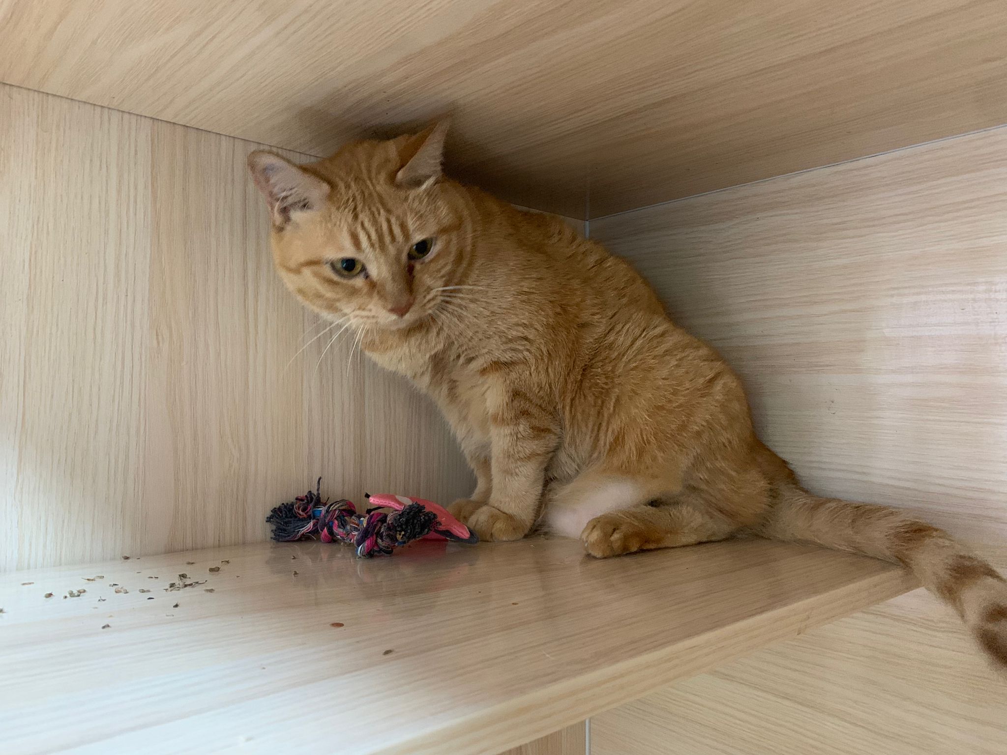 9.06pm; Jo;”When I came the door ajar then char pop out”. – ha char being playful today, know how to open cabinet door ah? And go into the shelf which I just pack some space this morning.