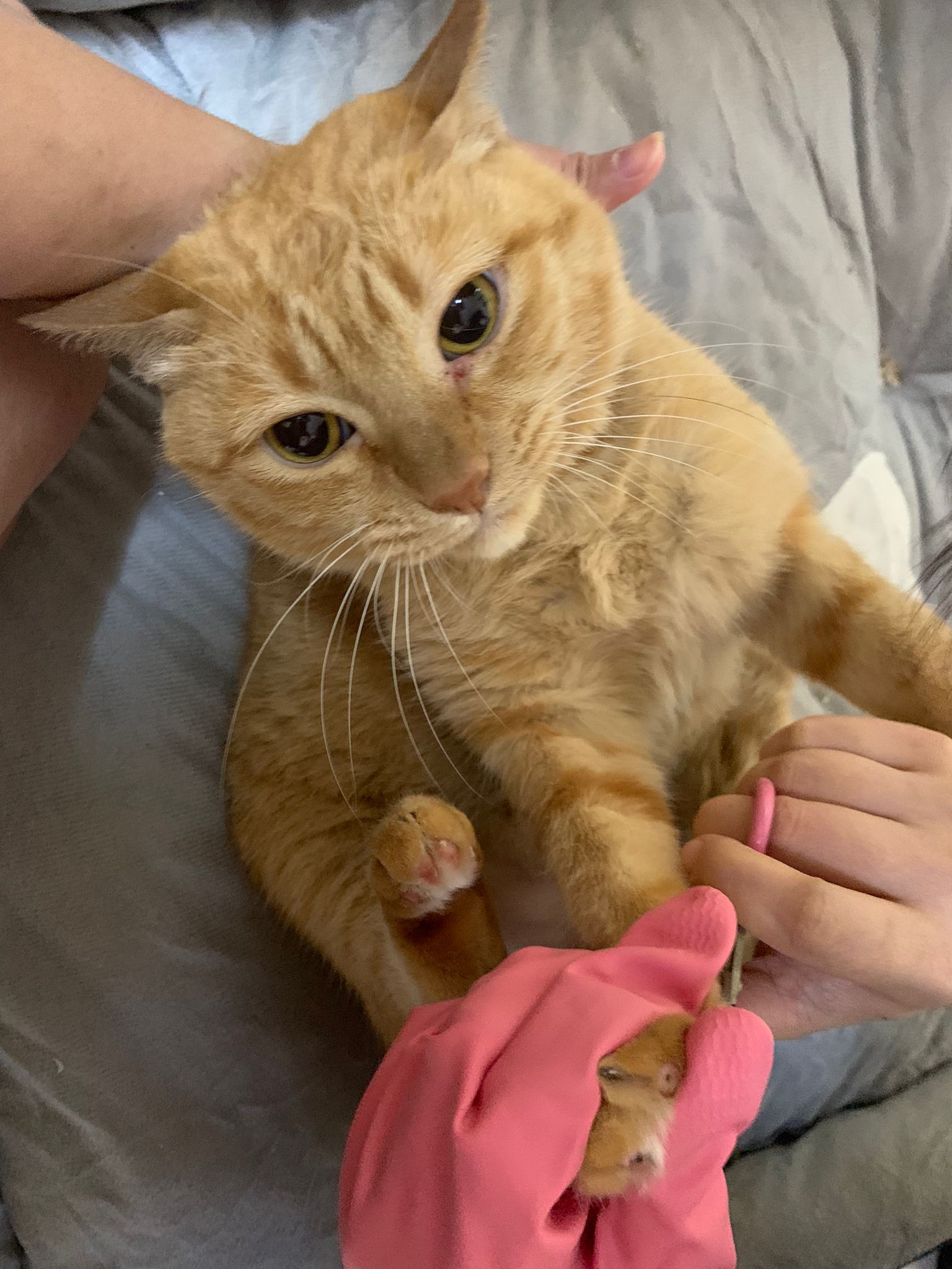 Very sticky to me, today no need me to carry, will jump down to find me, rub me till my nose is dying. Charmander forgot i allergy to cat. Must make her eat urinary pouch so serve one can of tuna w chicken w one pouch. Given Subcut w Clav. And given Sam e. Good girl in swallowing med.