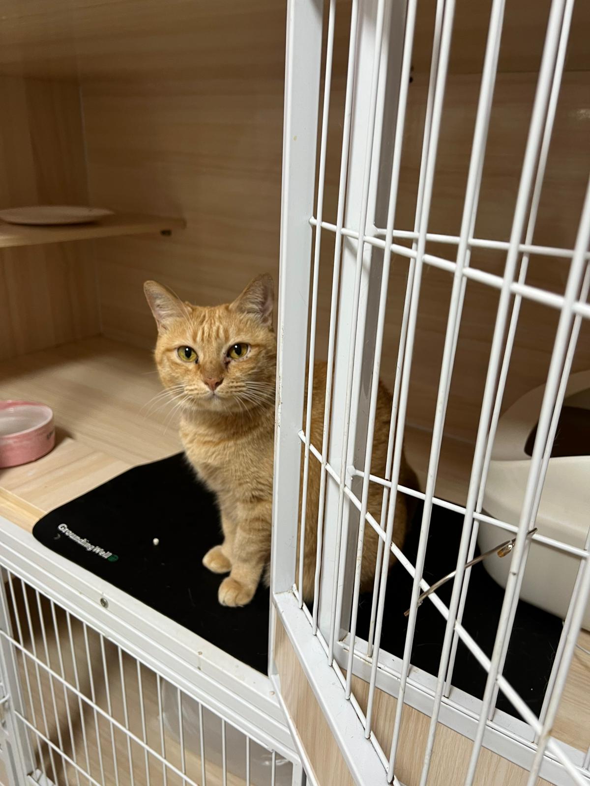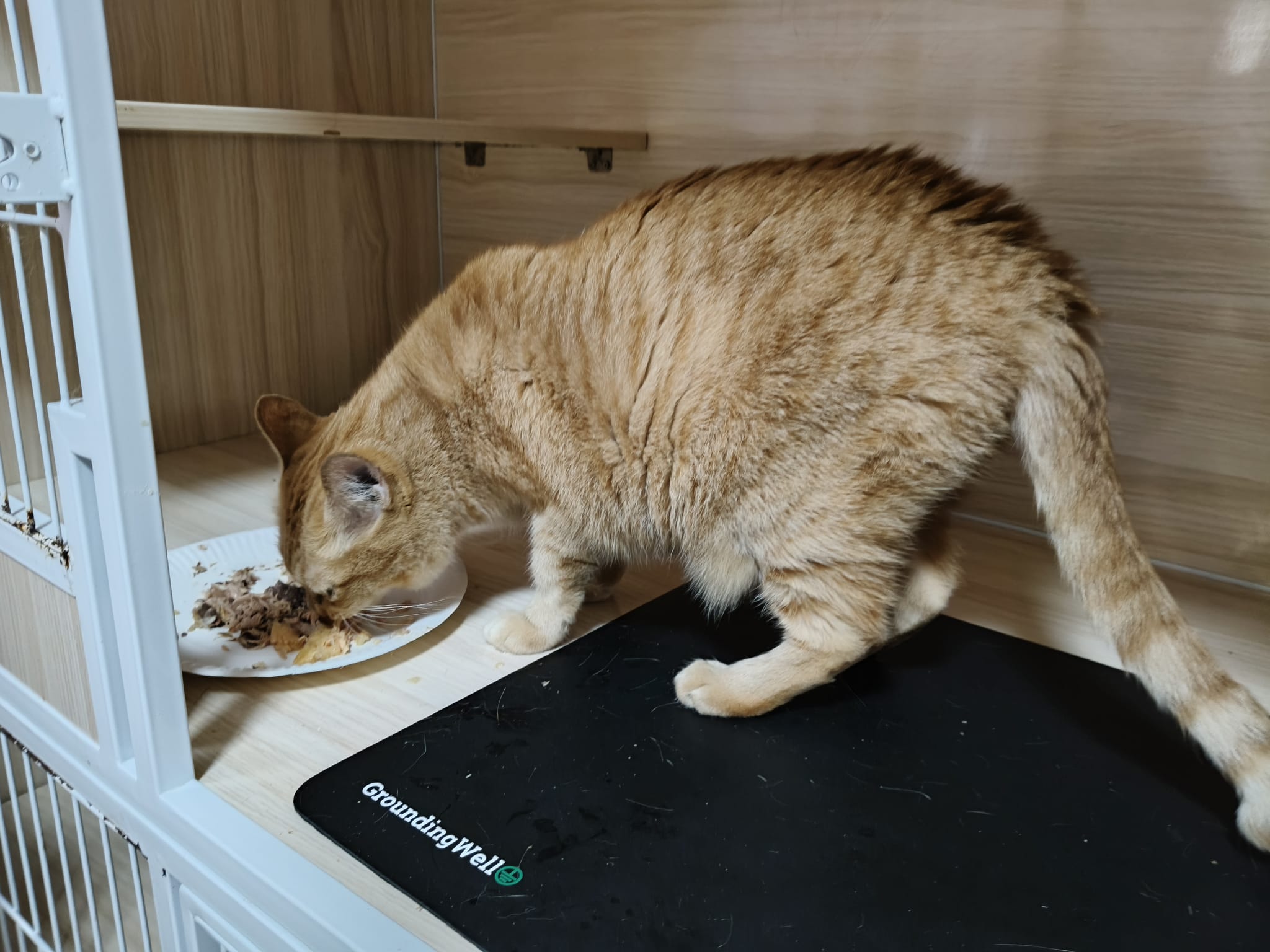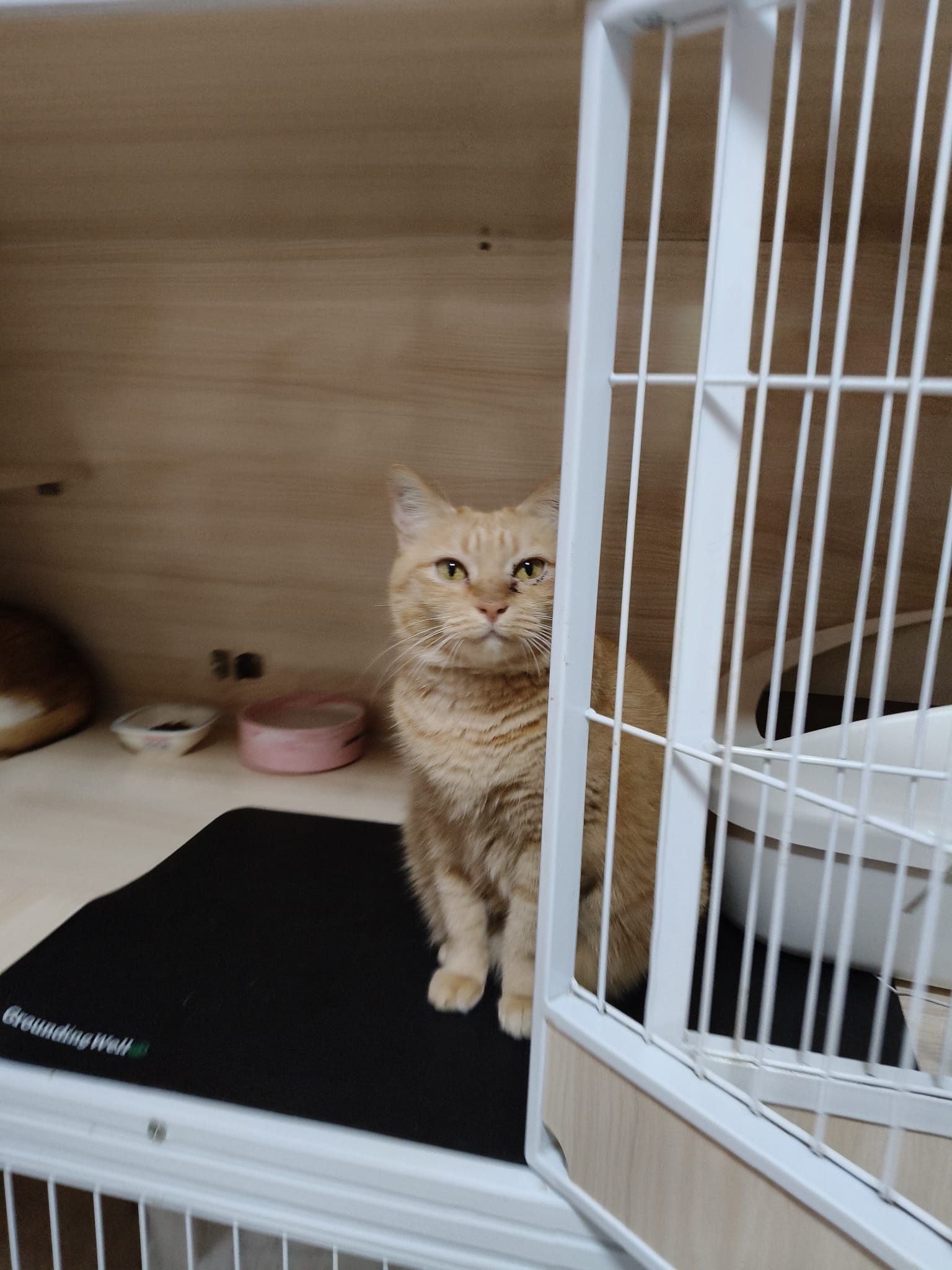 2pm: more active in the cage room, I put a grounding mat in the cage so she can get grounding while eating too. She is active, will come out to stretch and scratch the ctns boxes.