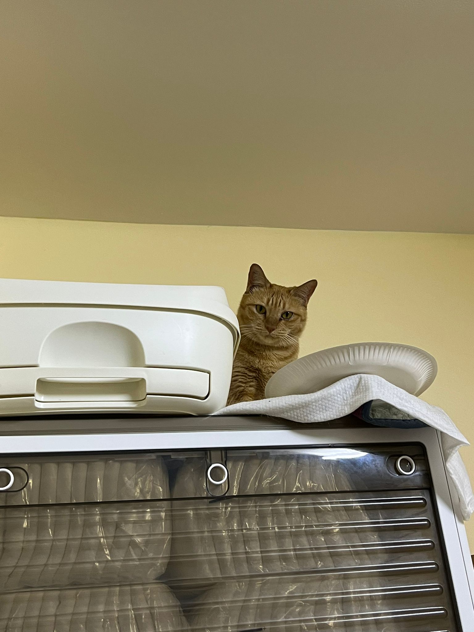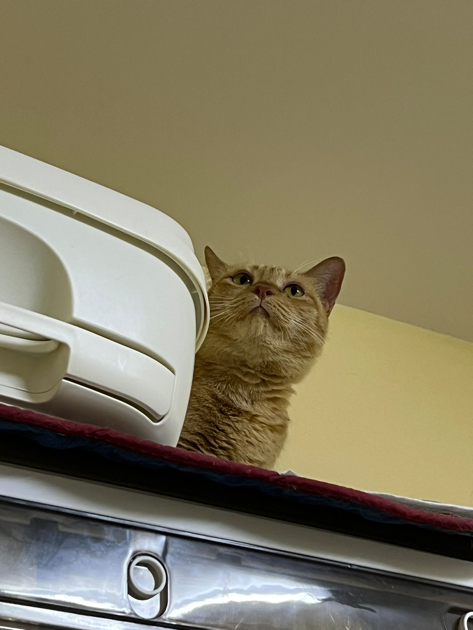 Morning: don’t know why the cat box is in food room, but char is on that box. She is on the big bed too. If she is ok to roam, then I may wash n keep her small bin at the top le
