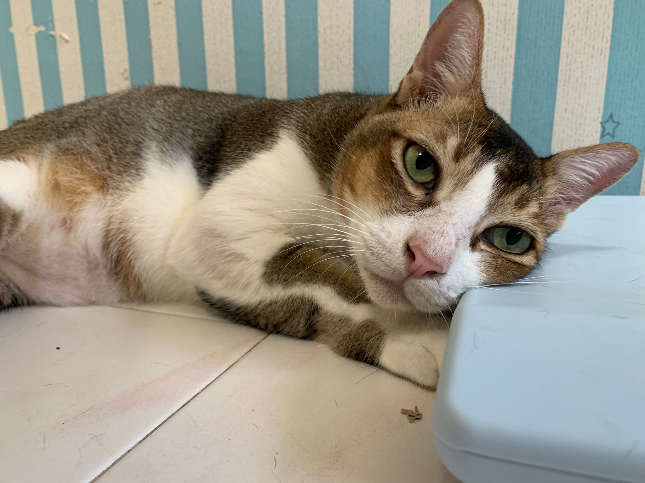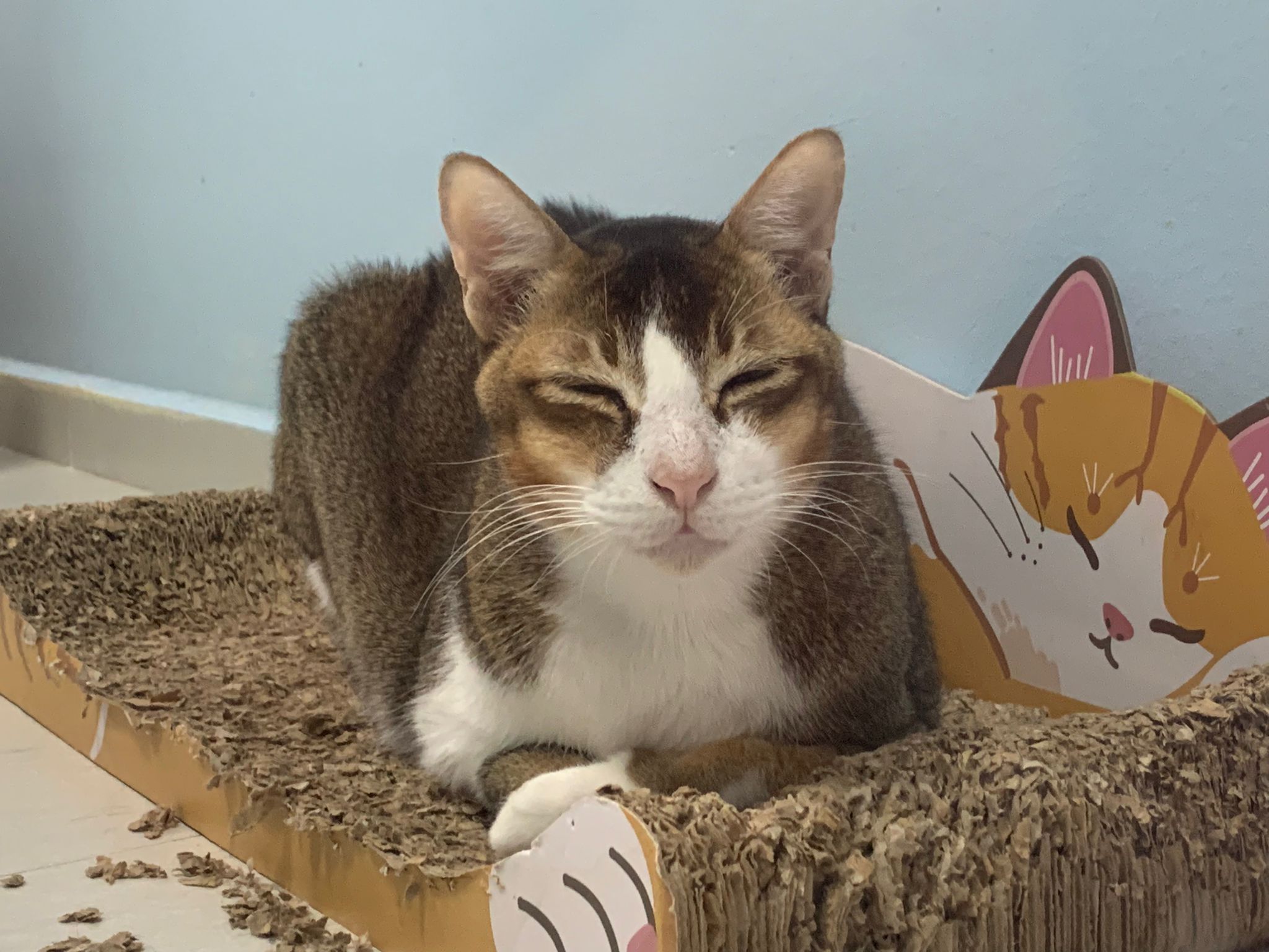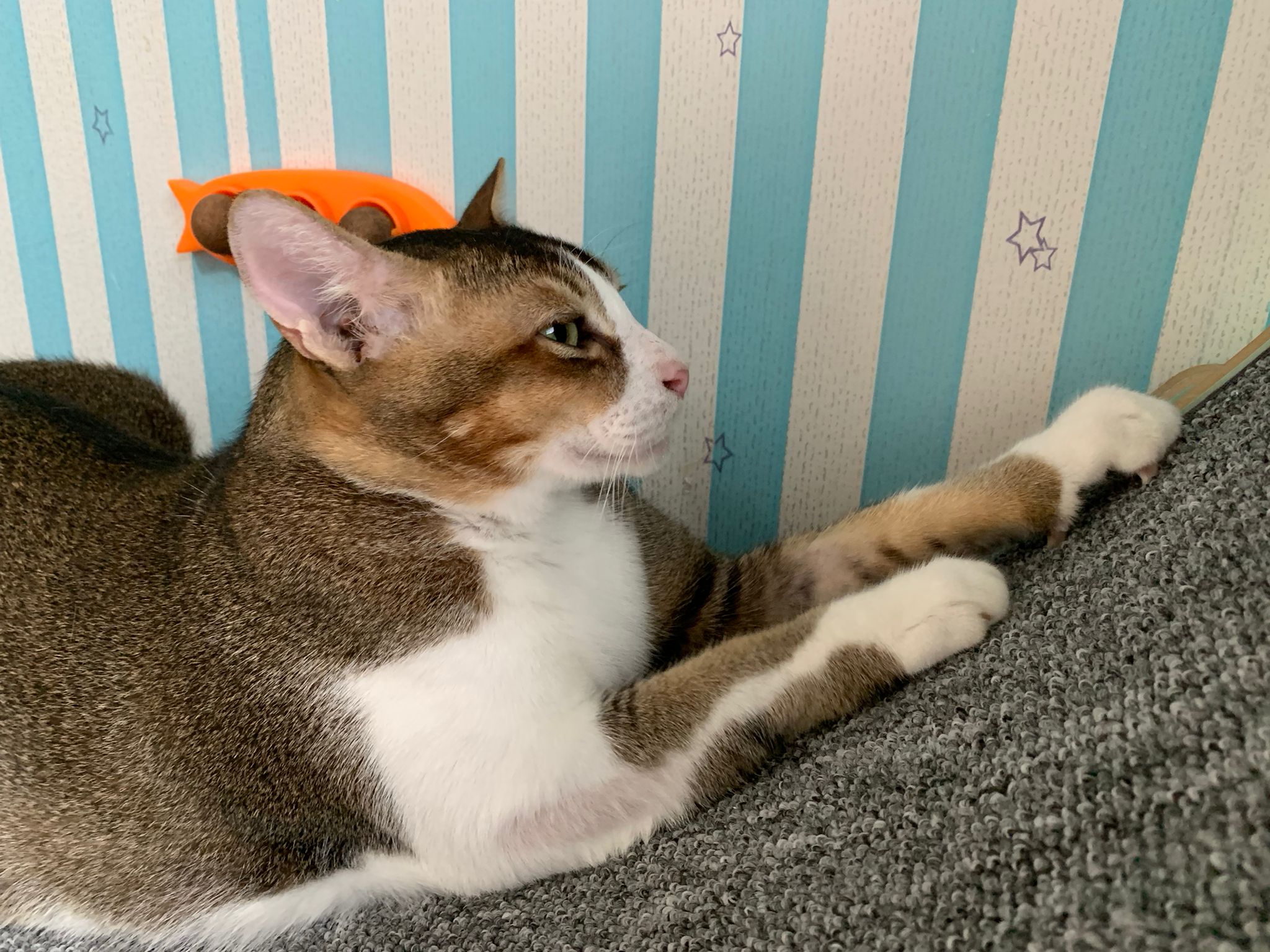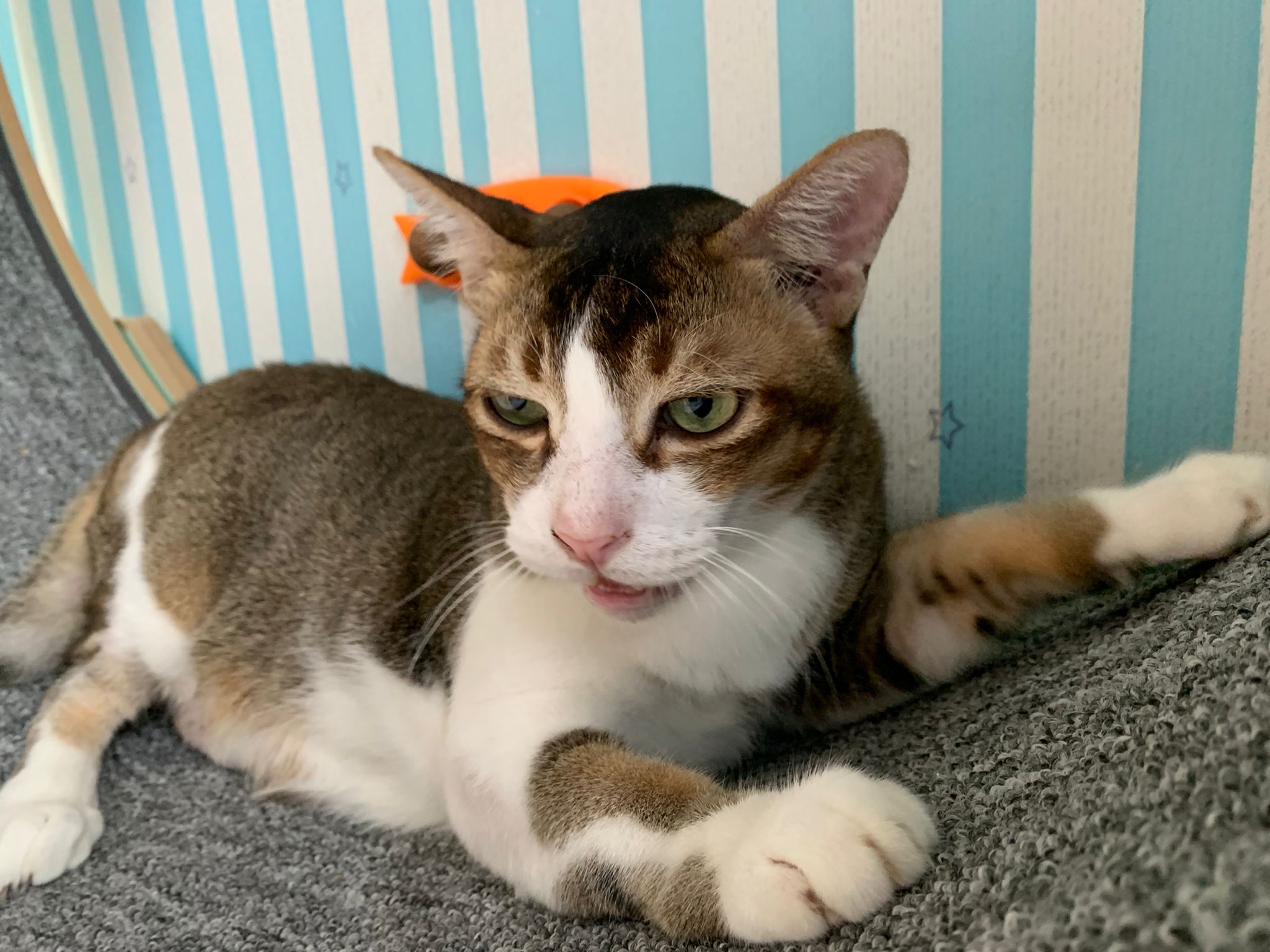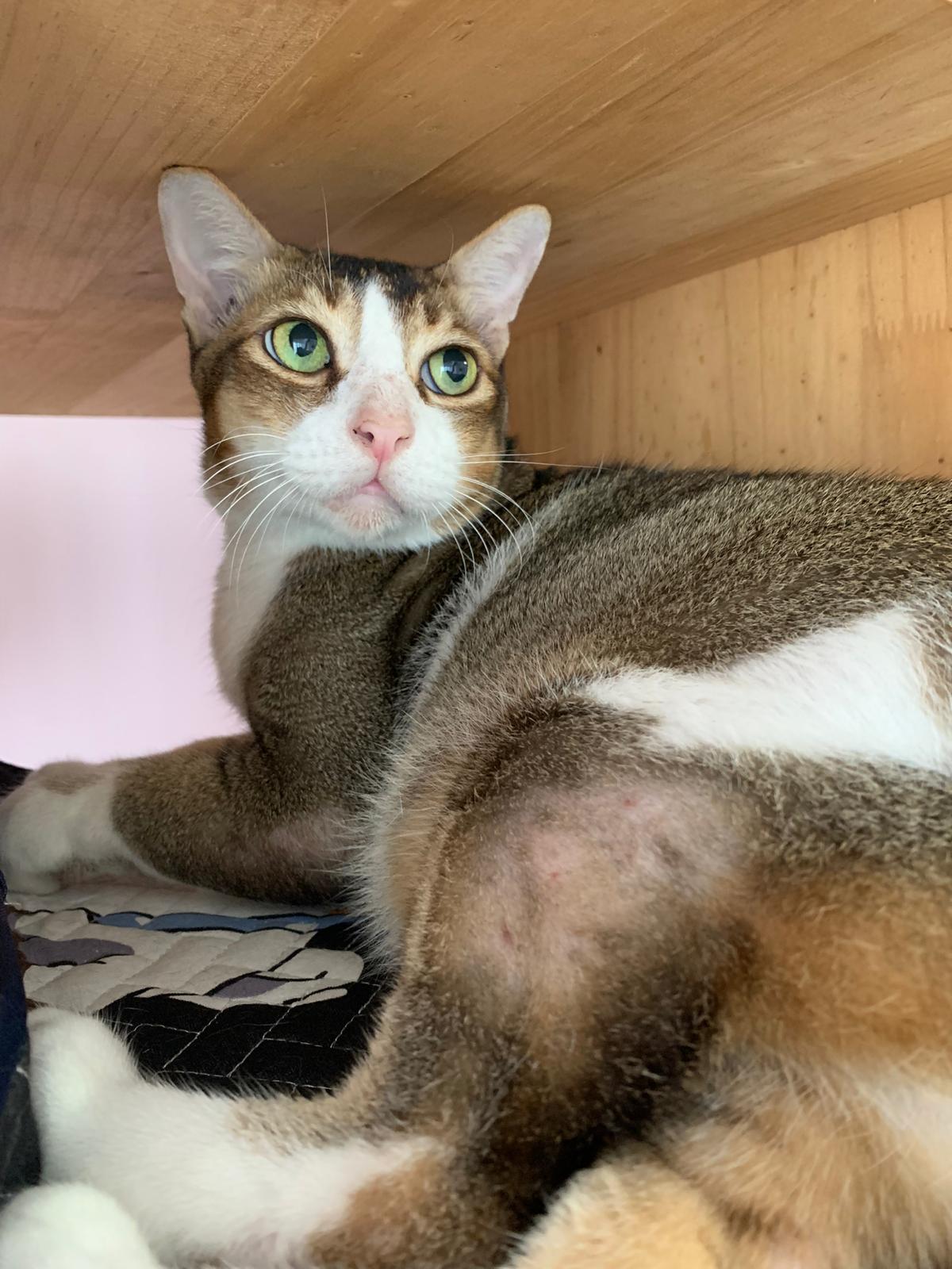 Loving boy, love to lick my toe, other cats will find him for sayang – he will help to groom other cats. He got a tendency to vomit cos he love to lick plastic also! He likes bistro chicken and a/d. To be adopted with his brother Alley.