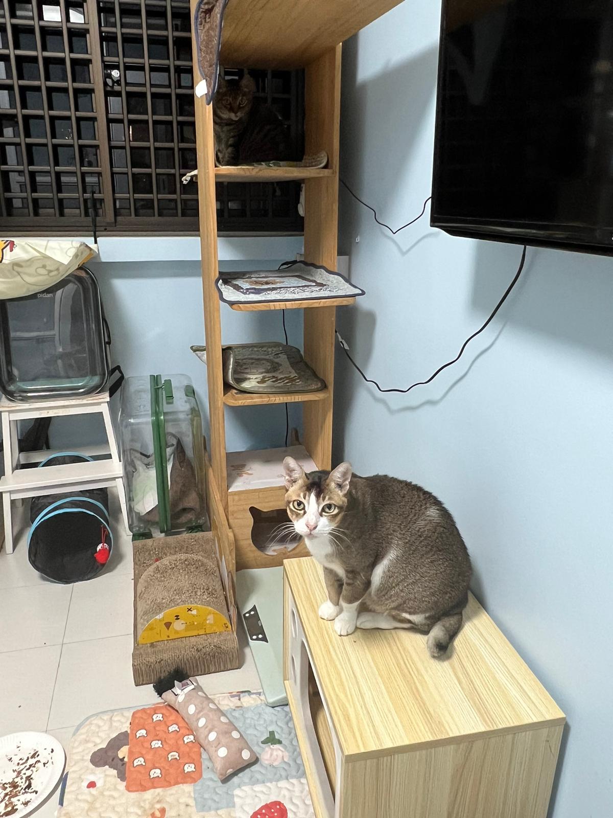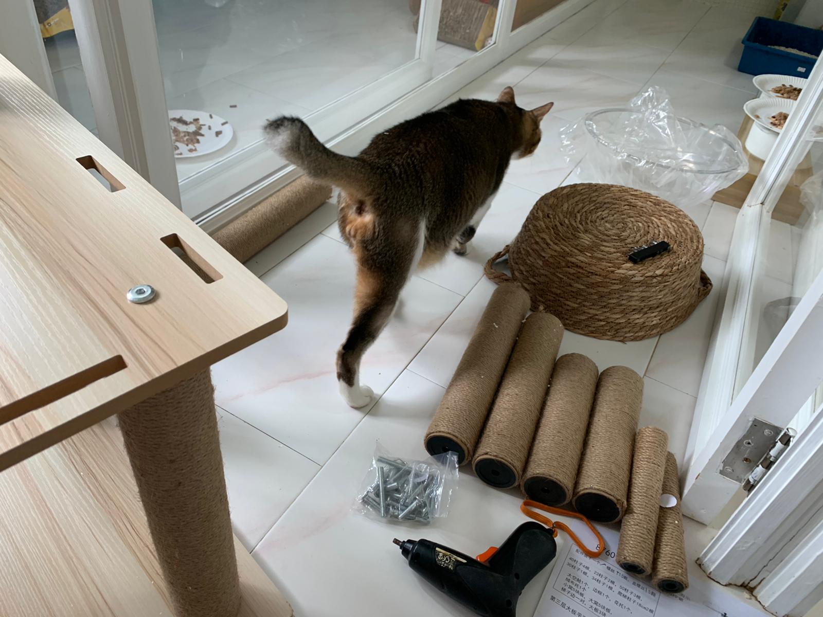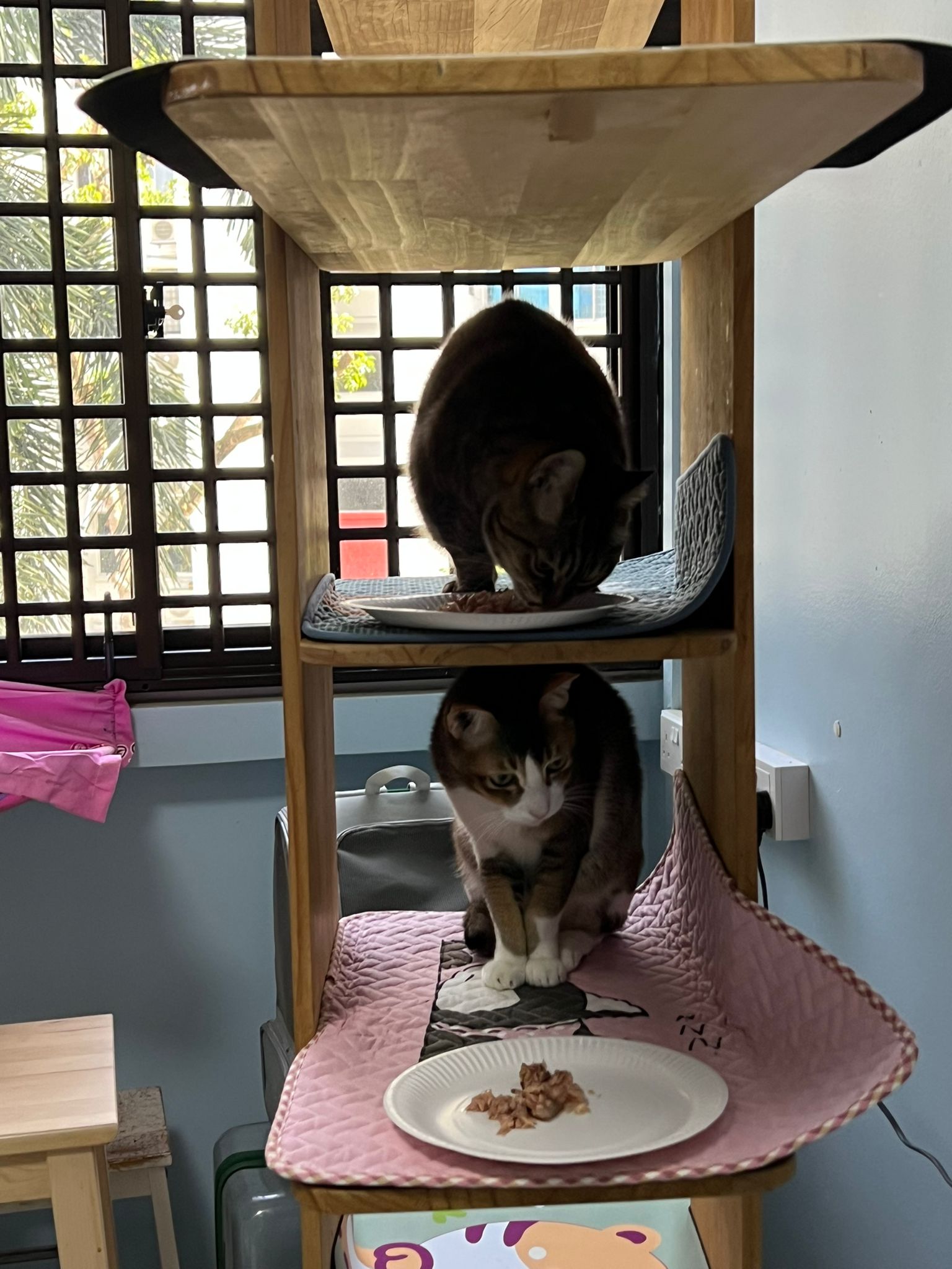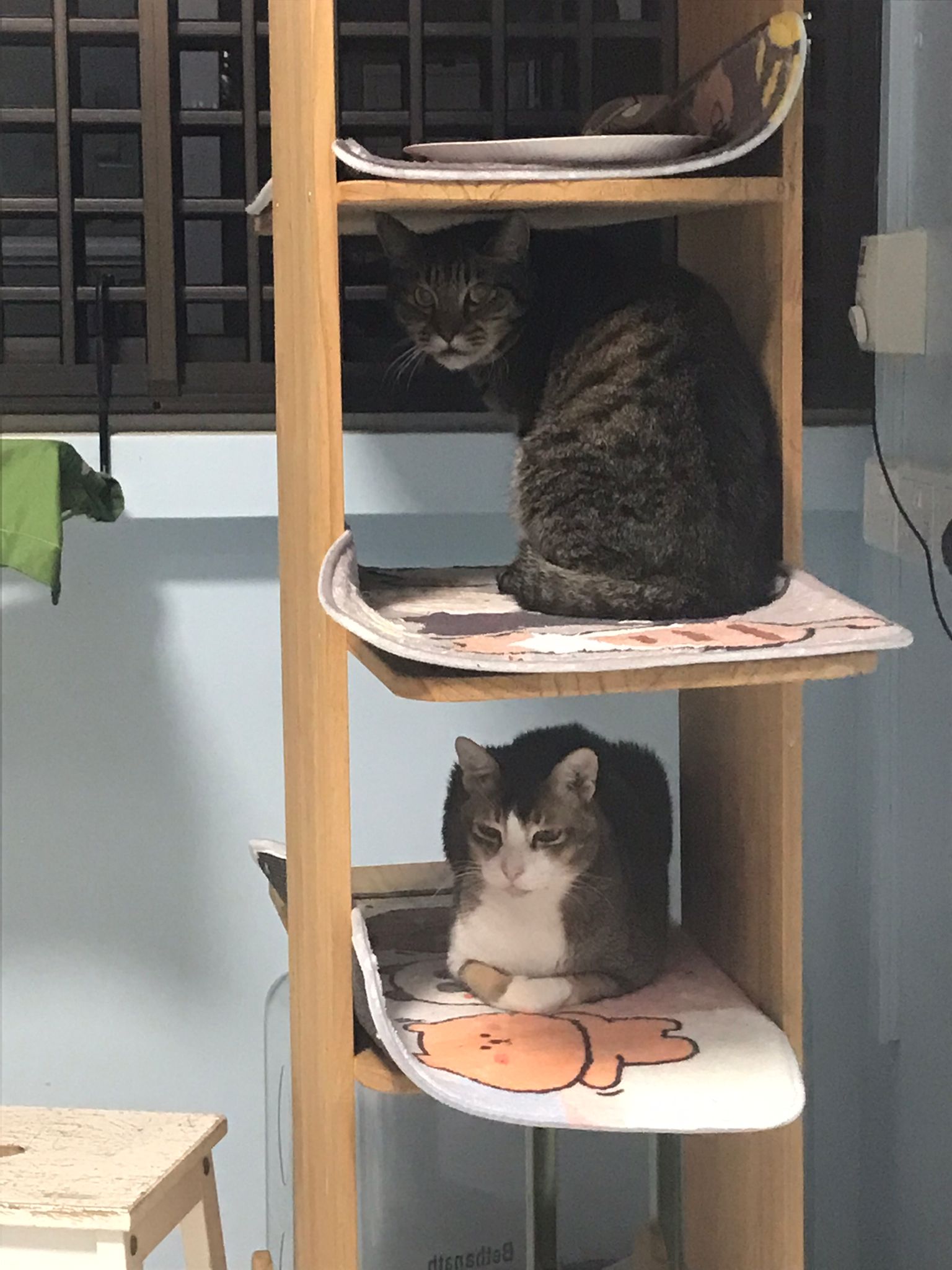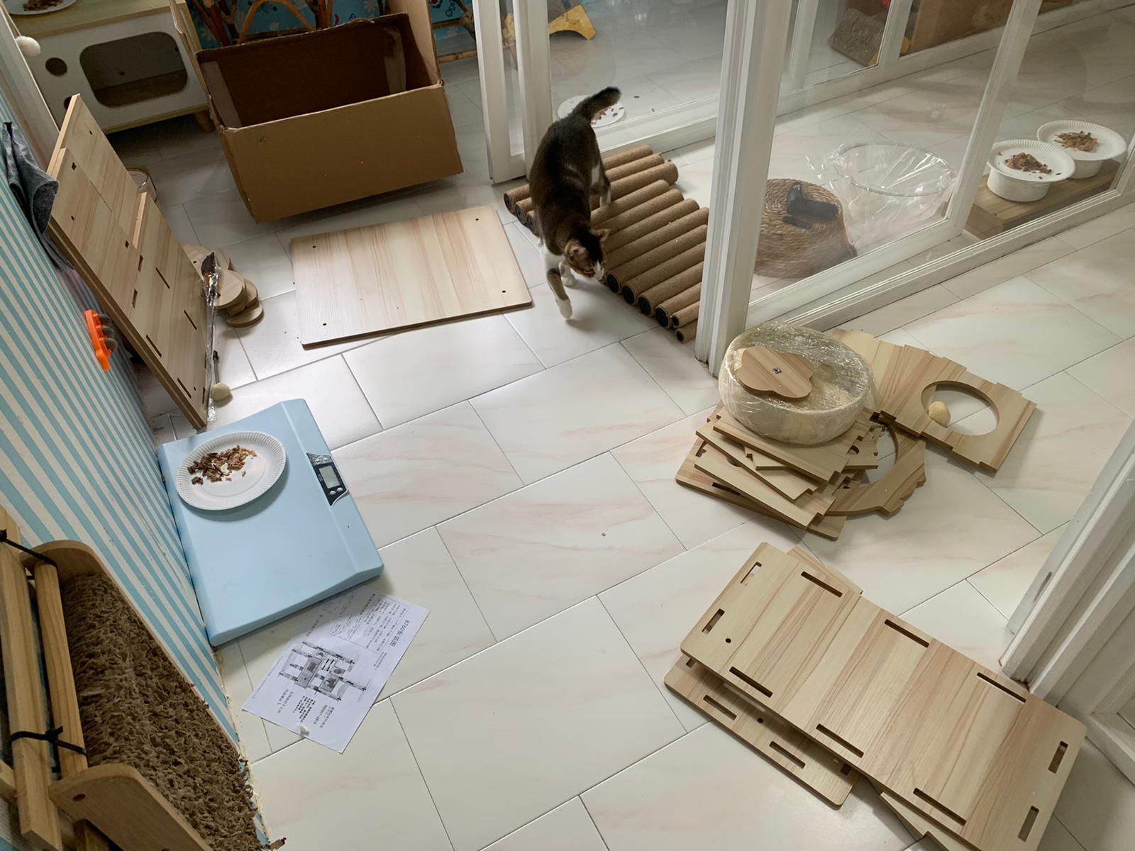 1pm+: I Waited so long their bench delivery not here yet. Today throw half their cat tree away. Rearrange a little. Tmr then give them the bench 🙂