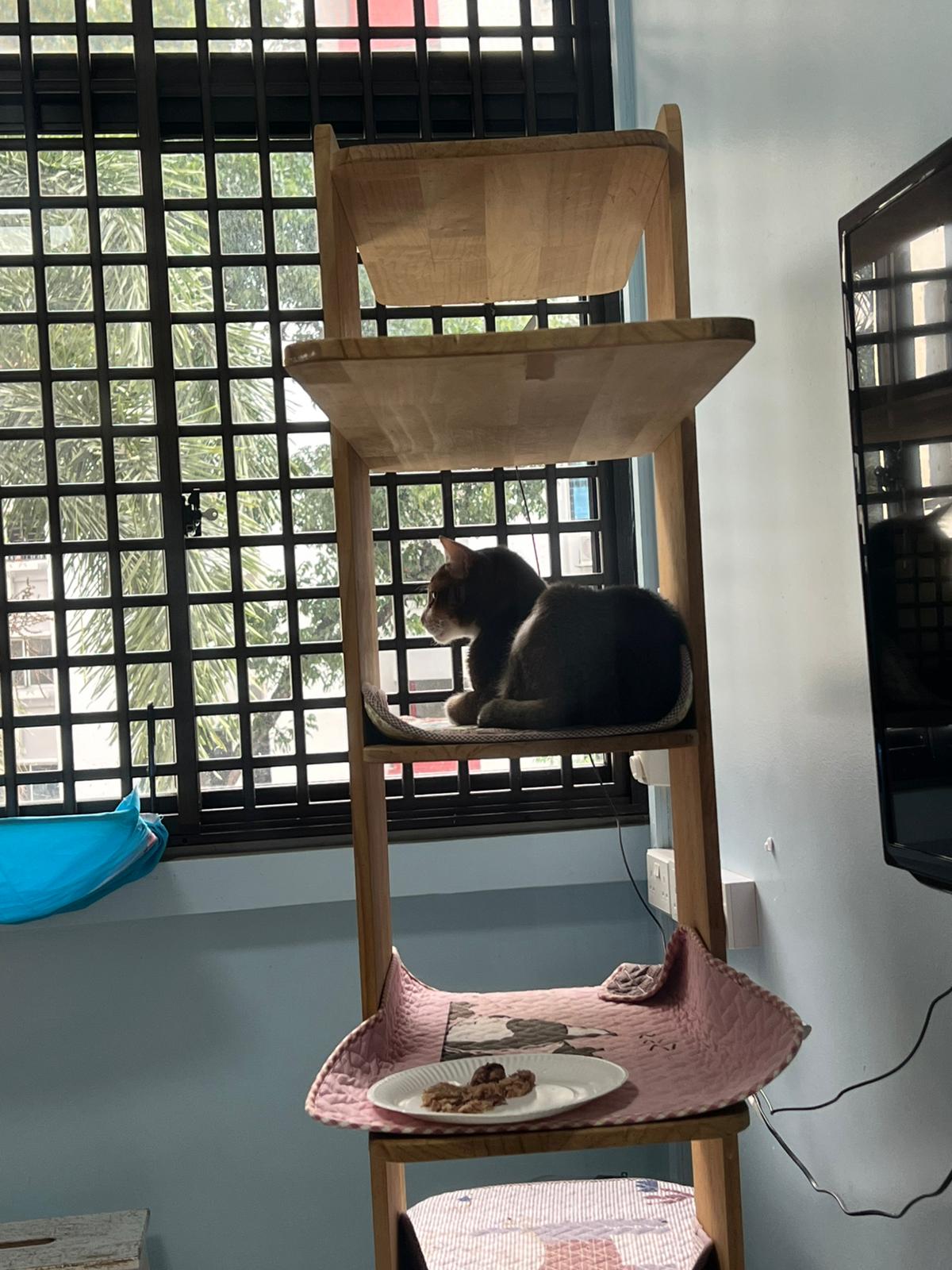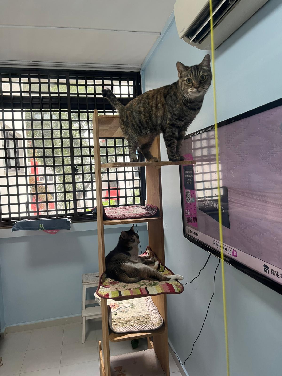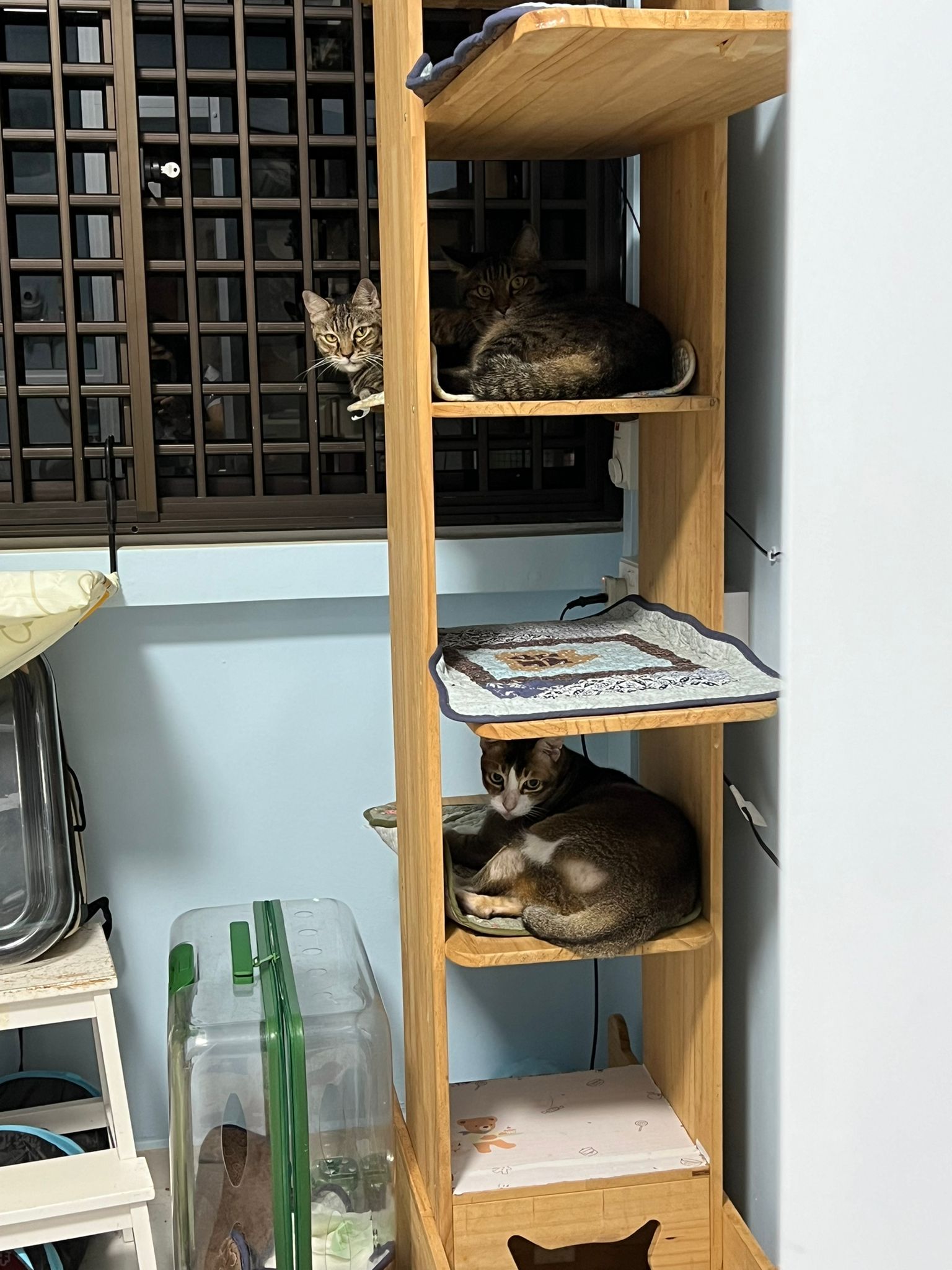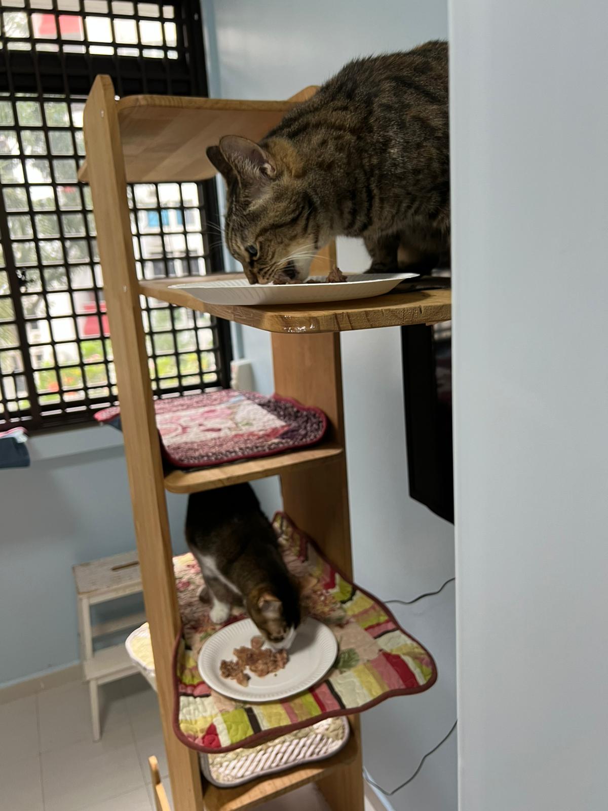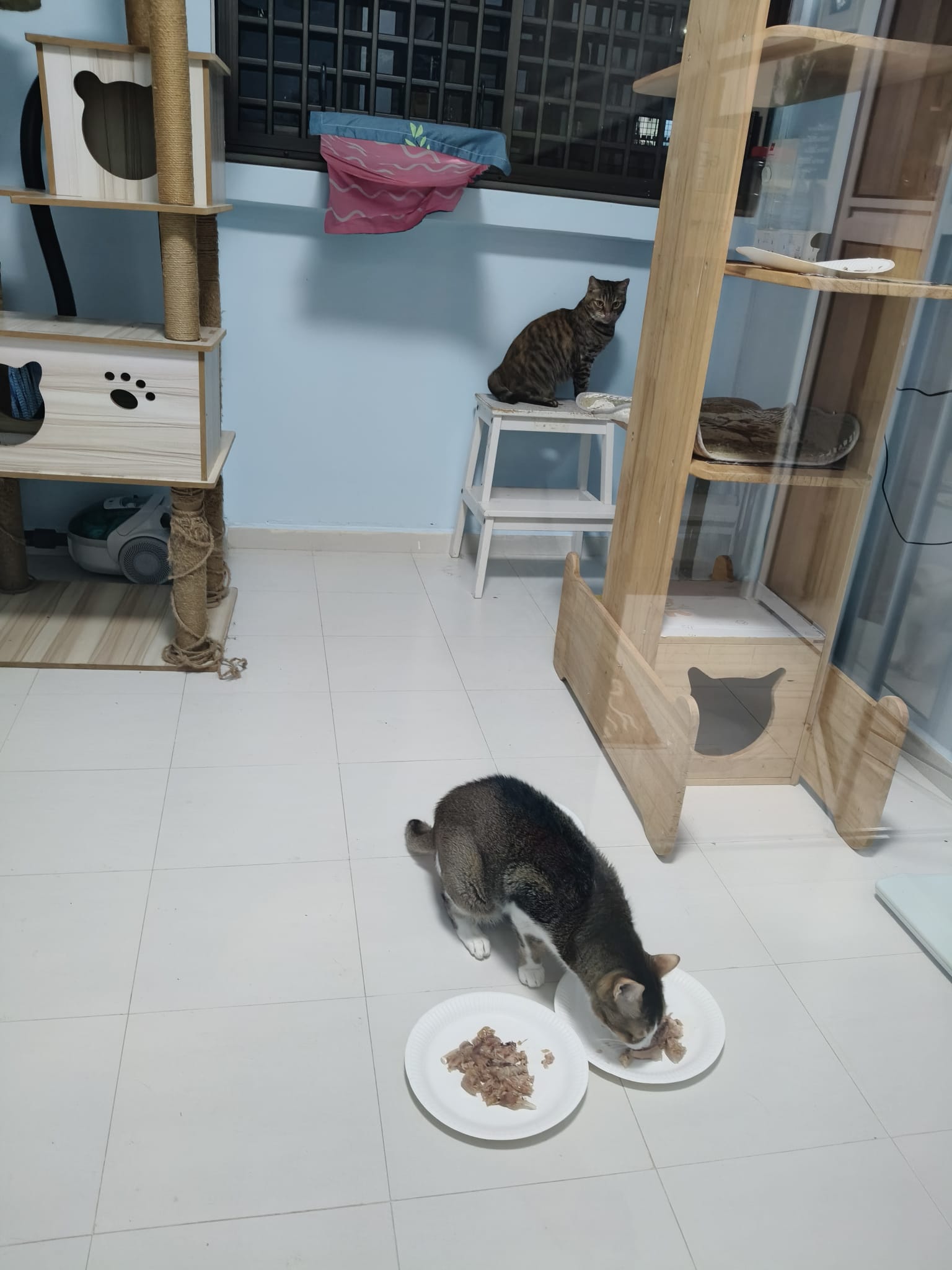 1pm+: I Waited so long their bench delivery not here yet. Today throw half their cat tree away. Rearrange a little. Tmr then give them the bench 🙂
