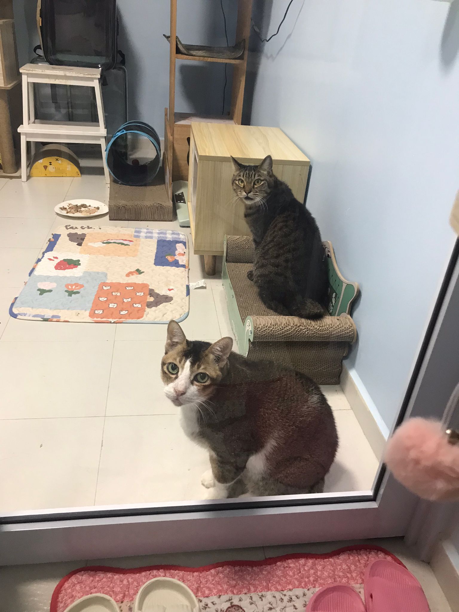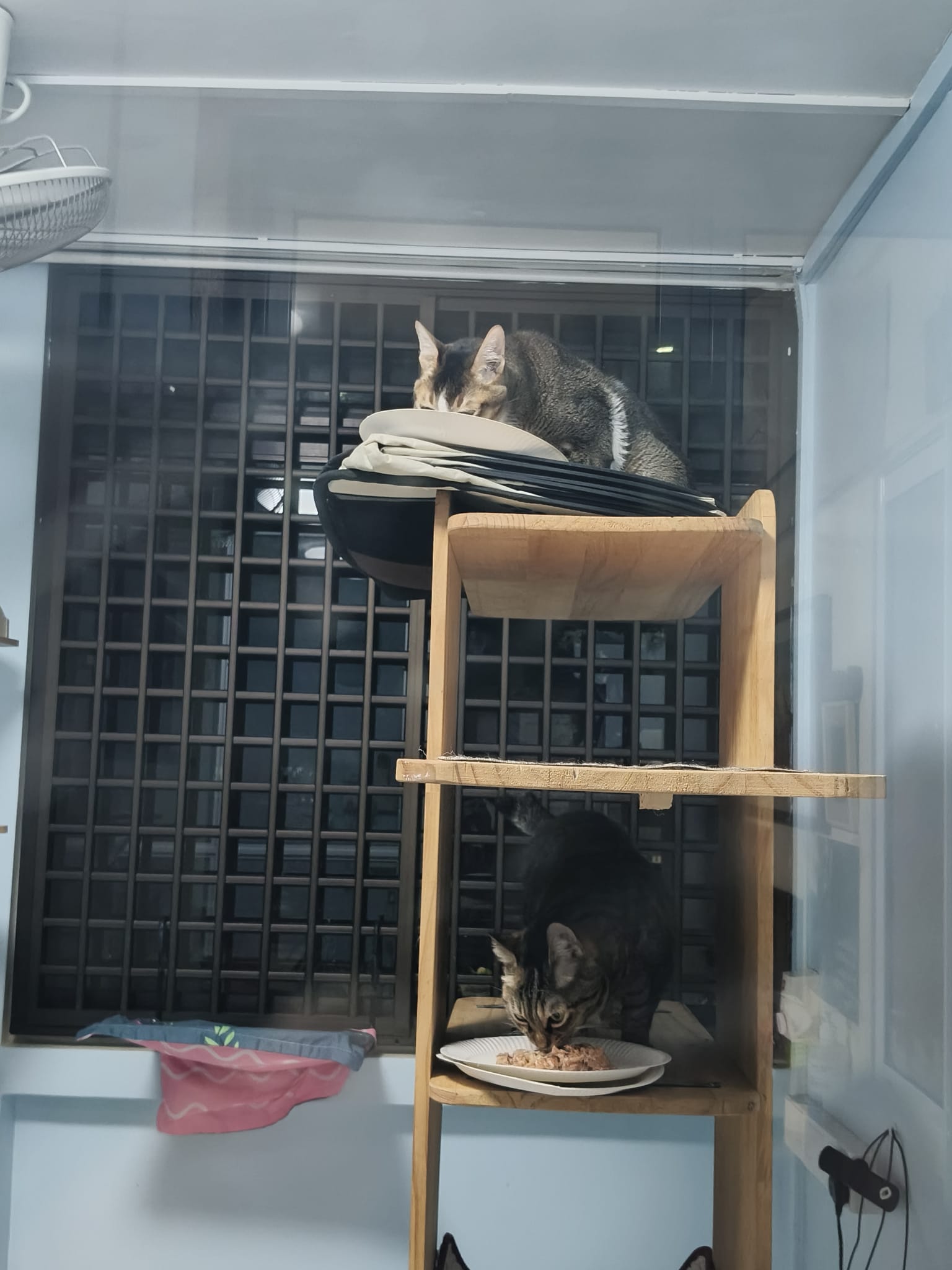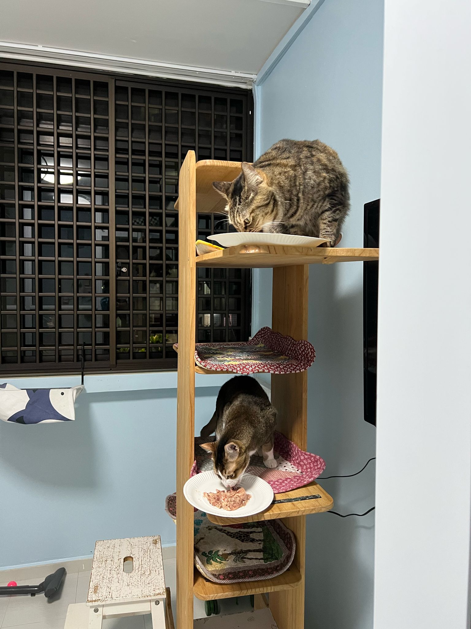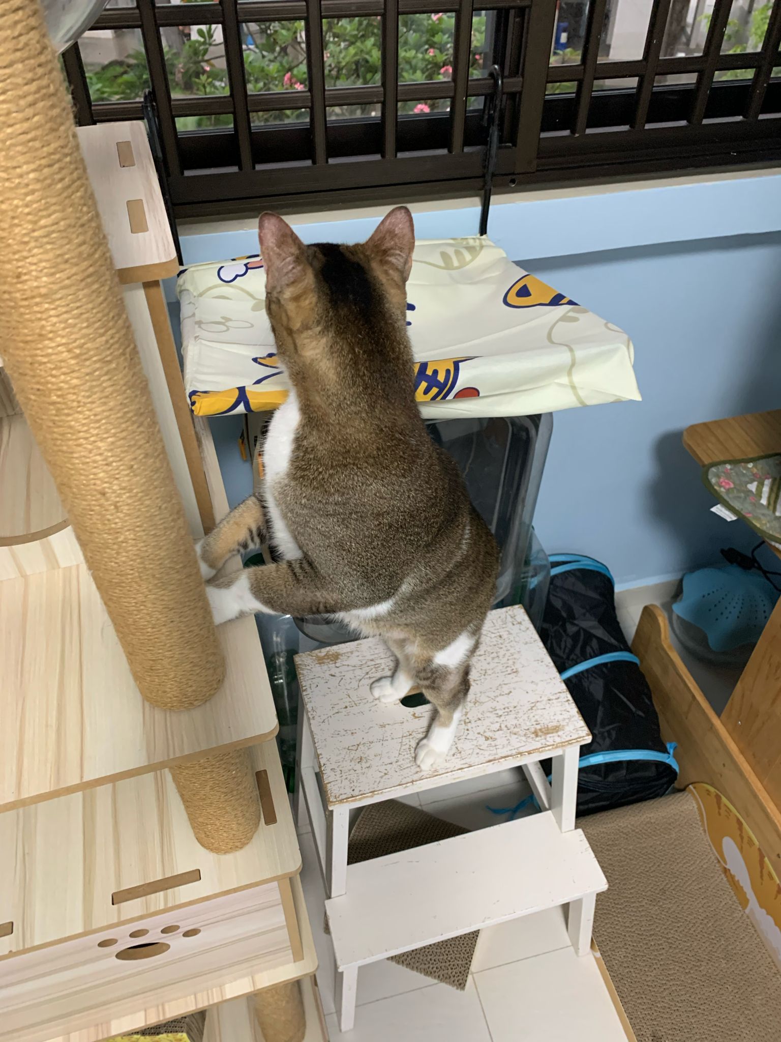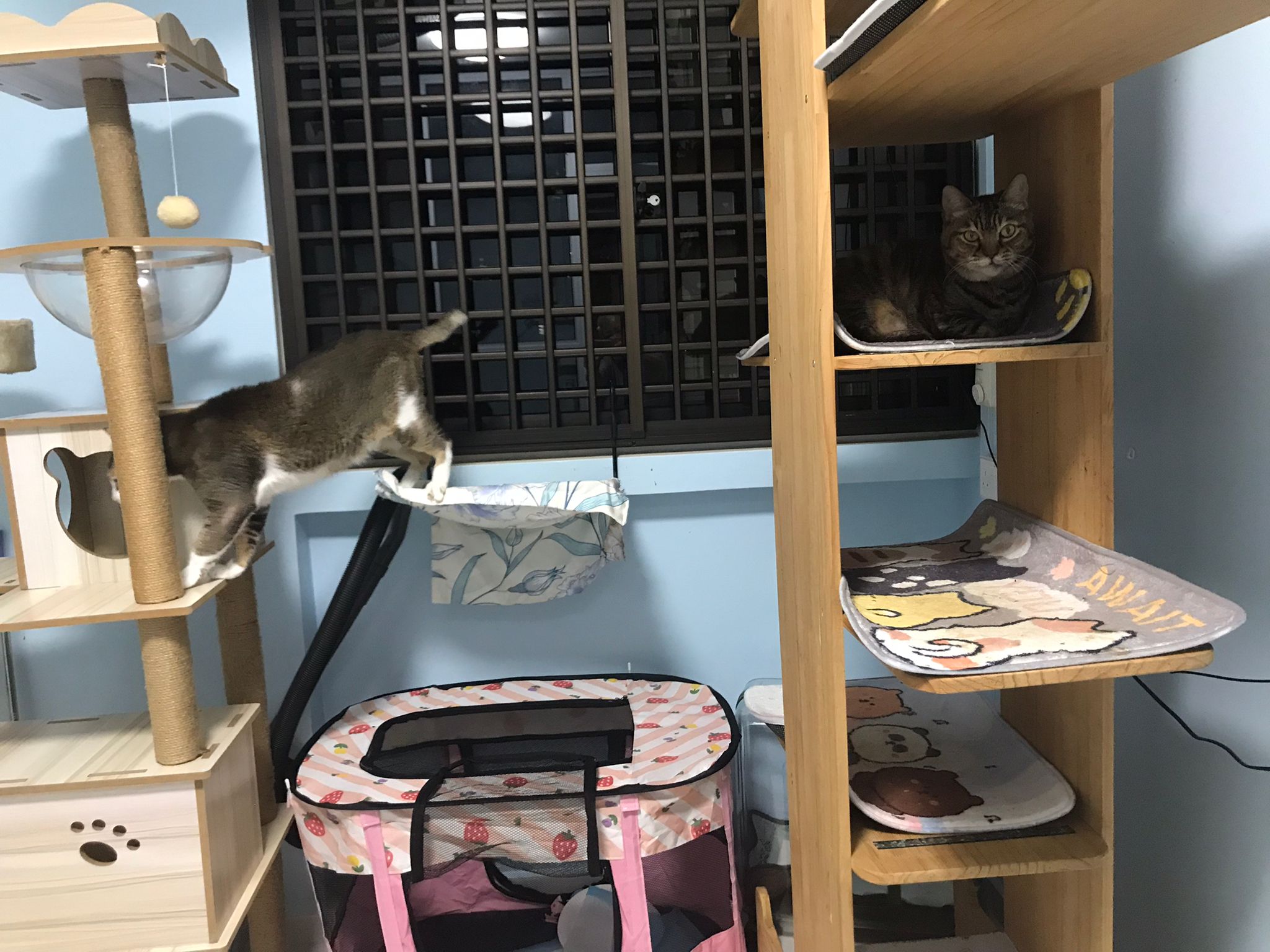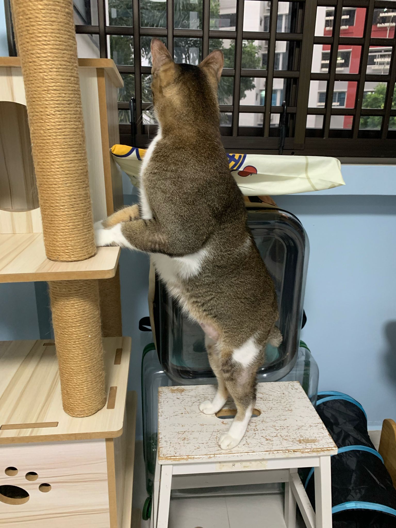 1pm+: I Waited so long their bench delivery not here yet. Today throw half their cat tree away. Rearrange a little. Tmr then give them the bench 🙂