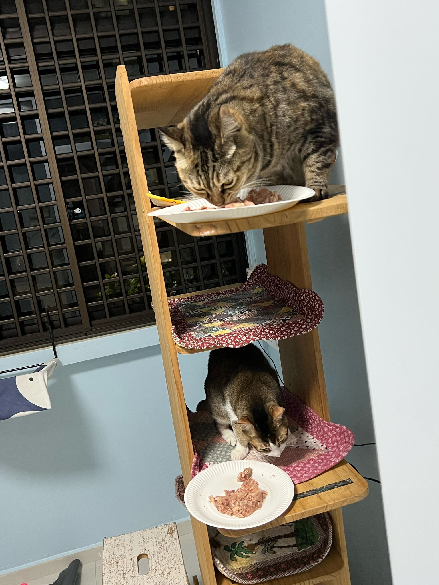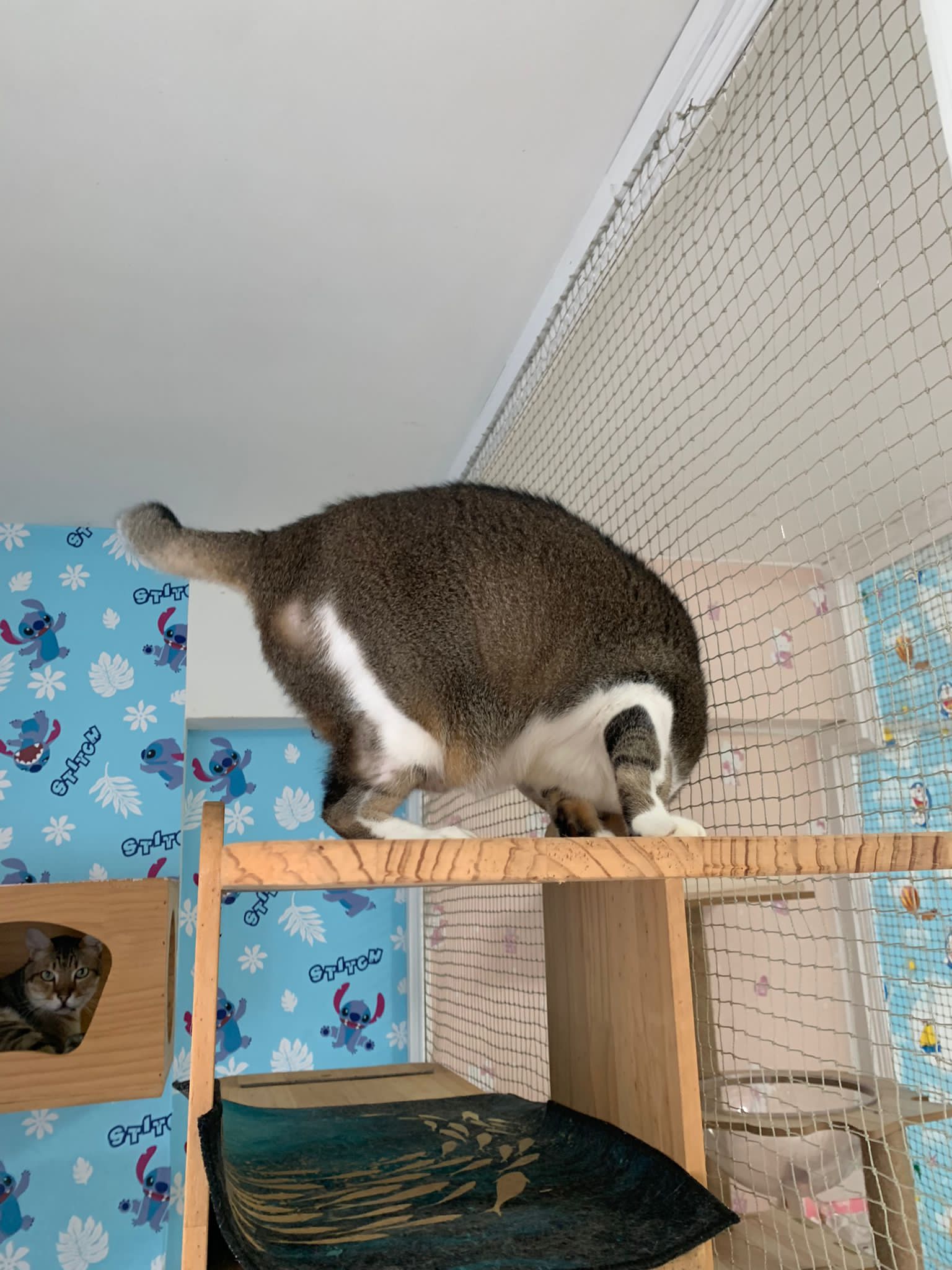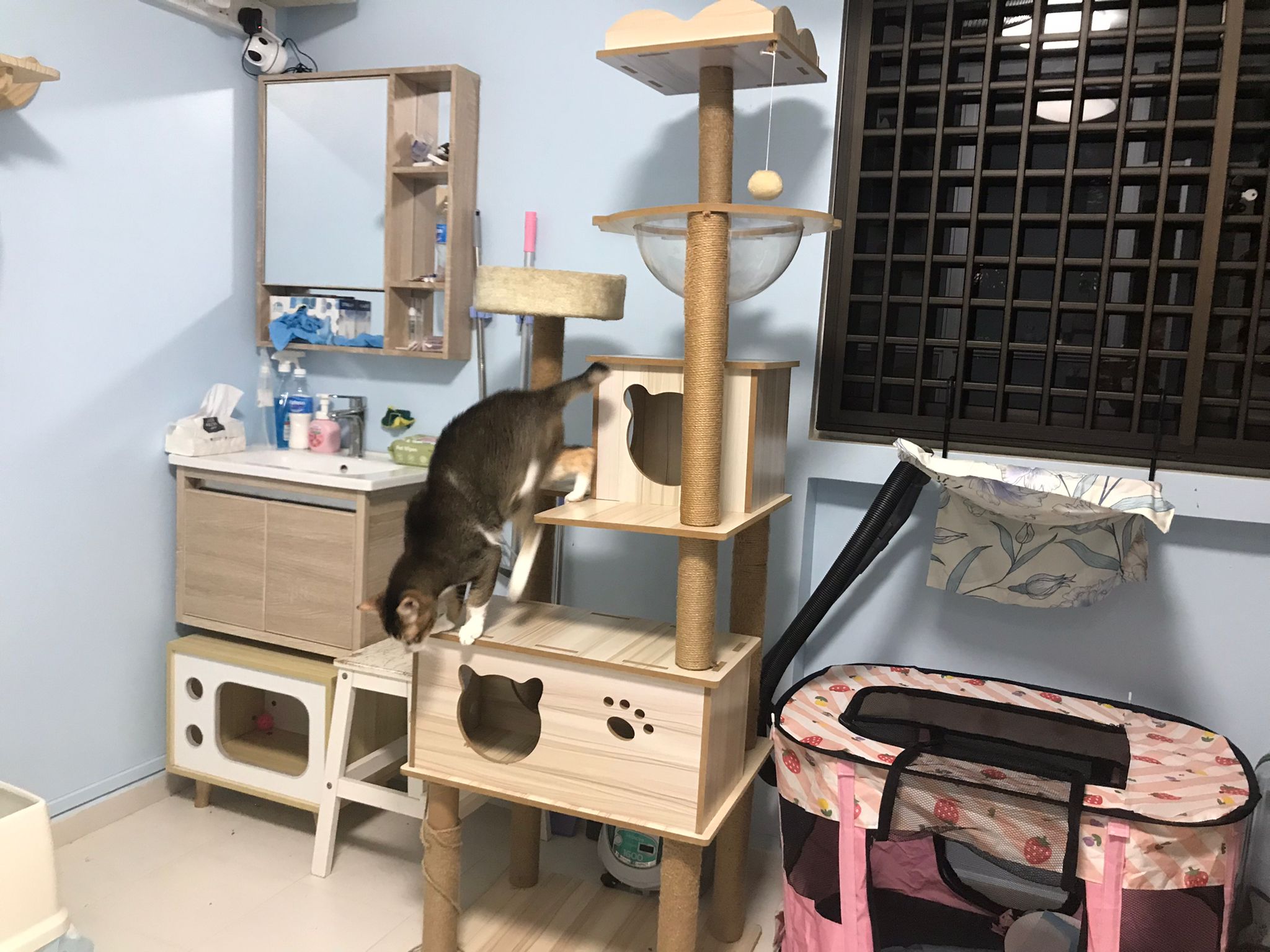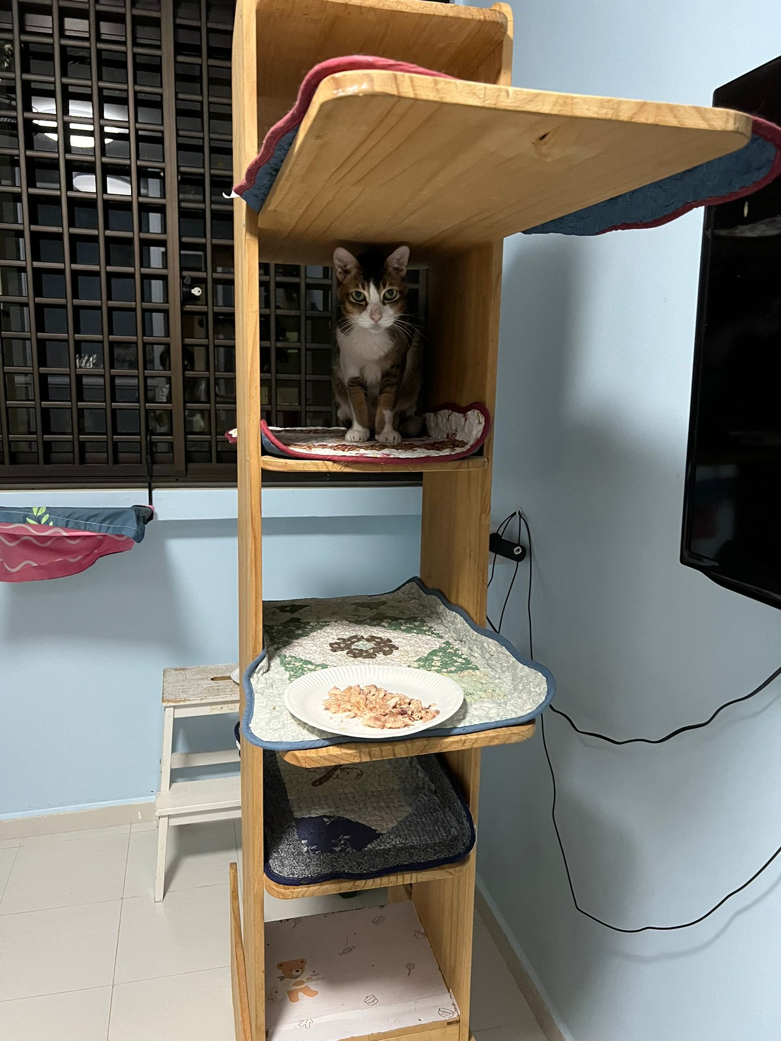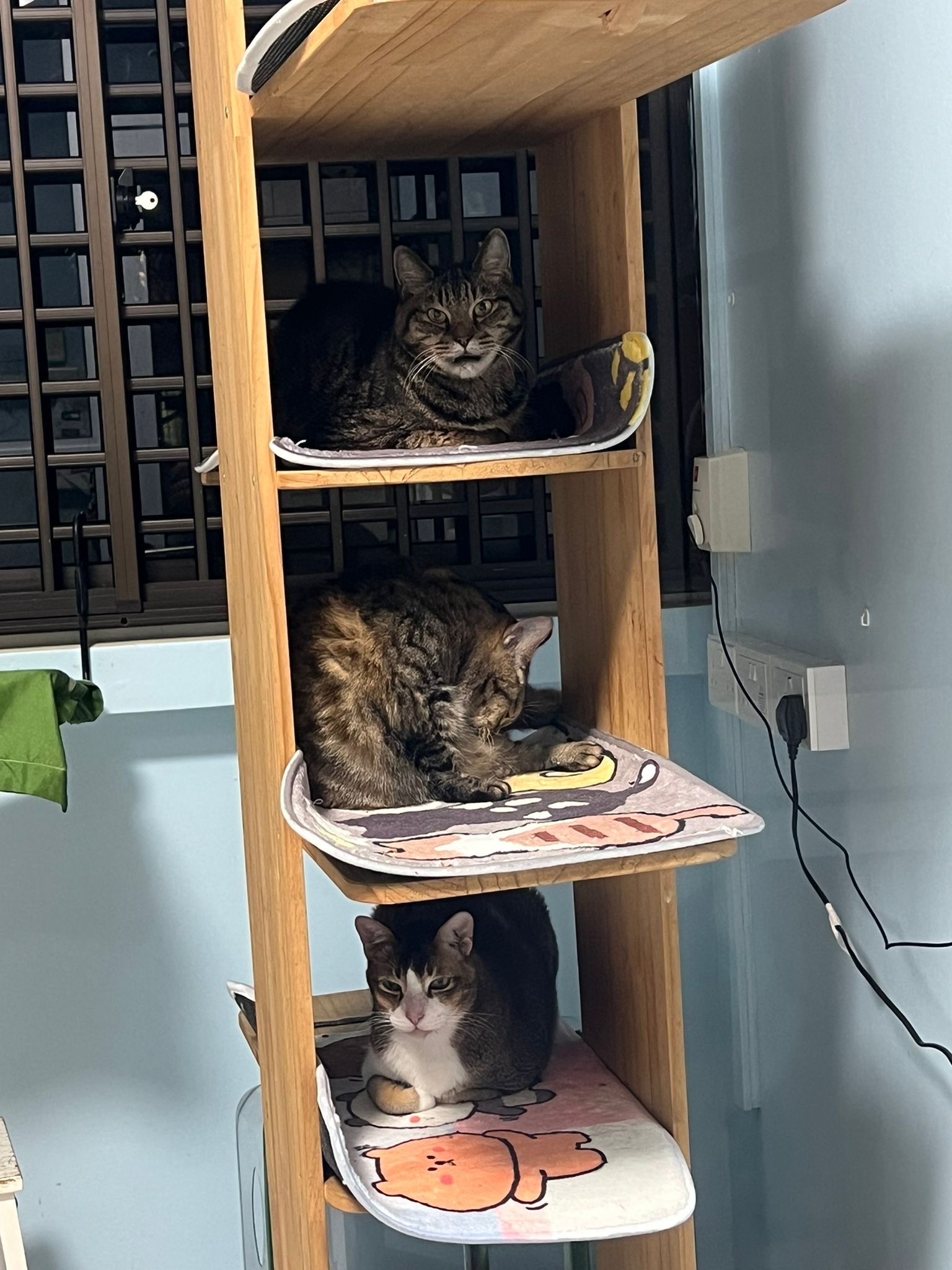 1pm+: I Waited so long their bench delivery not here yet. Today throw half their cat tree away. Rearrange a little. Tmr then give them the bench 🙂