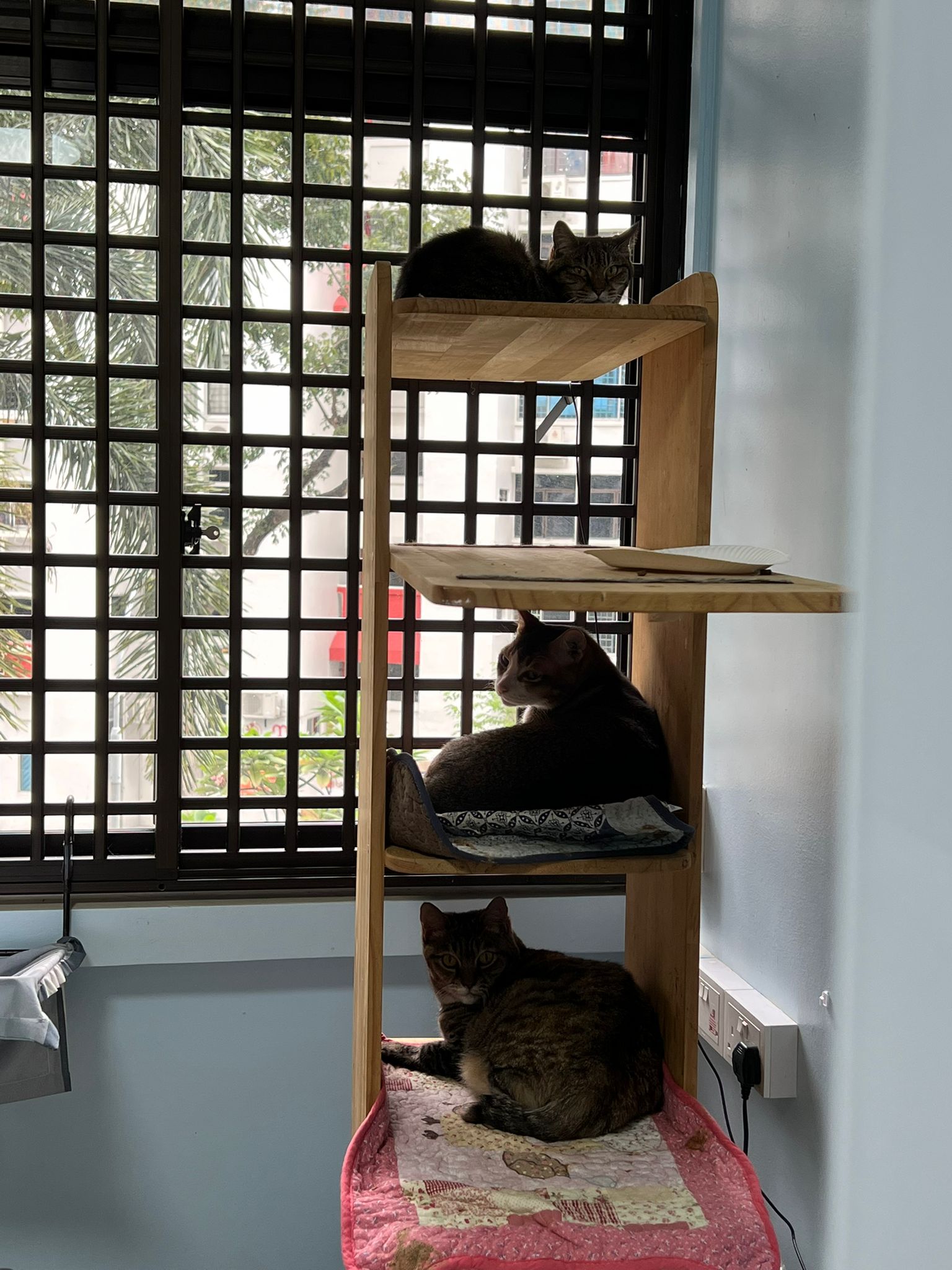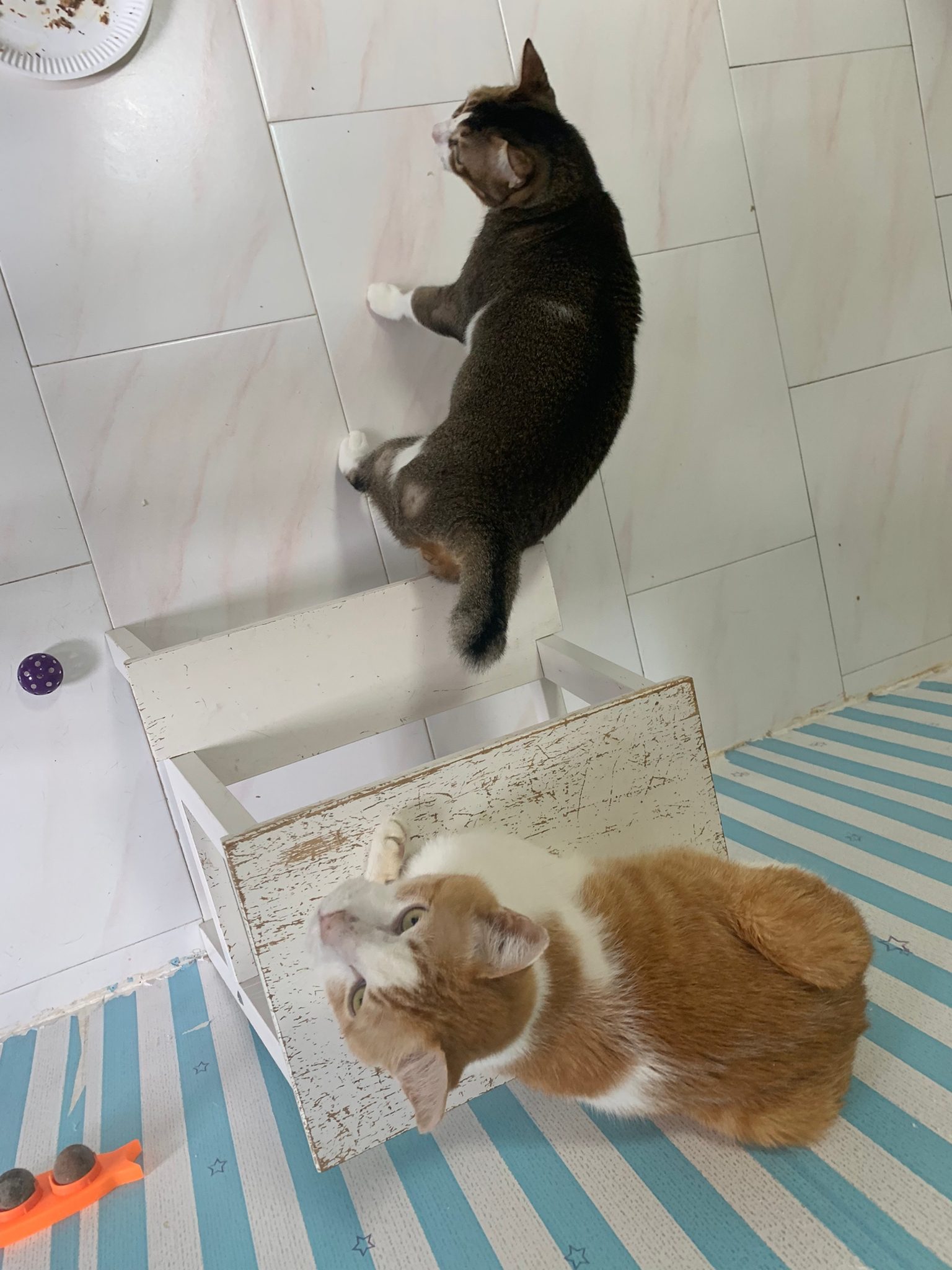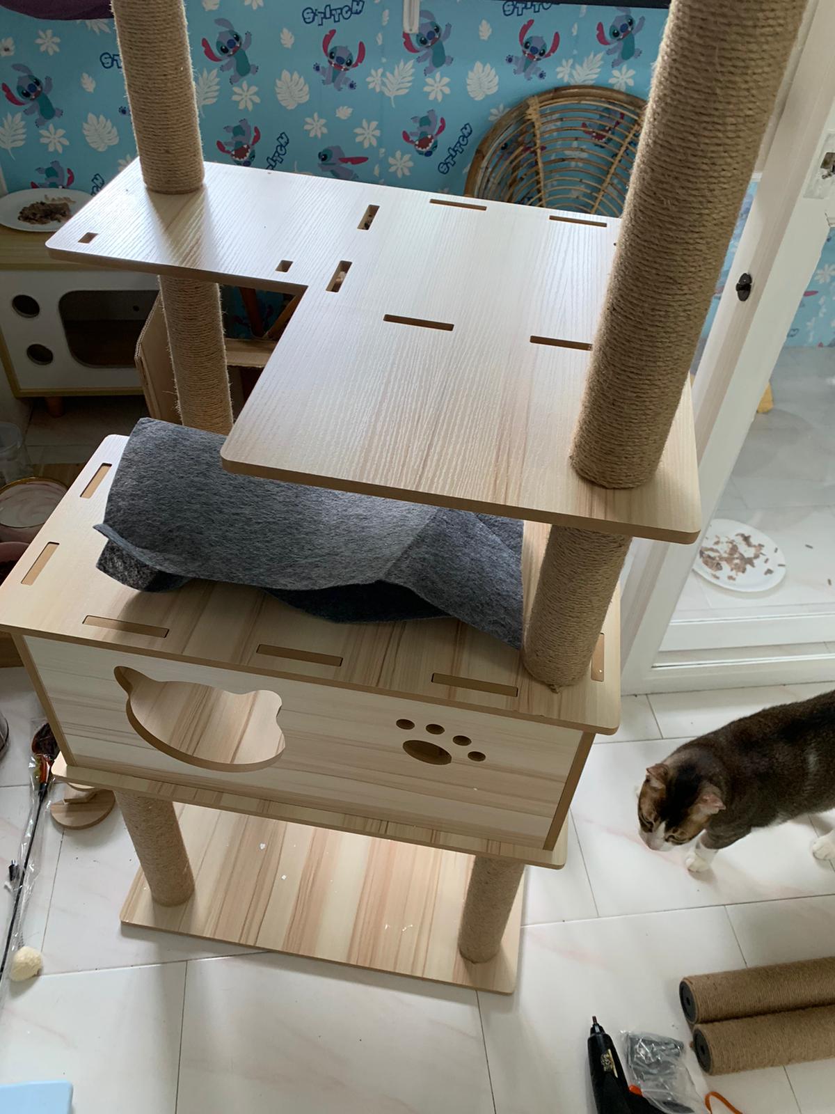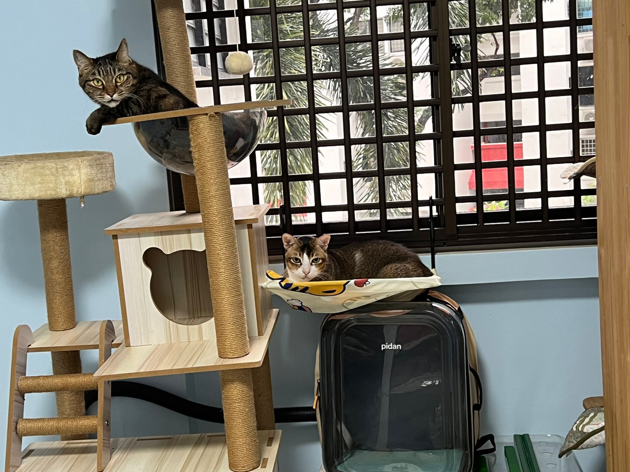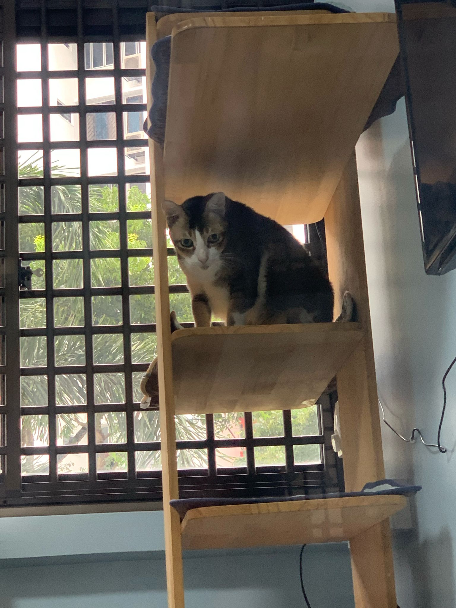 1pm+: I Waited so long their bench delivery not here yet. Today throw half their cat tree away. Rearrange a little. Tmr then give them the bench 🙂