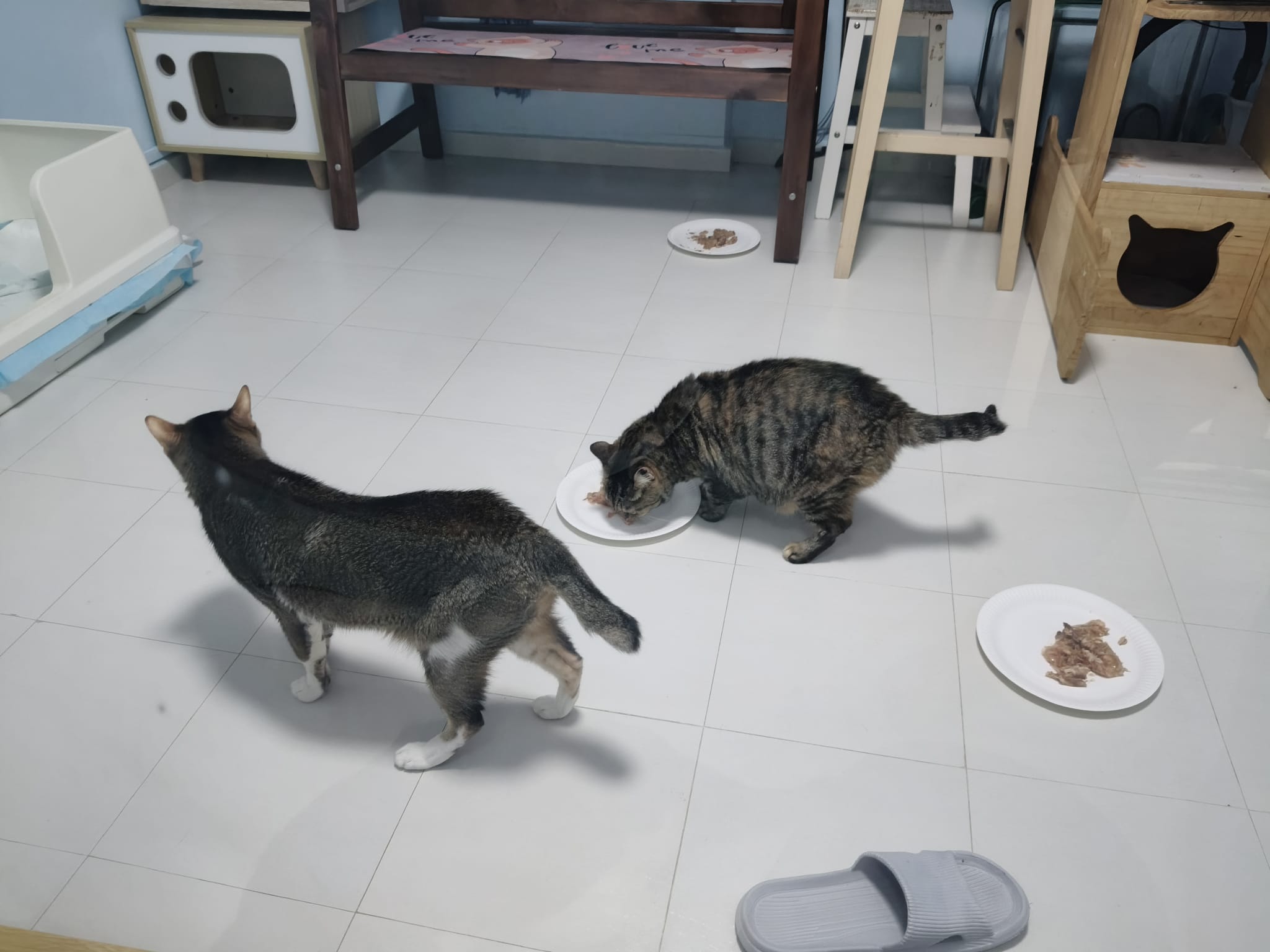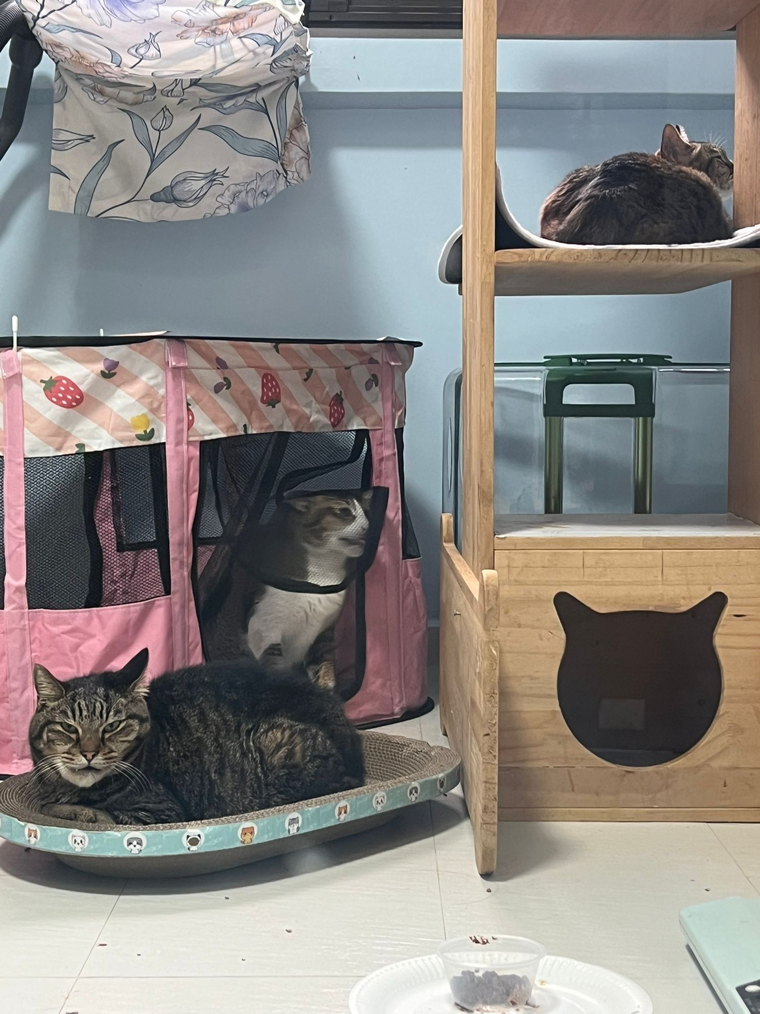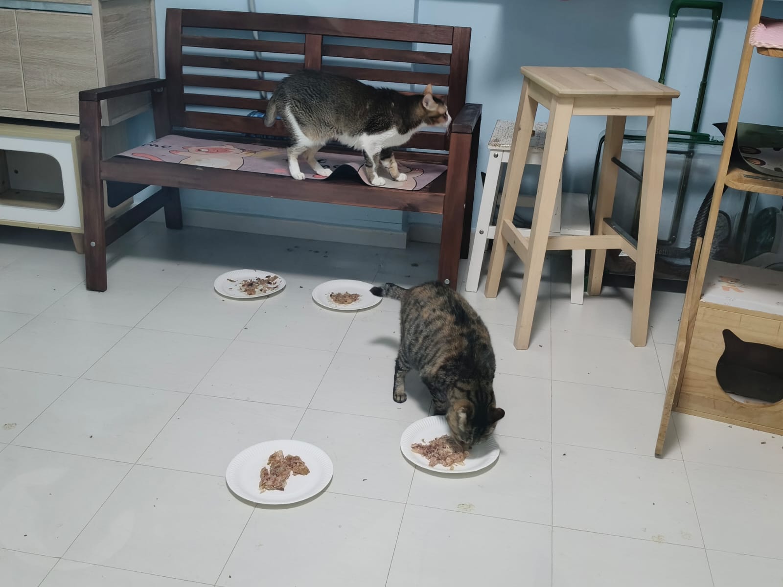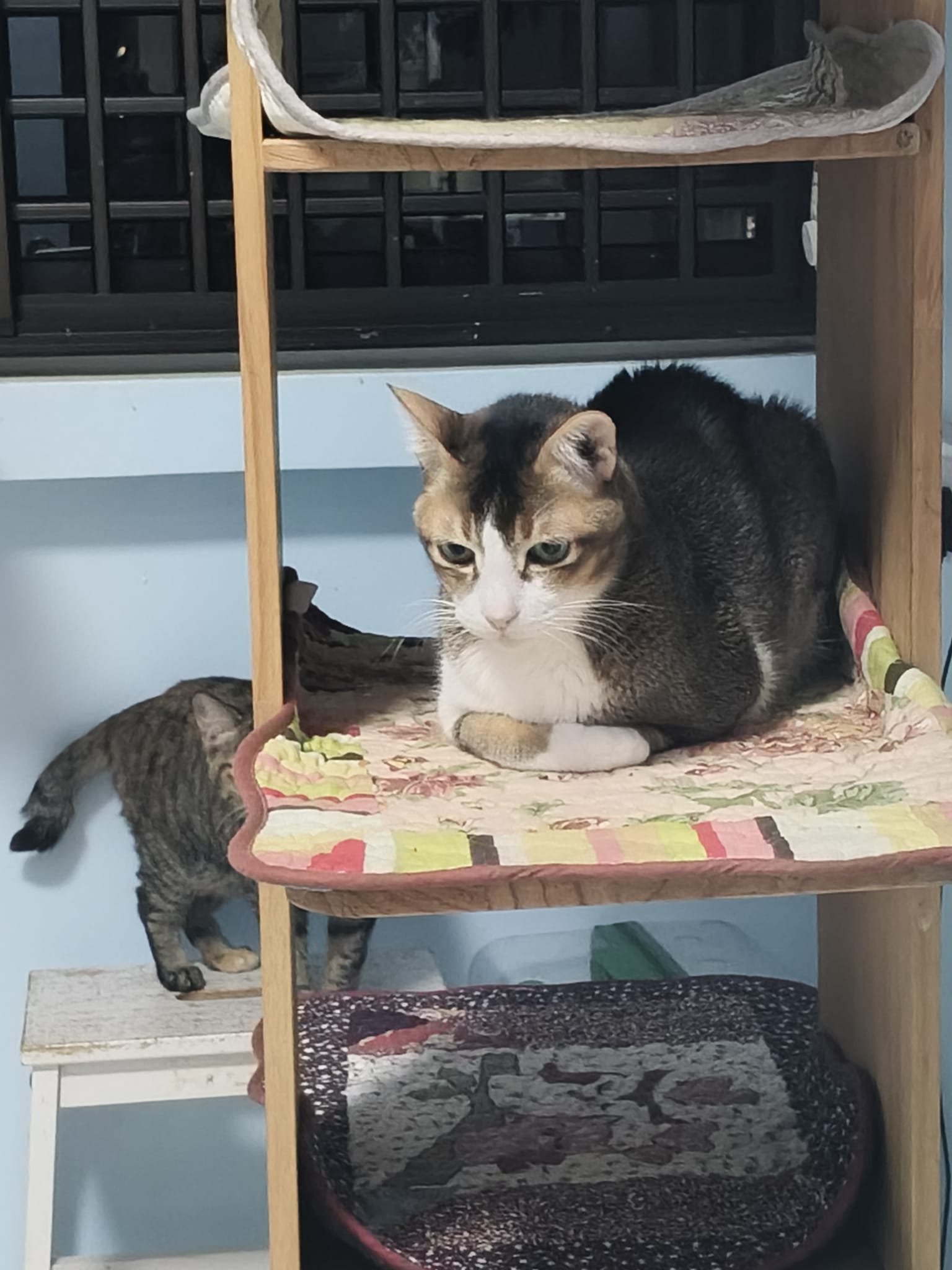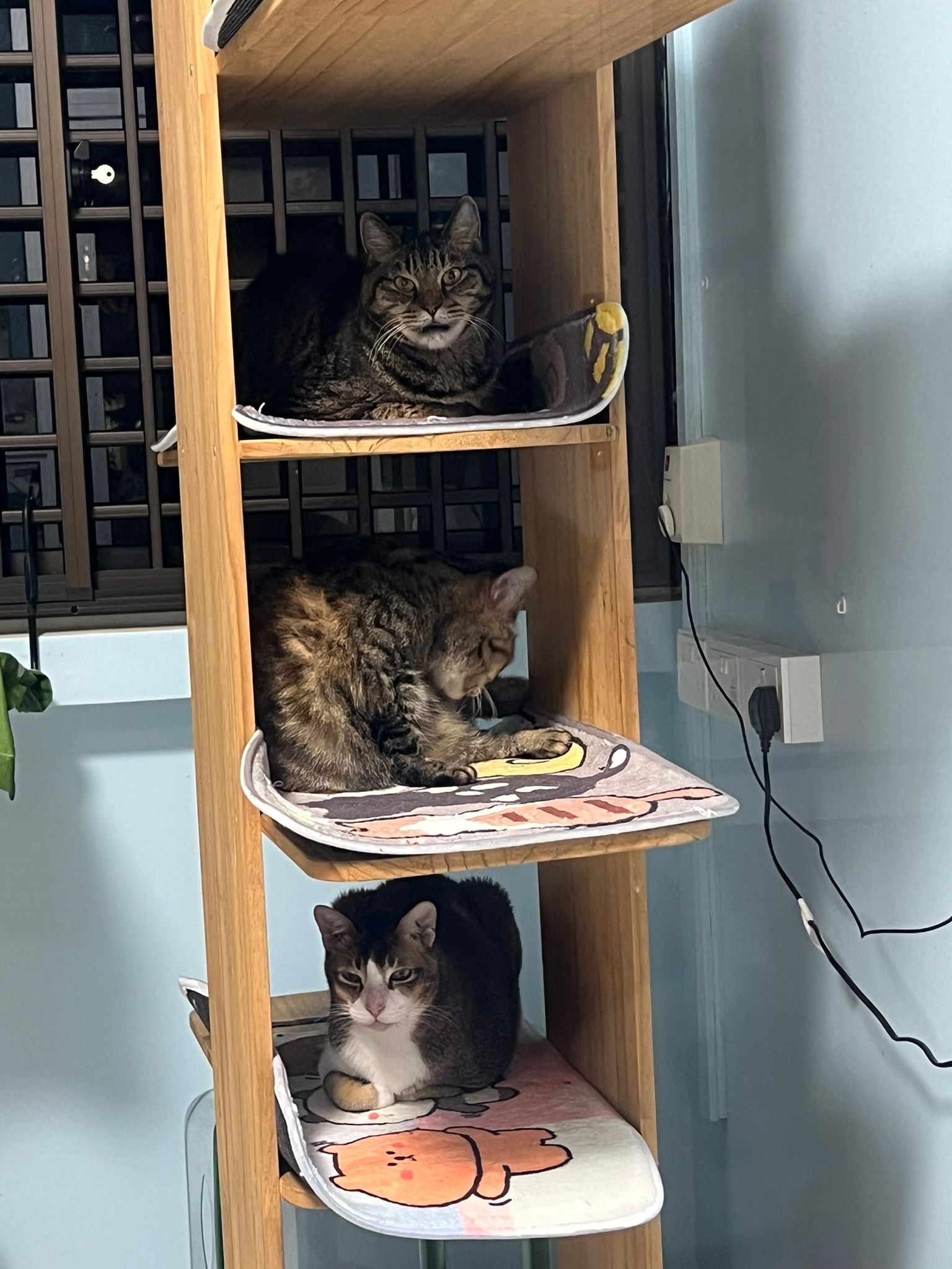 1pm+: I Waited so long their bench delivery not here yet. Today throw half their cat tree away. Rearrange a little. Tmr then give them the bench 🙂