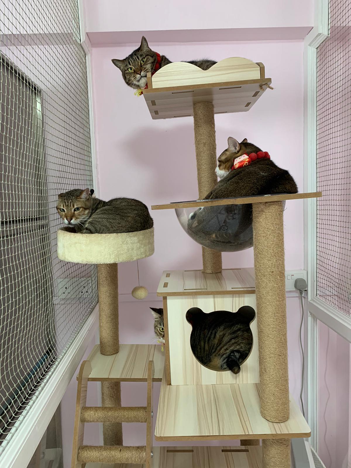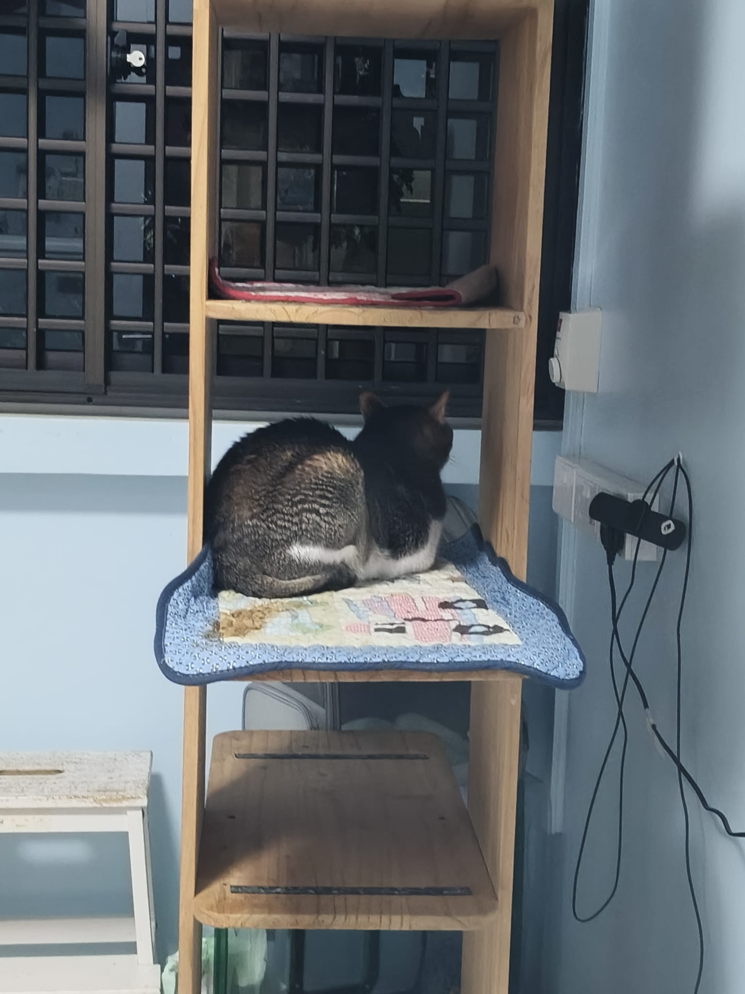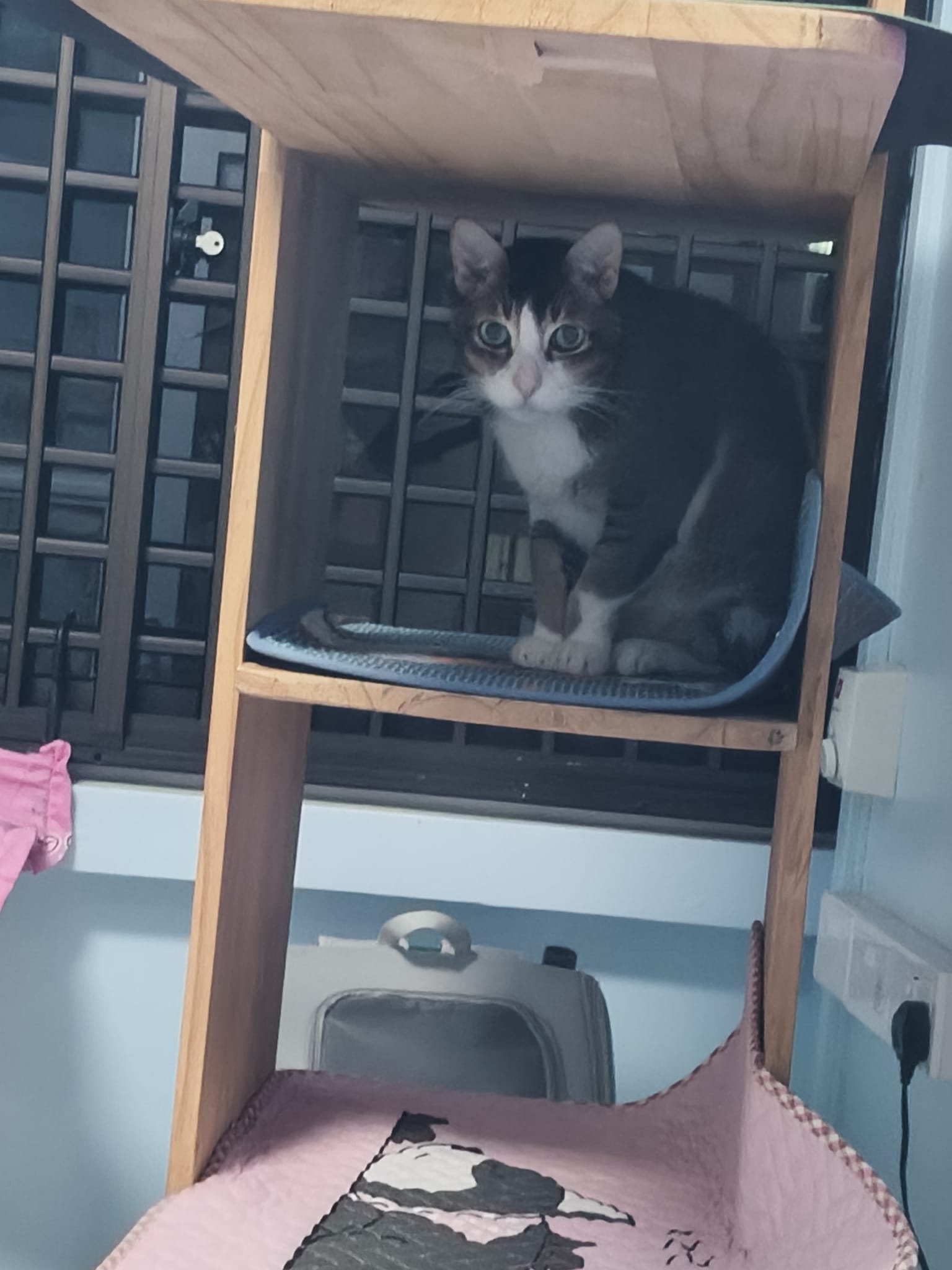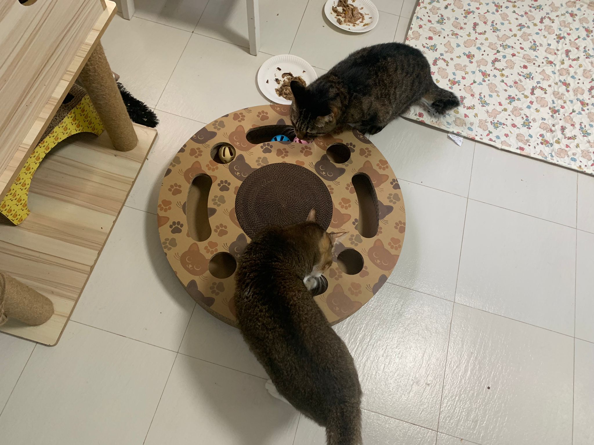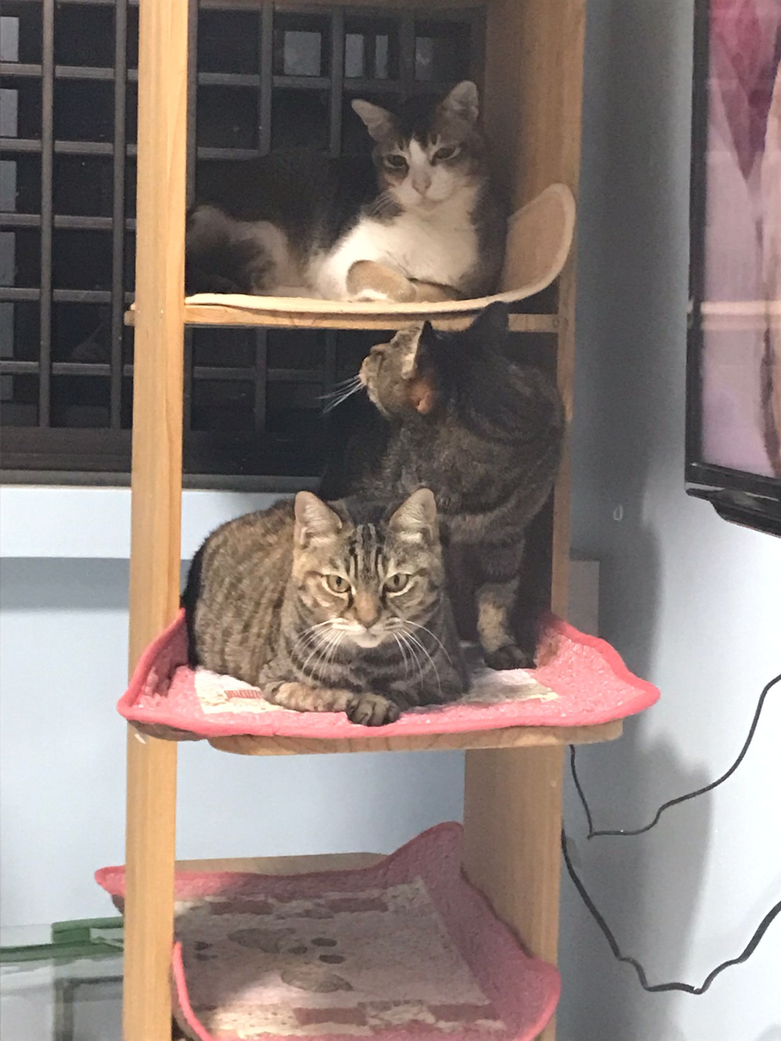 1pm+: I Waited so long their bench delivery not here yet. Today throw half their cat tree away. Rearrange a little. Tmr then give them the bench 🙂