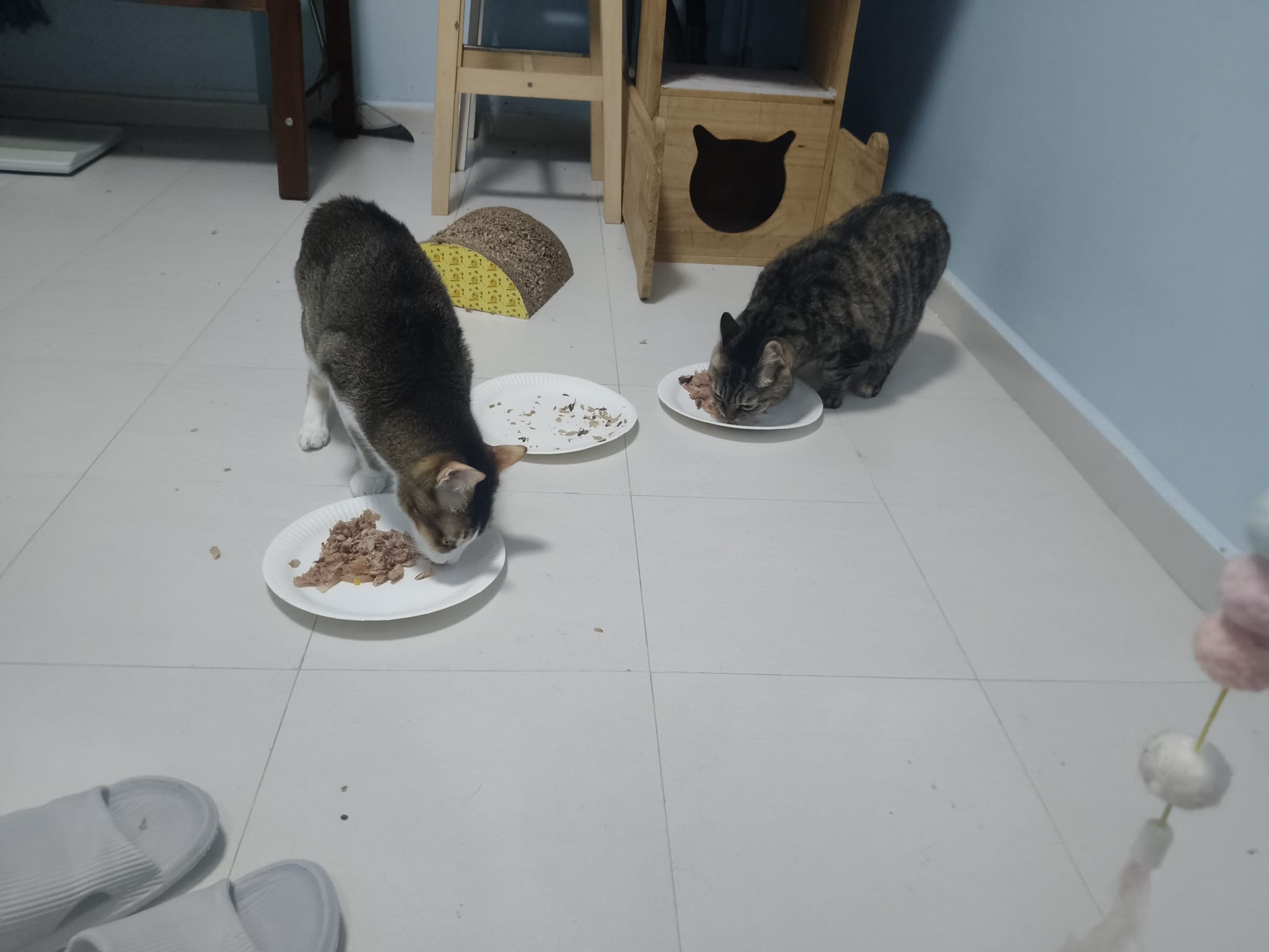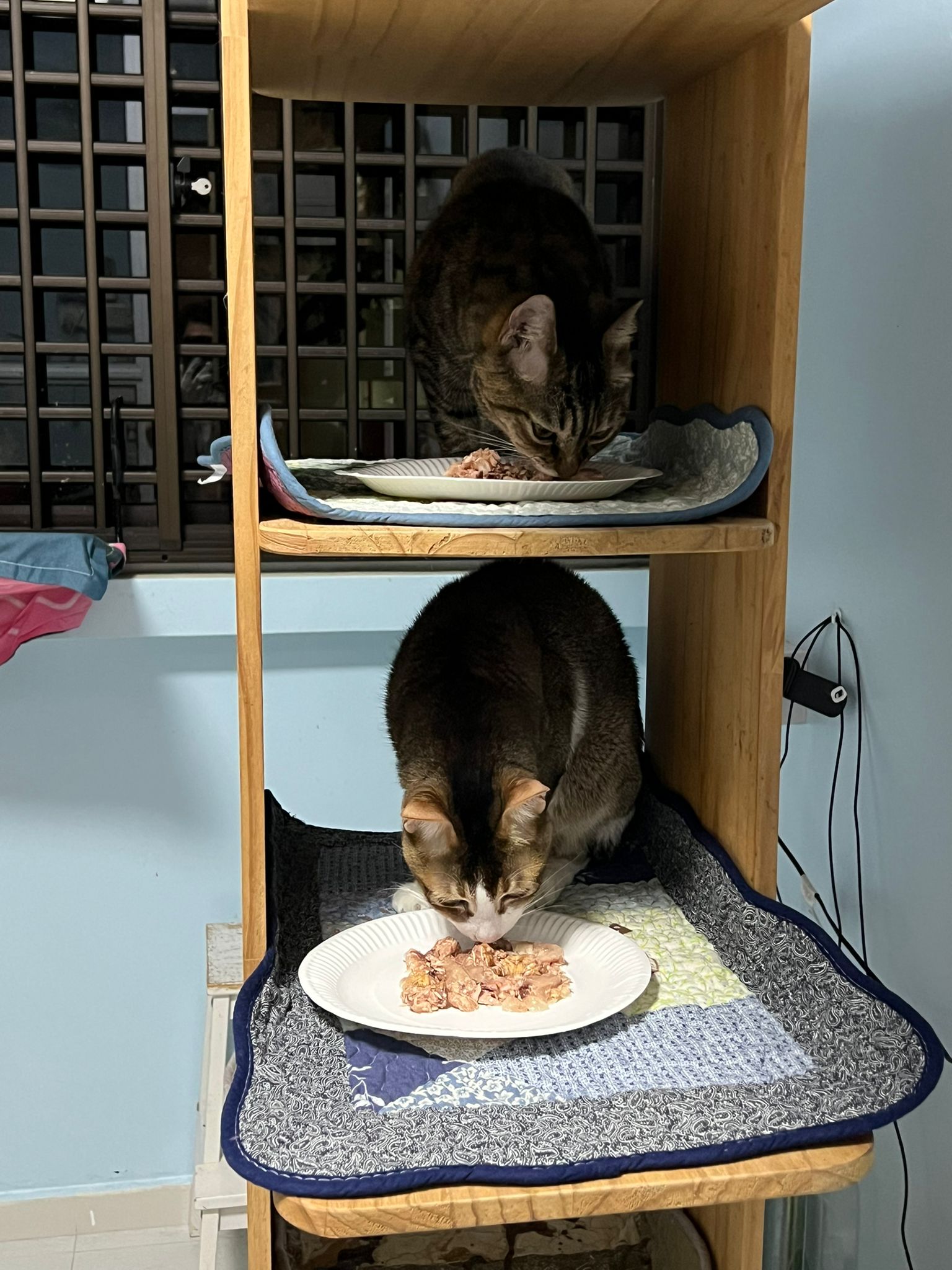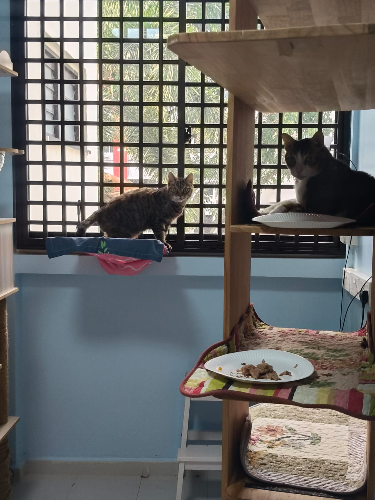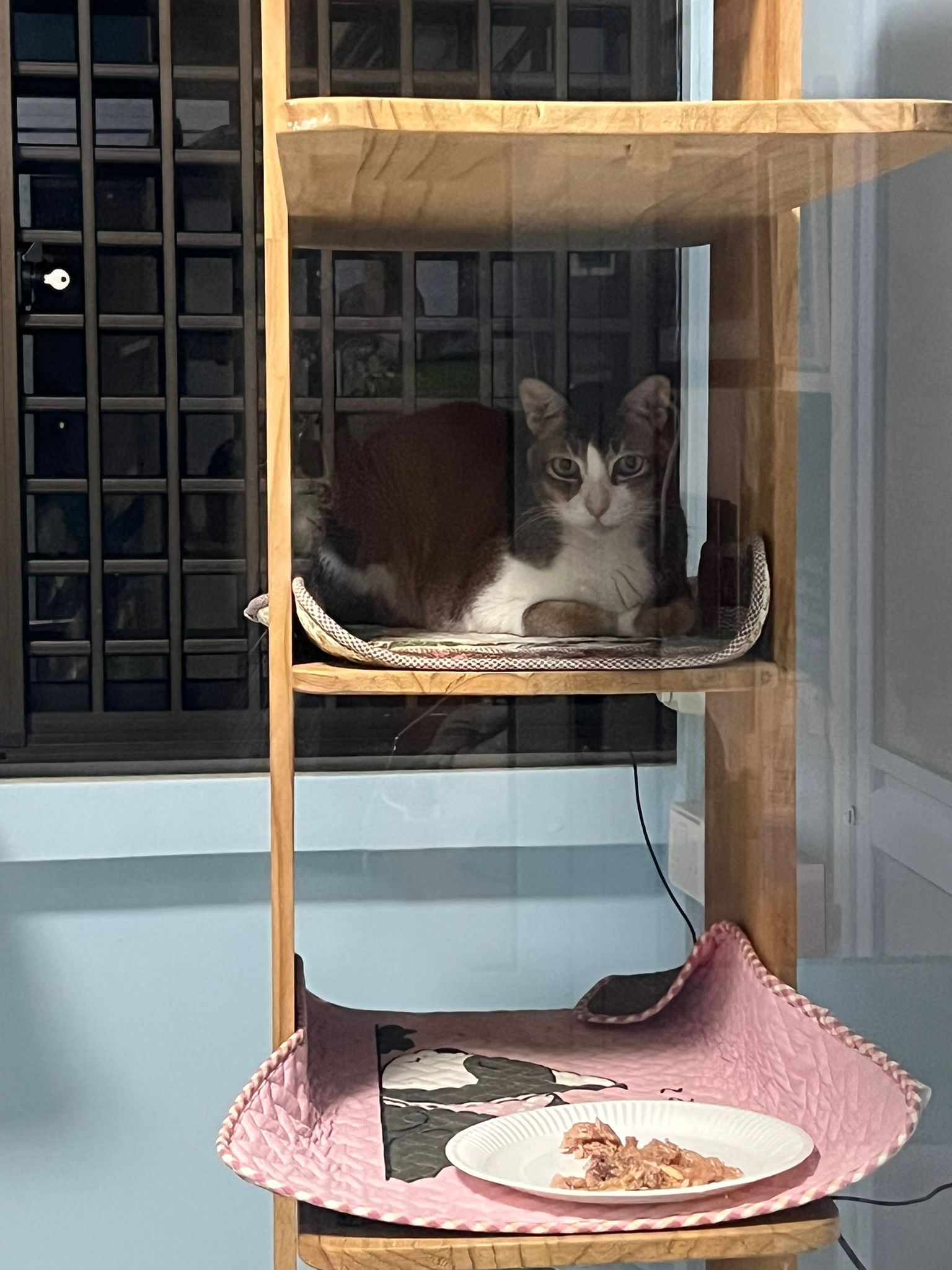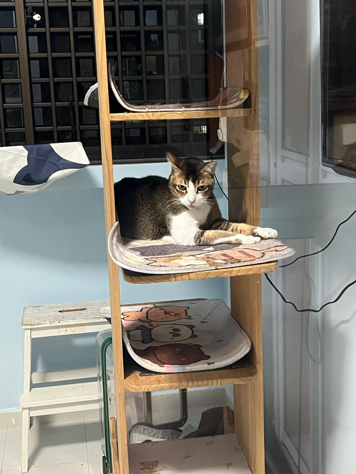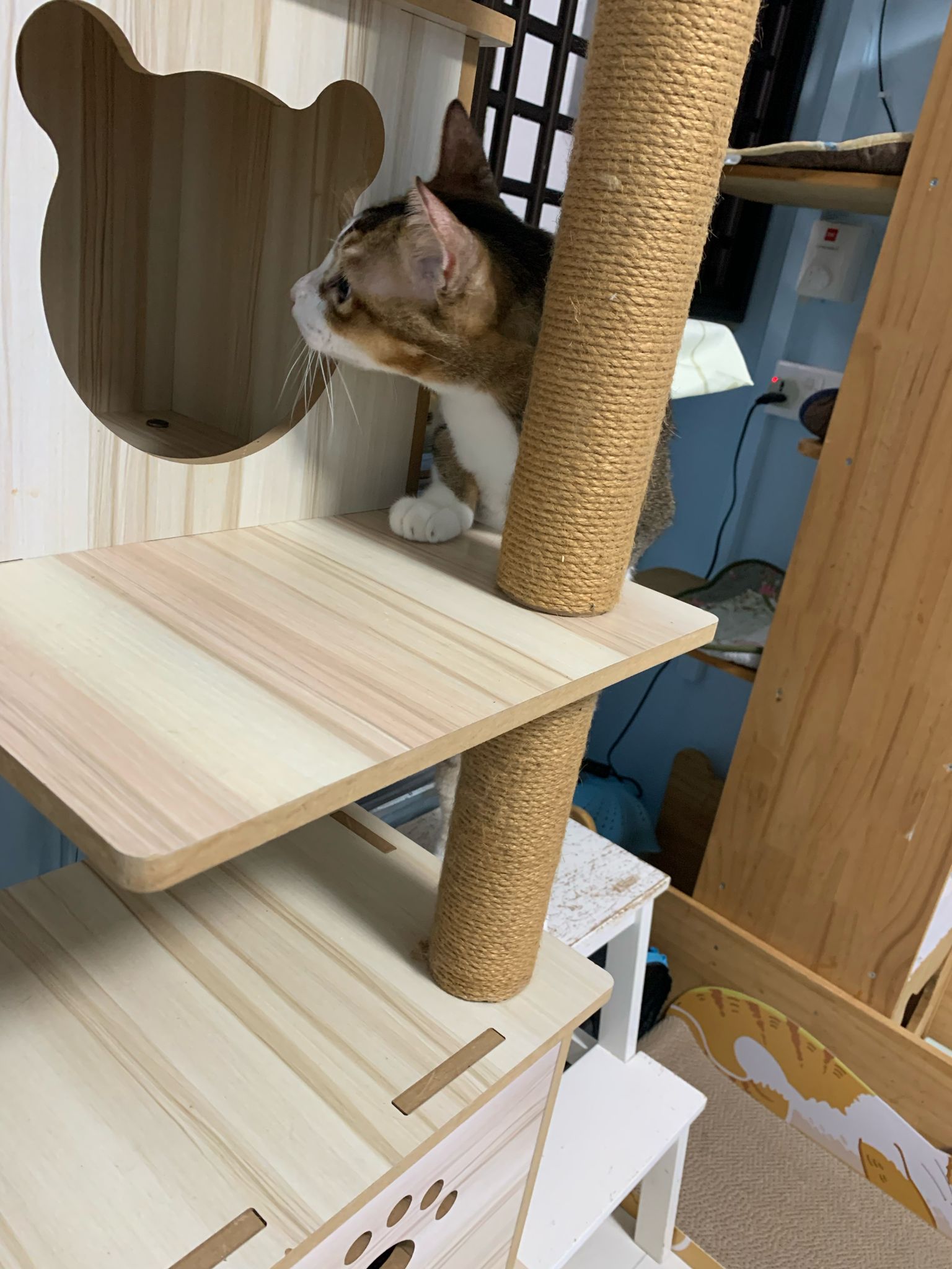 1pm+: I Waited so long their bench delivery not here yet. Today throw half their cat tree away. Rearrange a little. Tmr then give them the bench 🙂