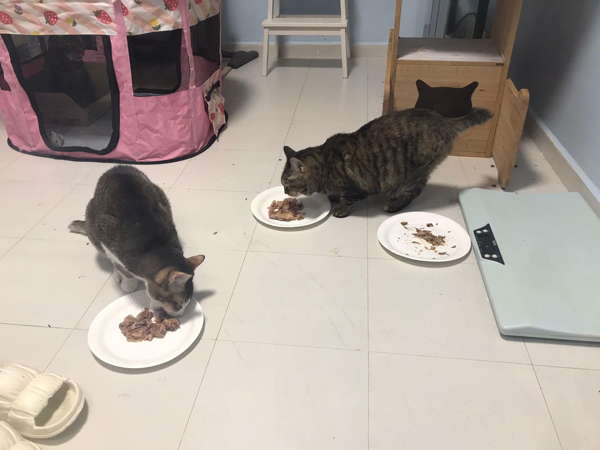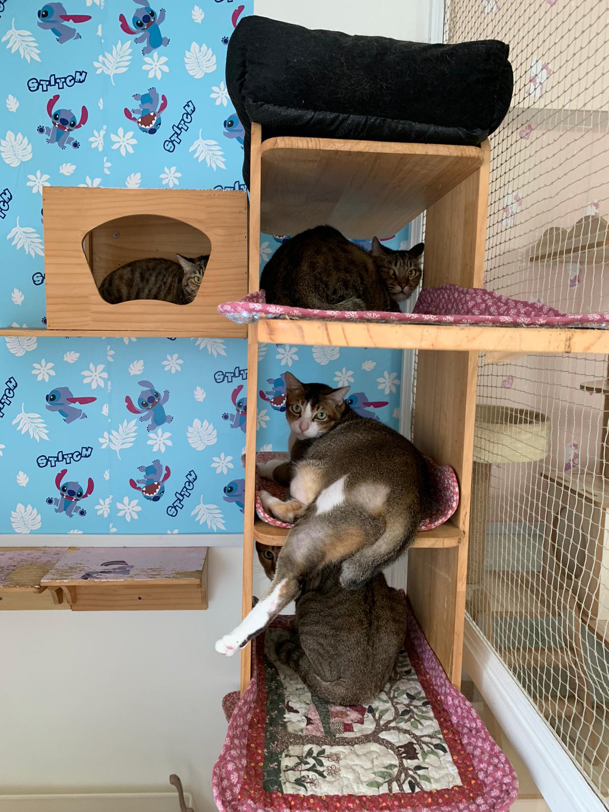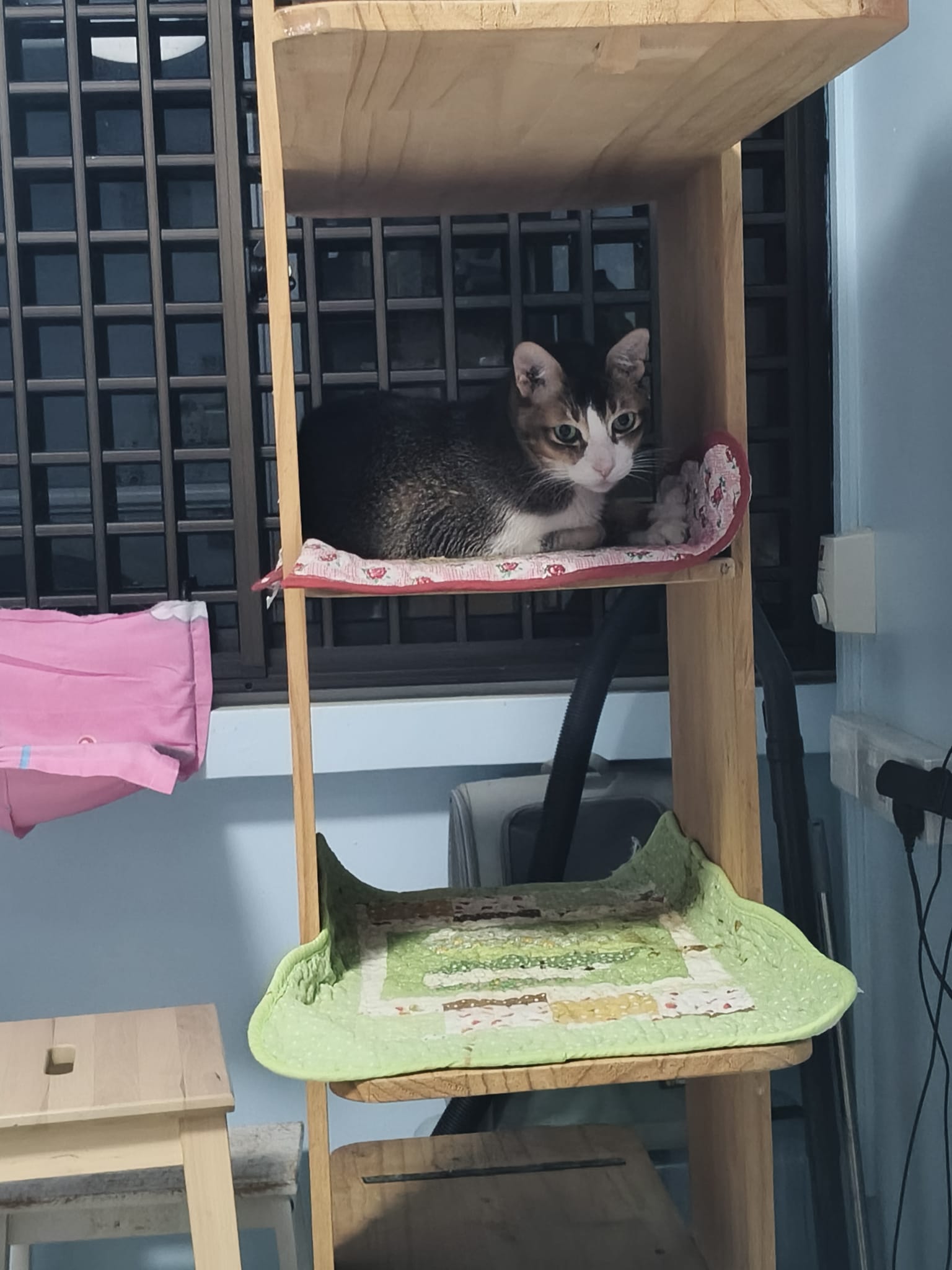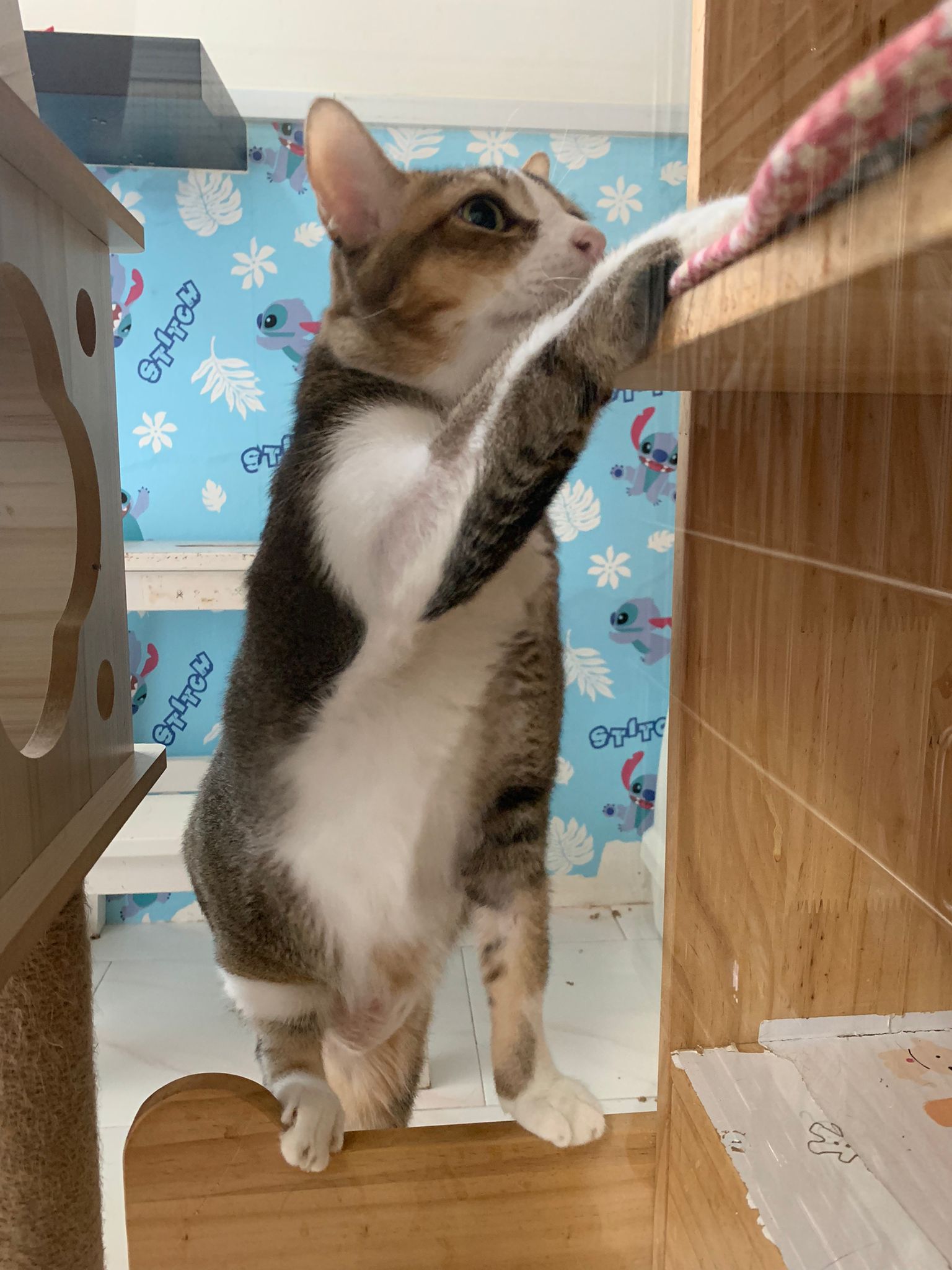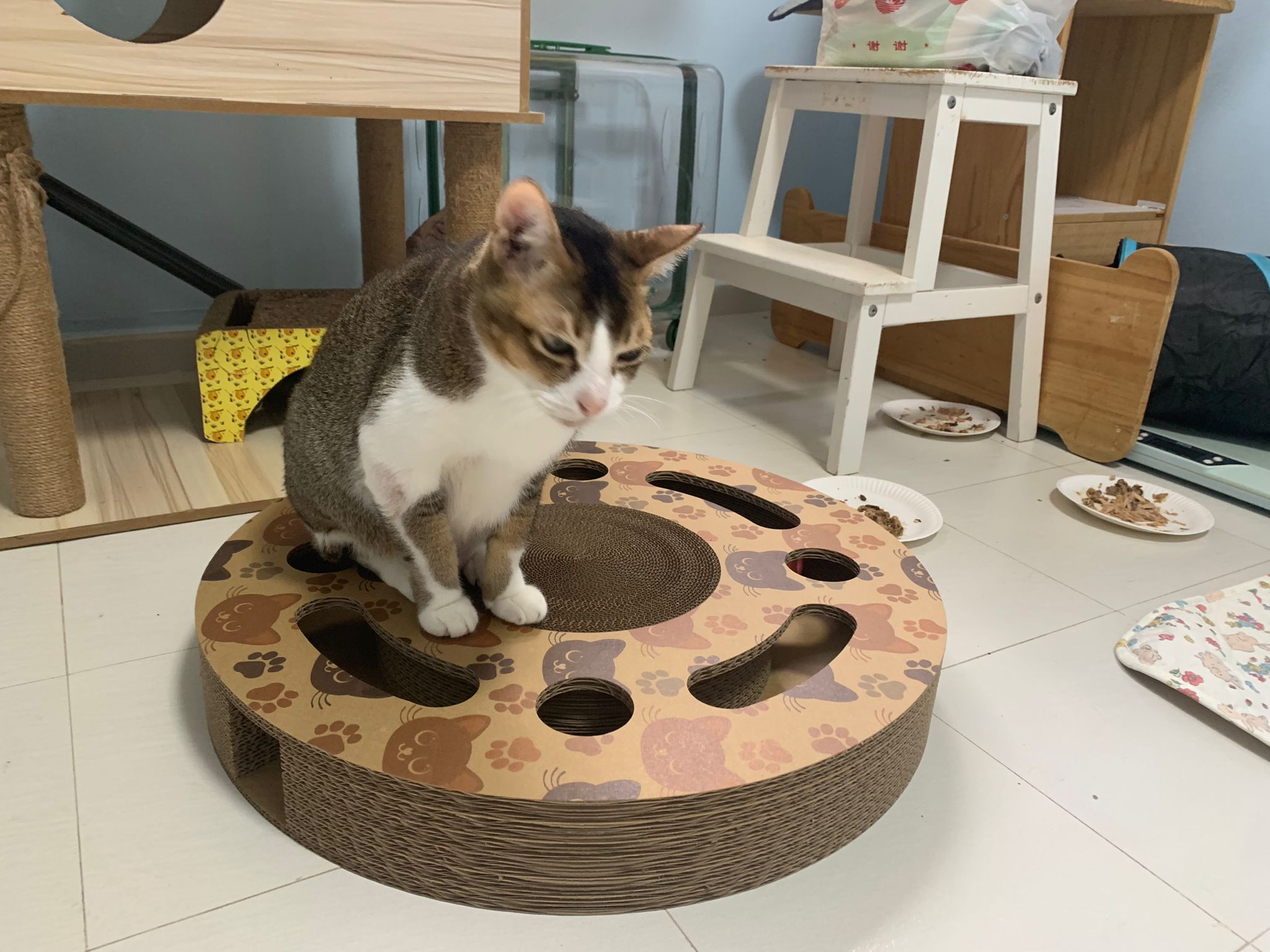 1pm+: I Waited so long their bench delivery not here yet. Today throw half their cat tree away. Rearrange a little. Tmr then give them the bench 🙂