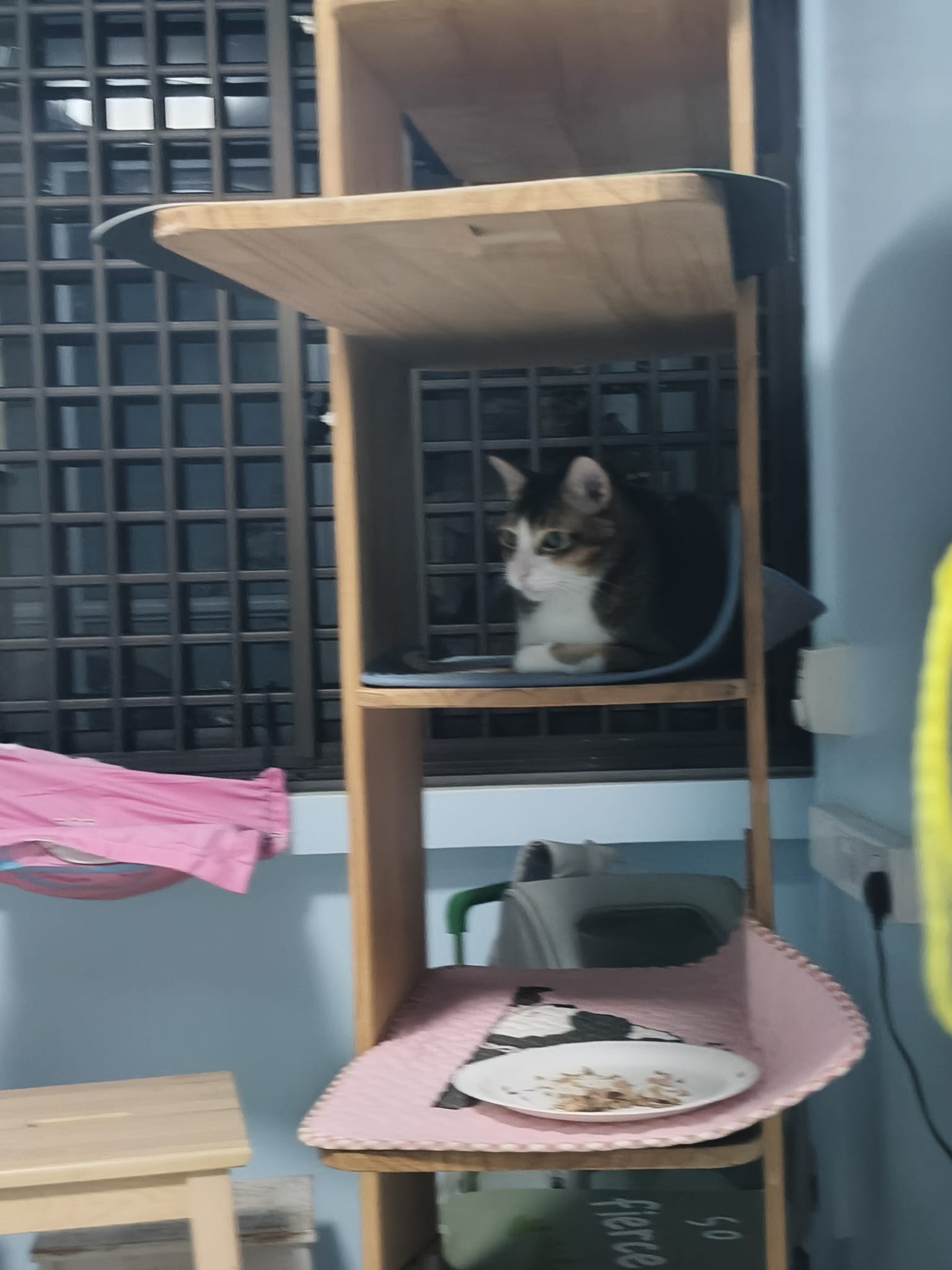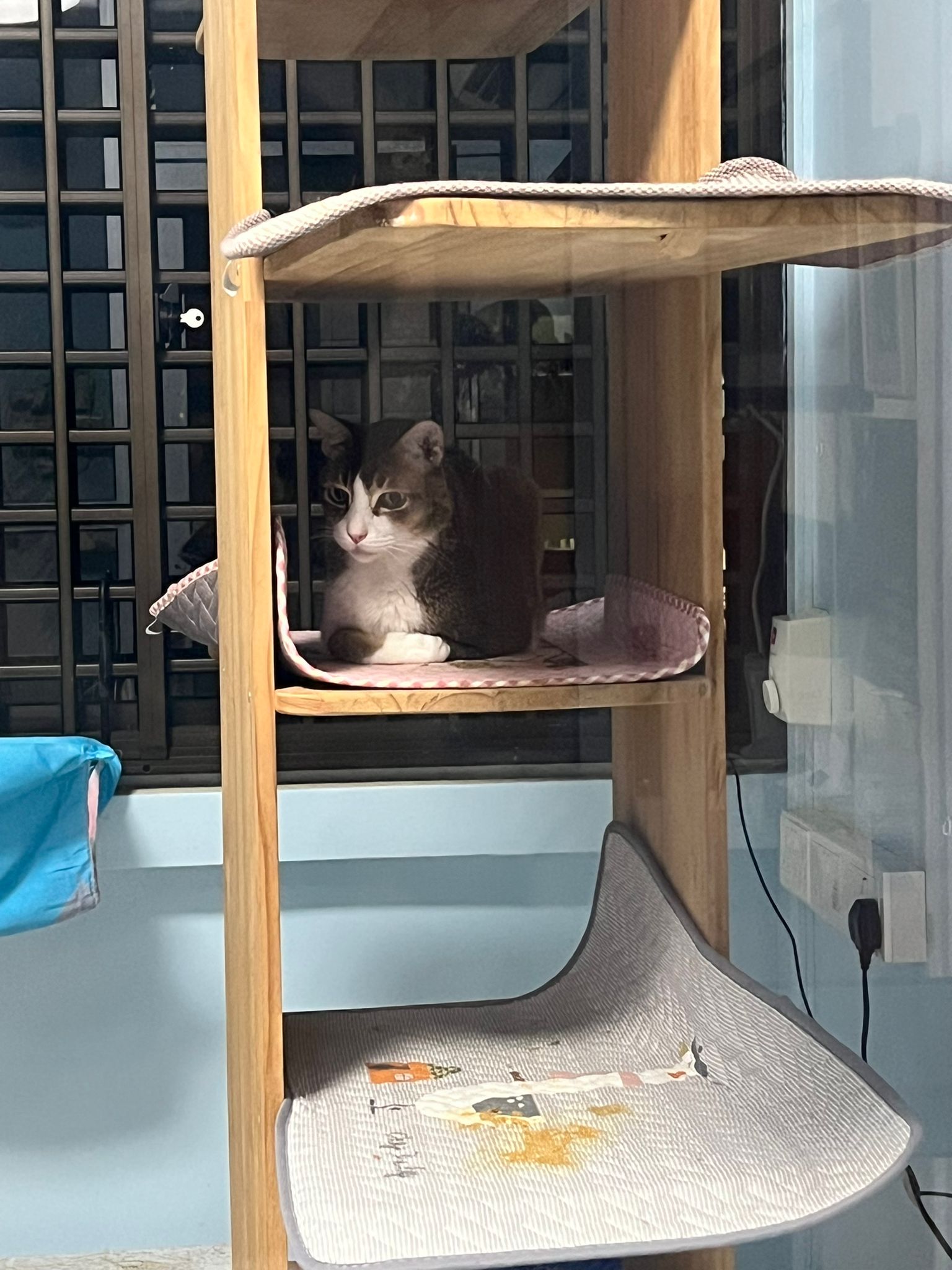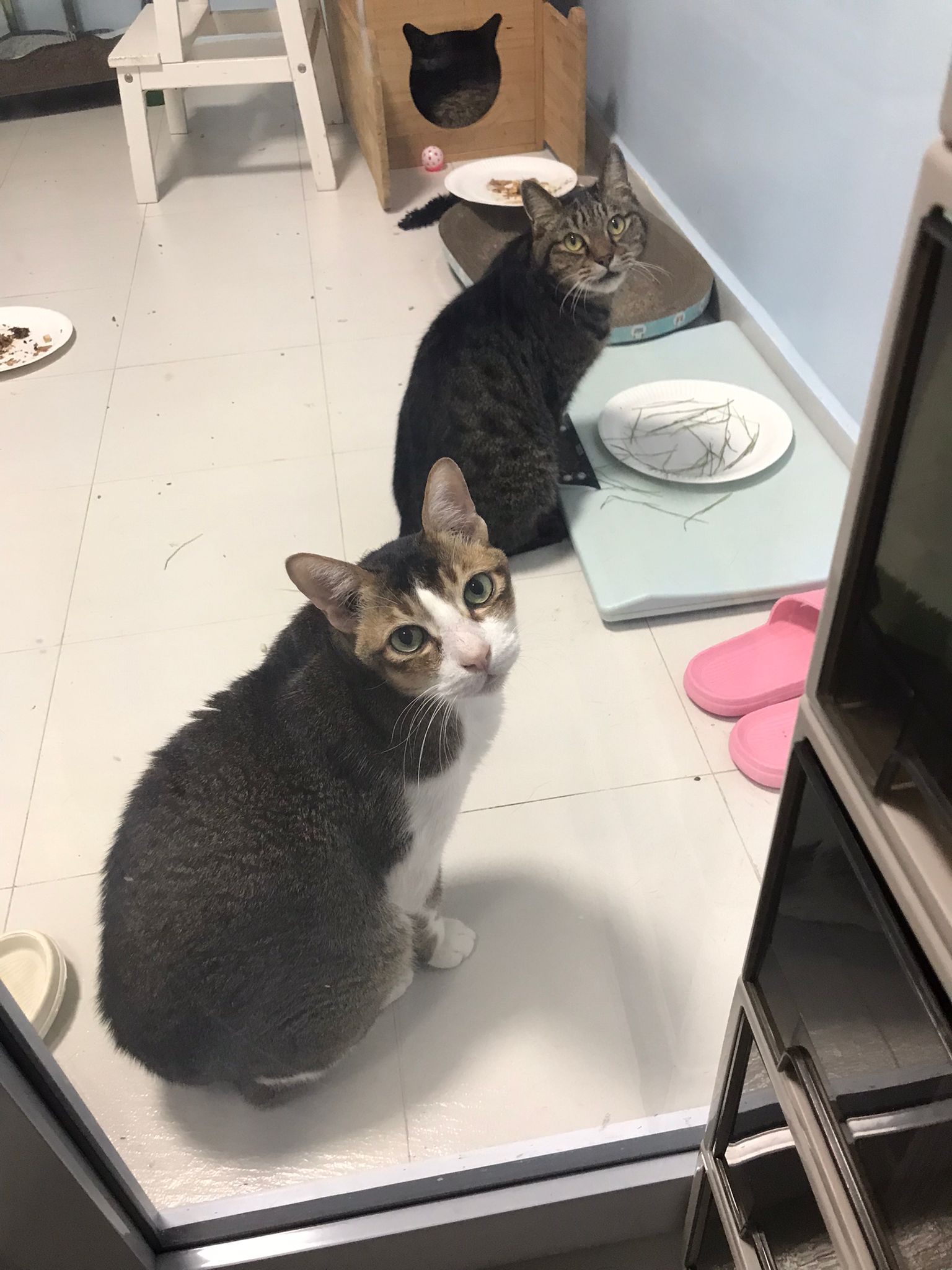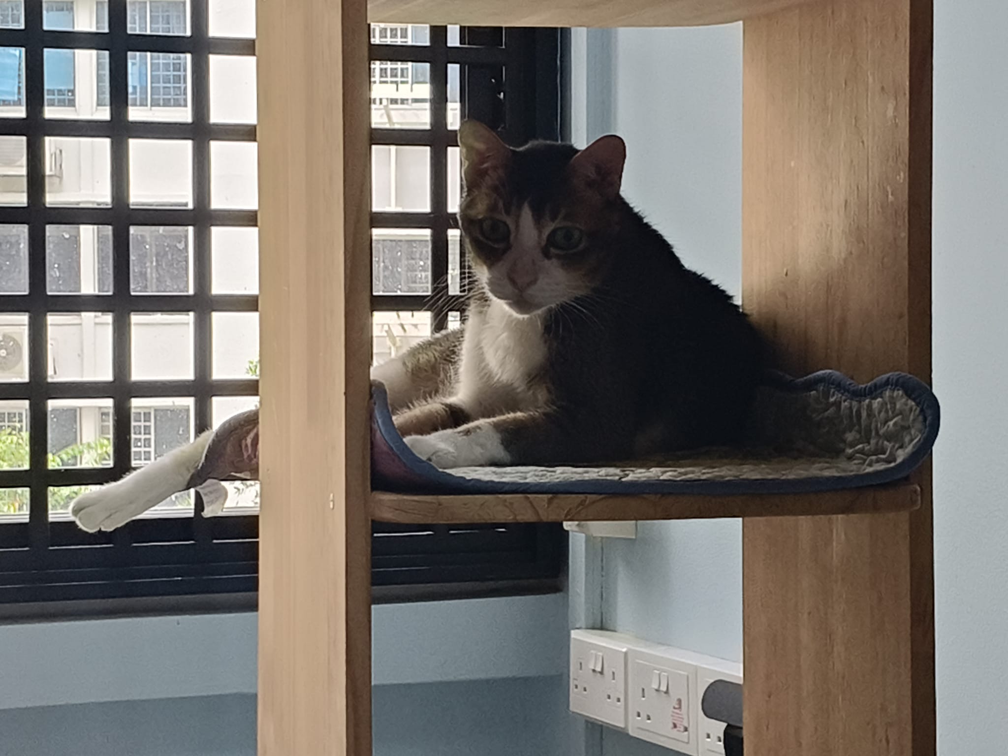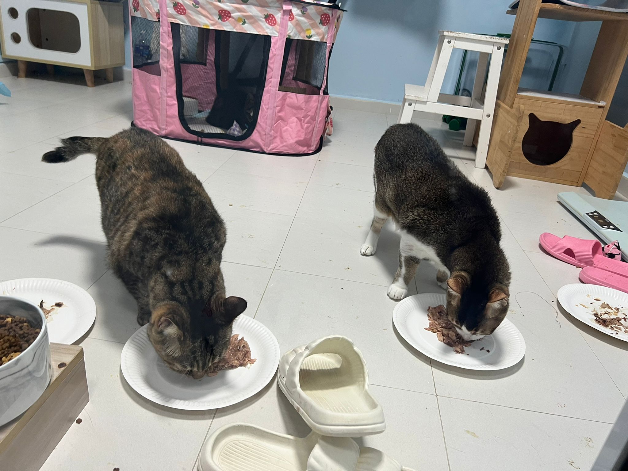 1pm+: I Waited so long their bench delivery not here yet. Today throw half their cat tree away. Rearrange a little. Tmr then give them the bench 🙂