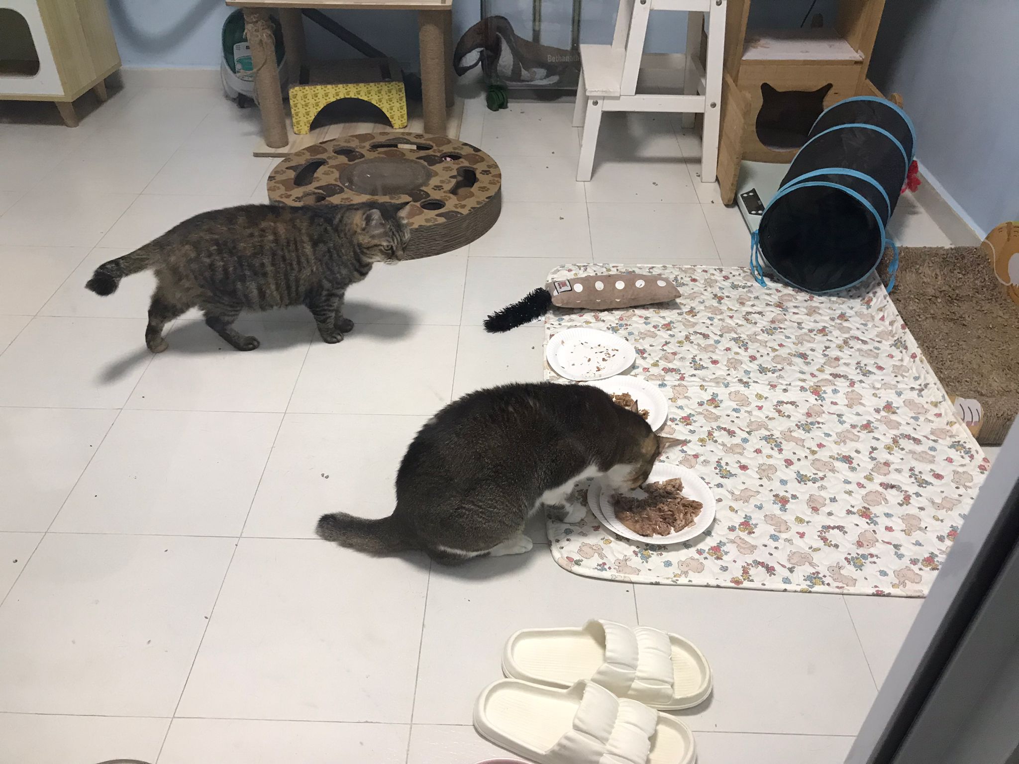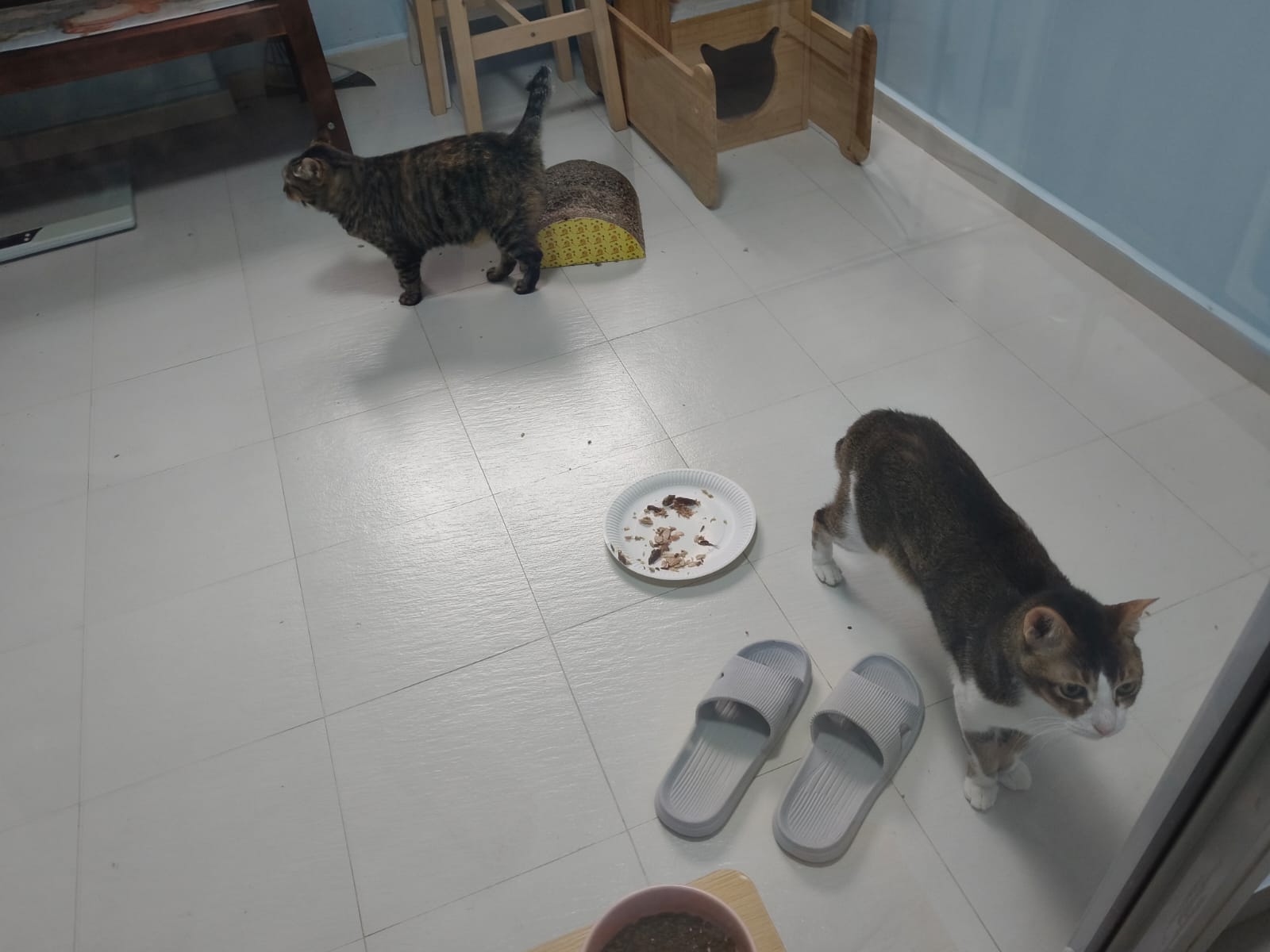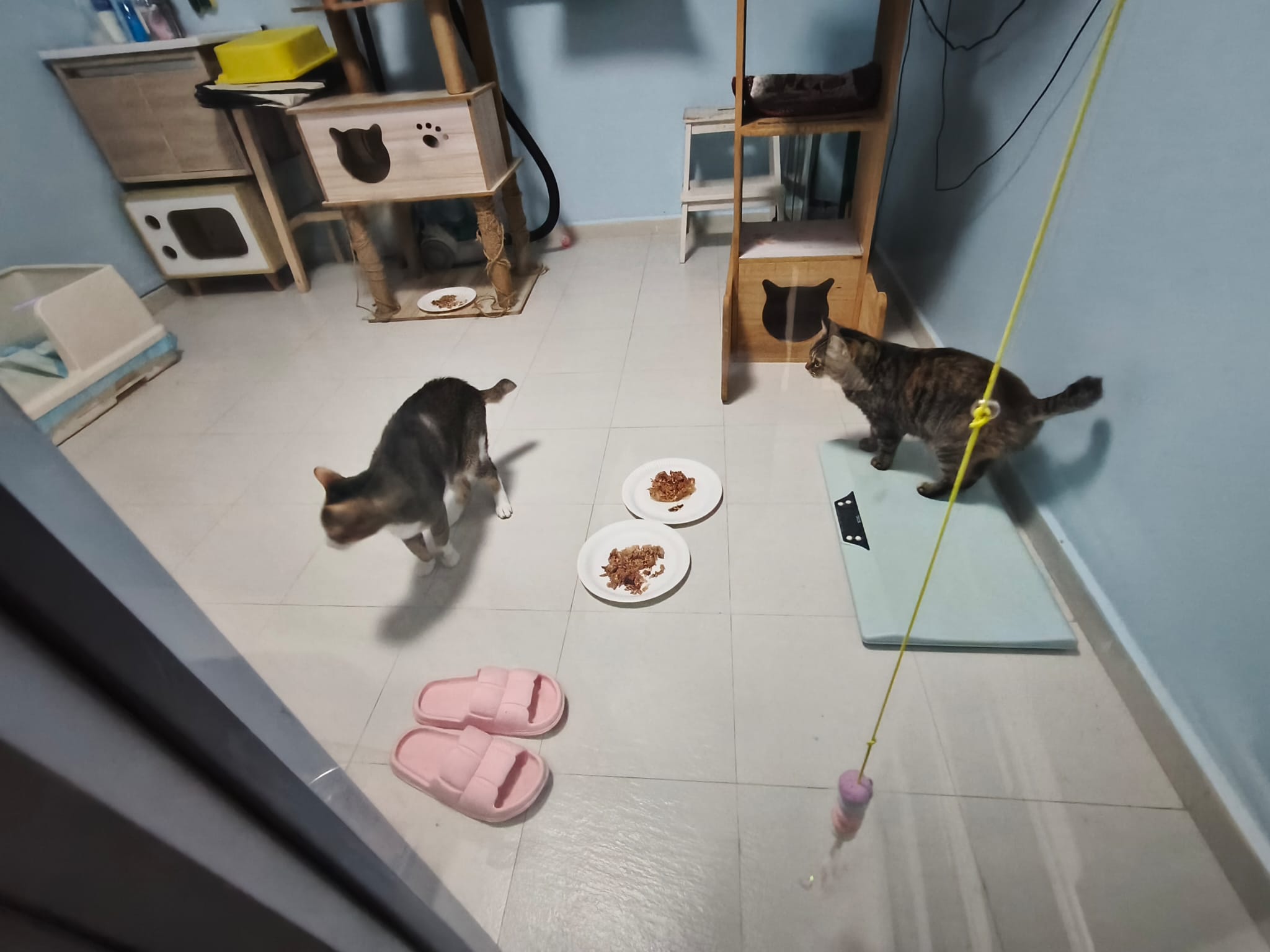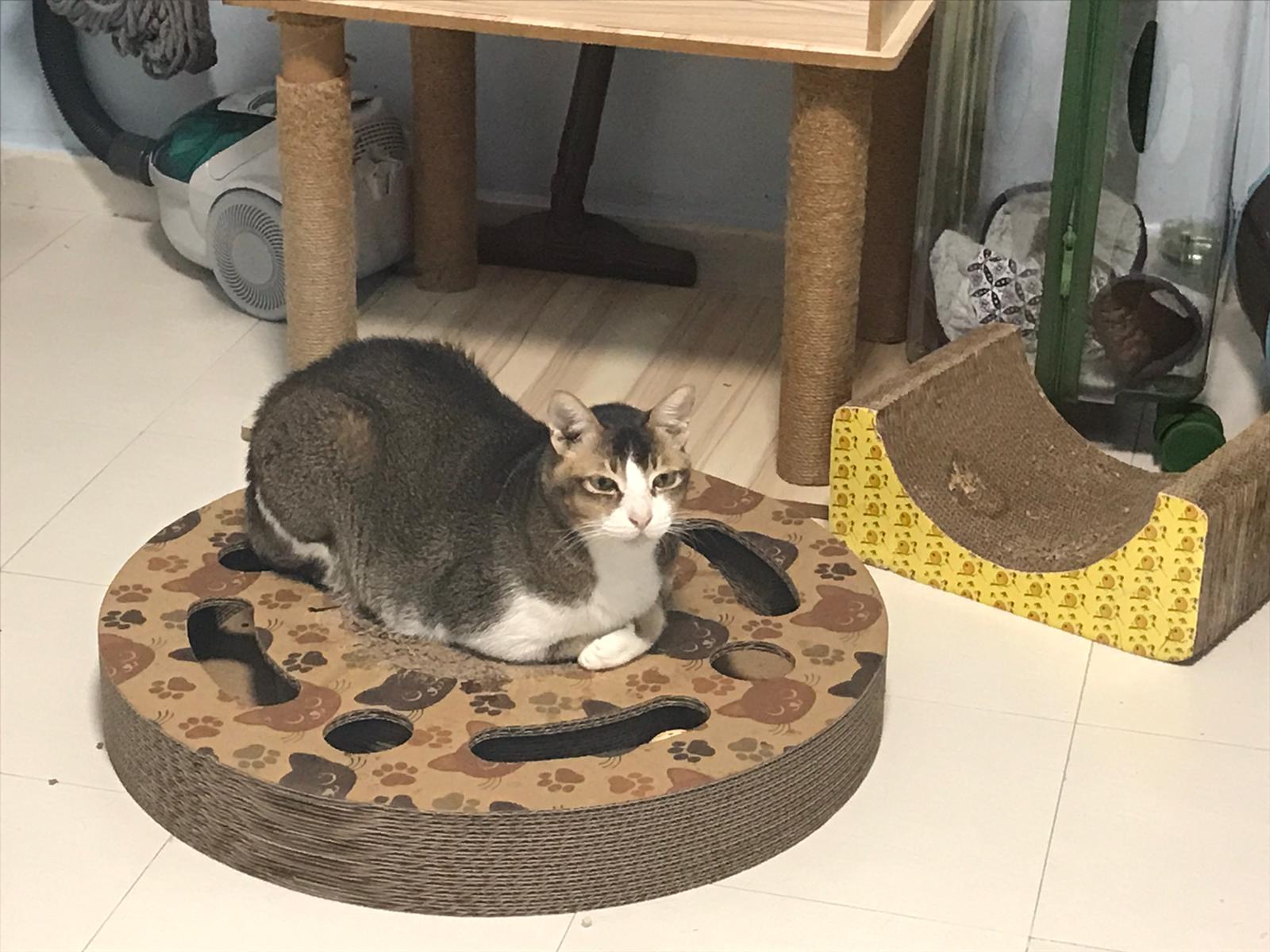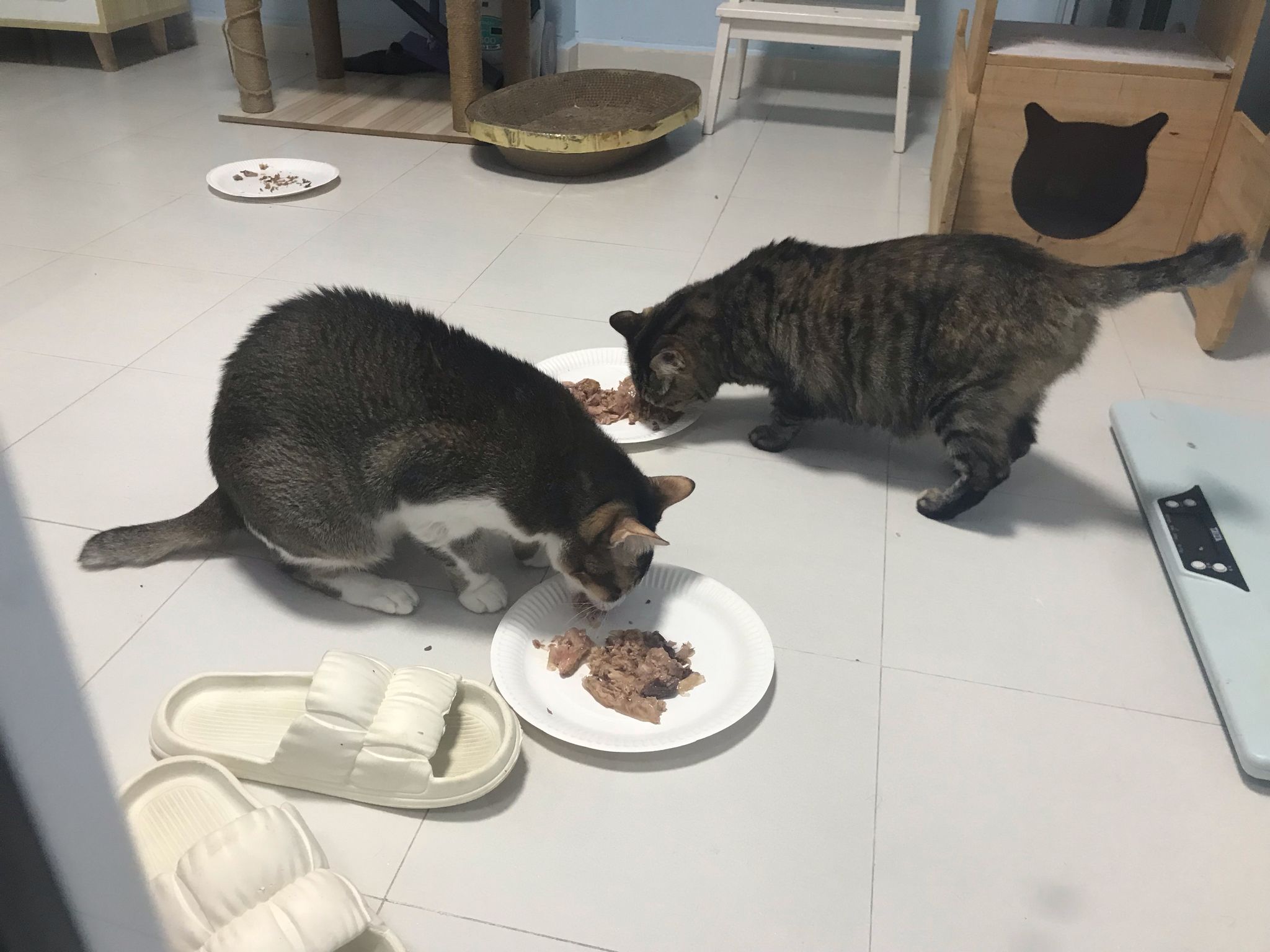 1pm+: I Waited so long their bench delivery not here yet. Today throw half their cat tree away. Rearrange a little. Tmr then give them the bench 🙂