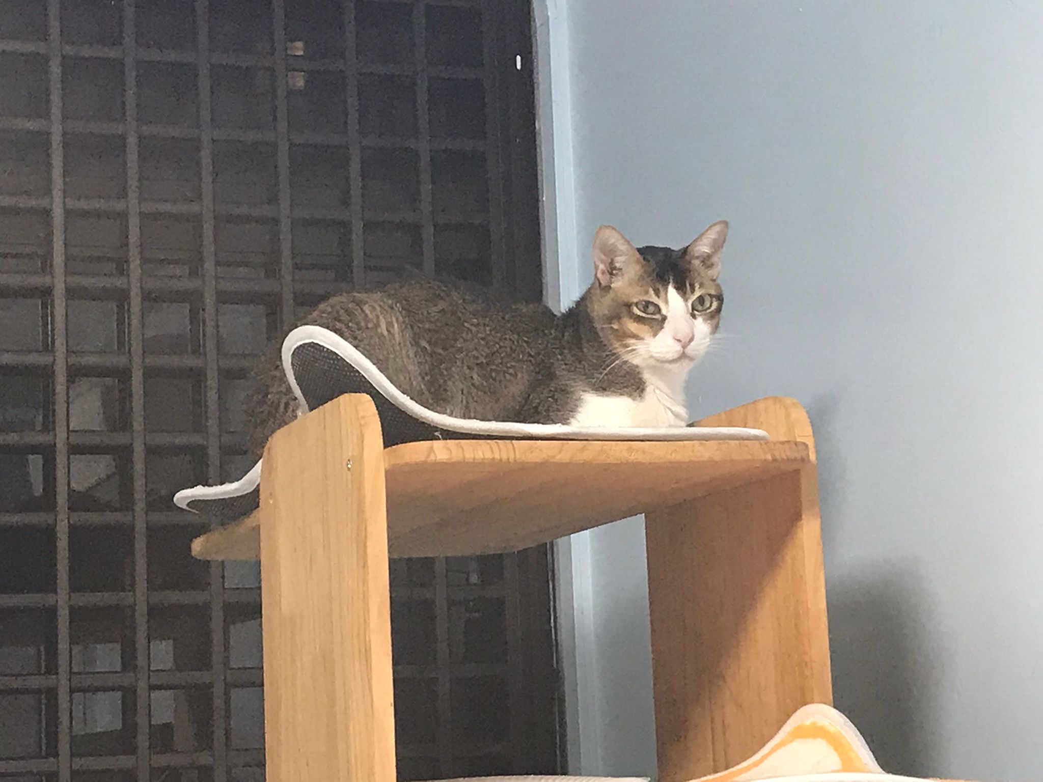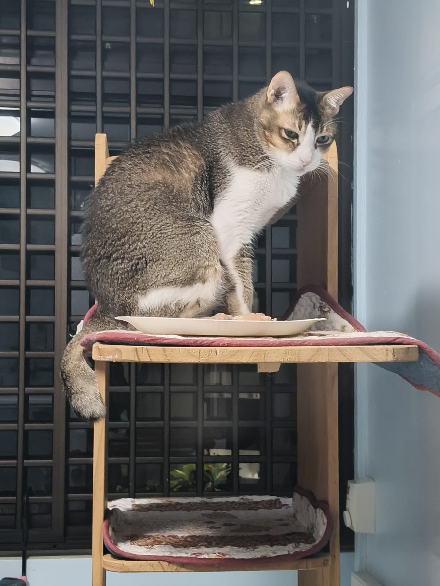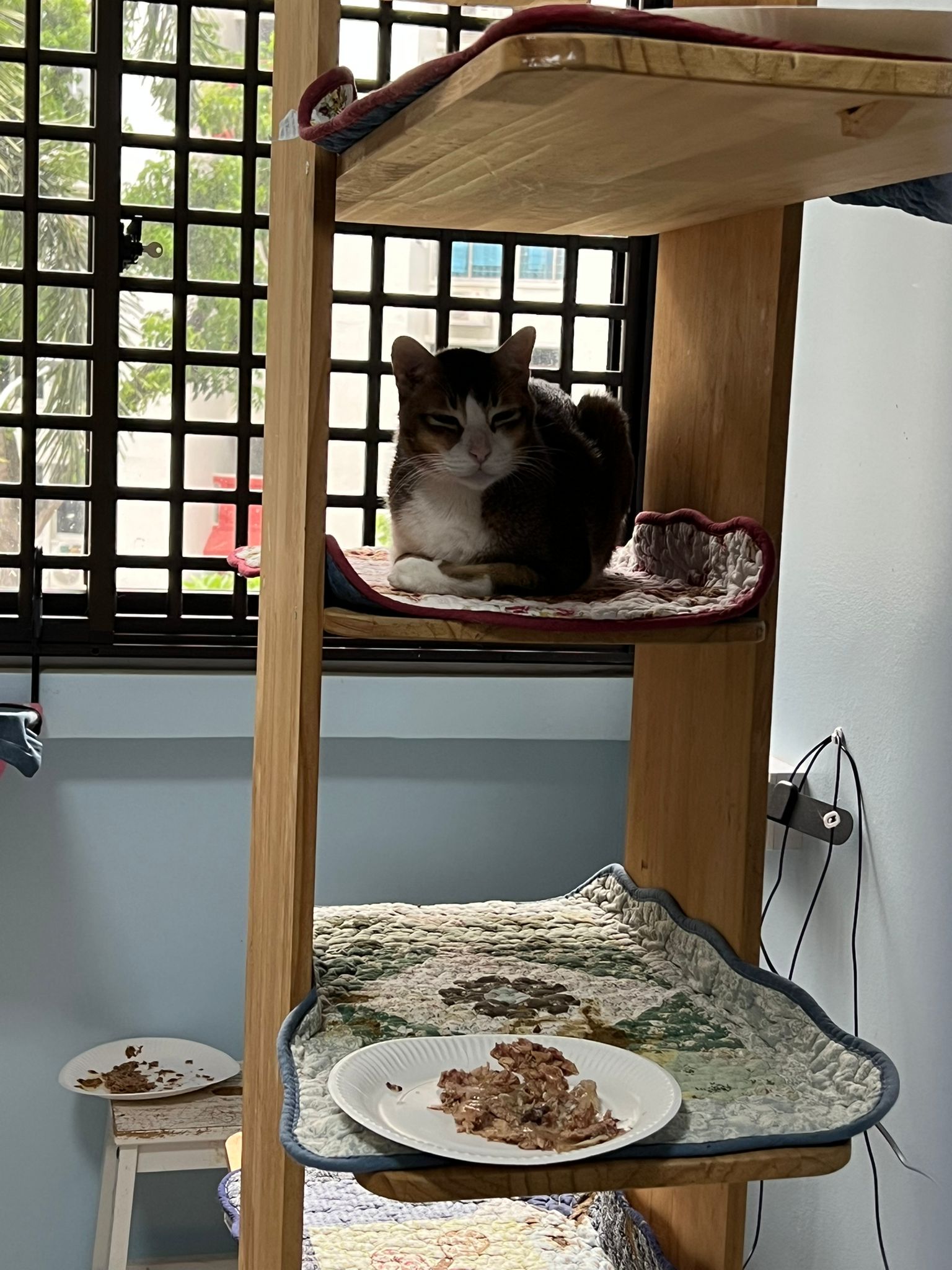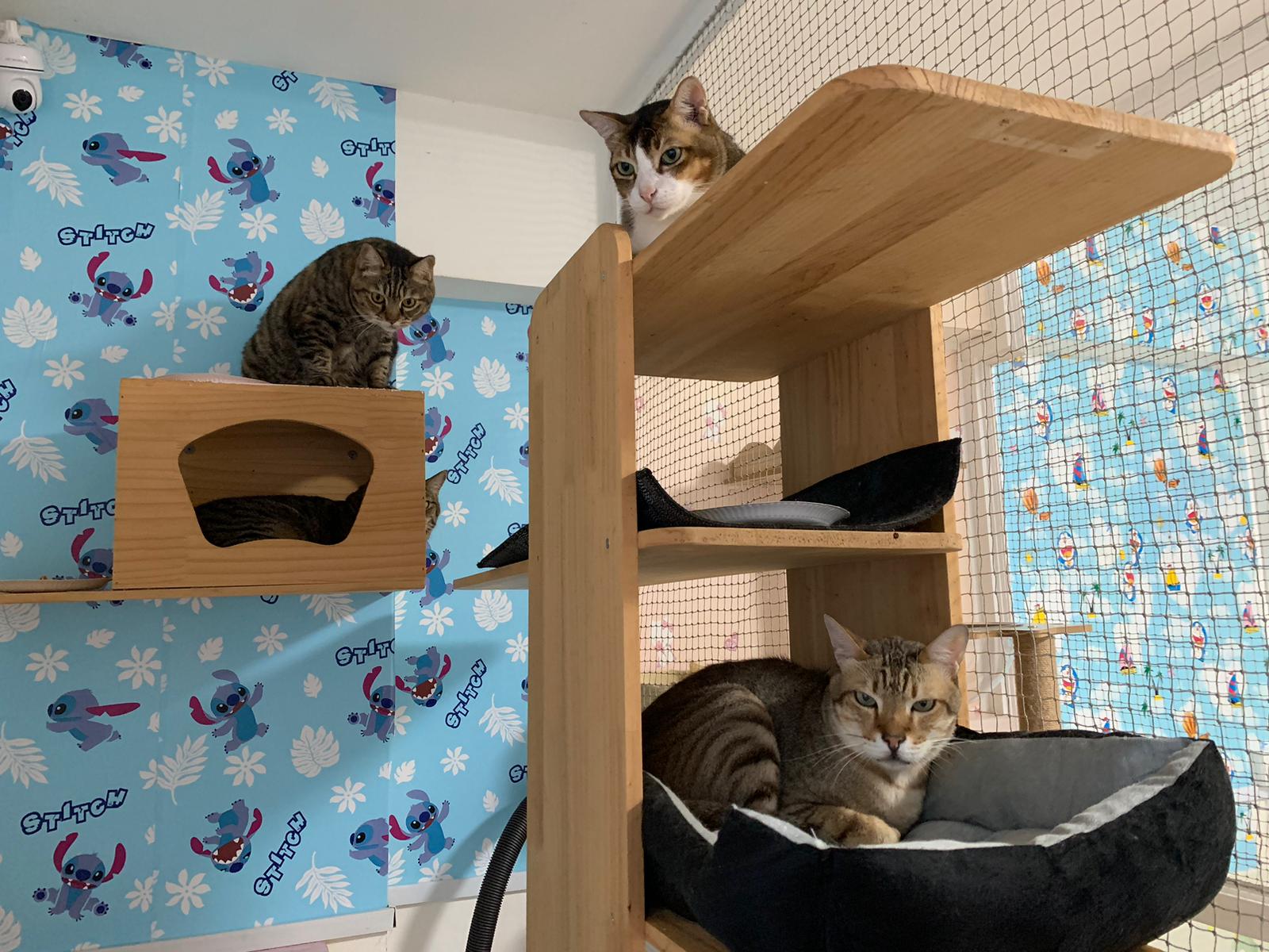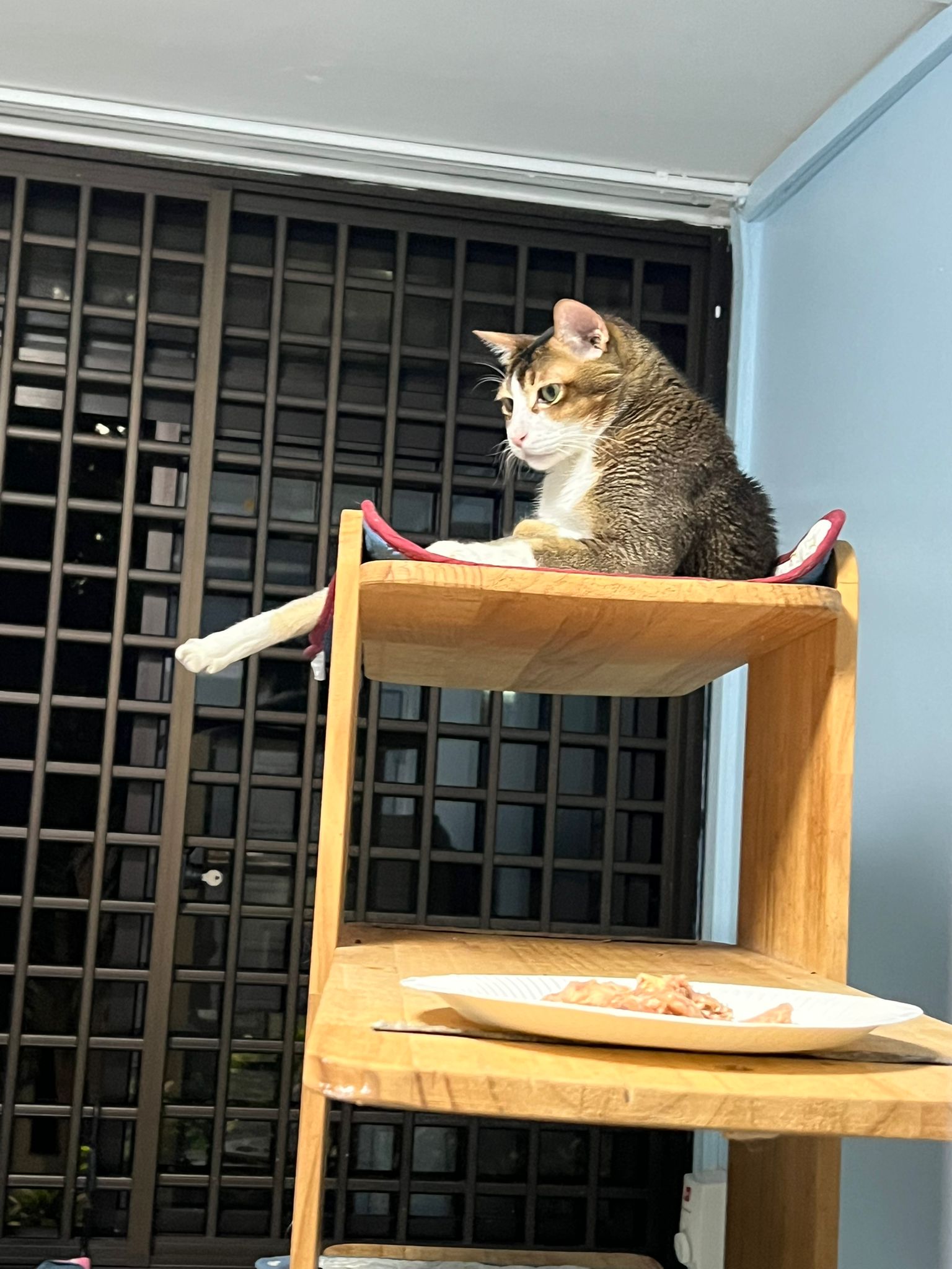 1pm+: I Waited so long their bench delivery not here yet. Today throw half their cat tree away. Rearrange a little. Tmr then give them the bench 🙂