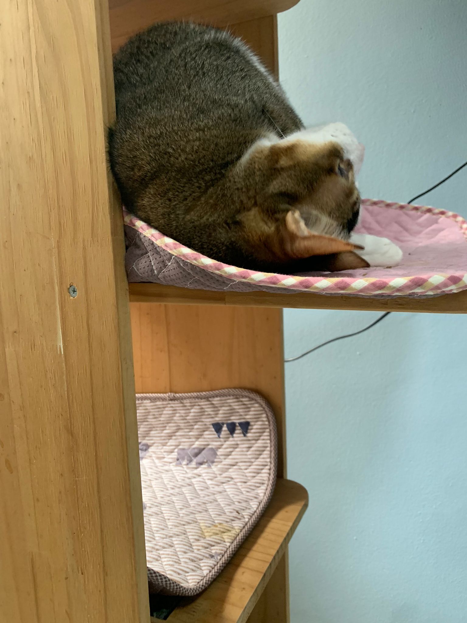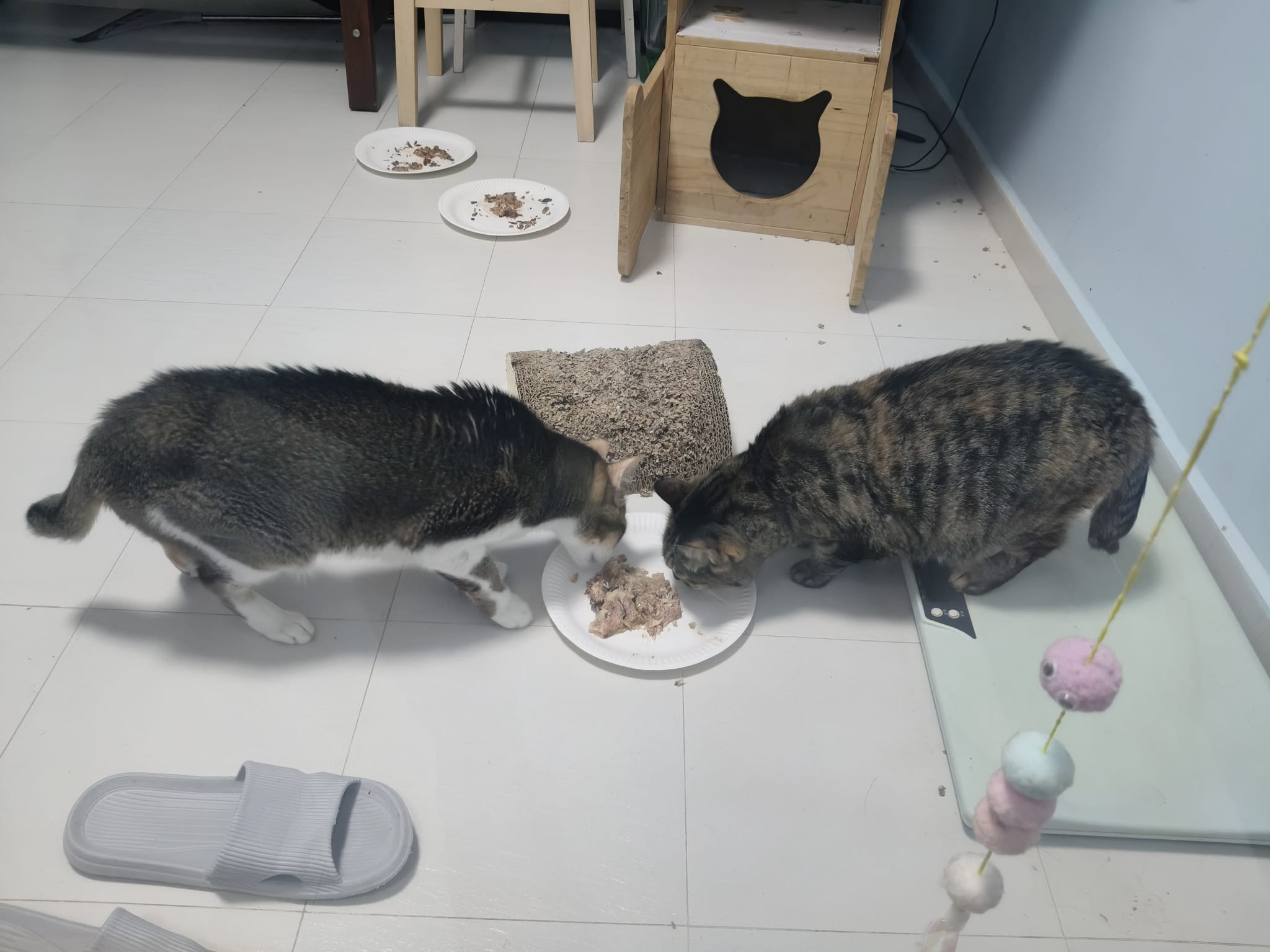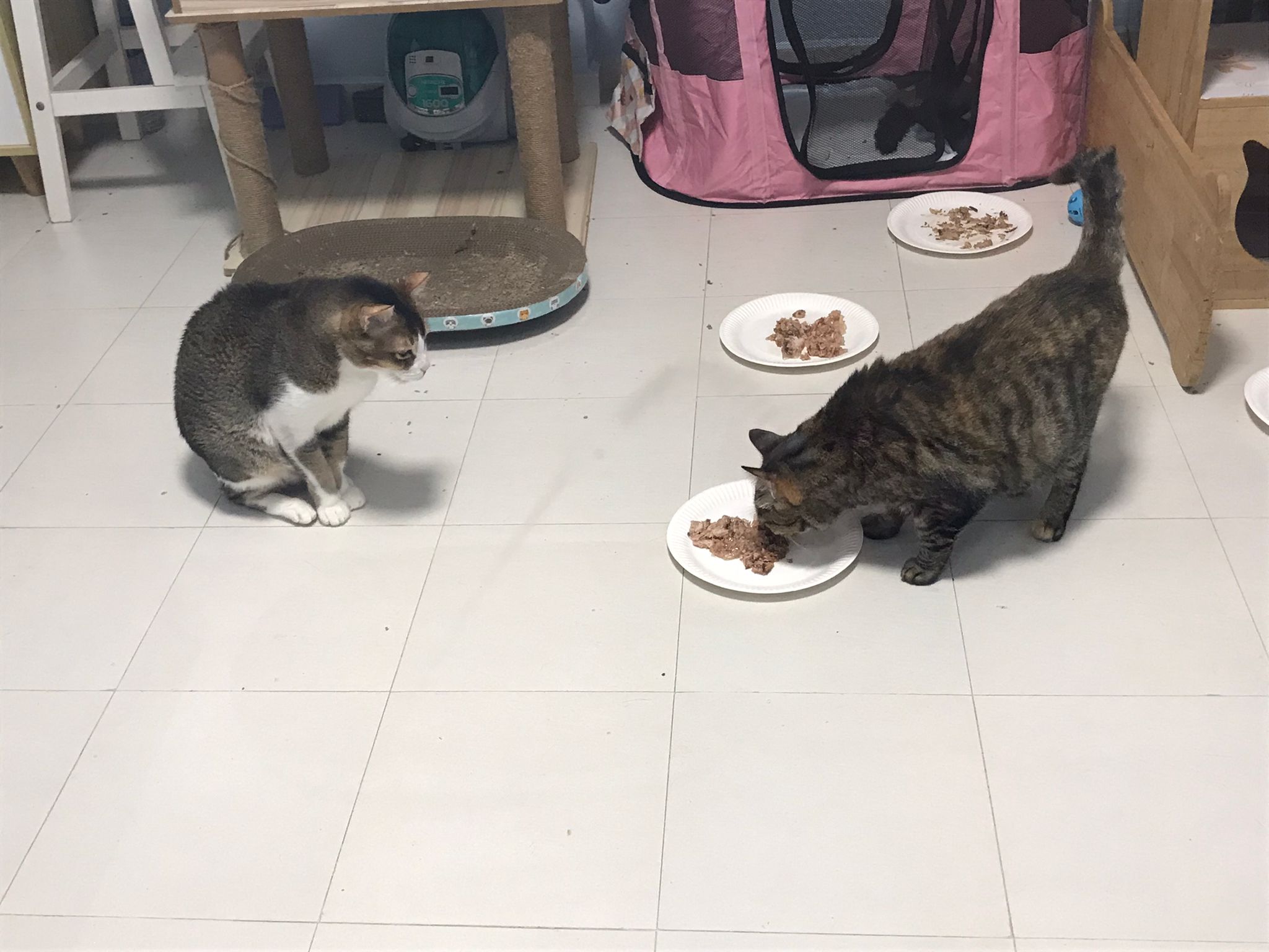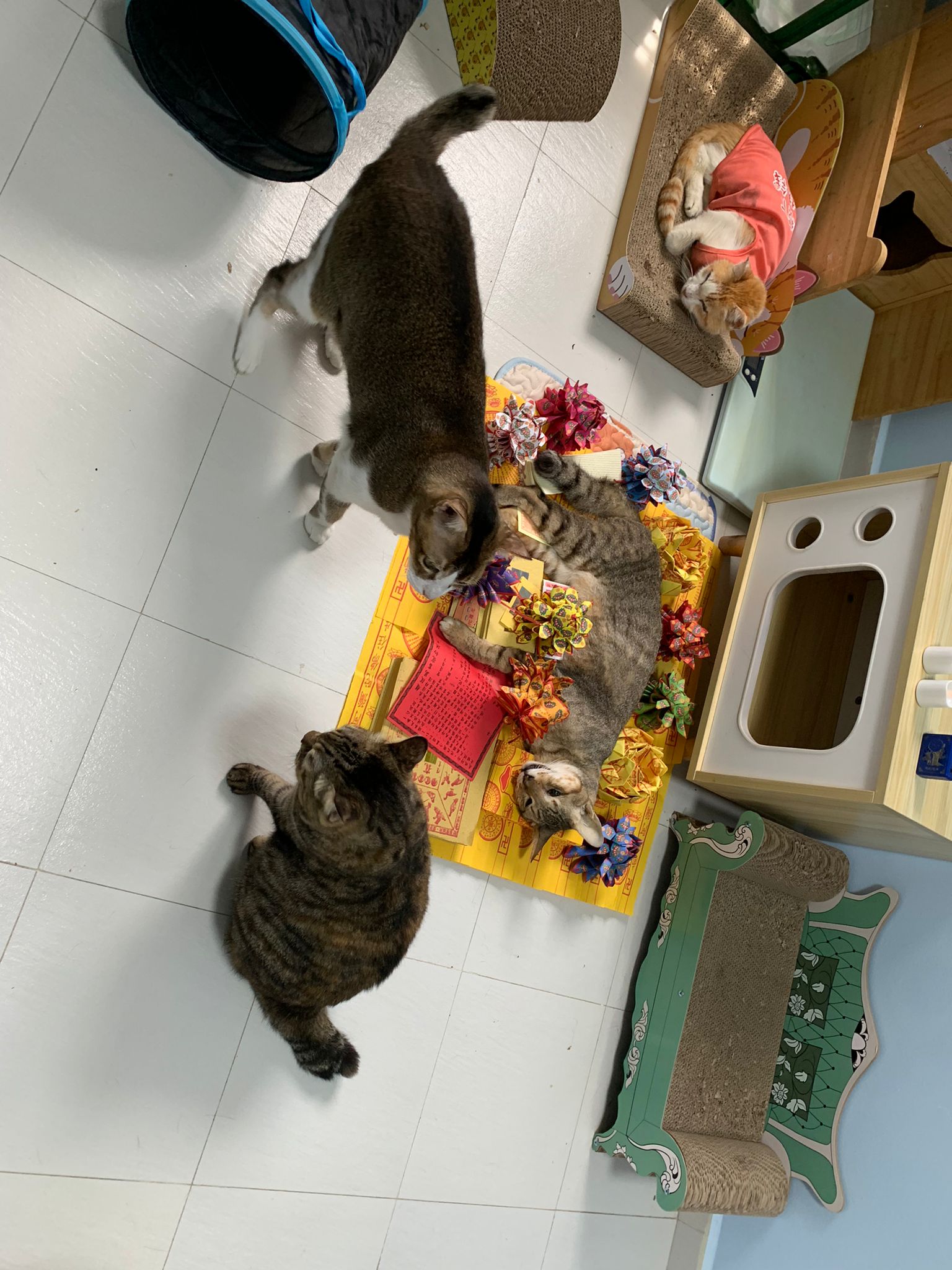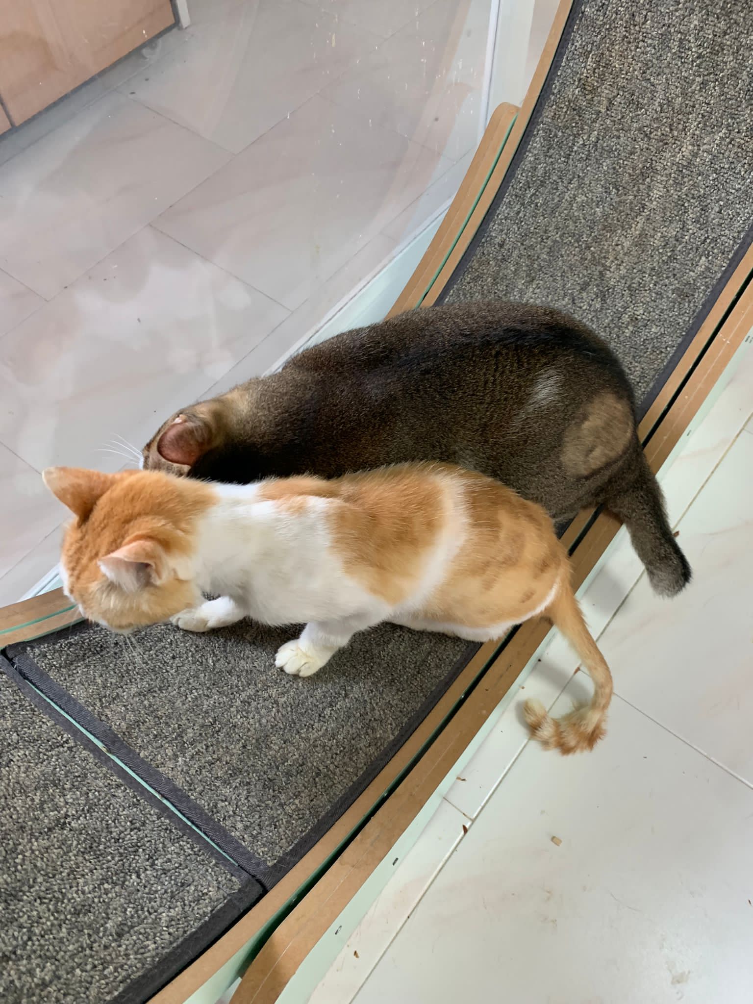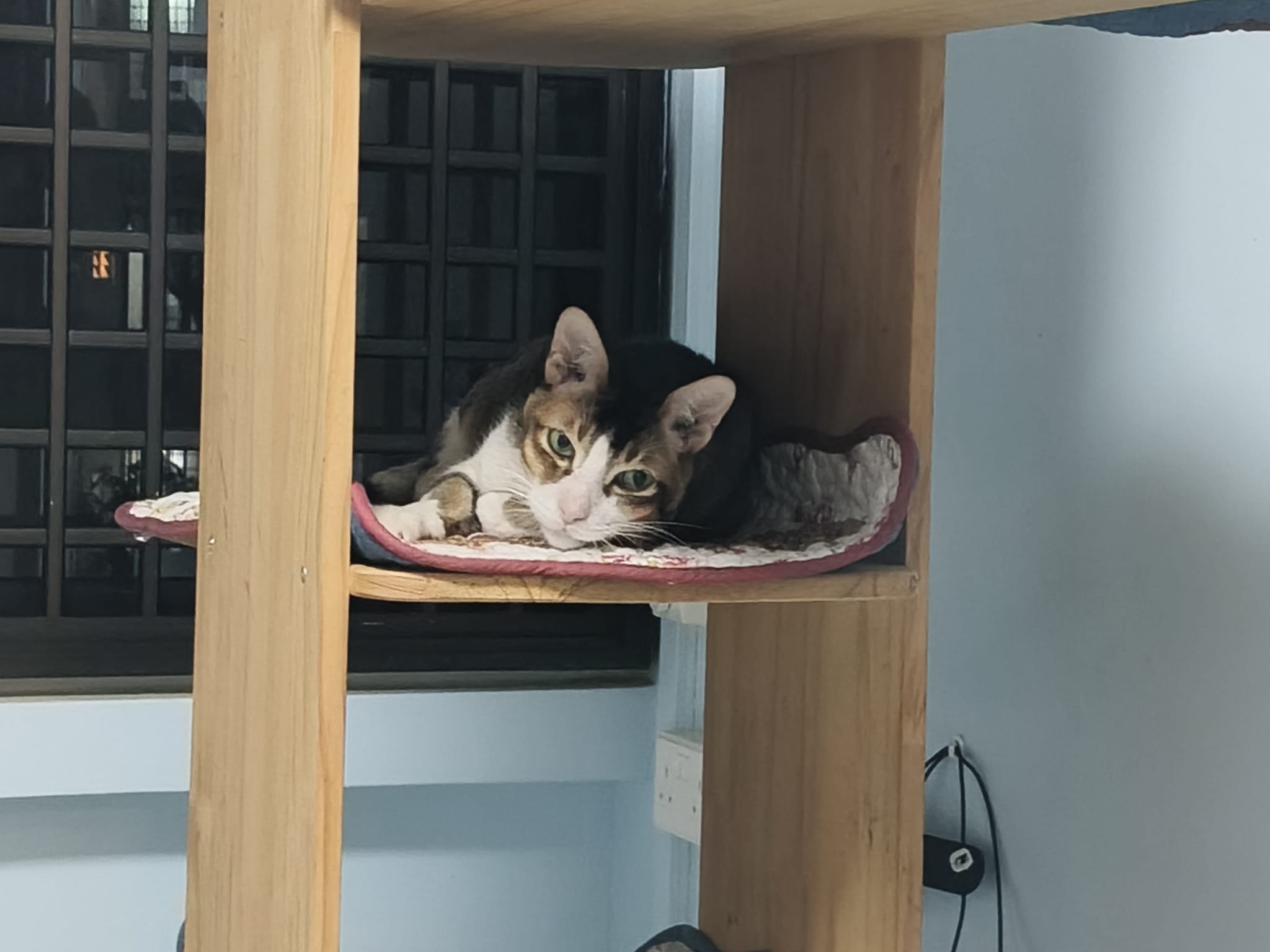 1pm+: I Waited so long their bench delivery not here yet. Today throw half their cat tree away. Rearrange a little. Tmr then give them the bench 🙂