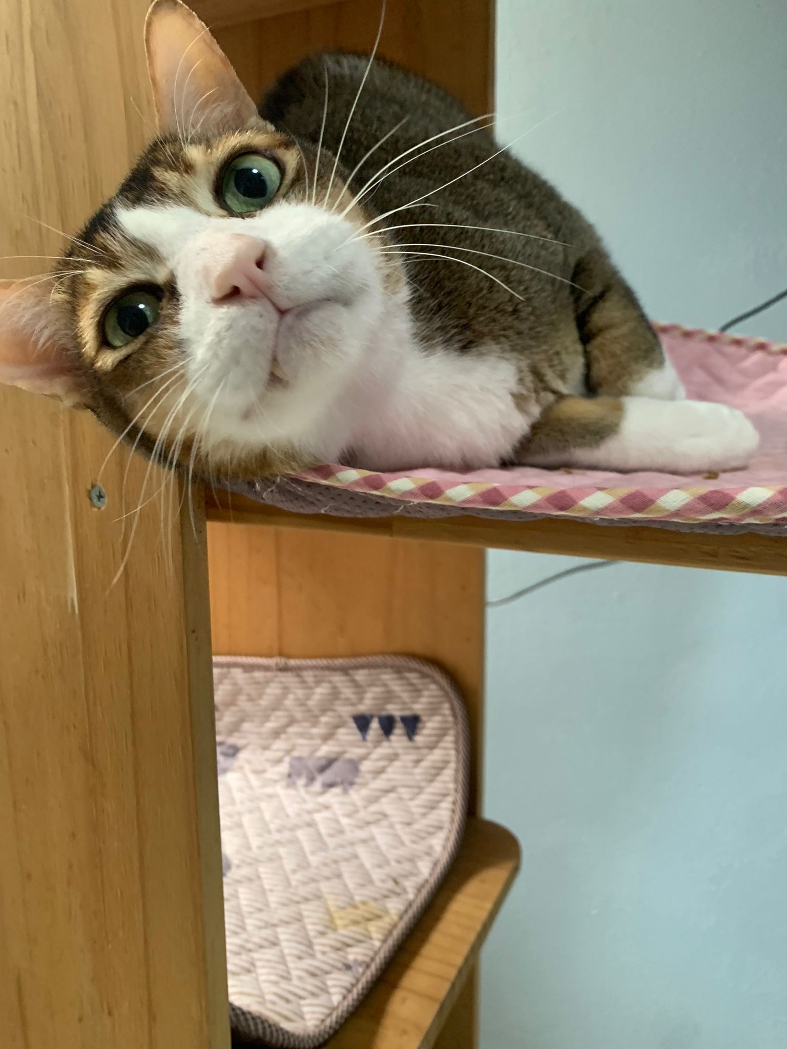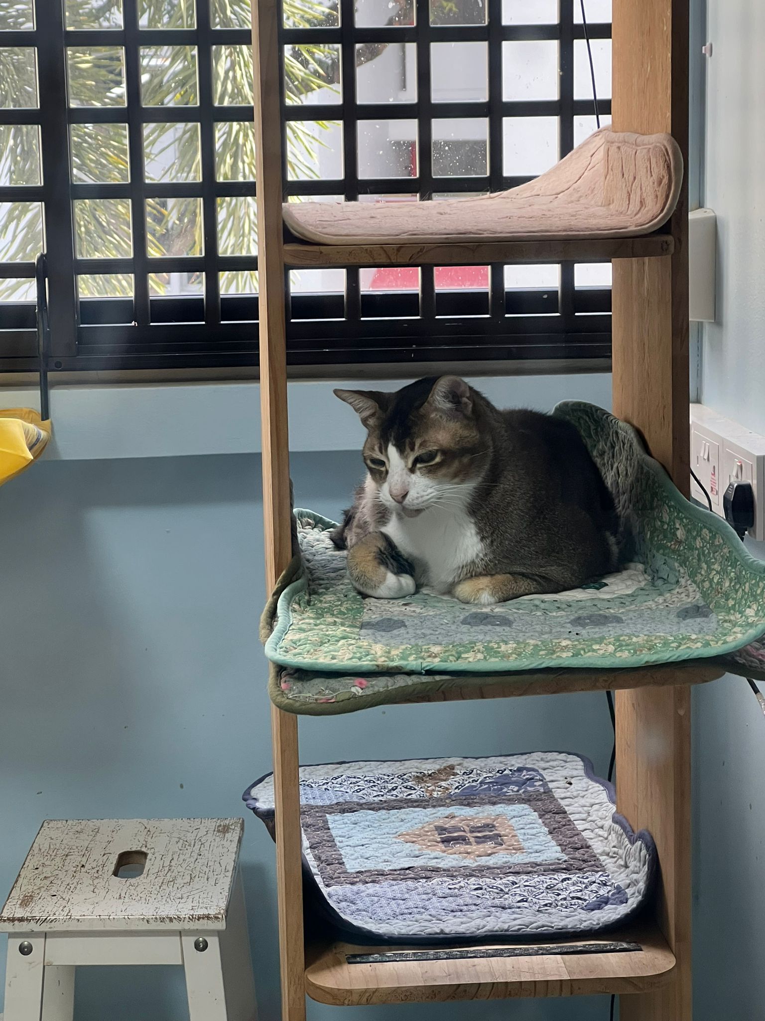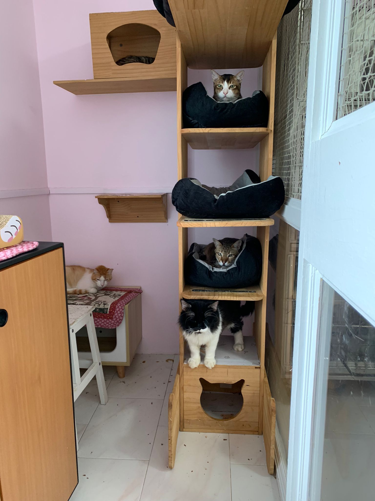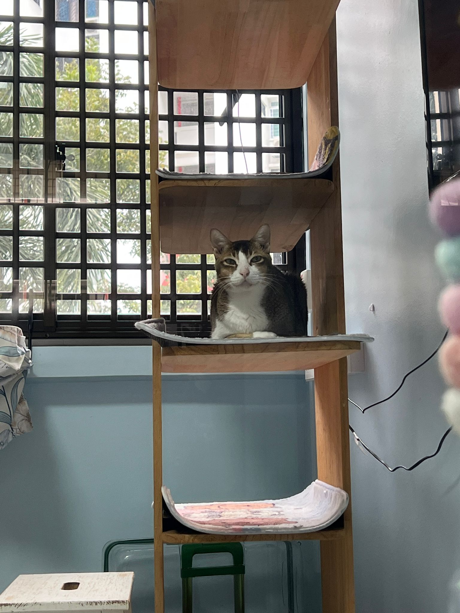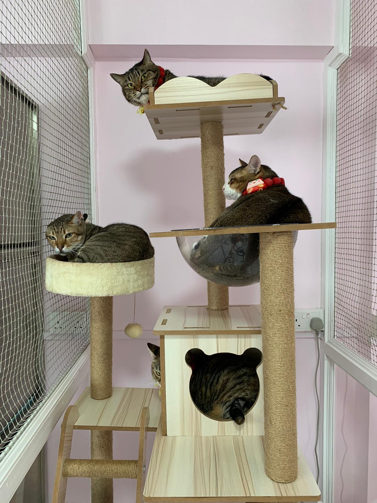1pm+: I Waited so long their bench delivery not here yet. Today throw half their cat tree away. Rearrange a little. Tmr then give them the bench 🙂