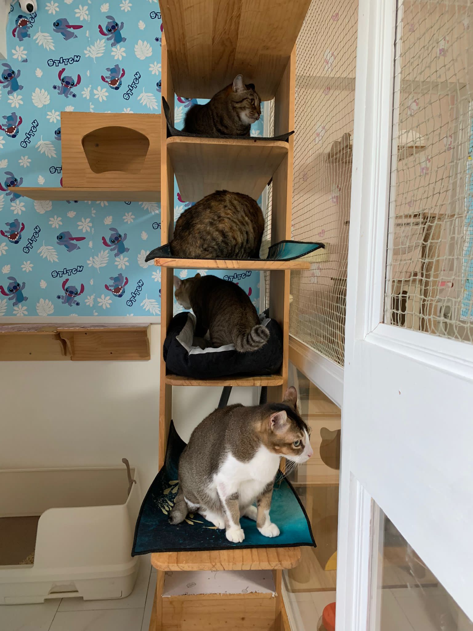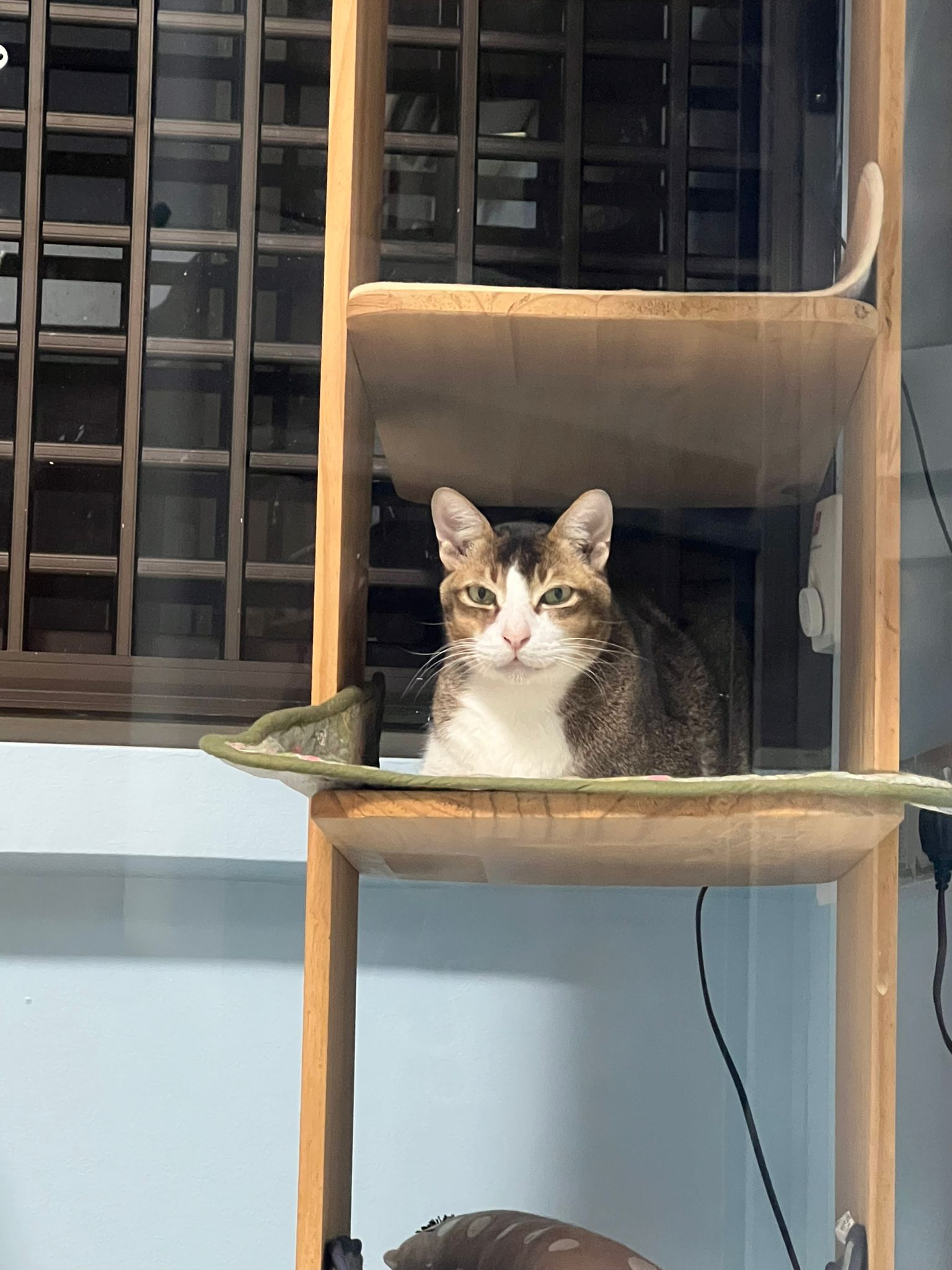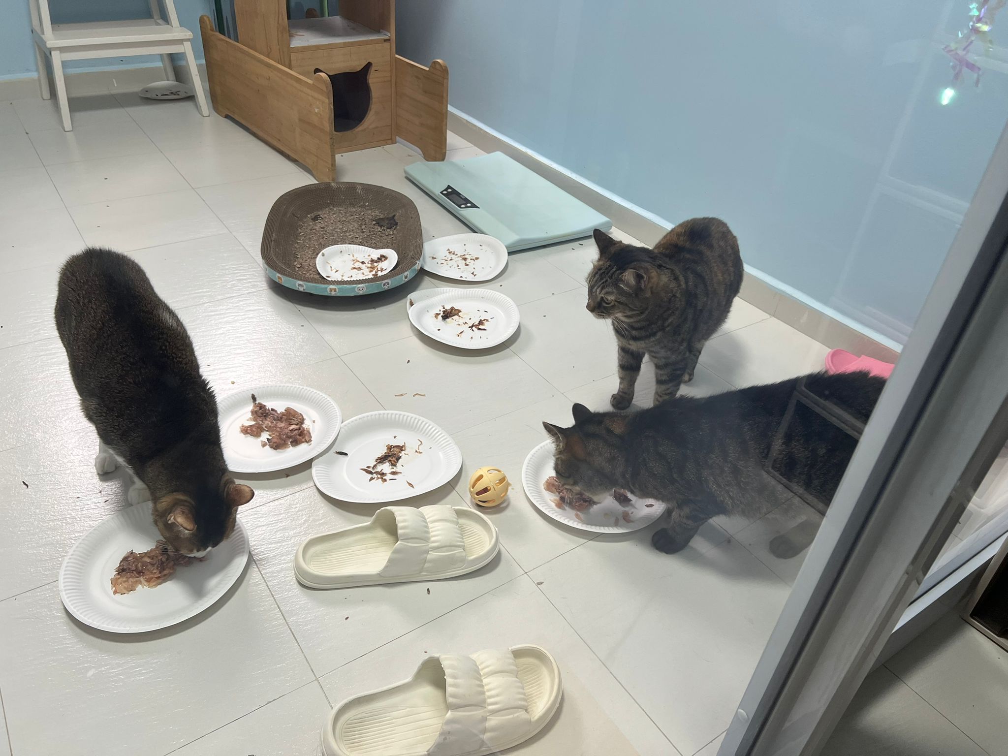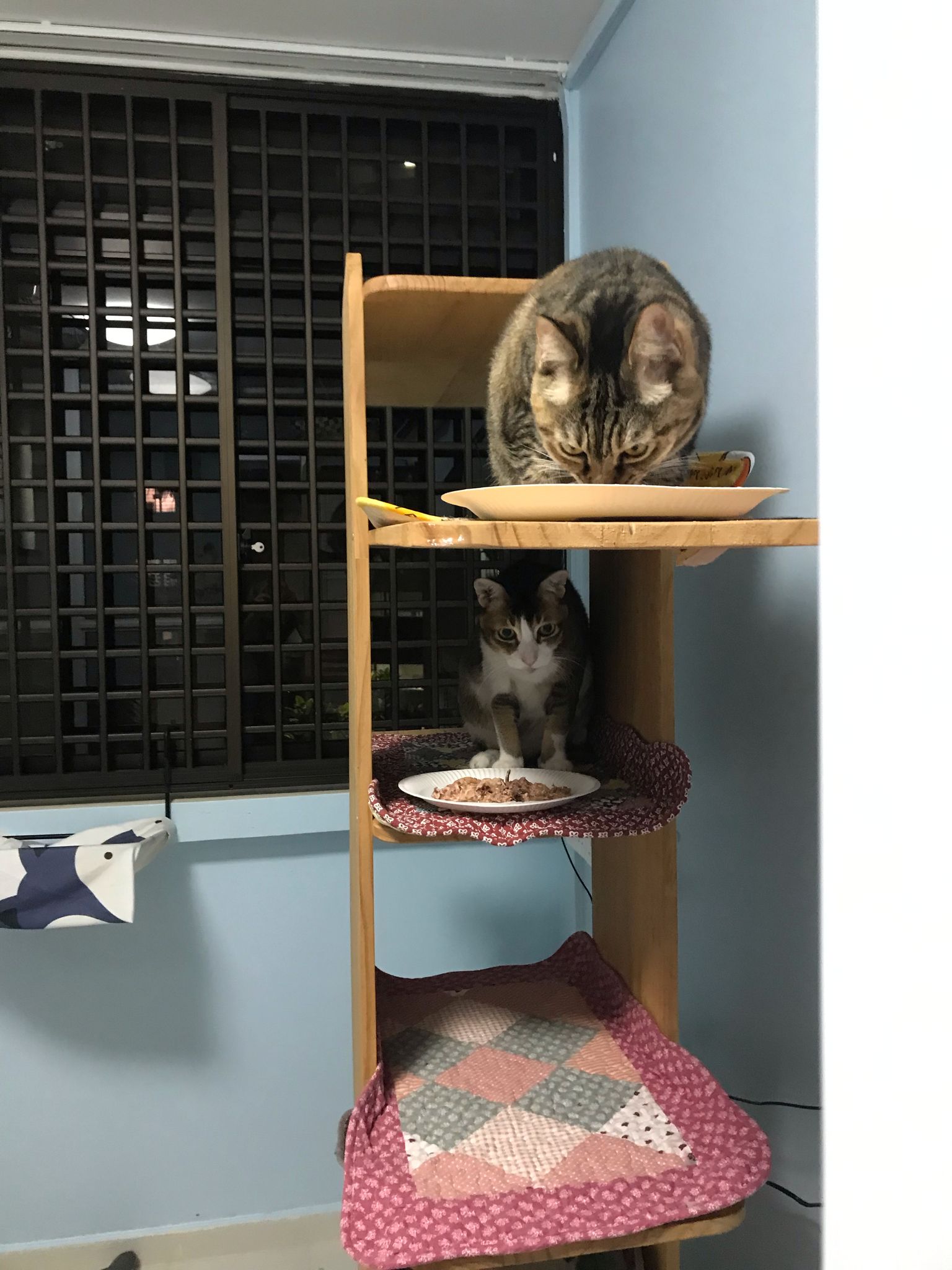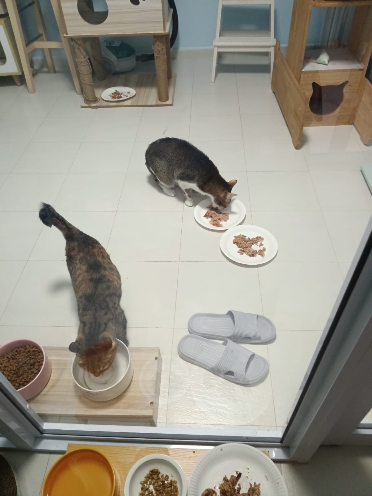 1pm+: I Waited so long their bench delivery not here yet. Today throw half their cat tree away. Rearrange a little. Tmr then give them the bench 🙂