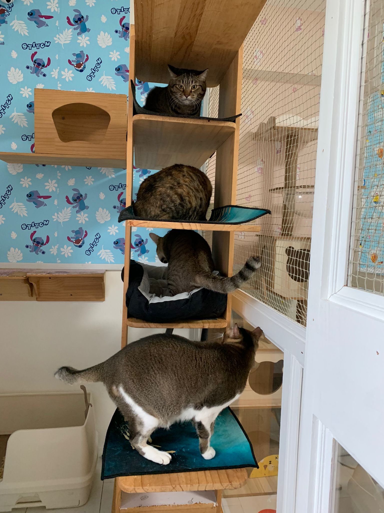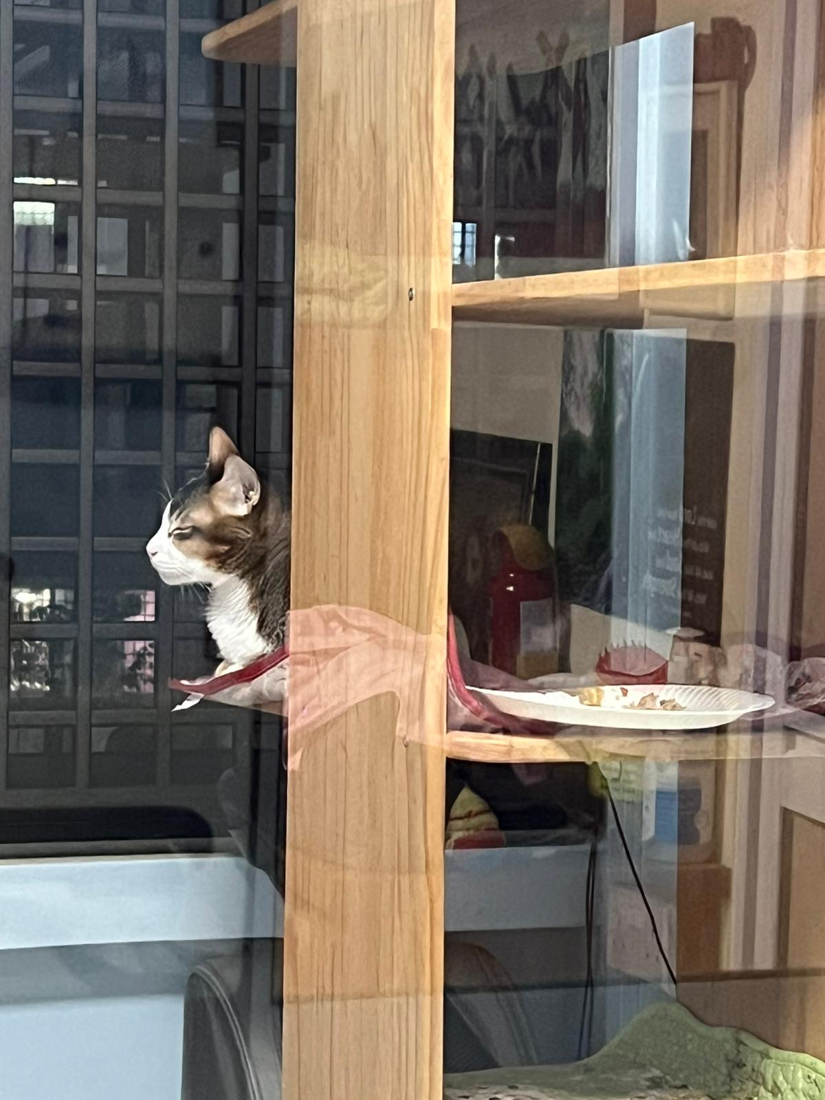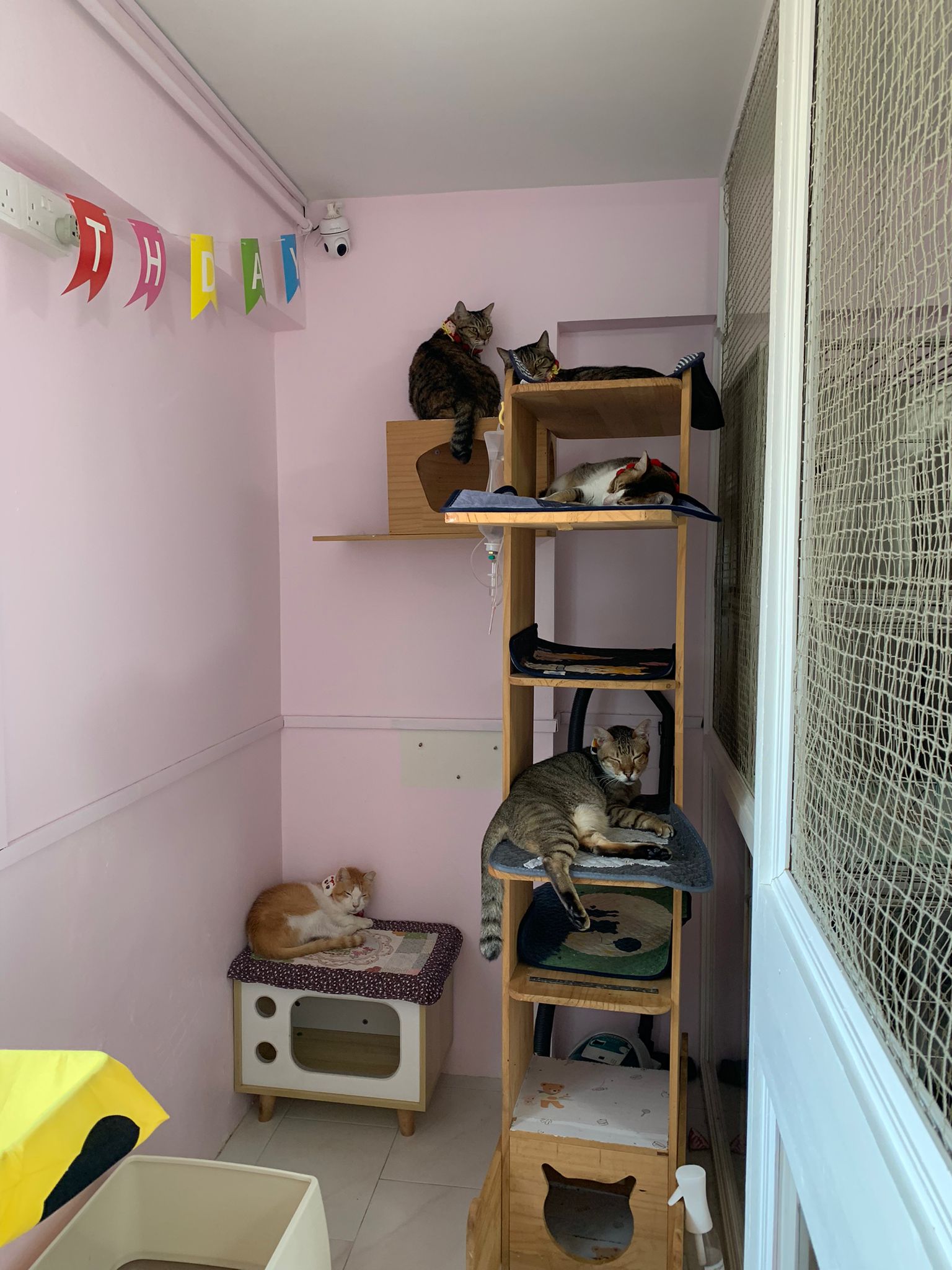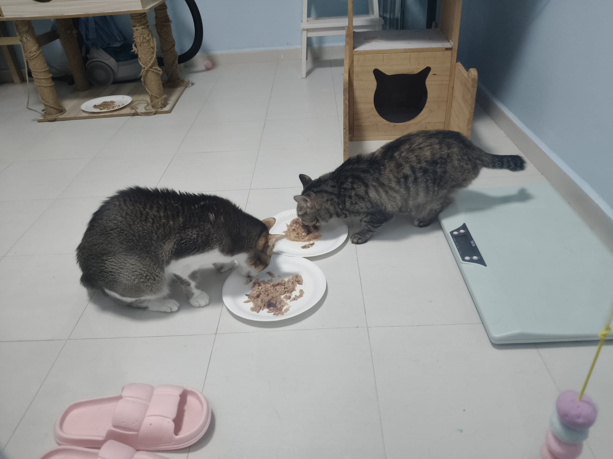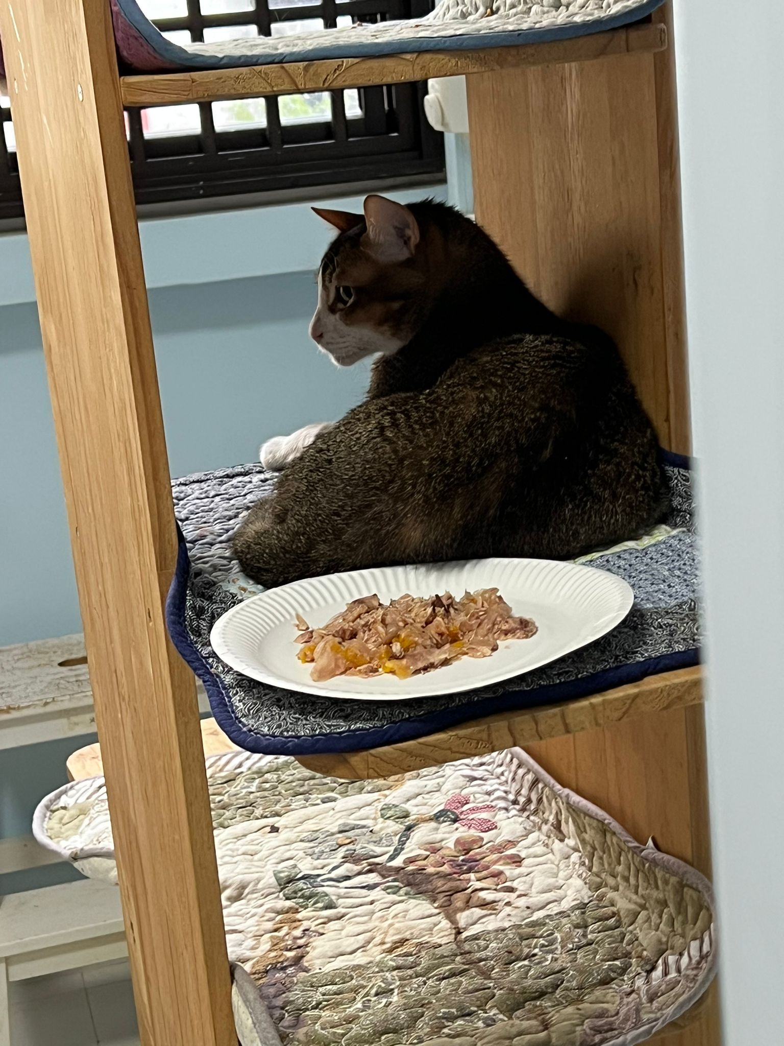 1pm+: I Waited so long their bench delivery not here yet. Today throw half their cat tree away. Rearrange a little. Tmr then give them the bench 🙂