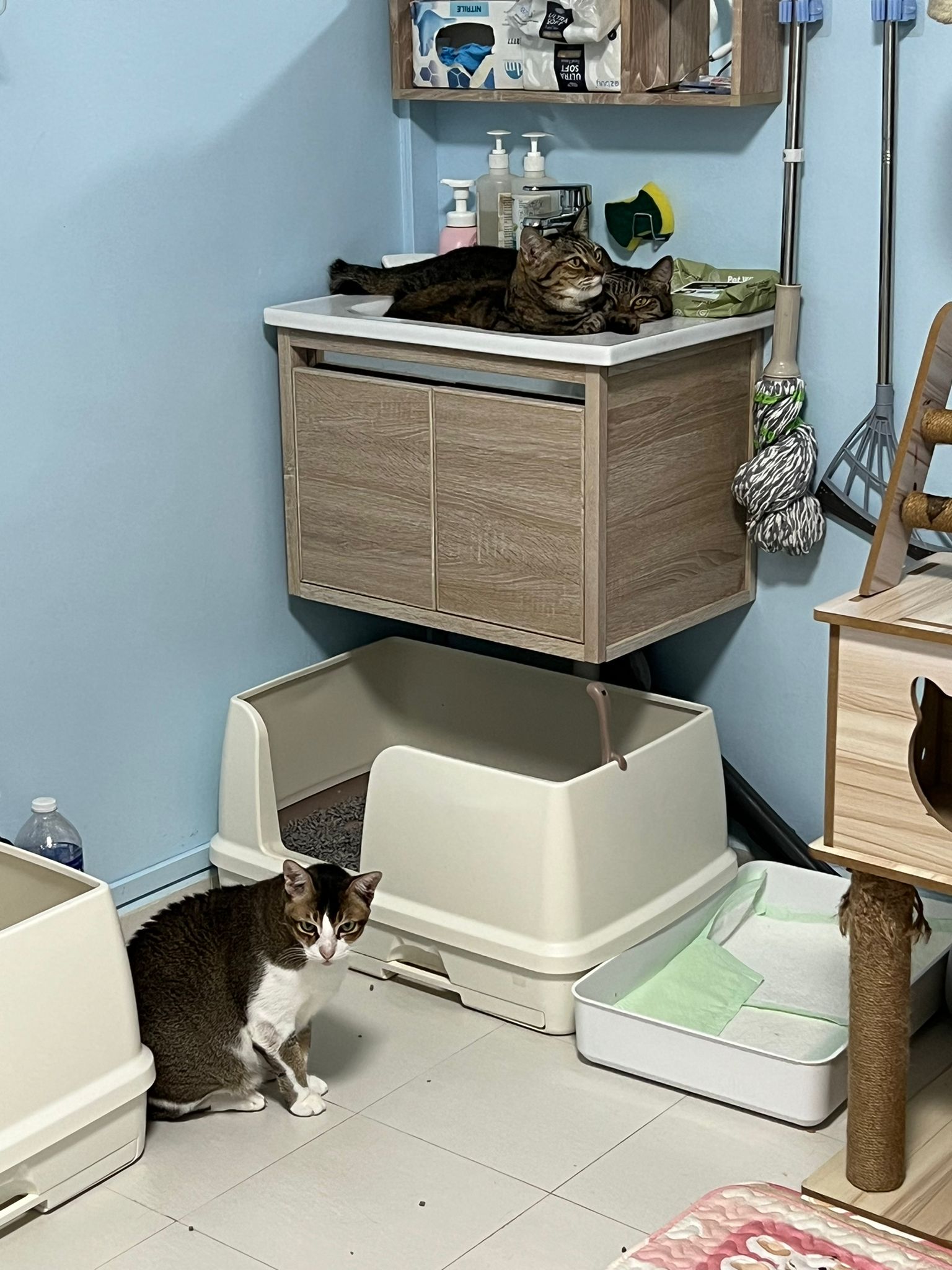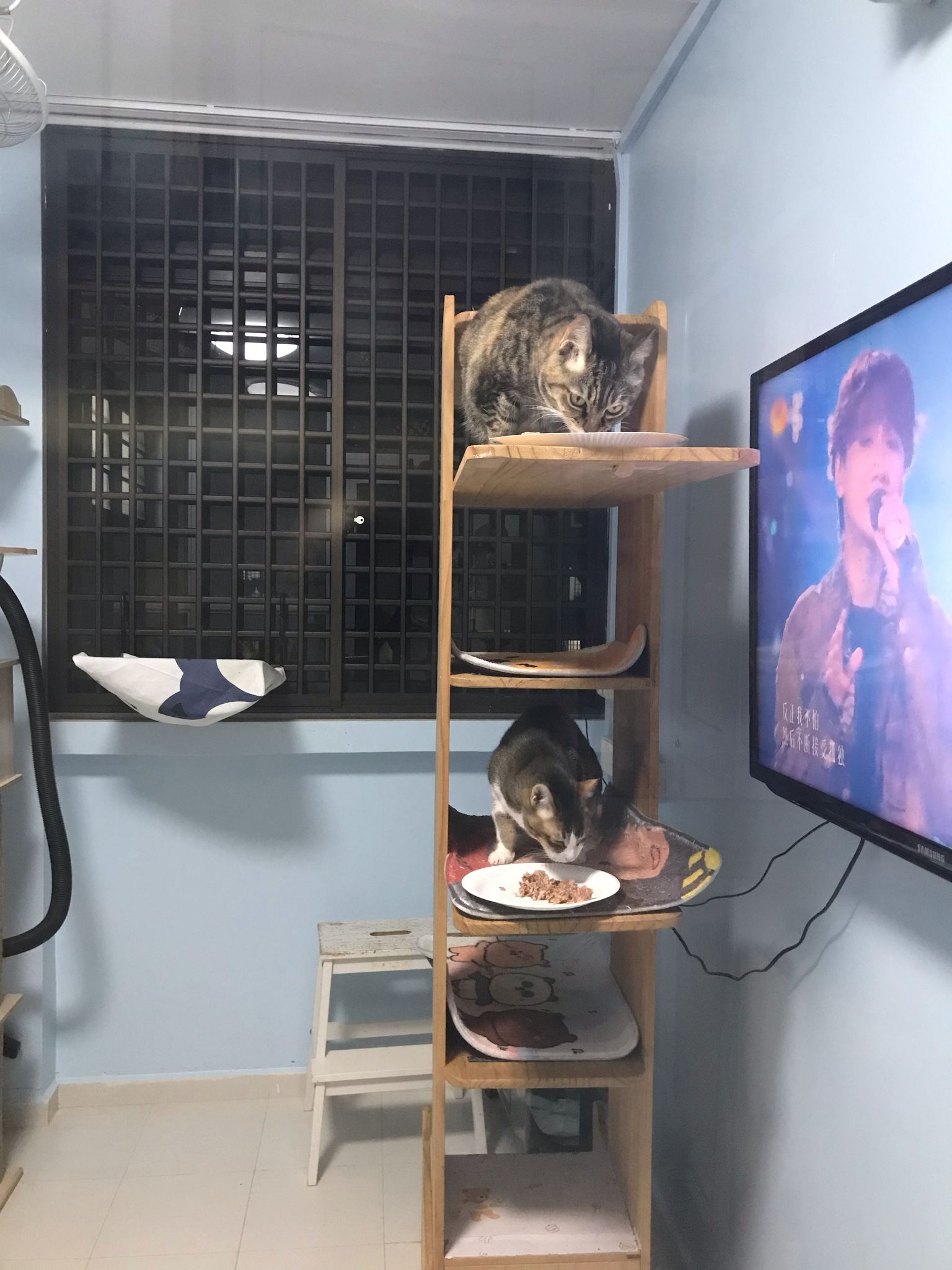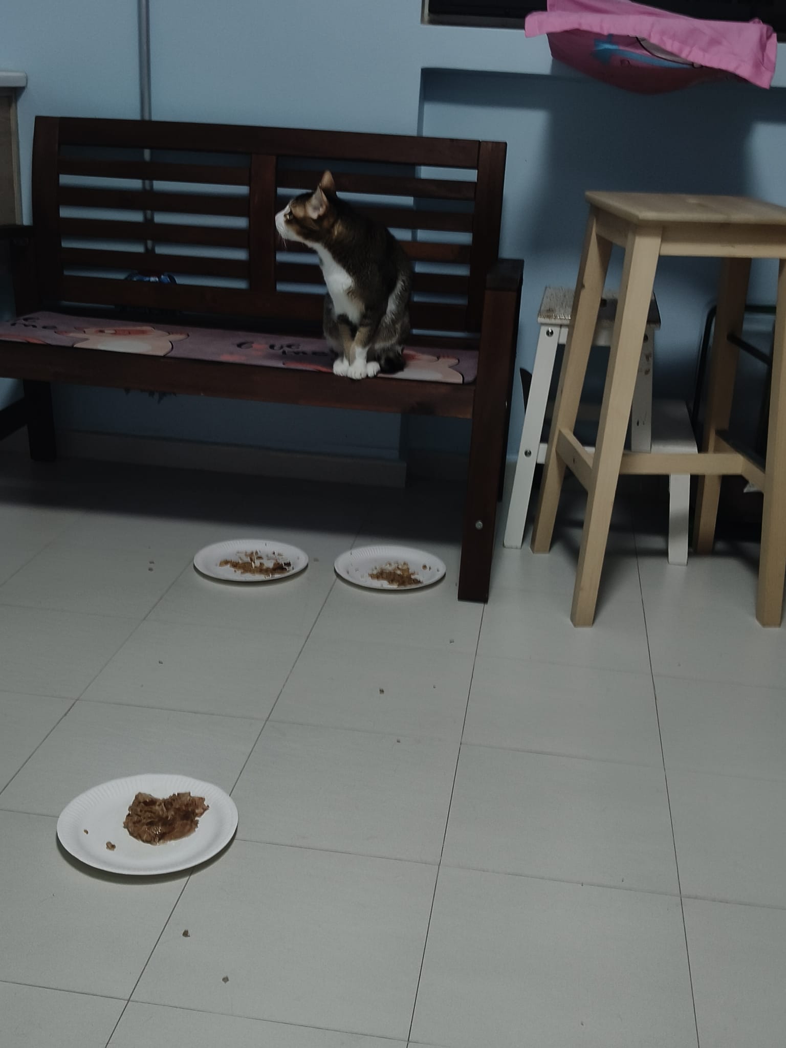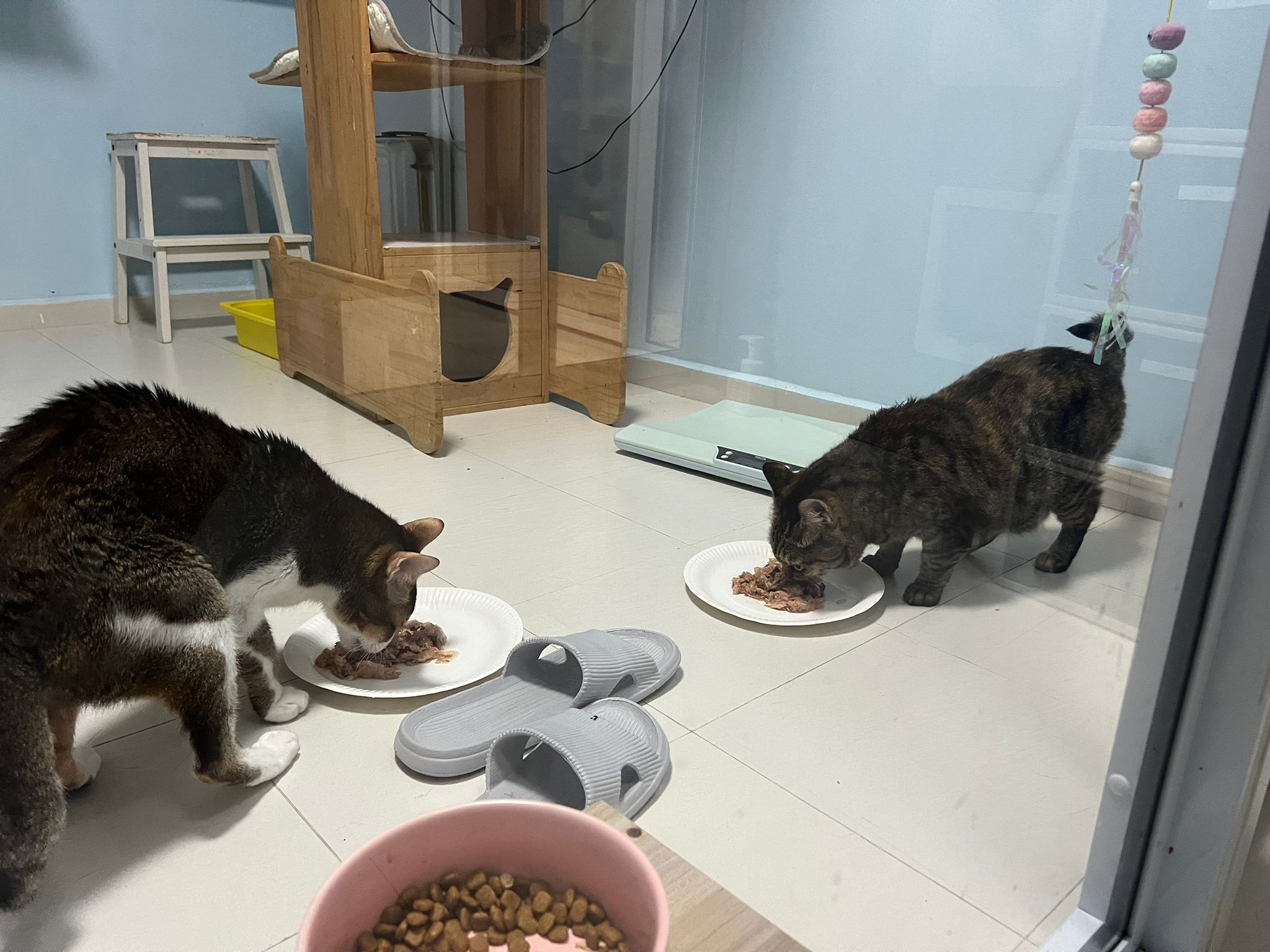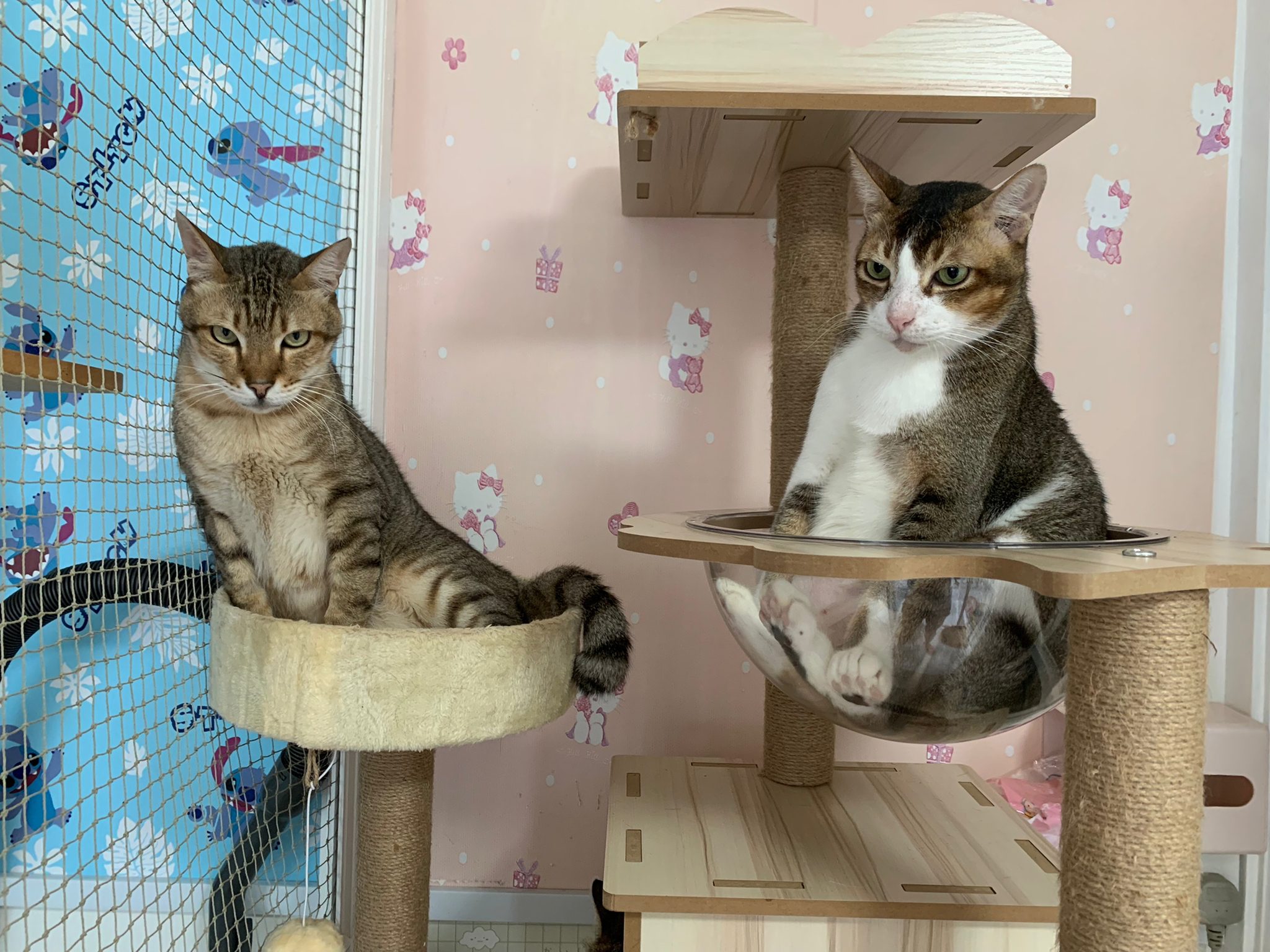 1pm+: I Waited so long their bench delivery not here yet. Today throw half their cat tree away. Rearrange a little. Tmr then give them the bench 🙂