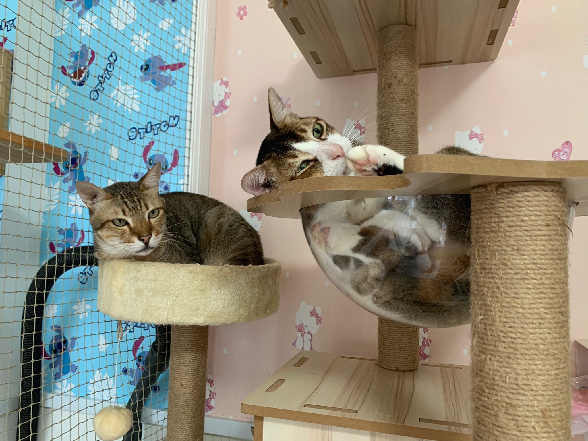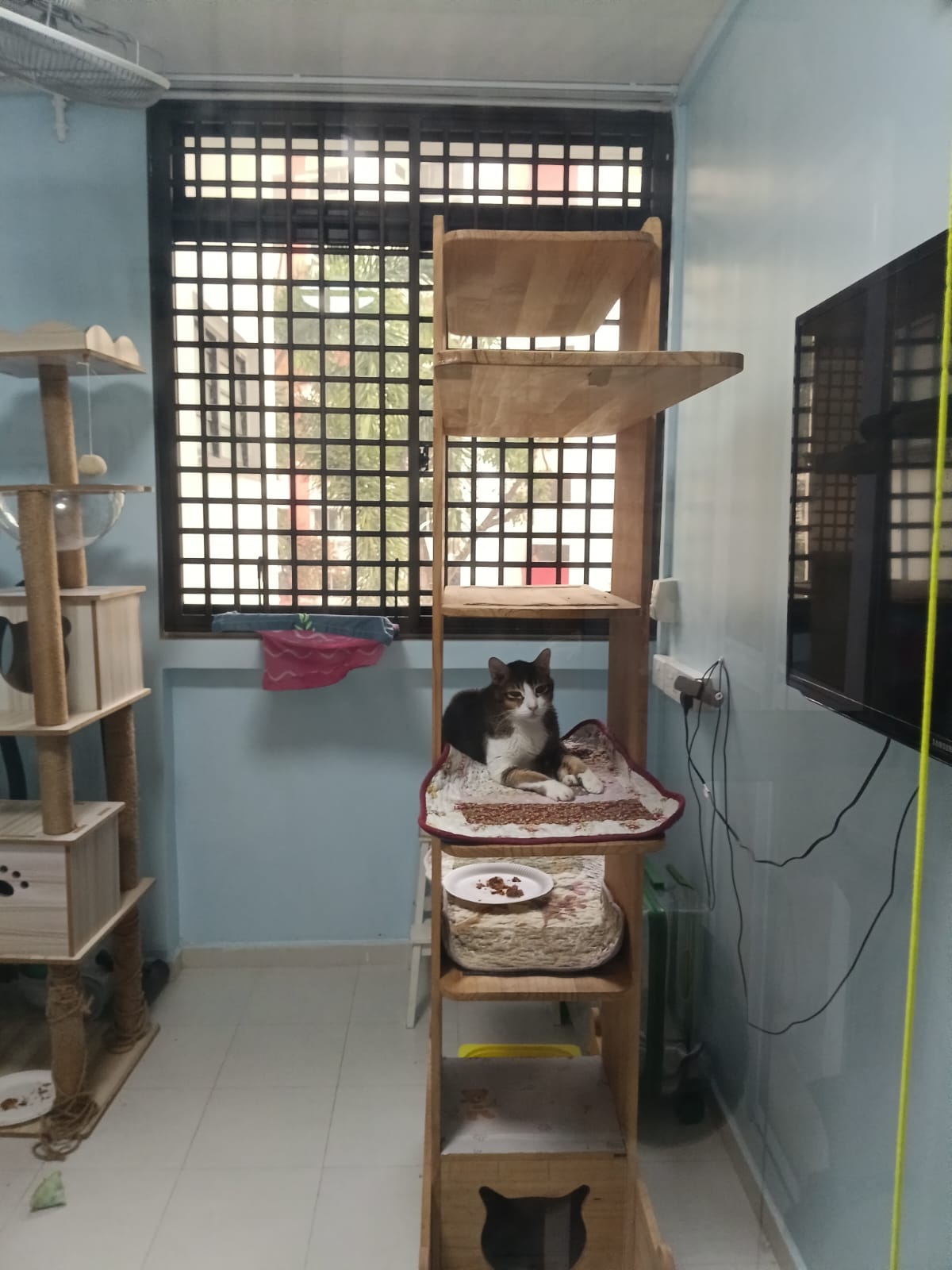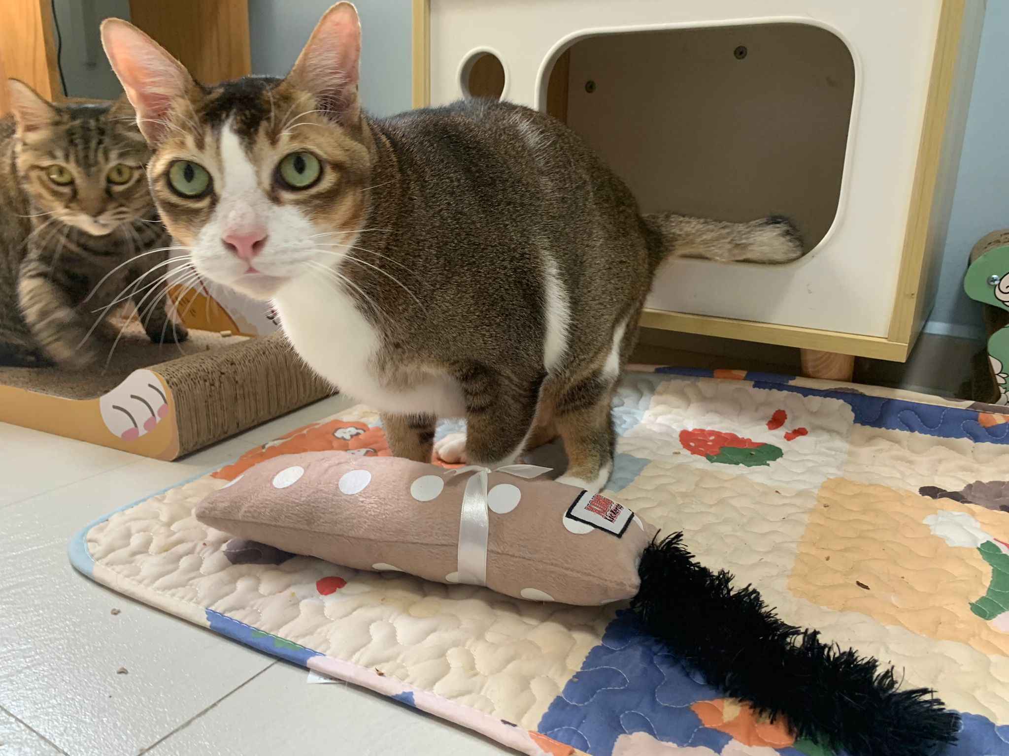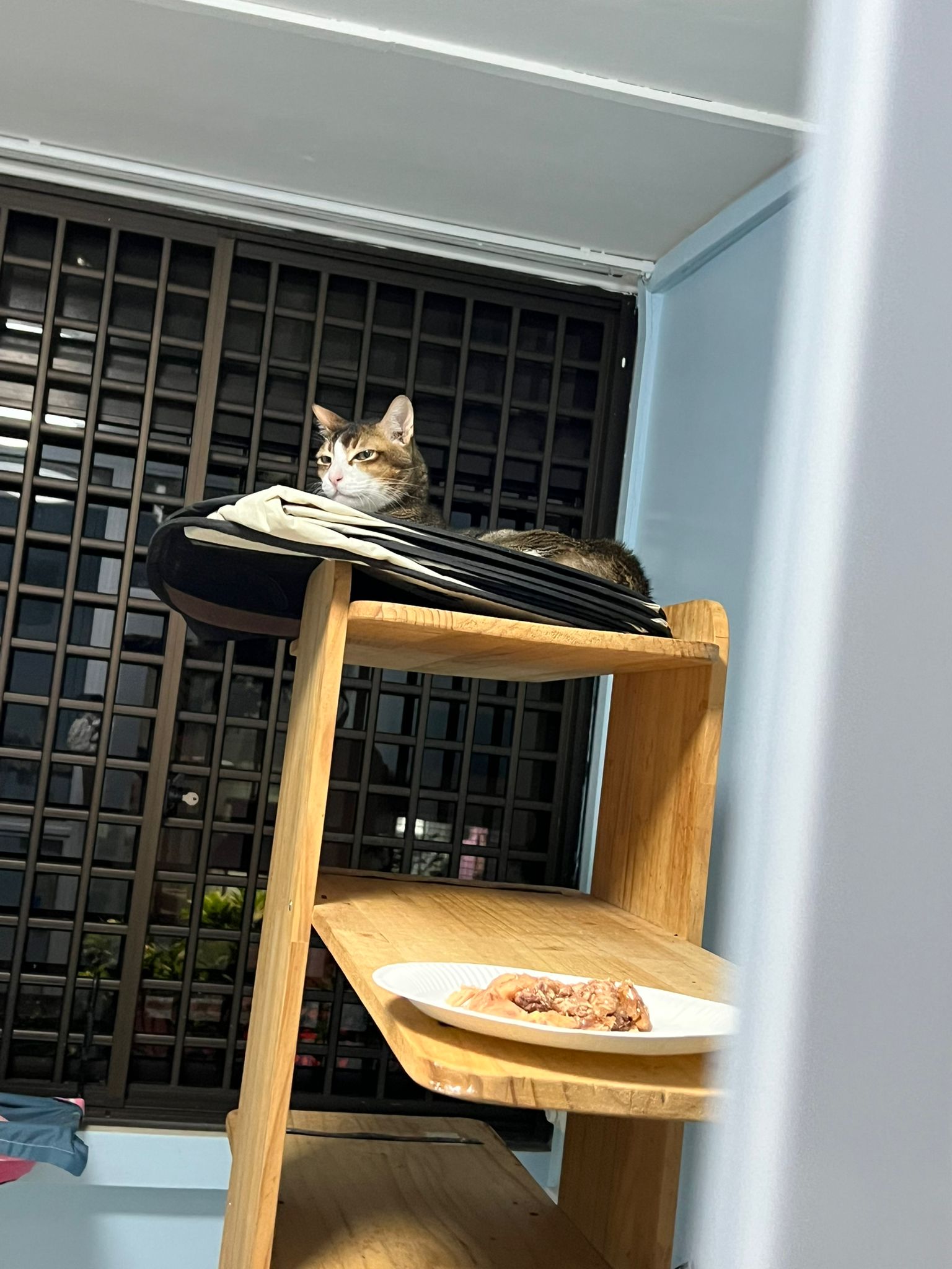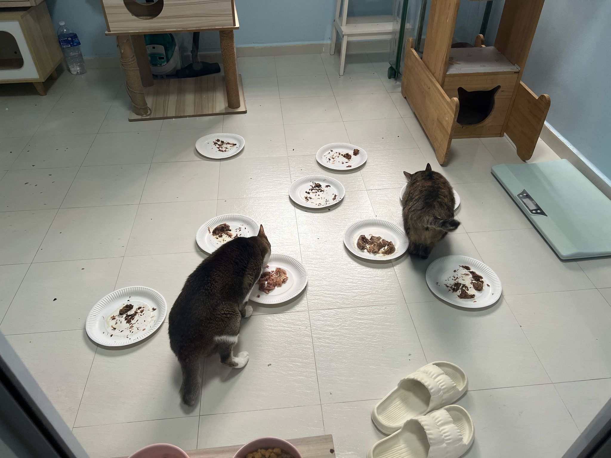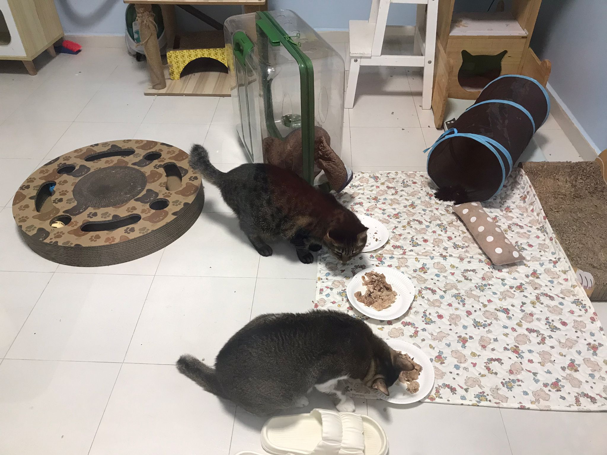 1pm+: I Waited so long their bench delivery not here yet. Today throw half their cat tree away. Rearrange a little. Tmr then give them the bench 🙂
