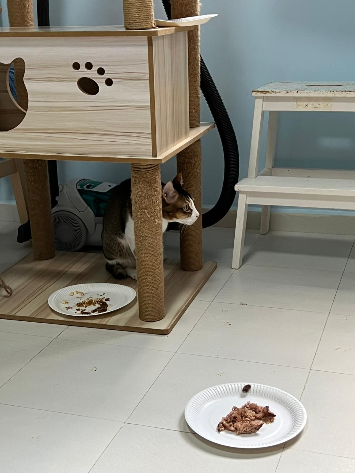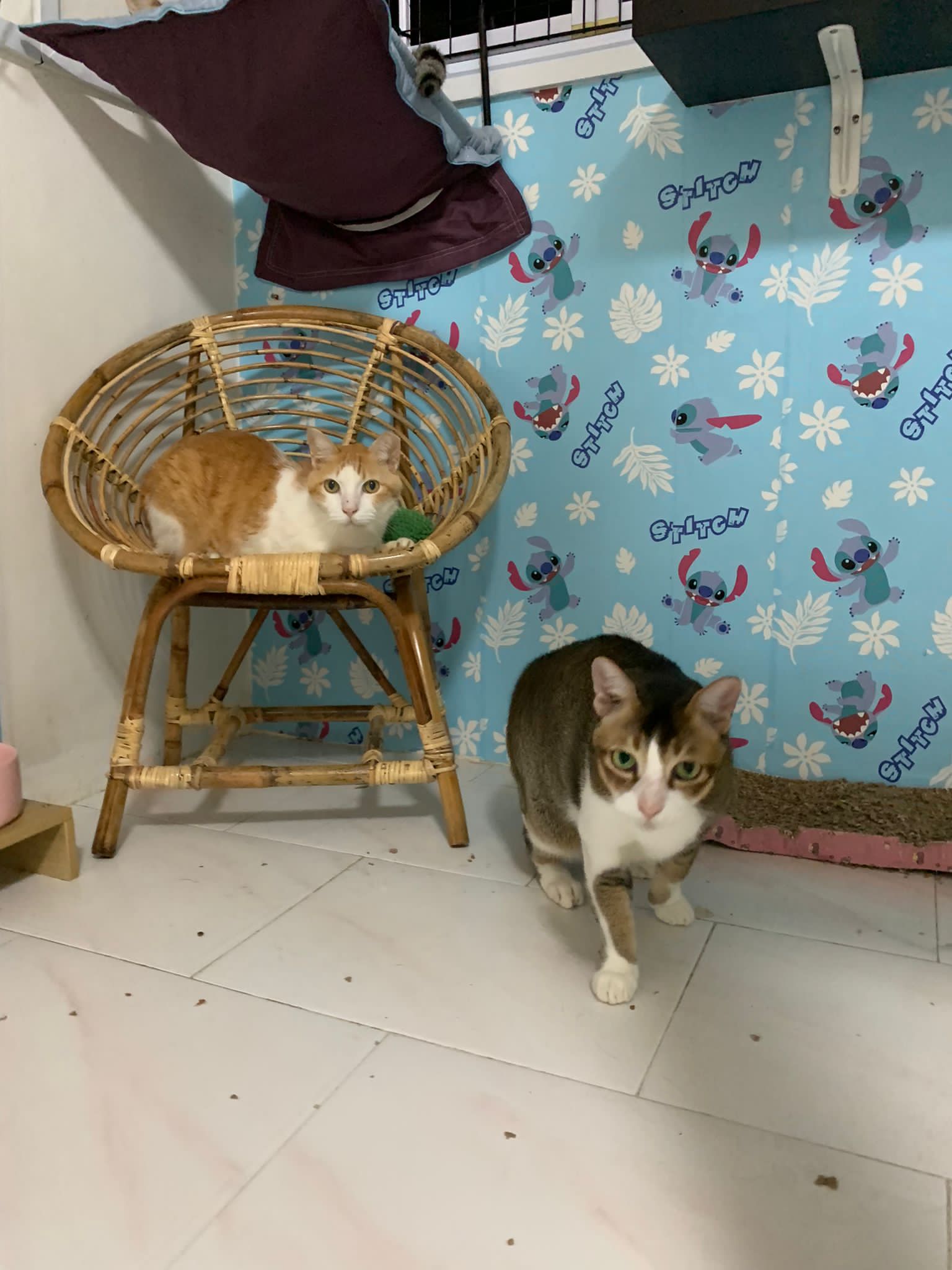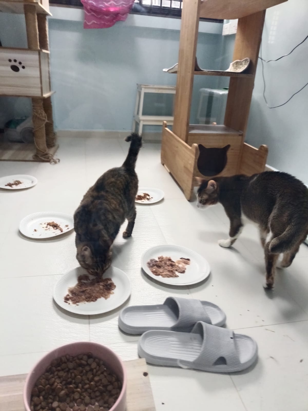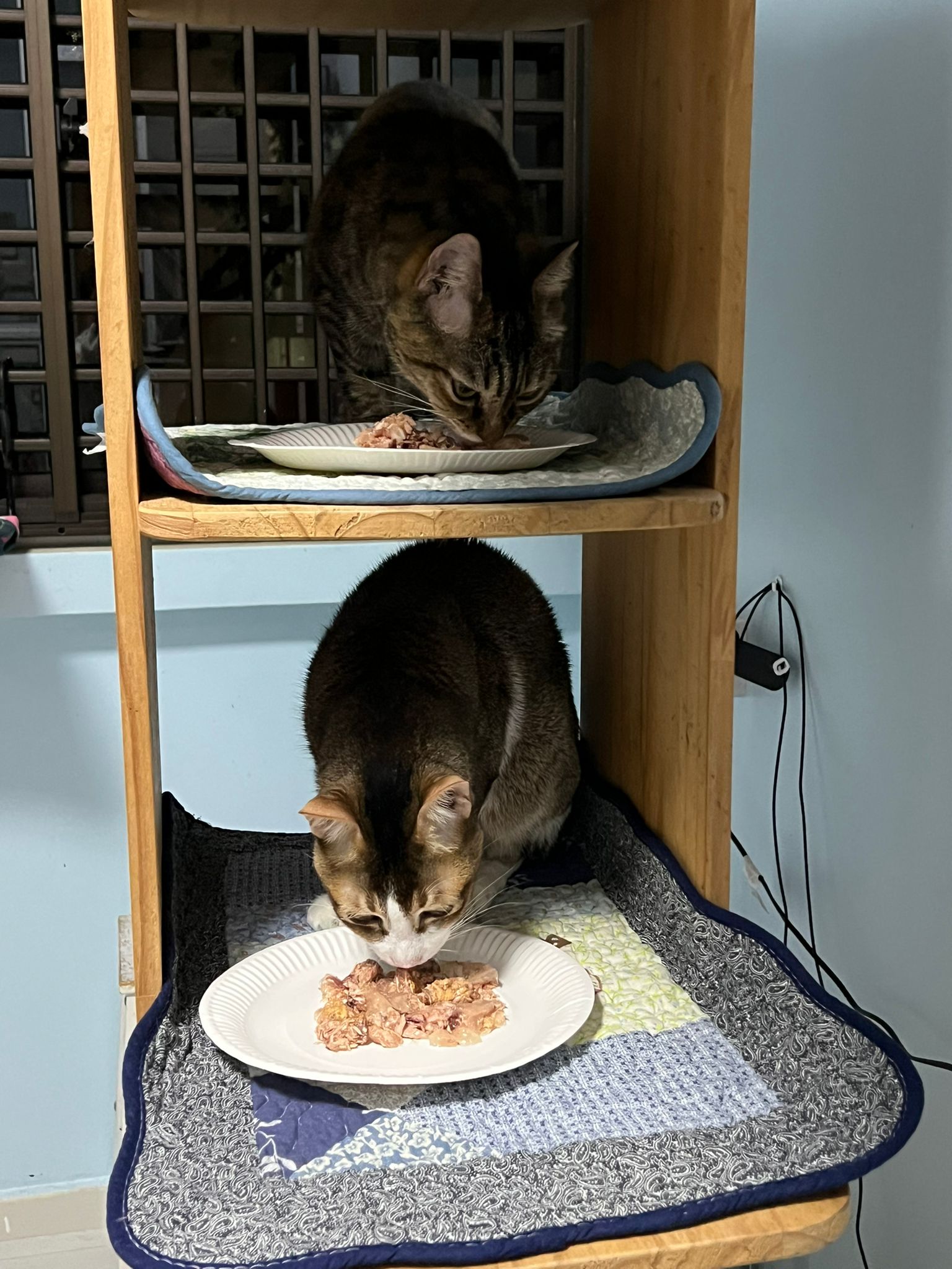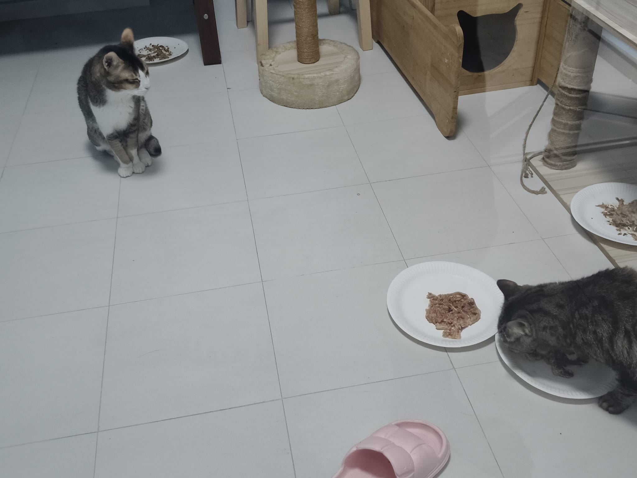 1pm+: I Waited so long their bench delivery not here yet. Today throw half their cat tree away. Rearrange a little. Tmr then give them the bench 🙂