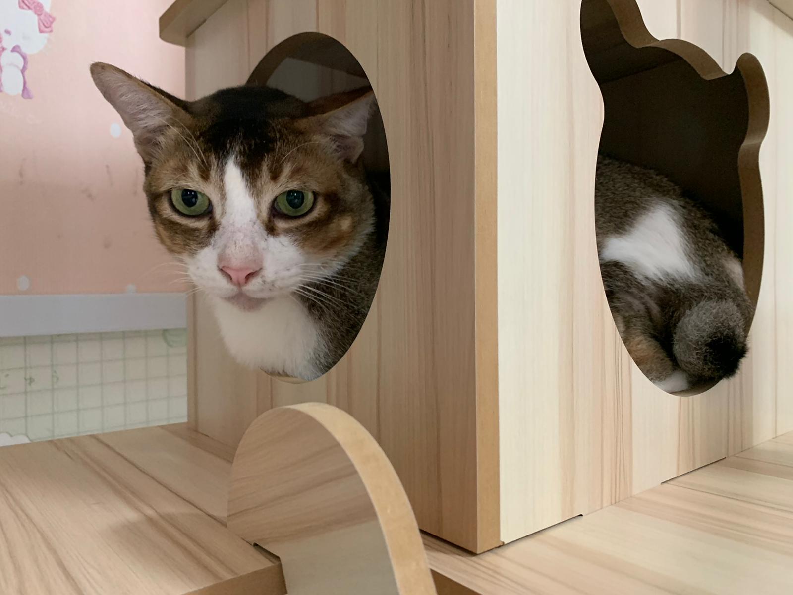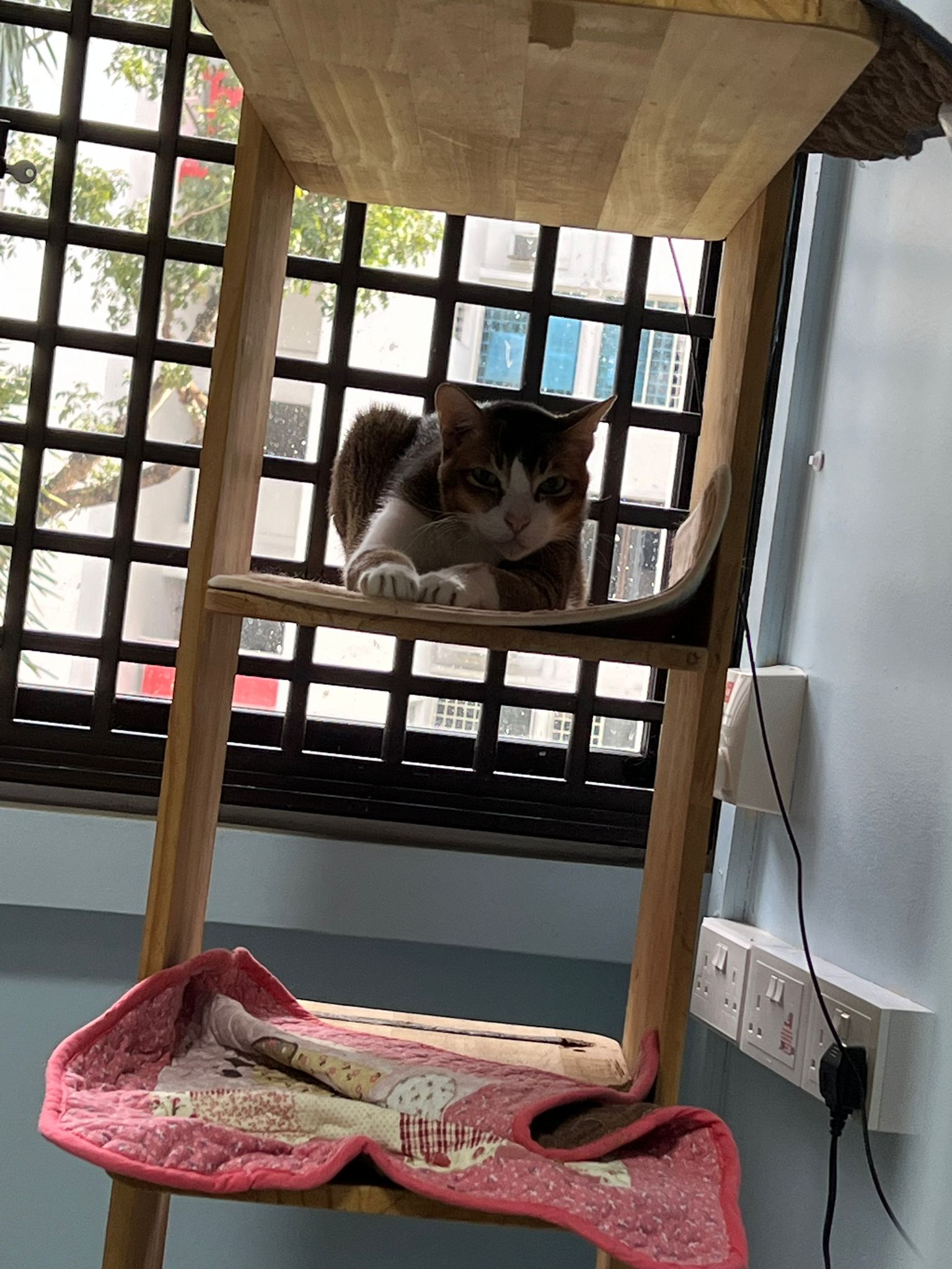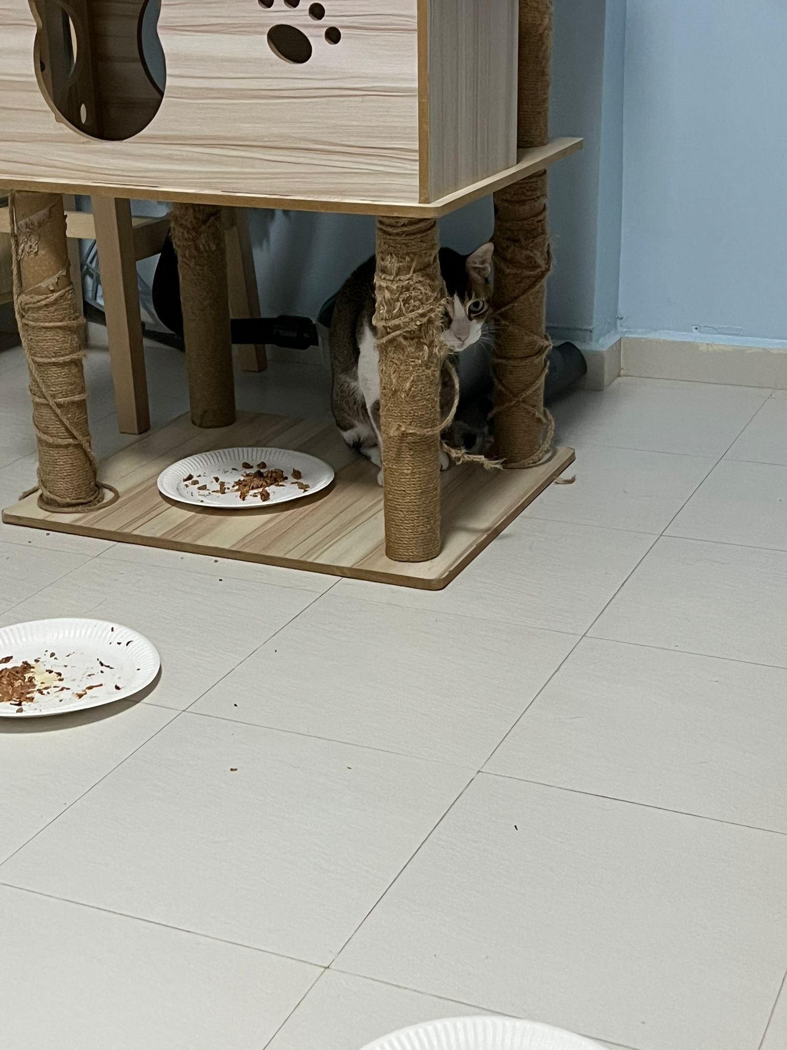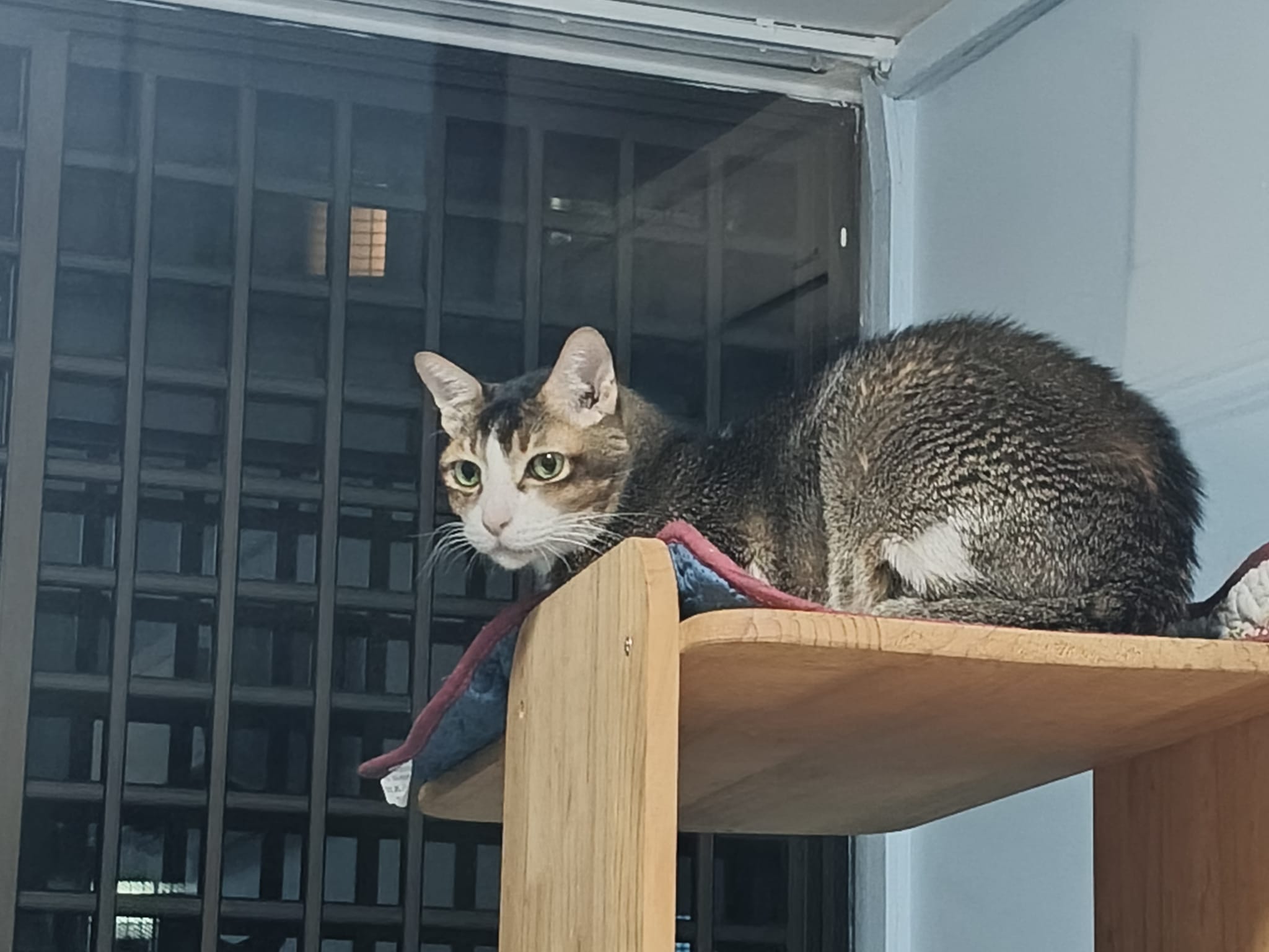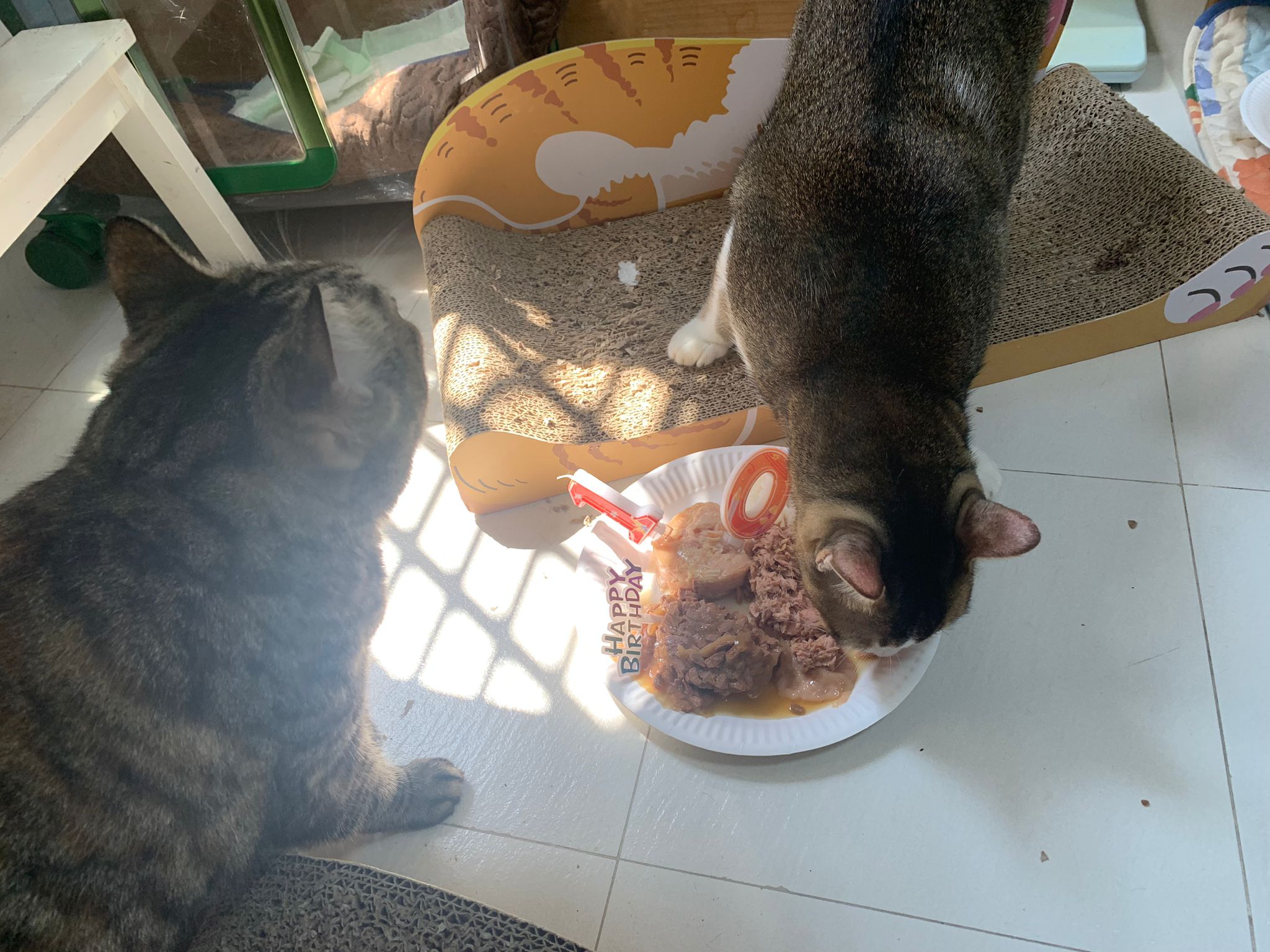 1pm+: I Waited so long their bench delivery not here yet. Today throw half their cat tree away. Rearrange a little. Tmr then give them the bench 🙂