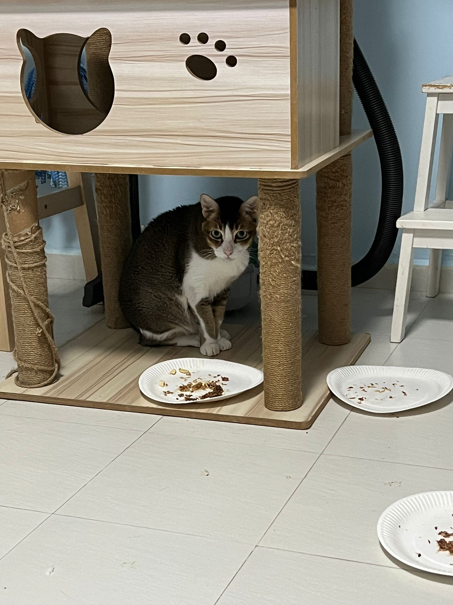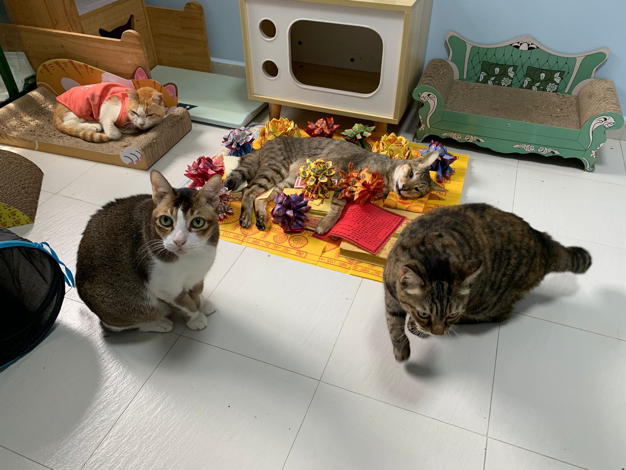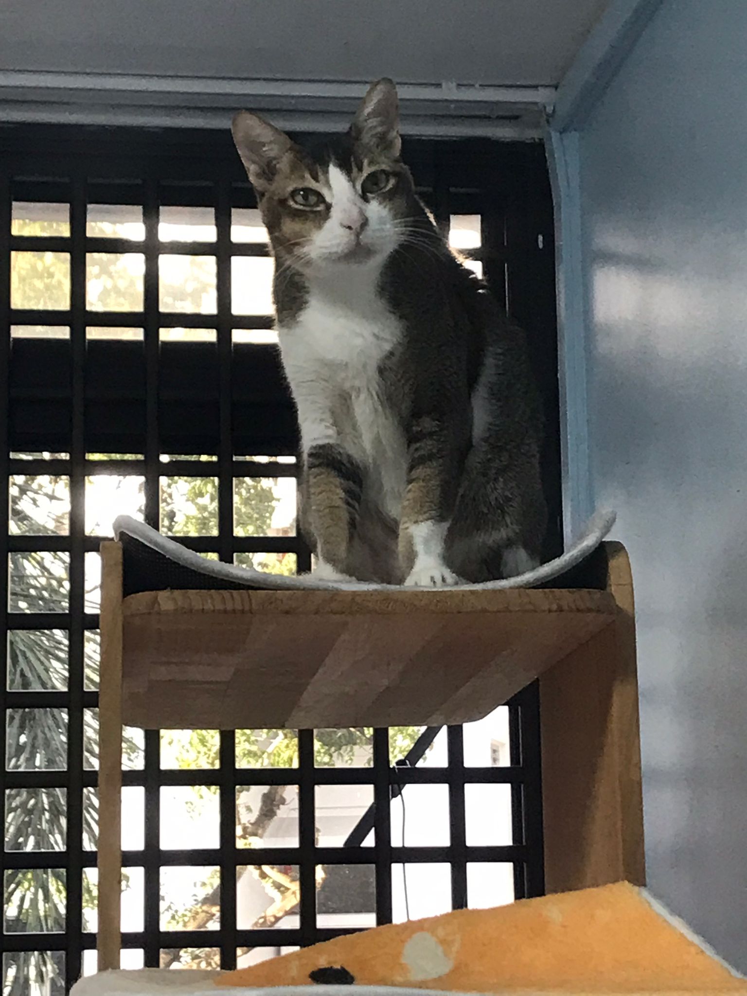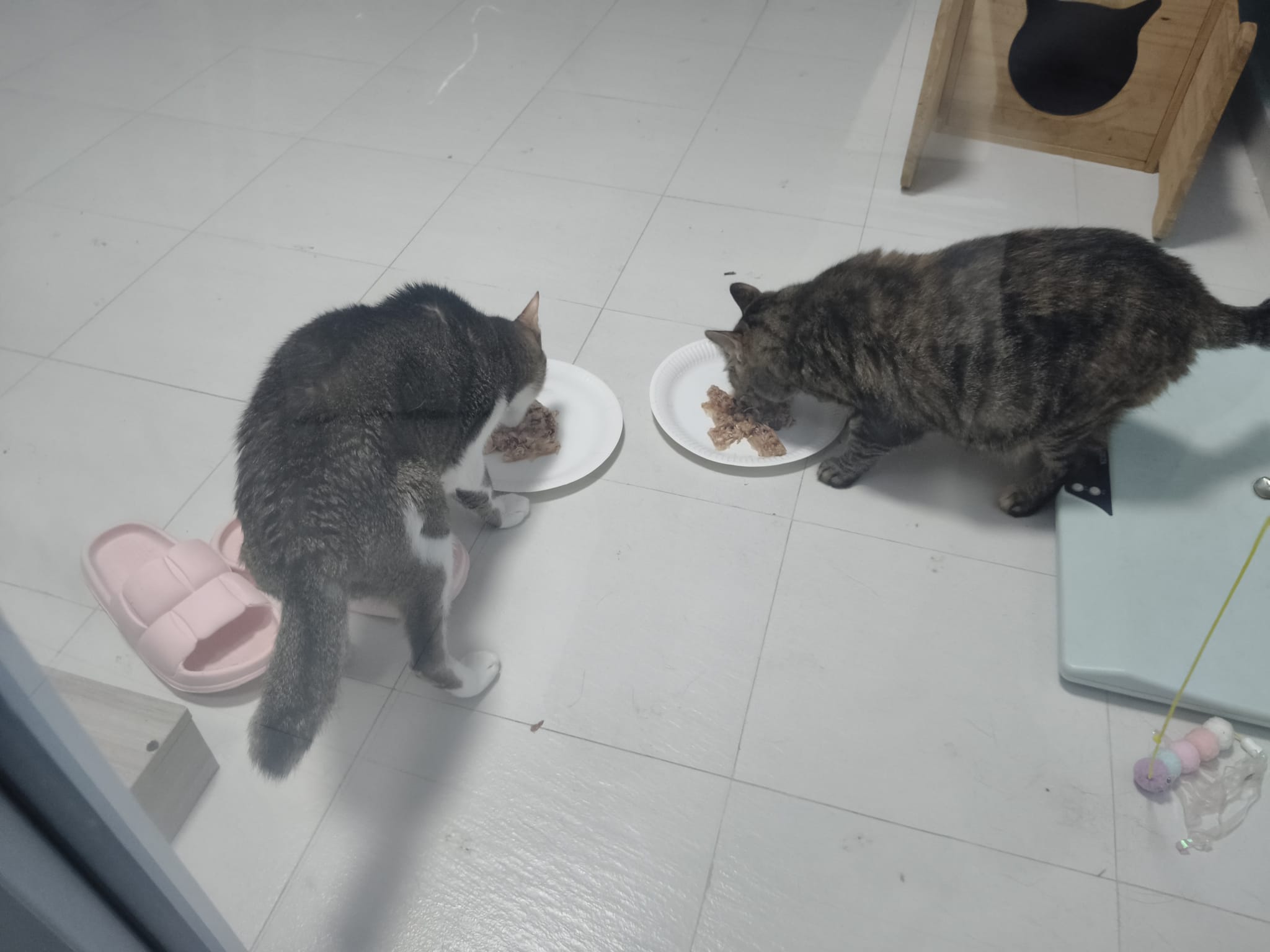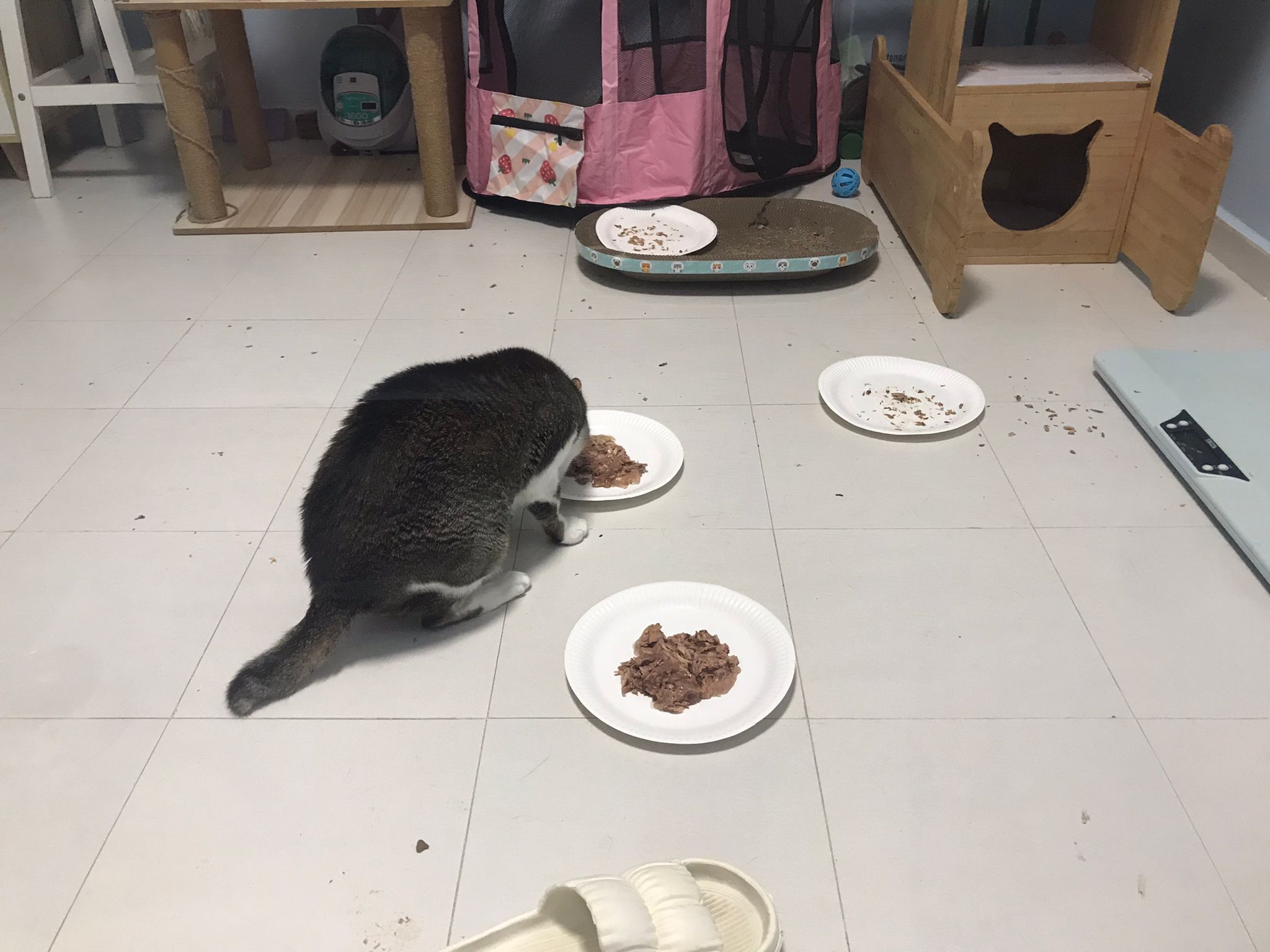 1pm+: I Waited so long their bench delivery not here yet. Today throw half their cat tree away. Rearrange a little. Tmr then give them the bench 🙂