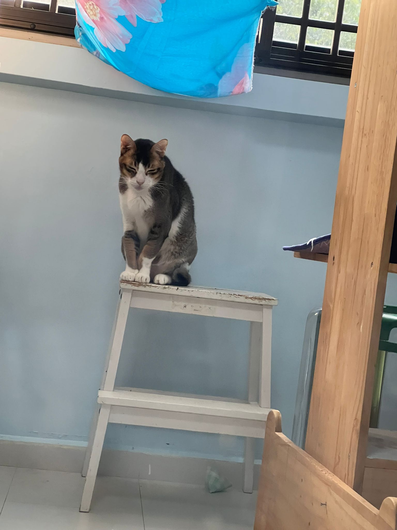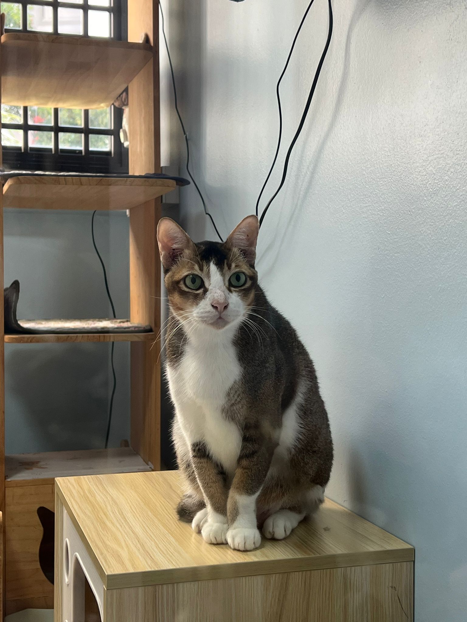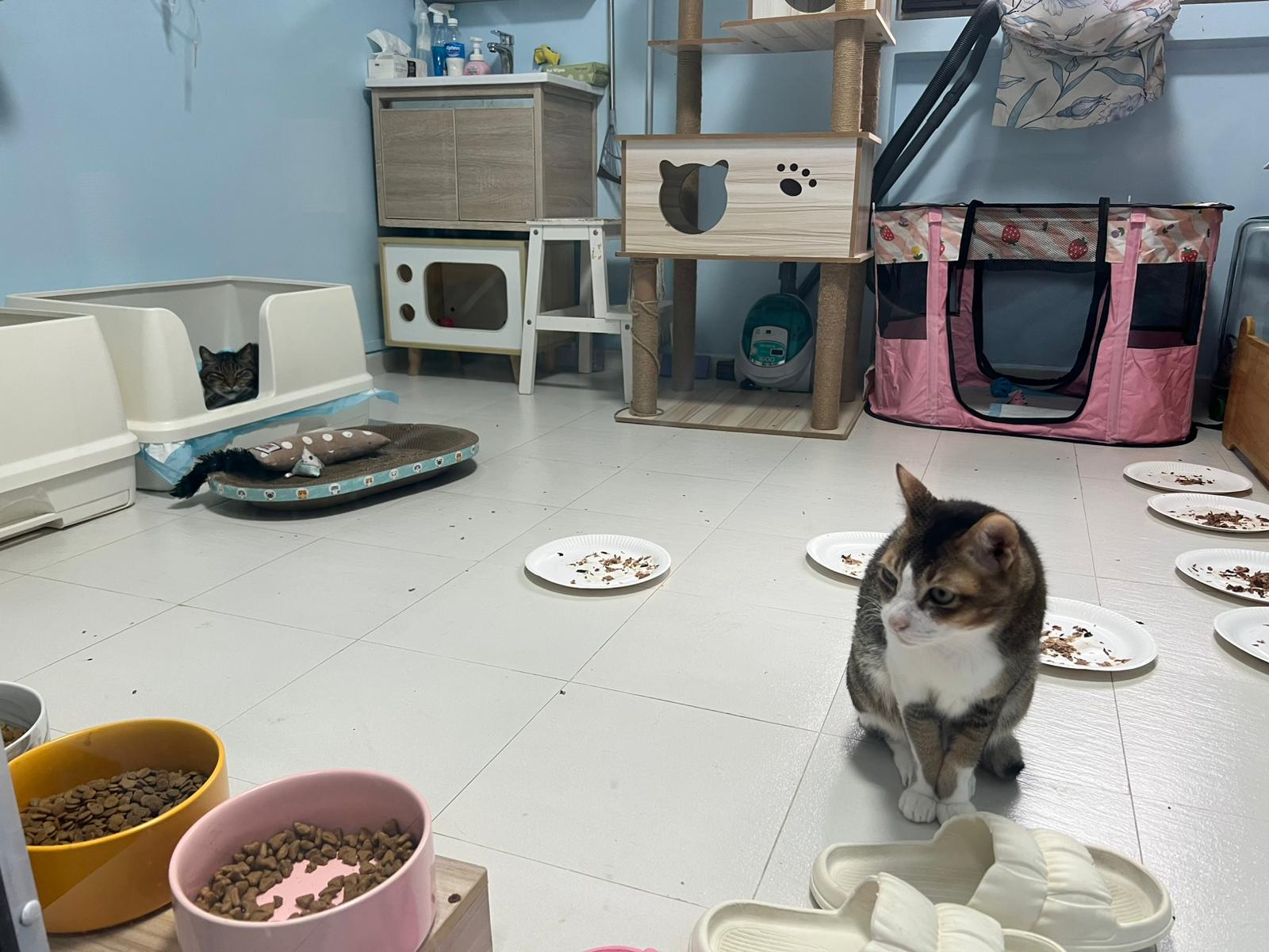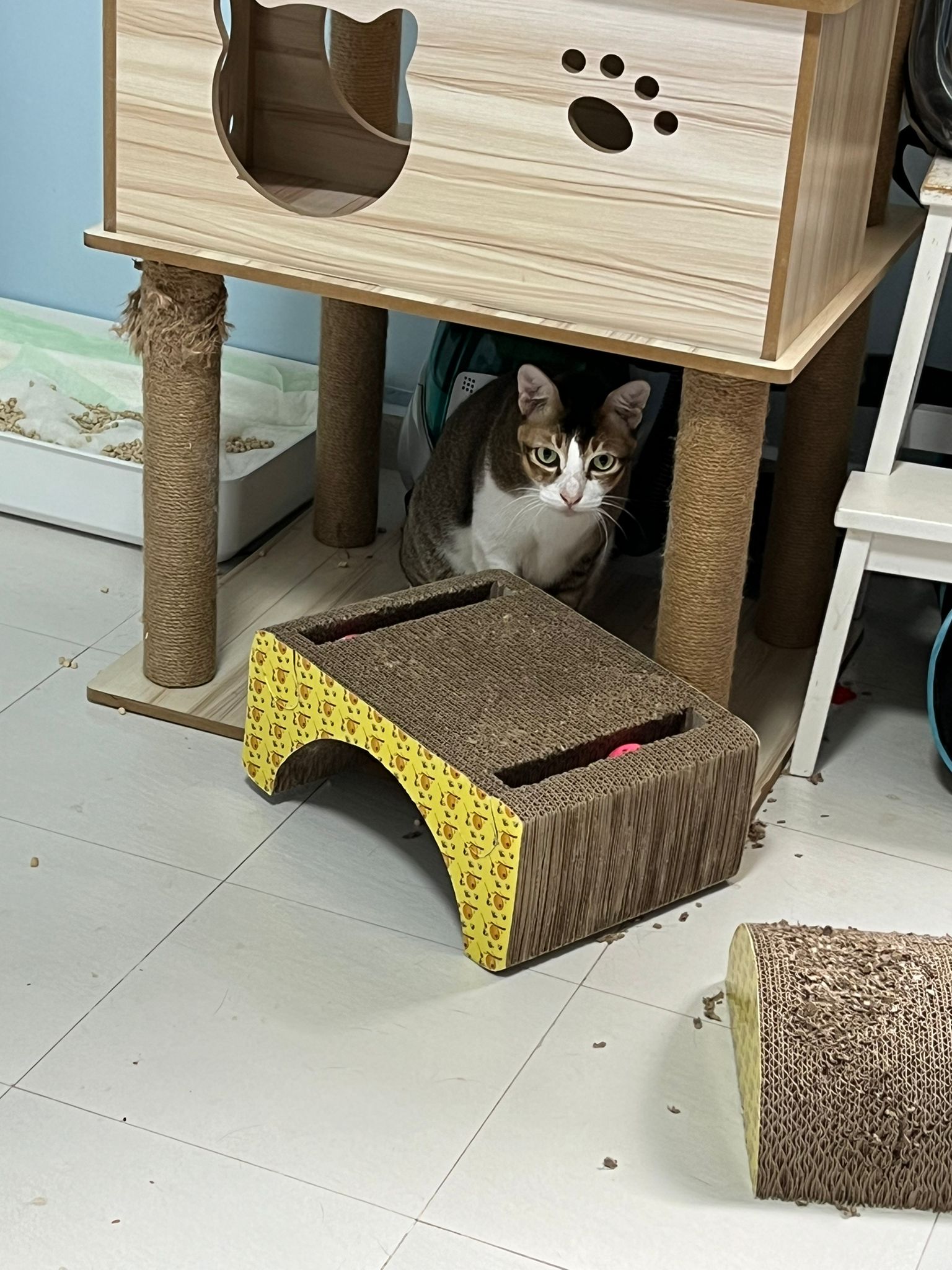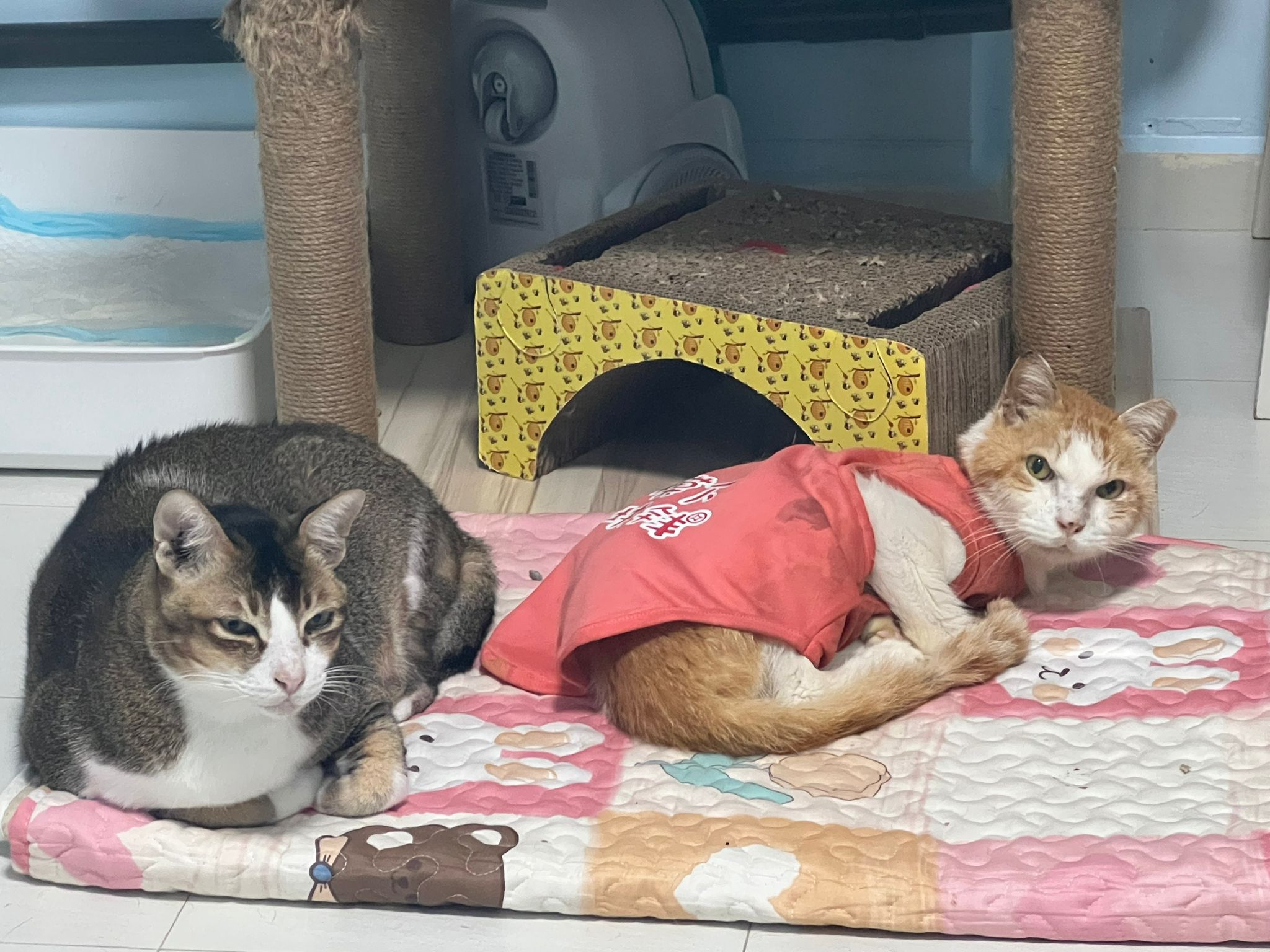 1pm+: I Waited so long their bench delivery not here yet. Today throw half their cat tree away. Rearrange a little. Tmr then give them the bench 🙂