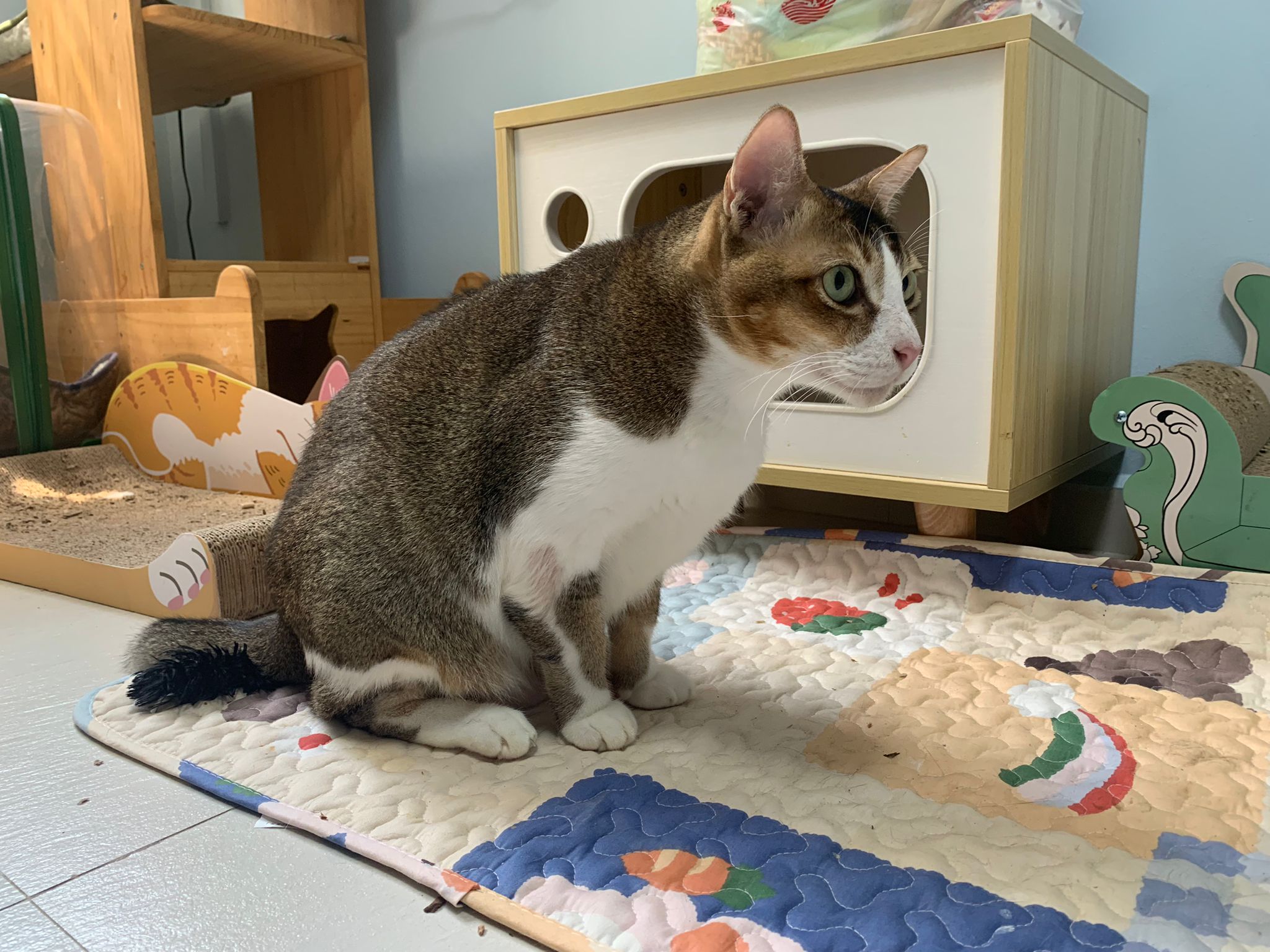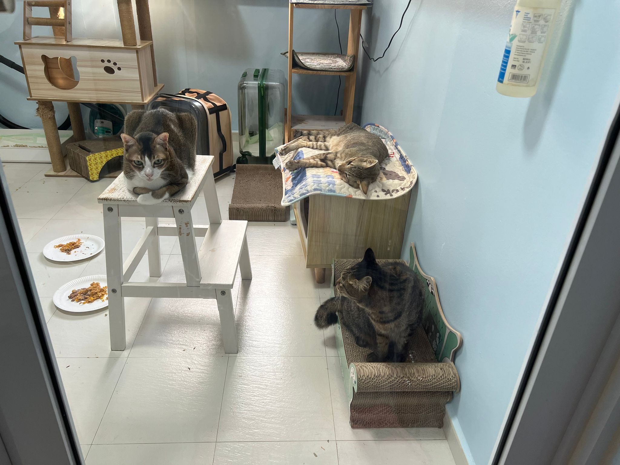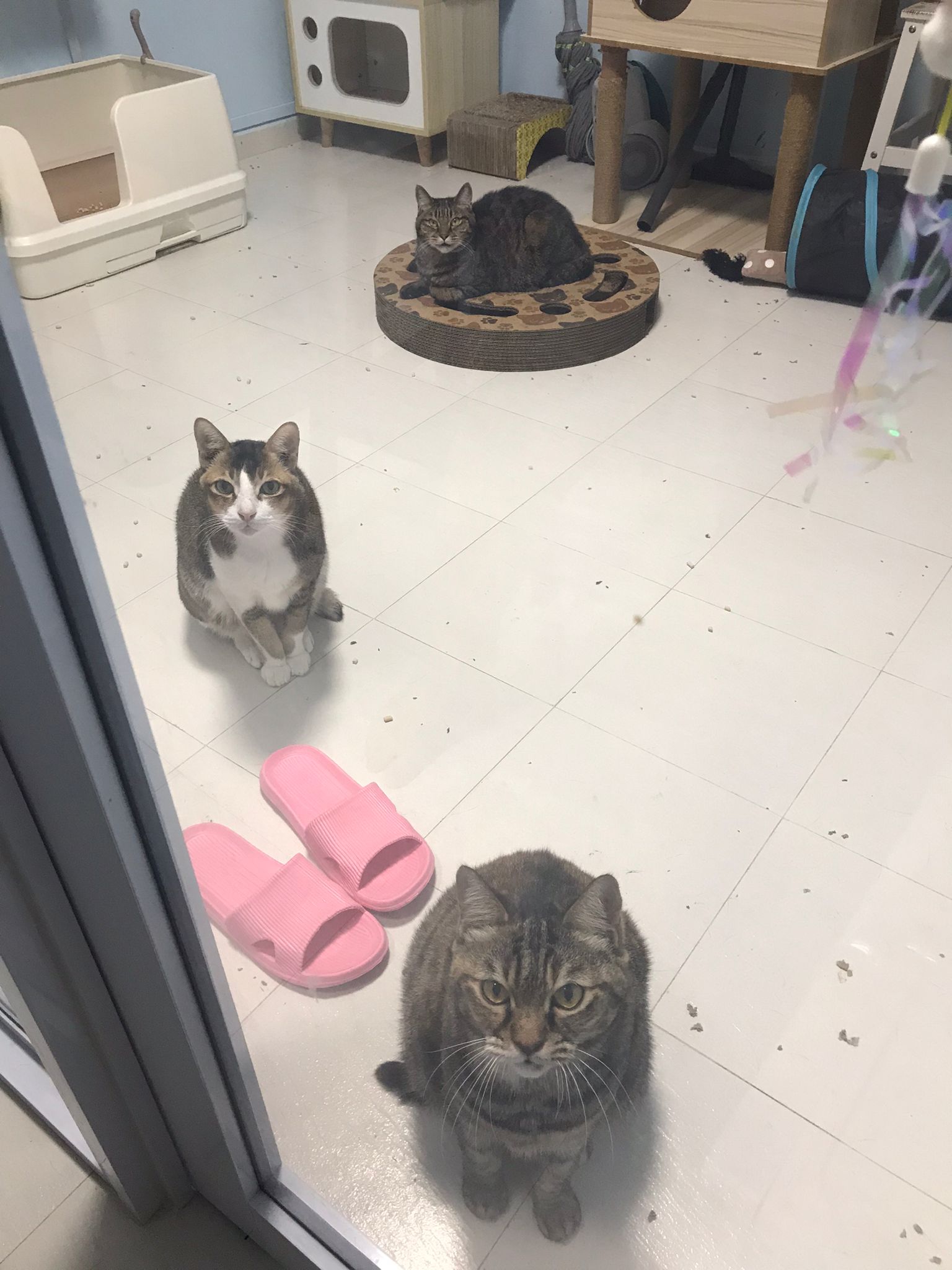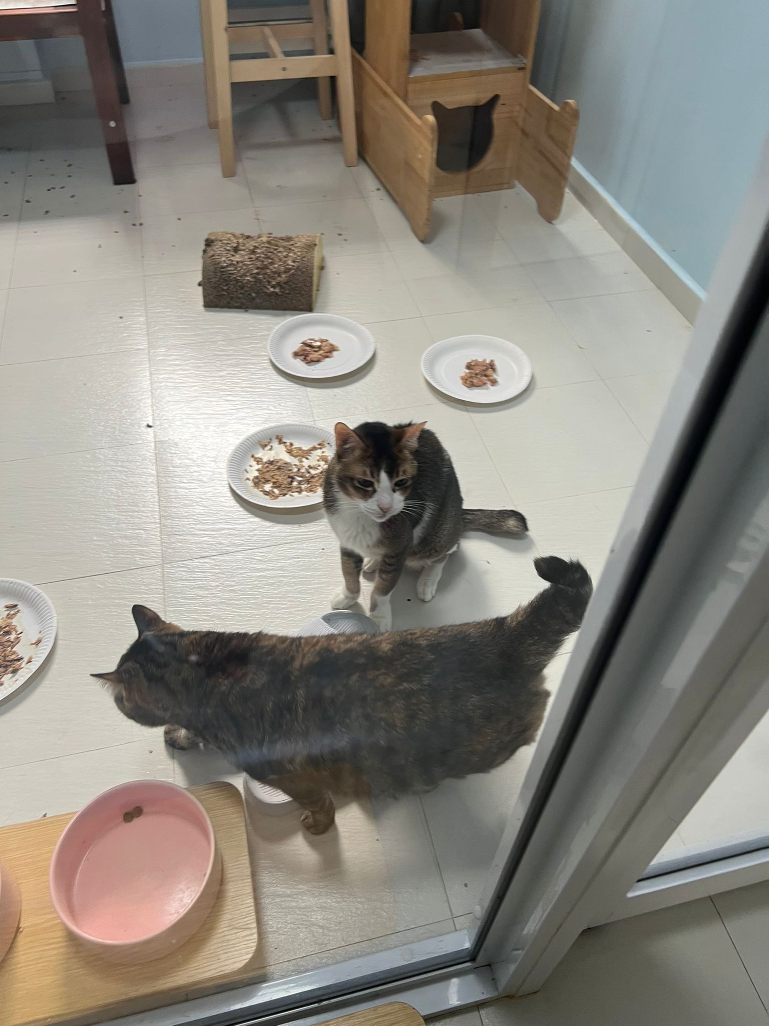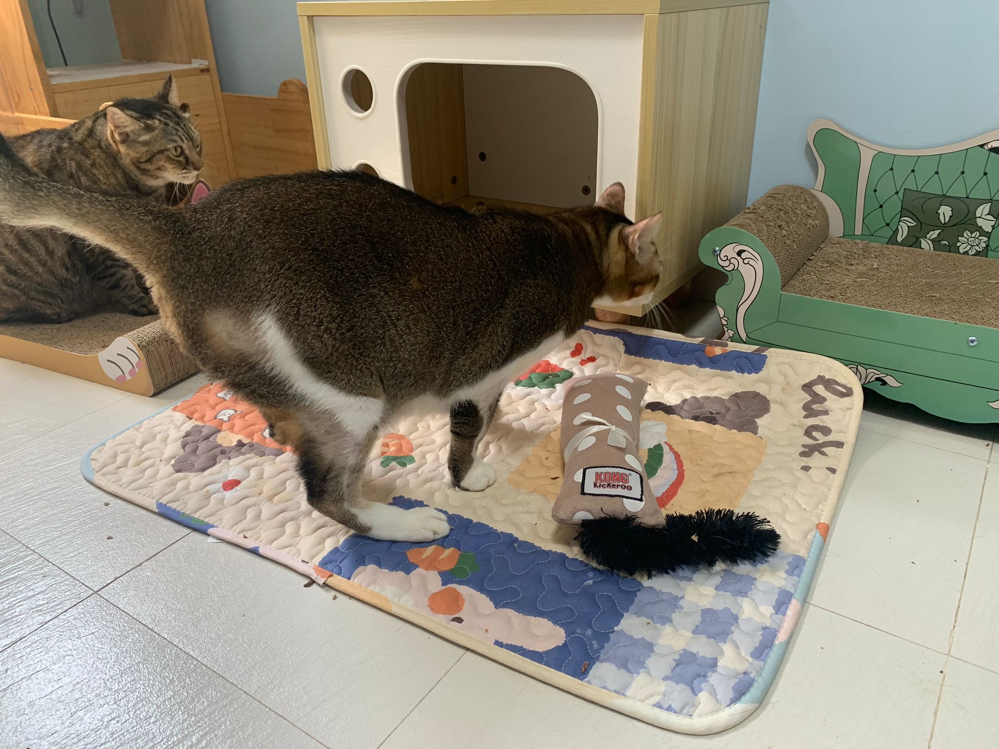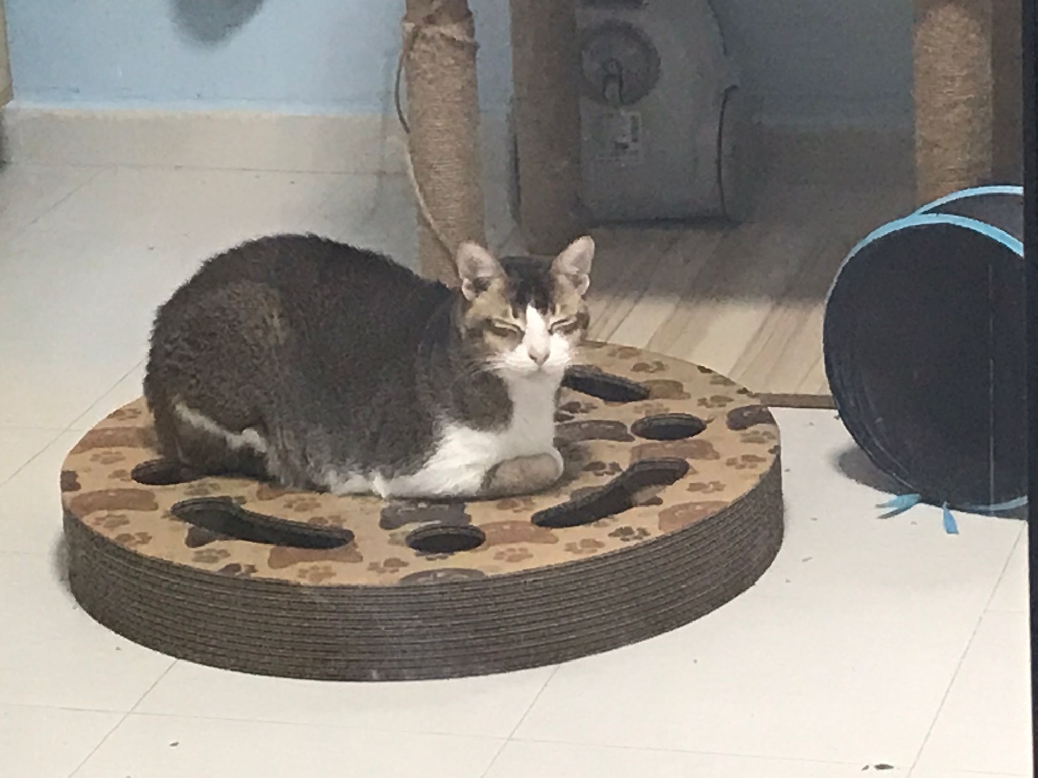 1pm+: I Waited so long their bench delivery not here yet. Today throw half their cat tree away. Rearrange a little. Tmr then give them the bench 🙂
