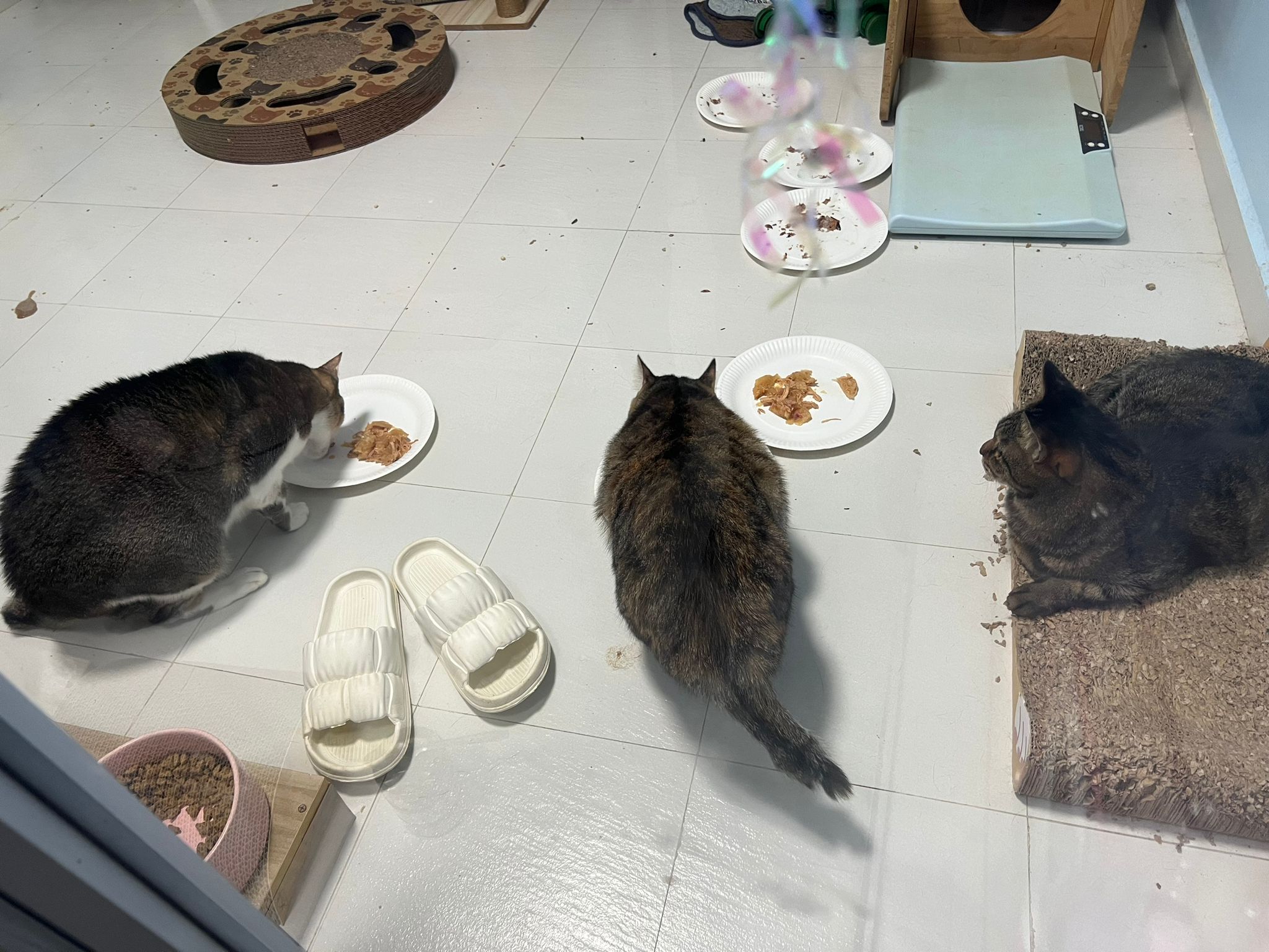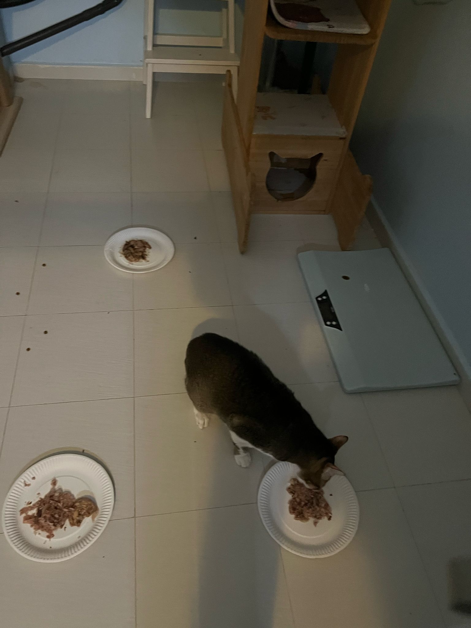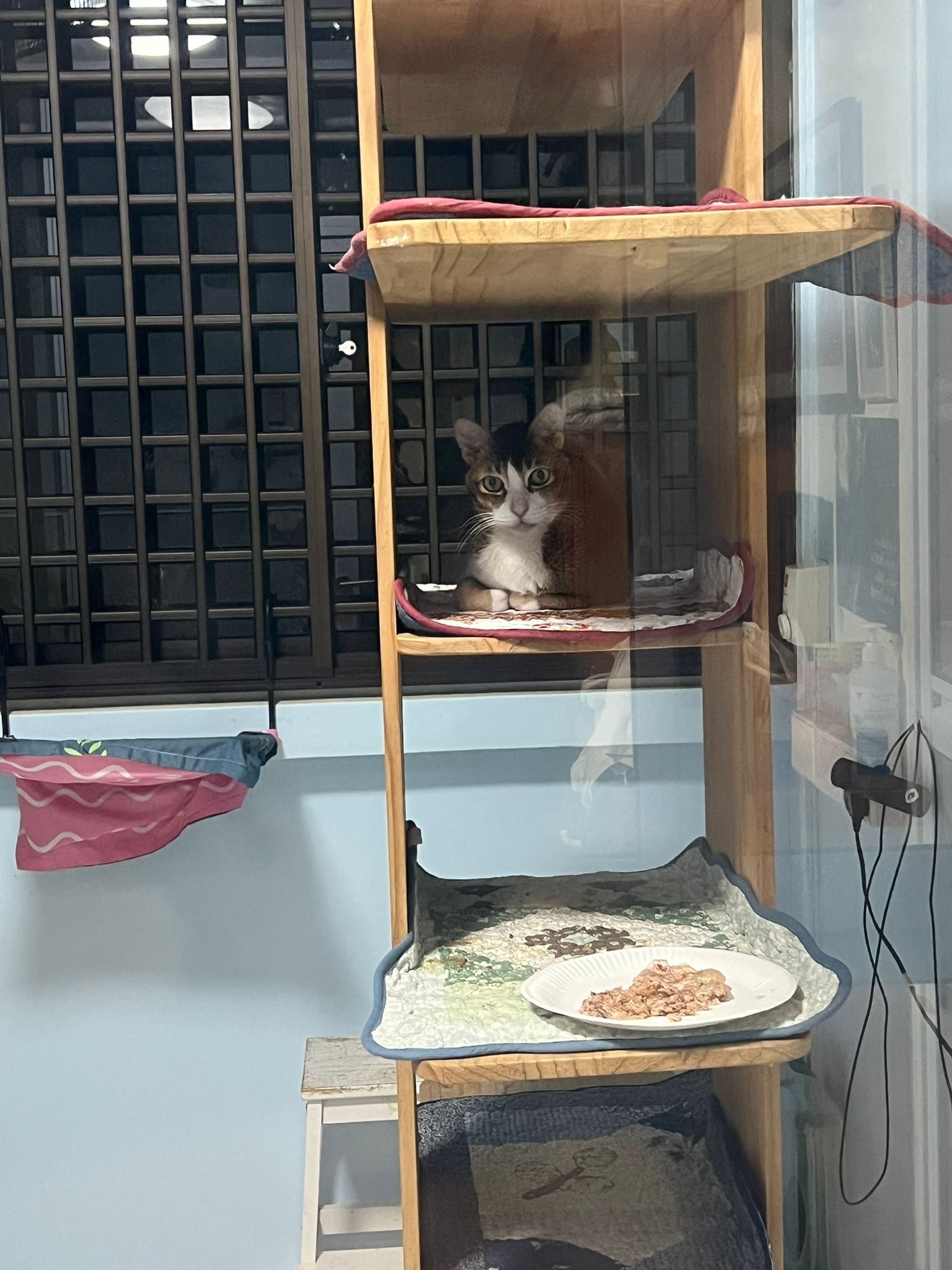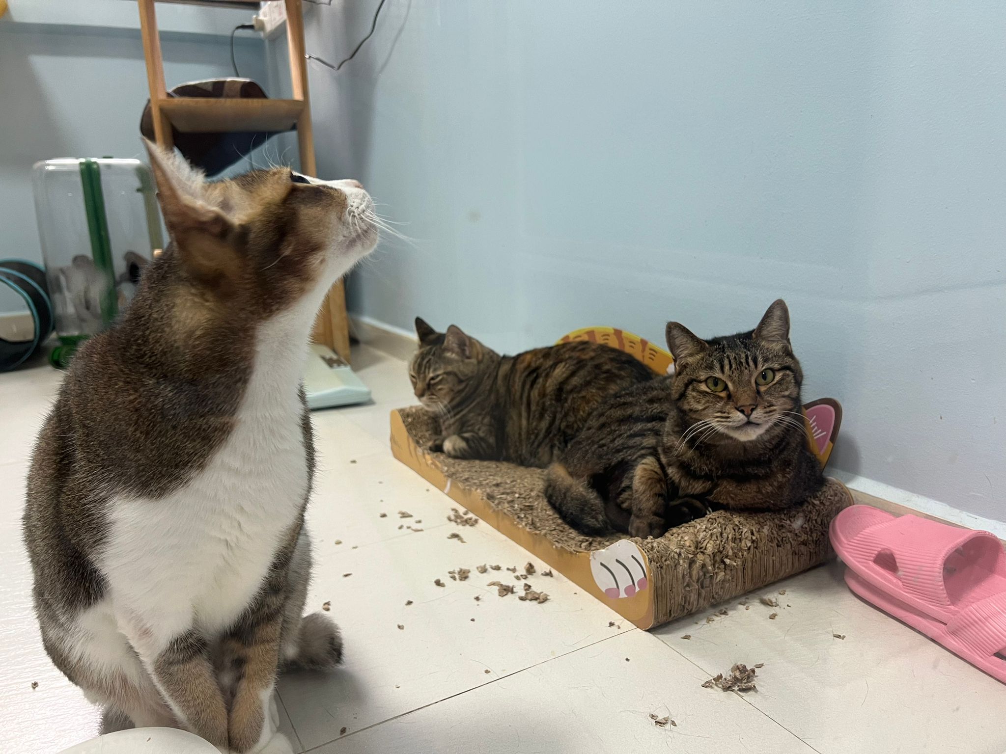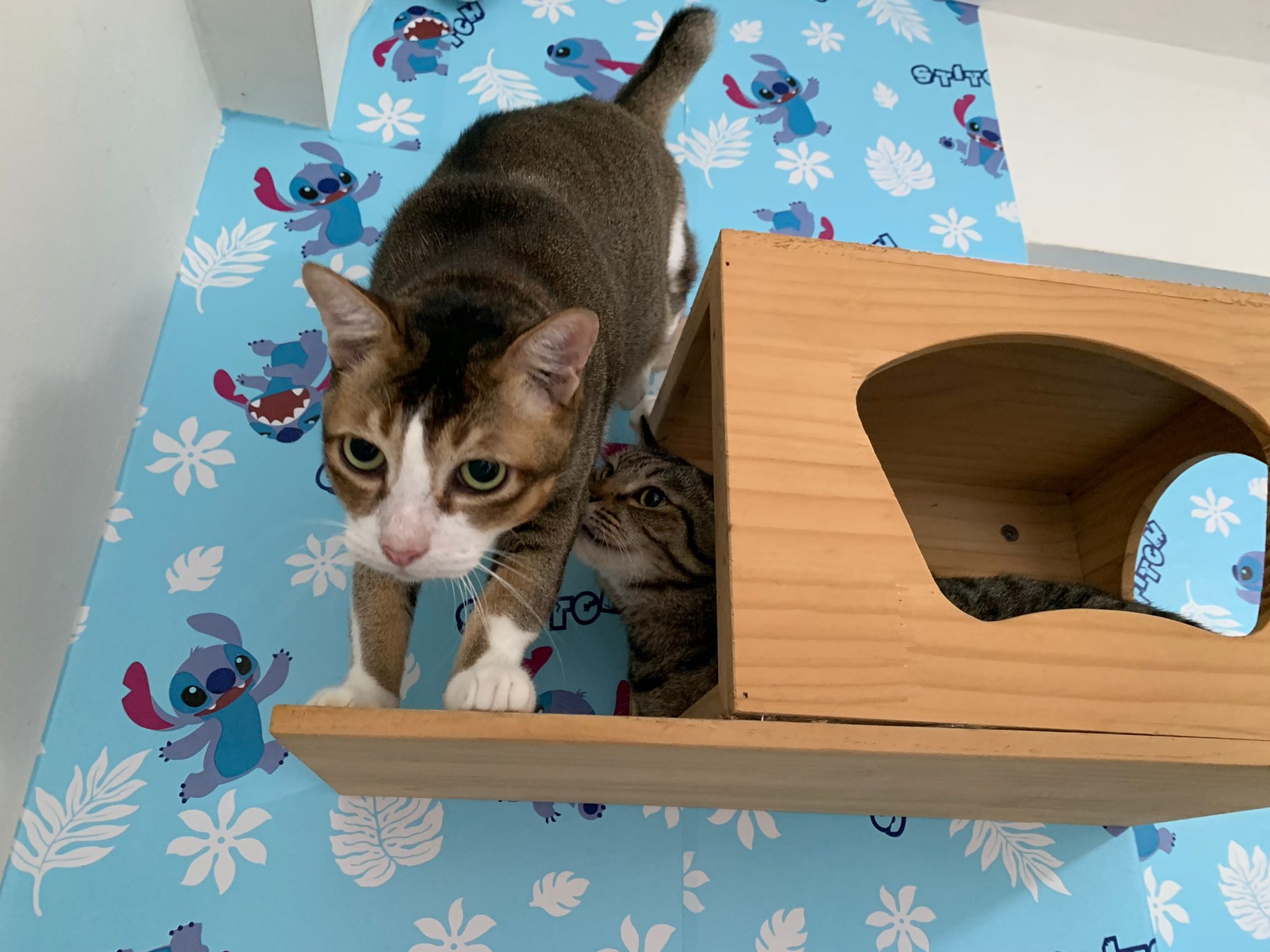 1pm+: I Waited so long their bench delivery not here yet. Today throw half their cat tree away. Rearrange a little. Tmr then give them the bench 🙂