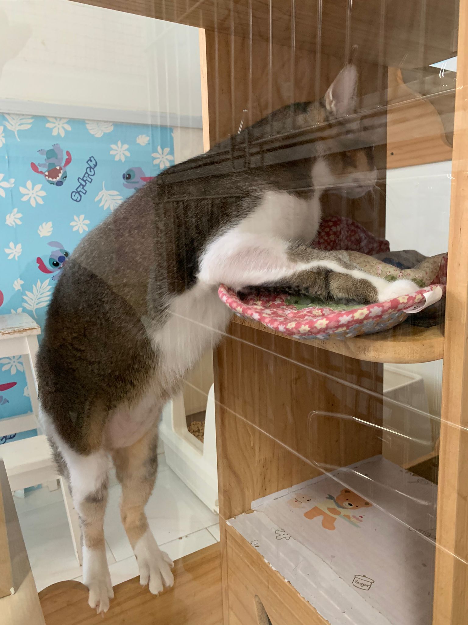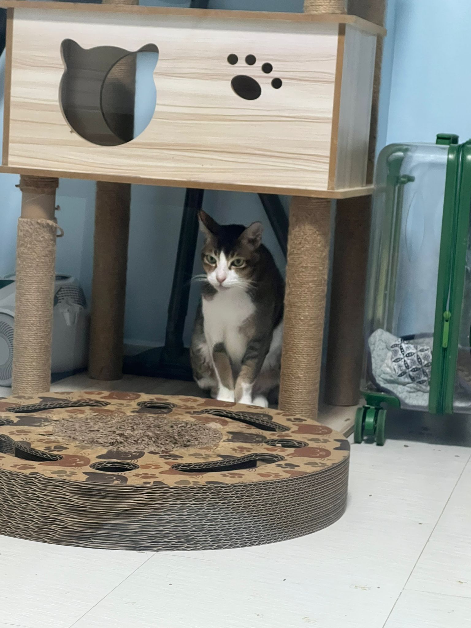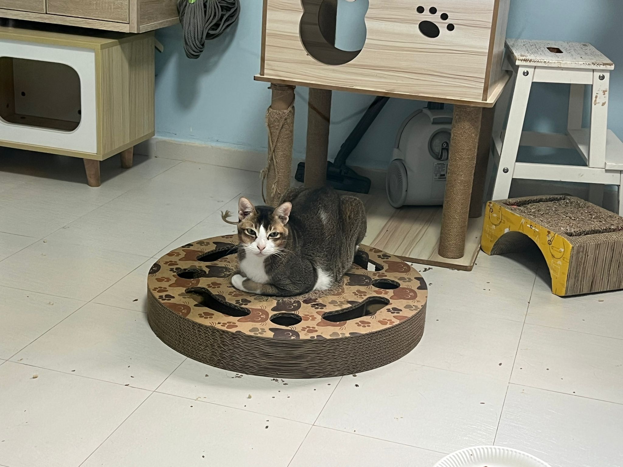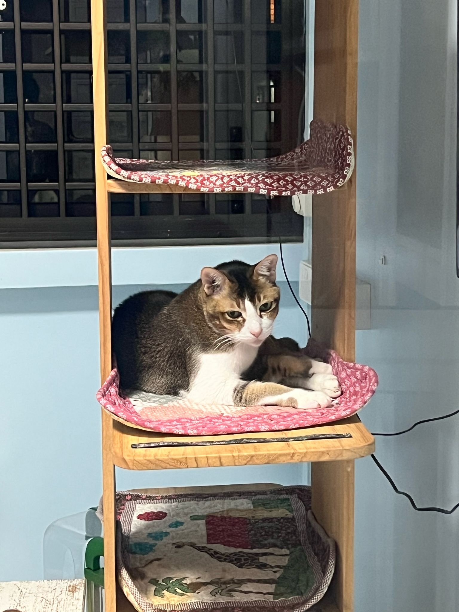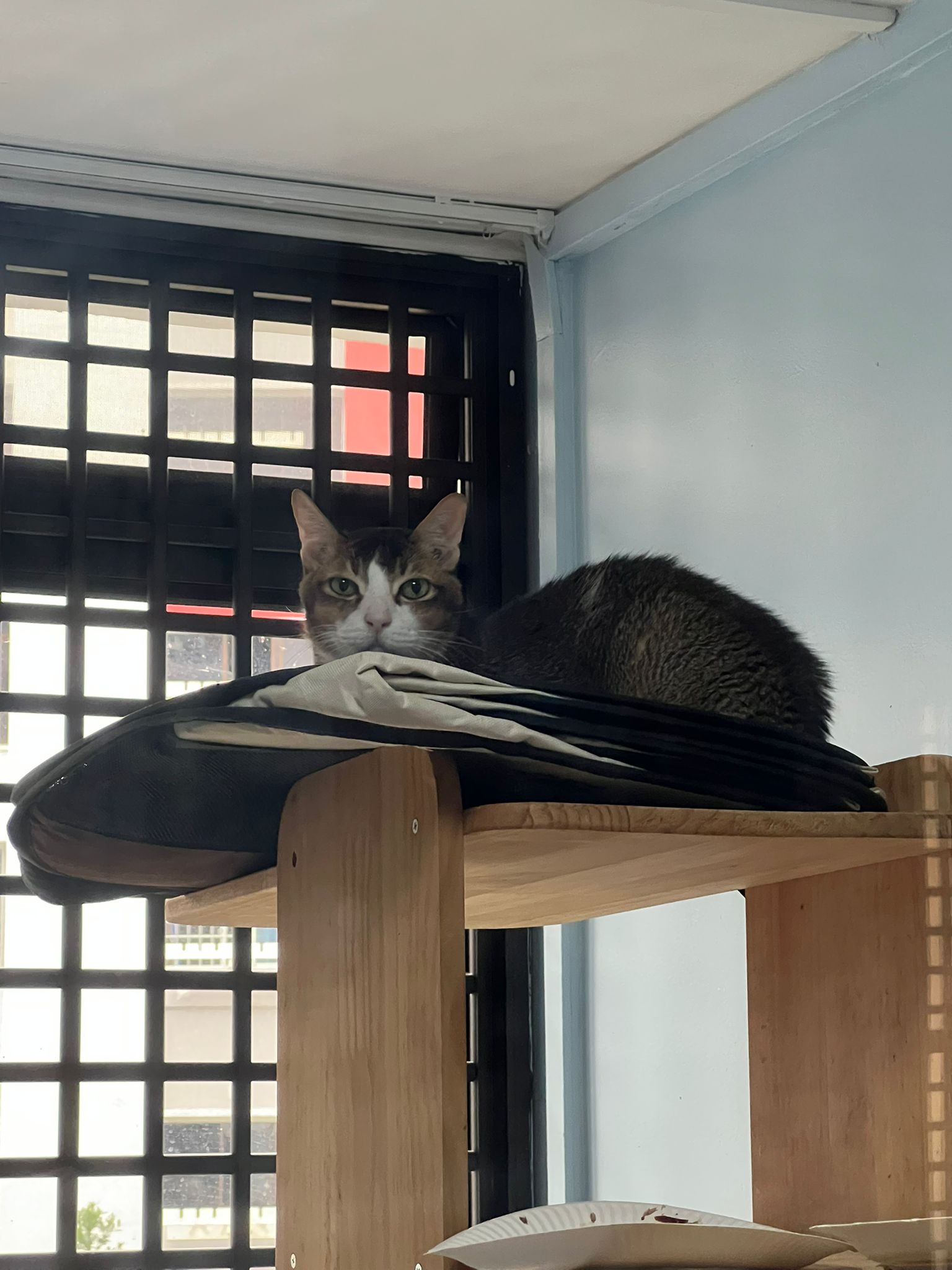 1pm+: I Waited so long their bench delivery not here yet. Today throw half their cat tree away. Rearrange a little. Tmr then give them the bench 🙂