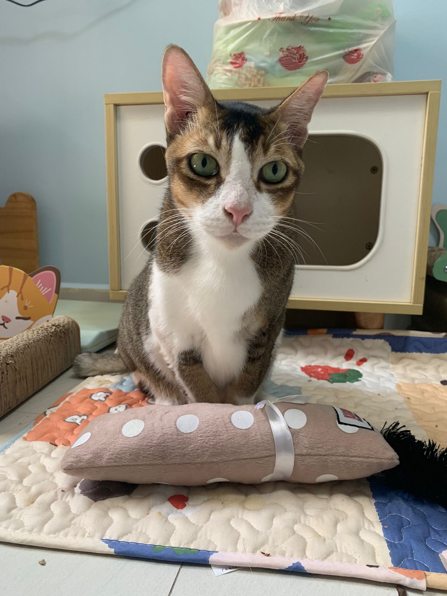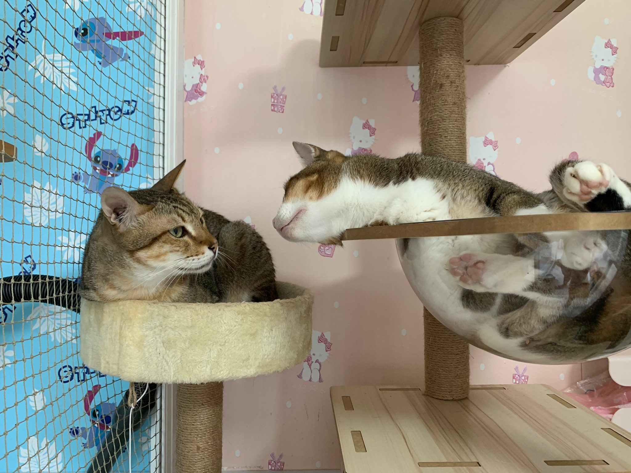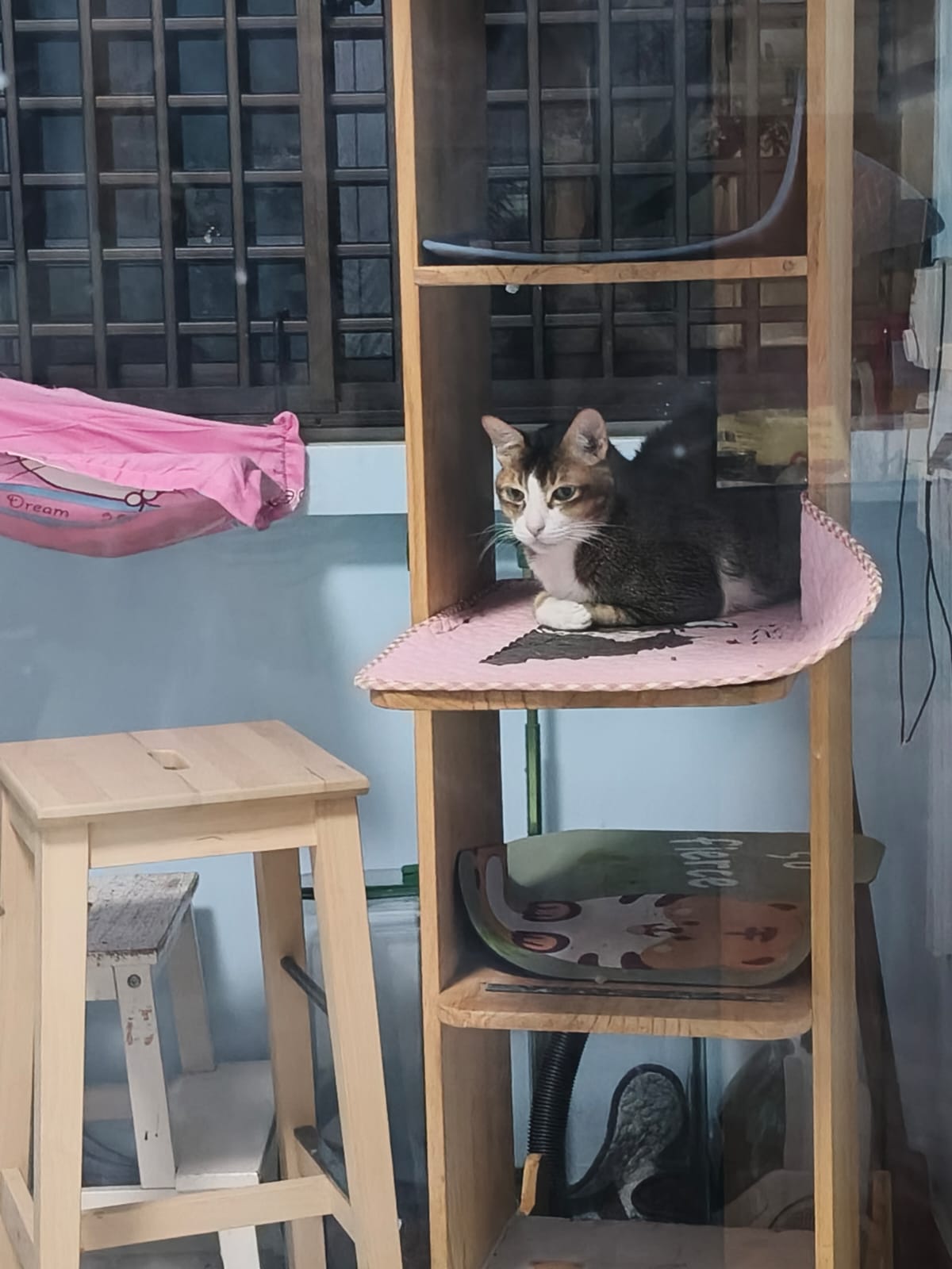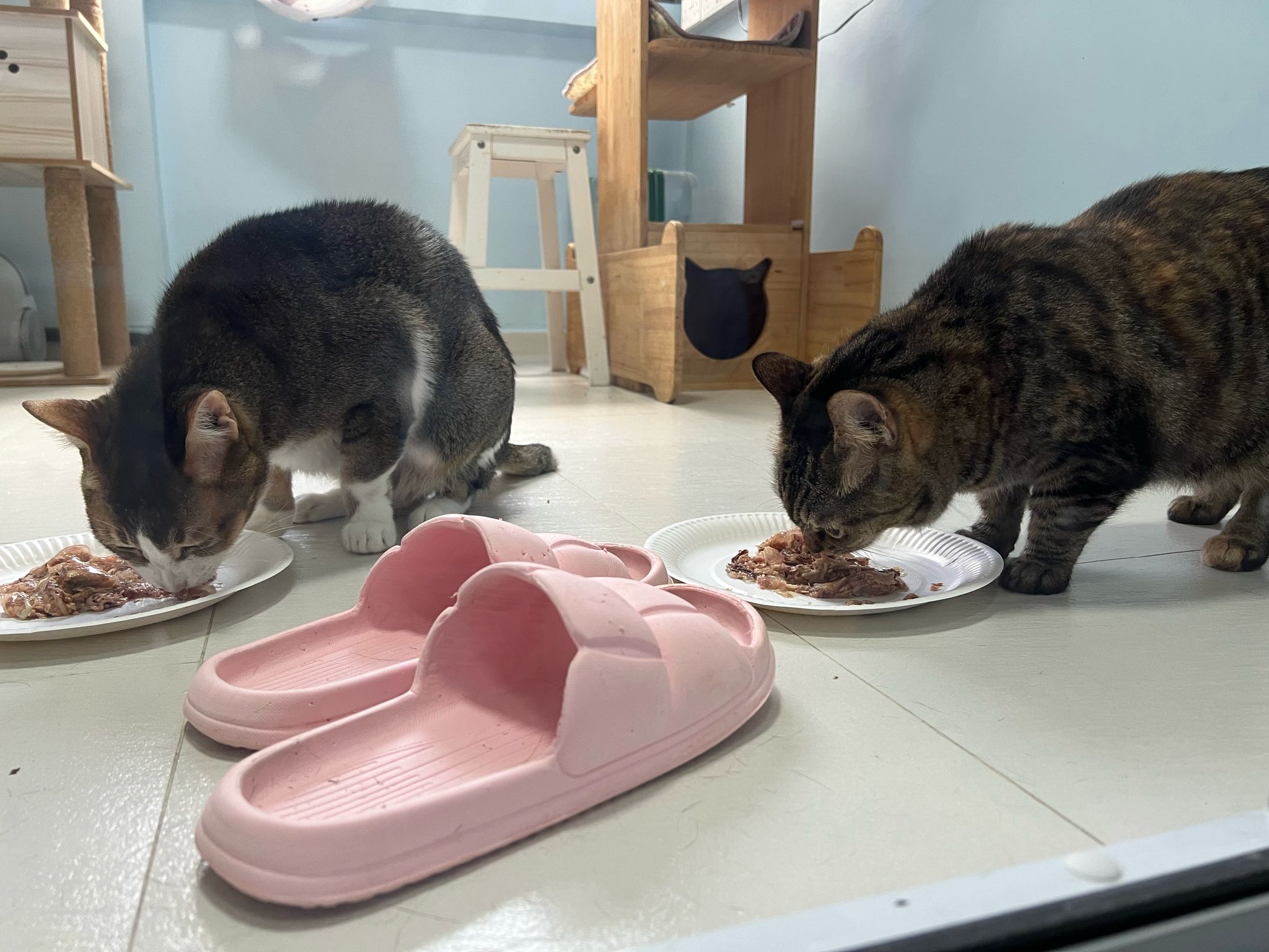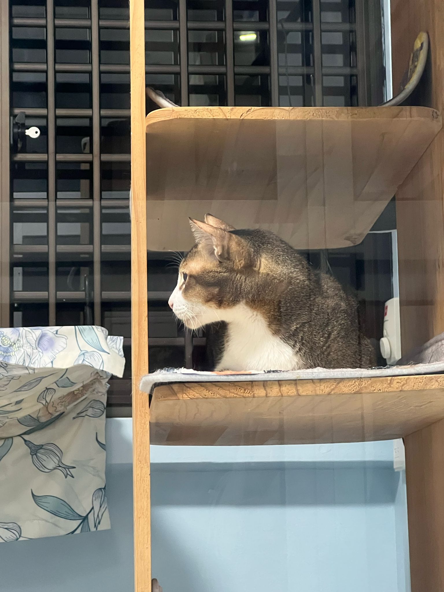 1pm+: I Waited so long their bench delivery not here yet. Today throw half their cat tree away. Rearrange a little. Tmr then give them the bench 🙂