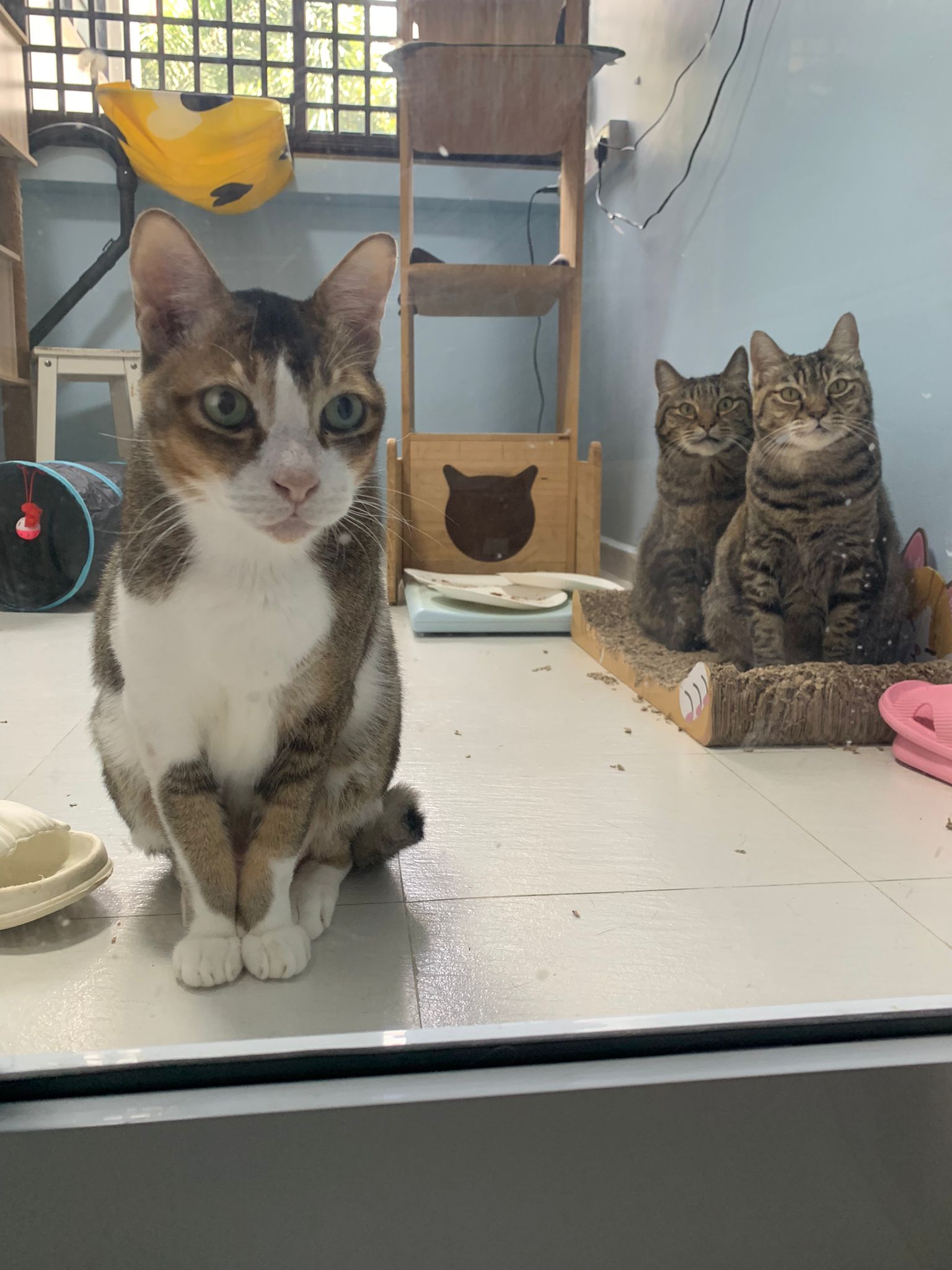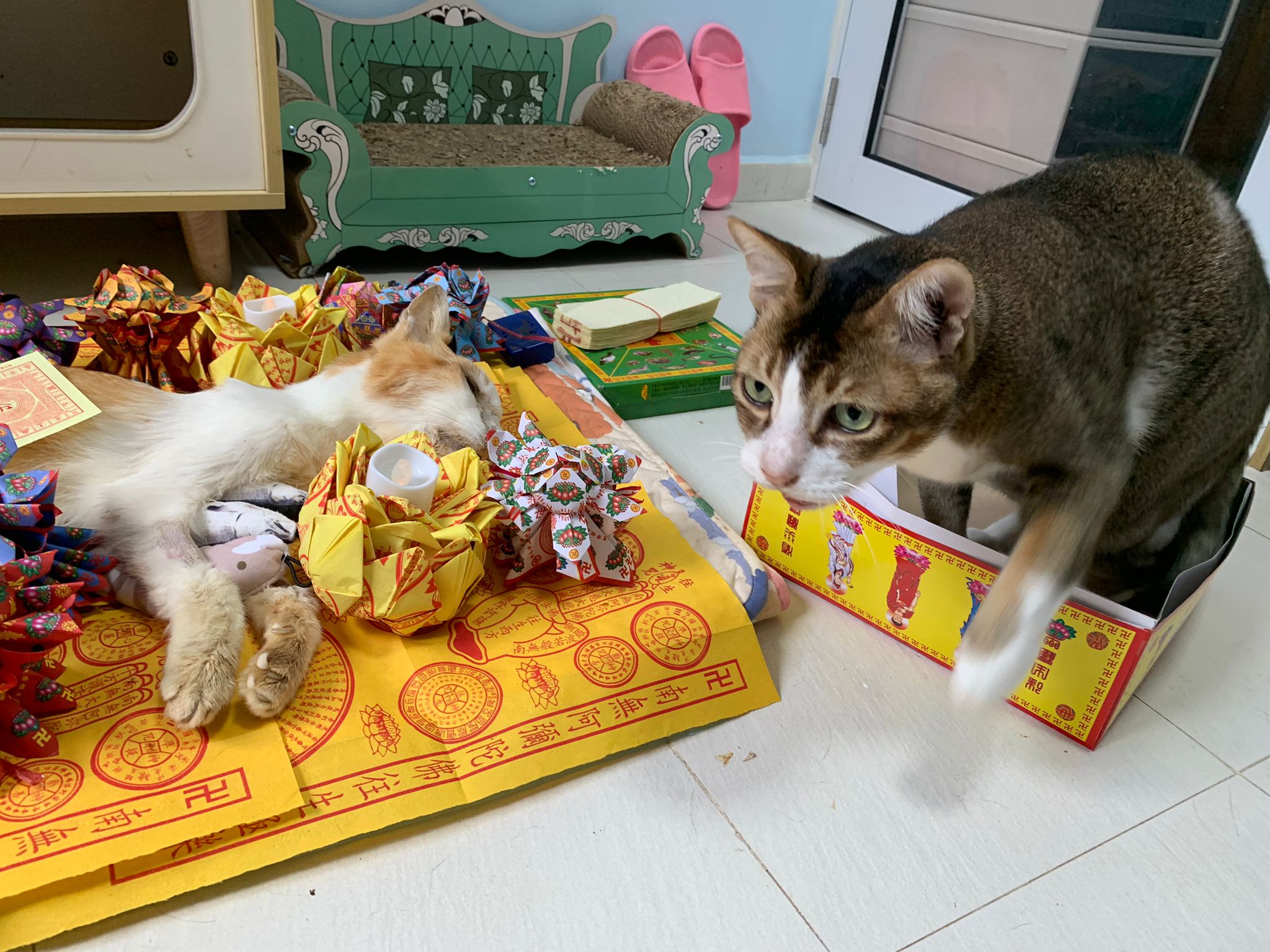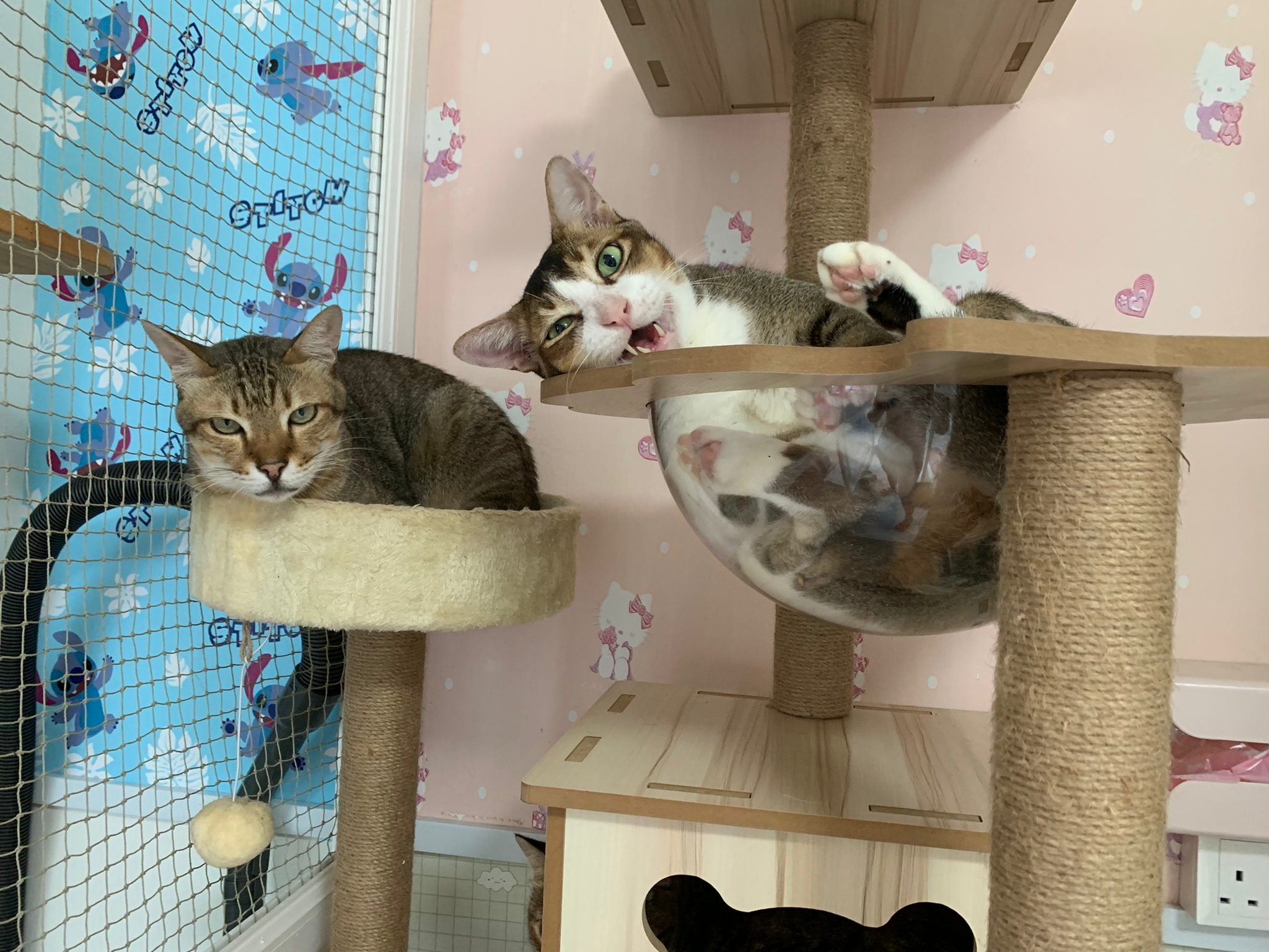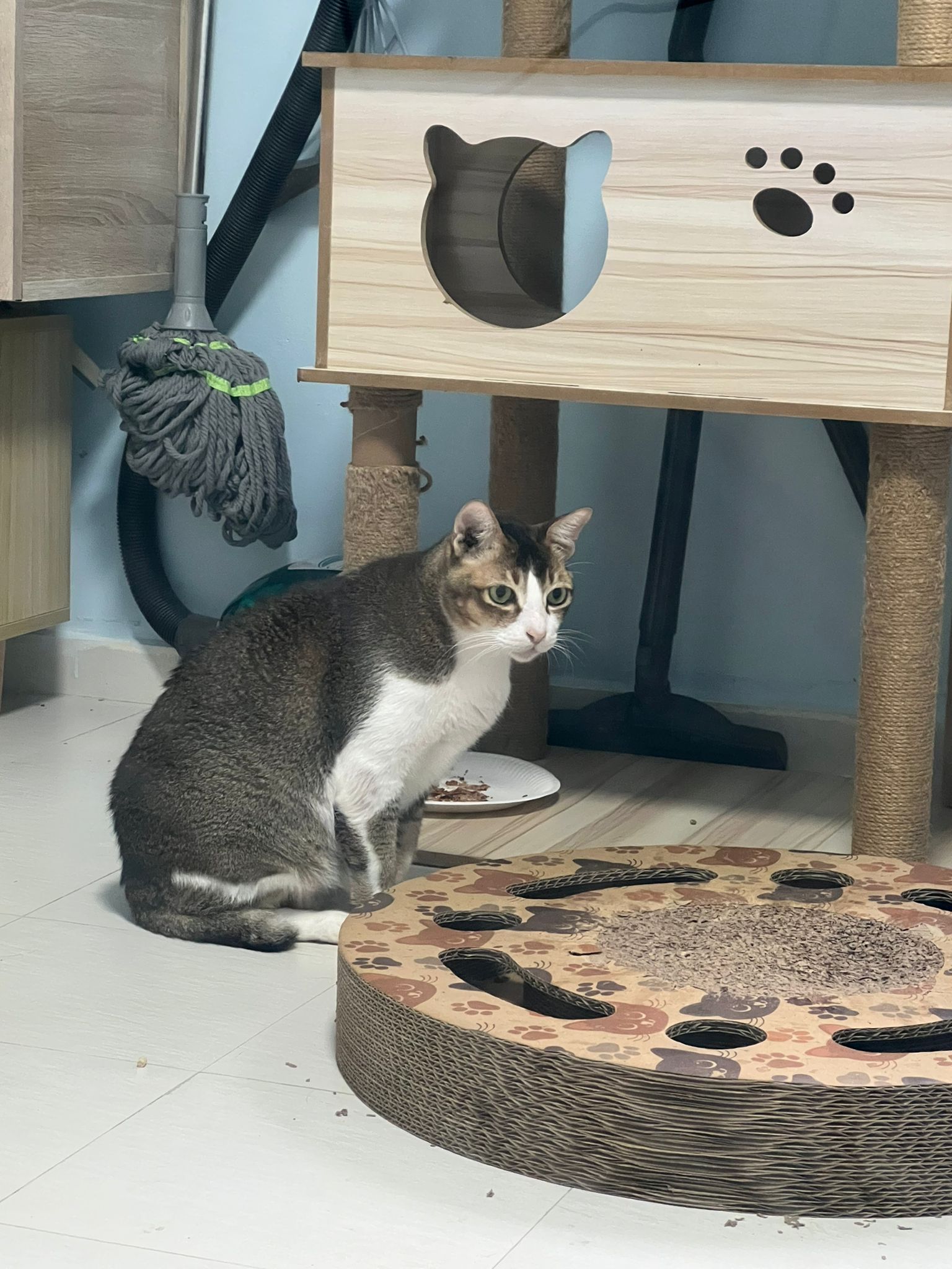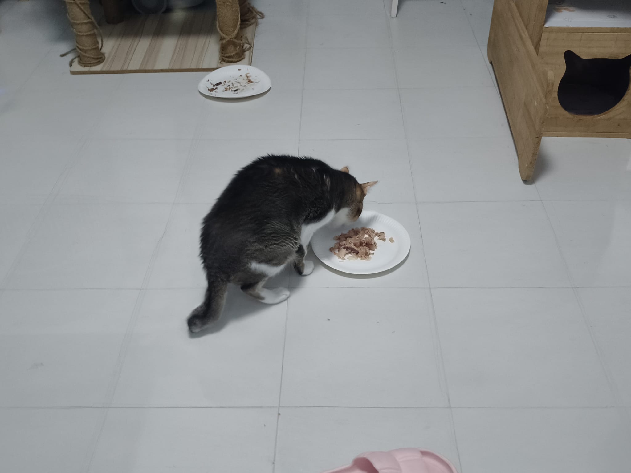 1pm+: I Waited so long their bench delivery not here yet. Today throw half their cat tree away. Rearrange a little. Tmr then give them the bench 🙂
