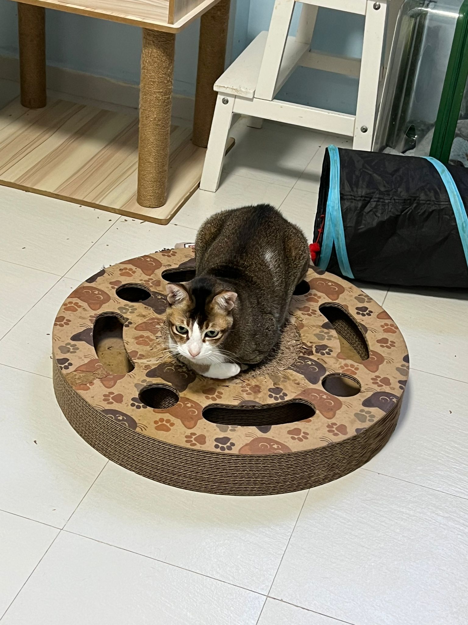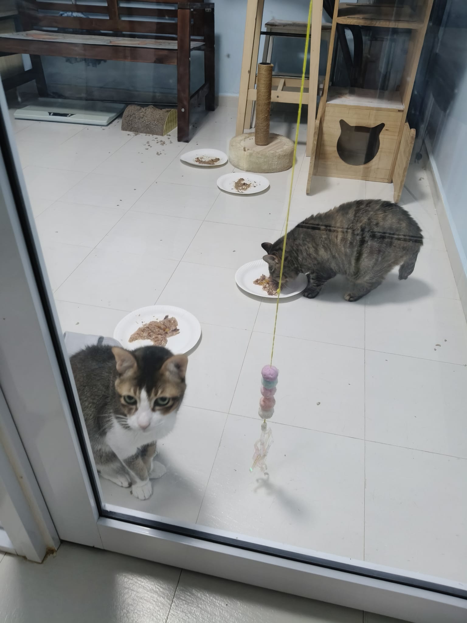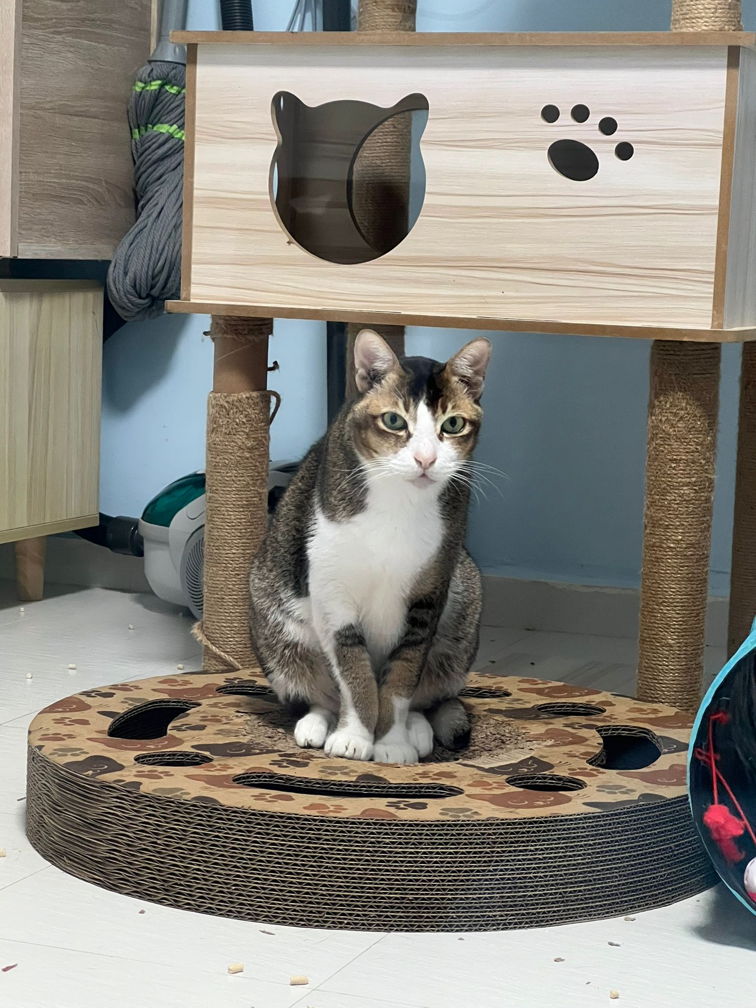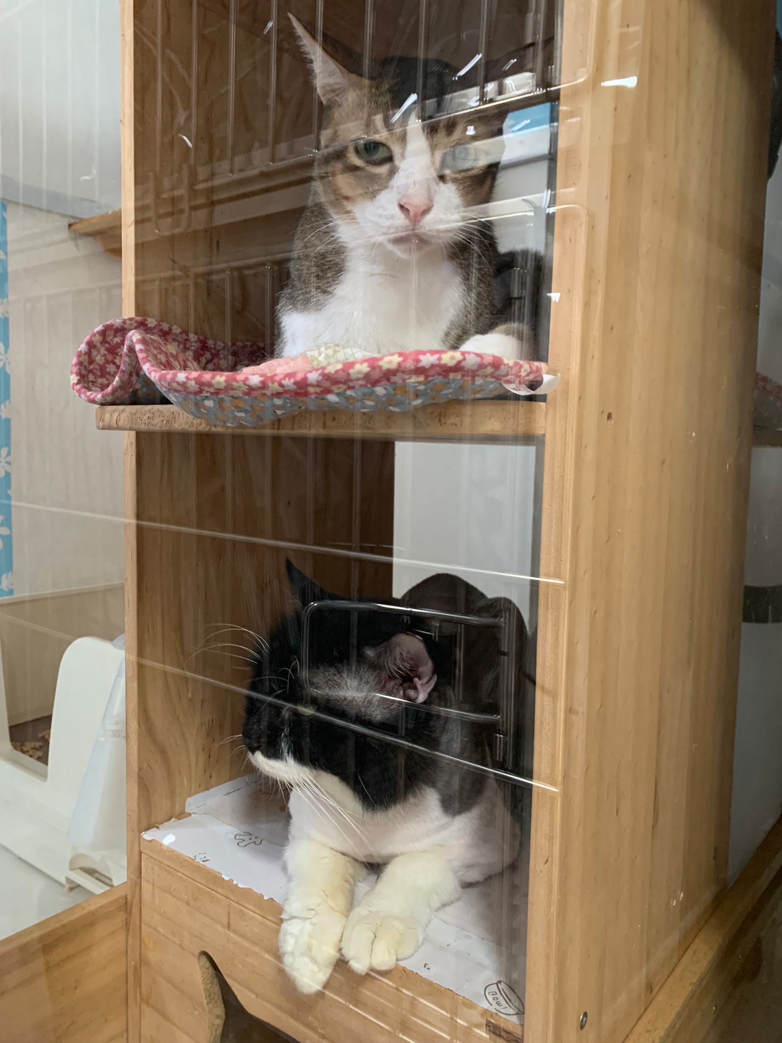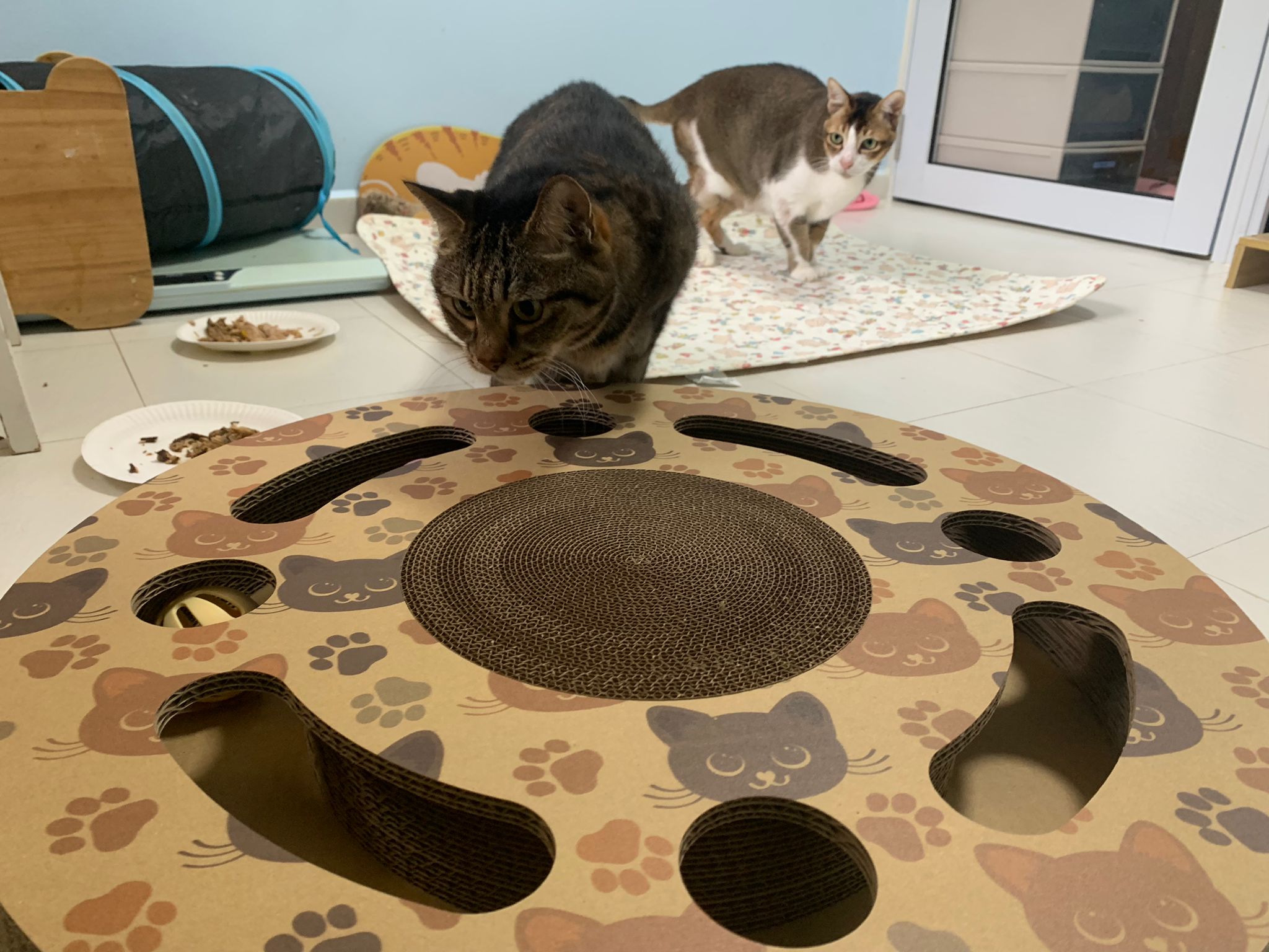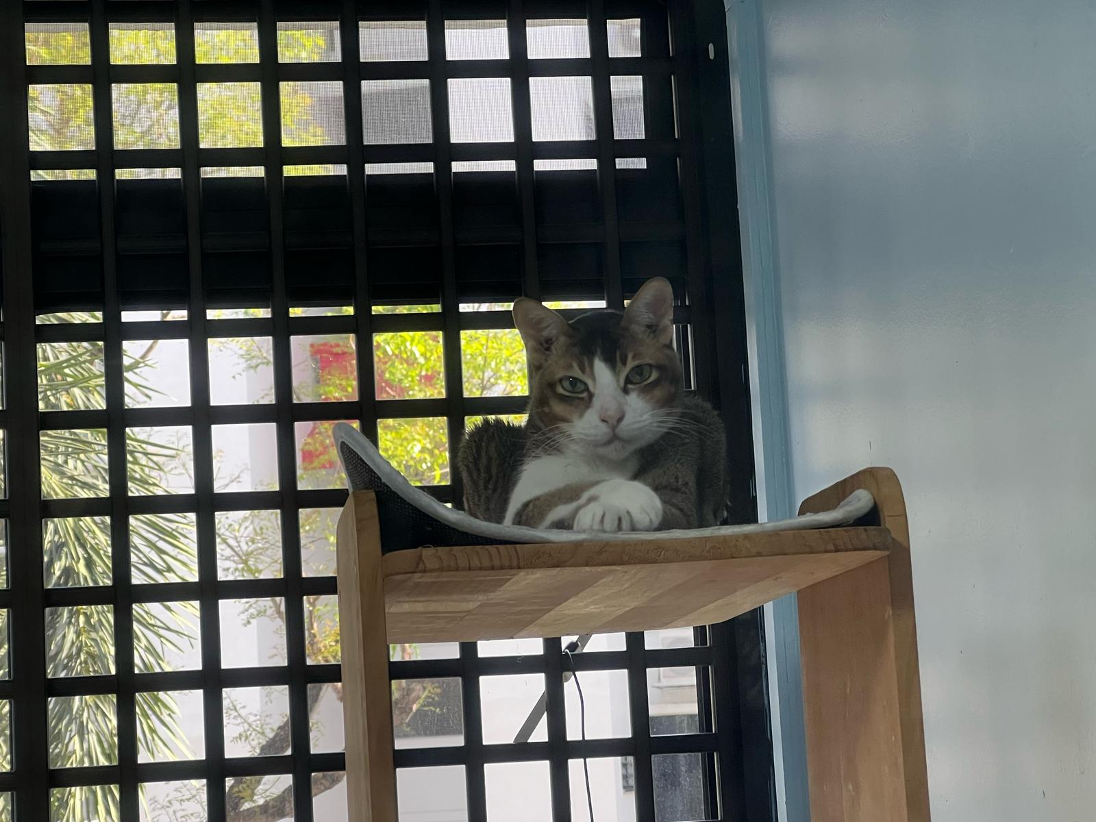 1pm+: I Waited so long their bench delivery not here yet. Today throw half their cat tree away. Rearrange a little. Tmr then give them the bench 🙂
